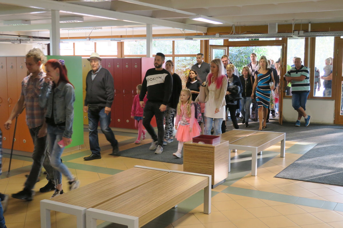 V pondělí 3. 9. 2018 nastupili na Mendelku noví prvňáčci, Do školy je doprovodili rodiče i prarodiče...