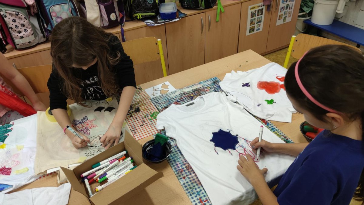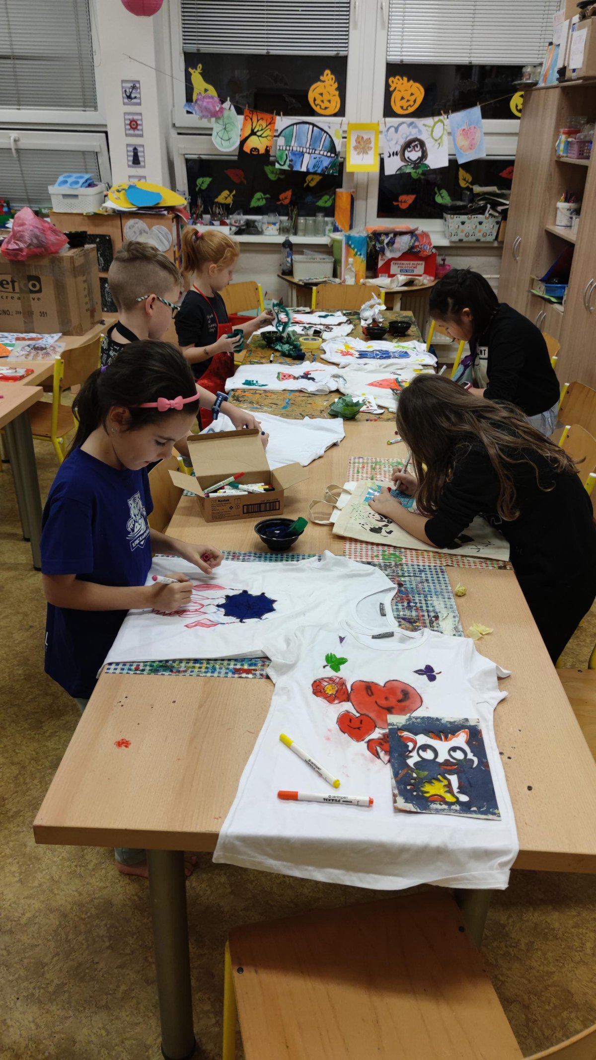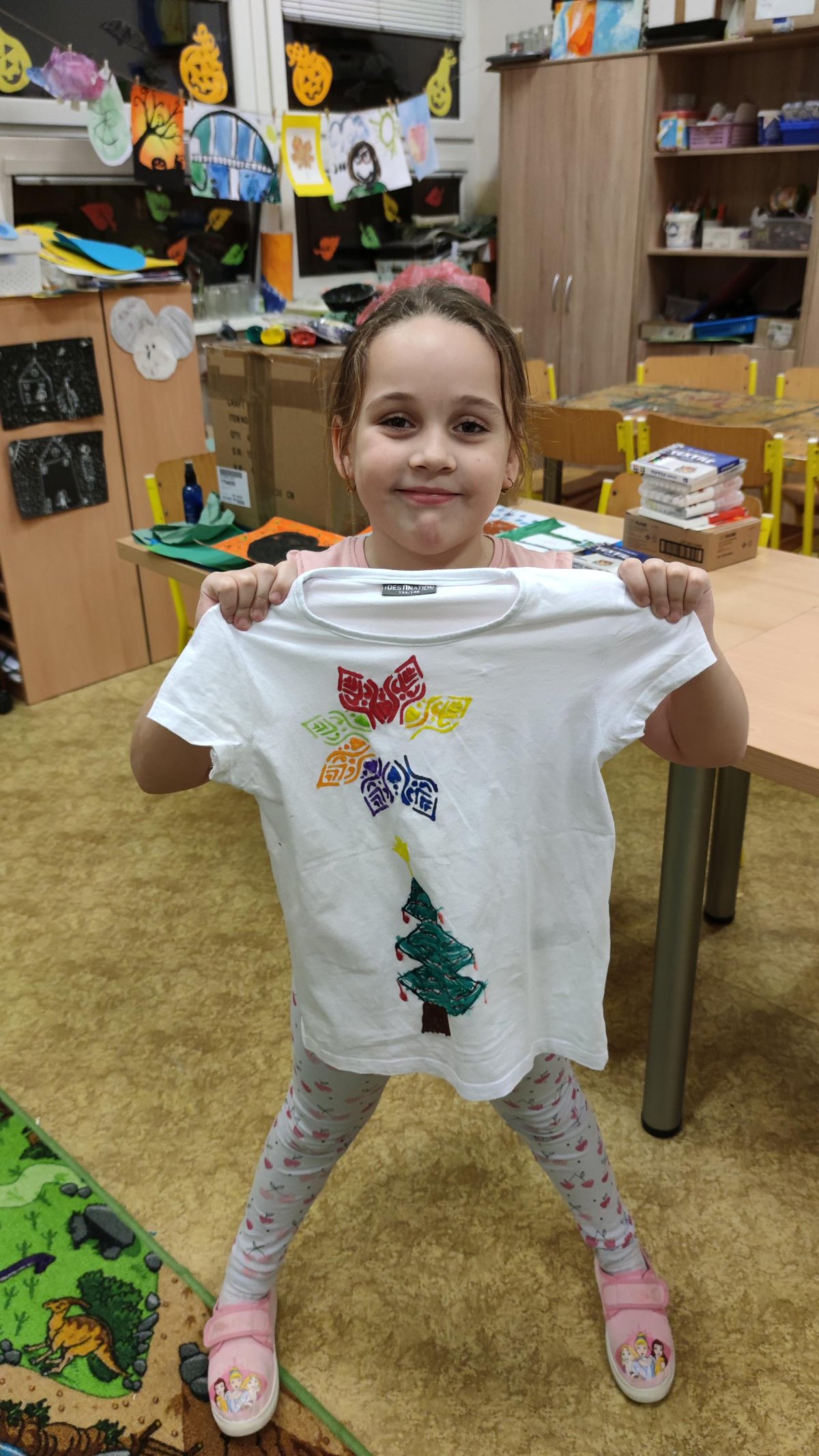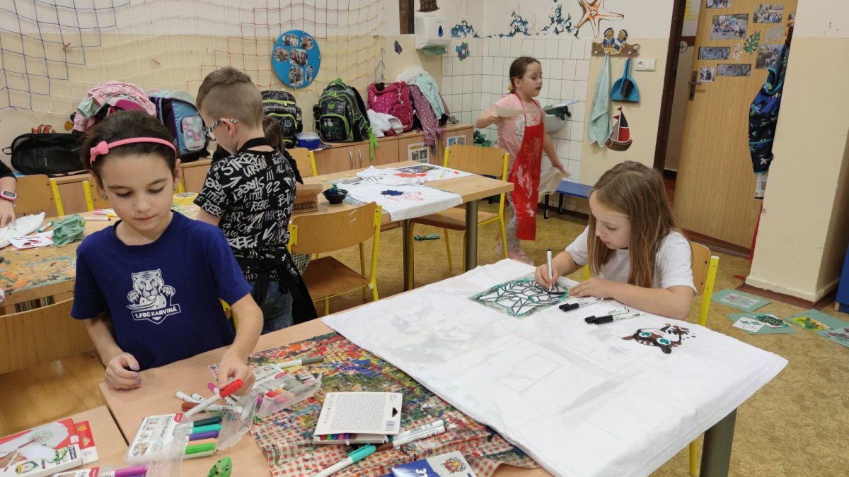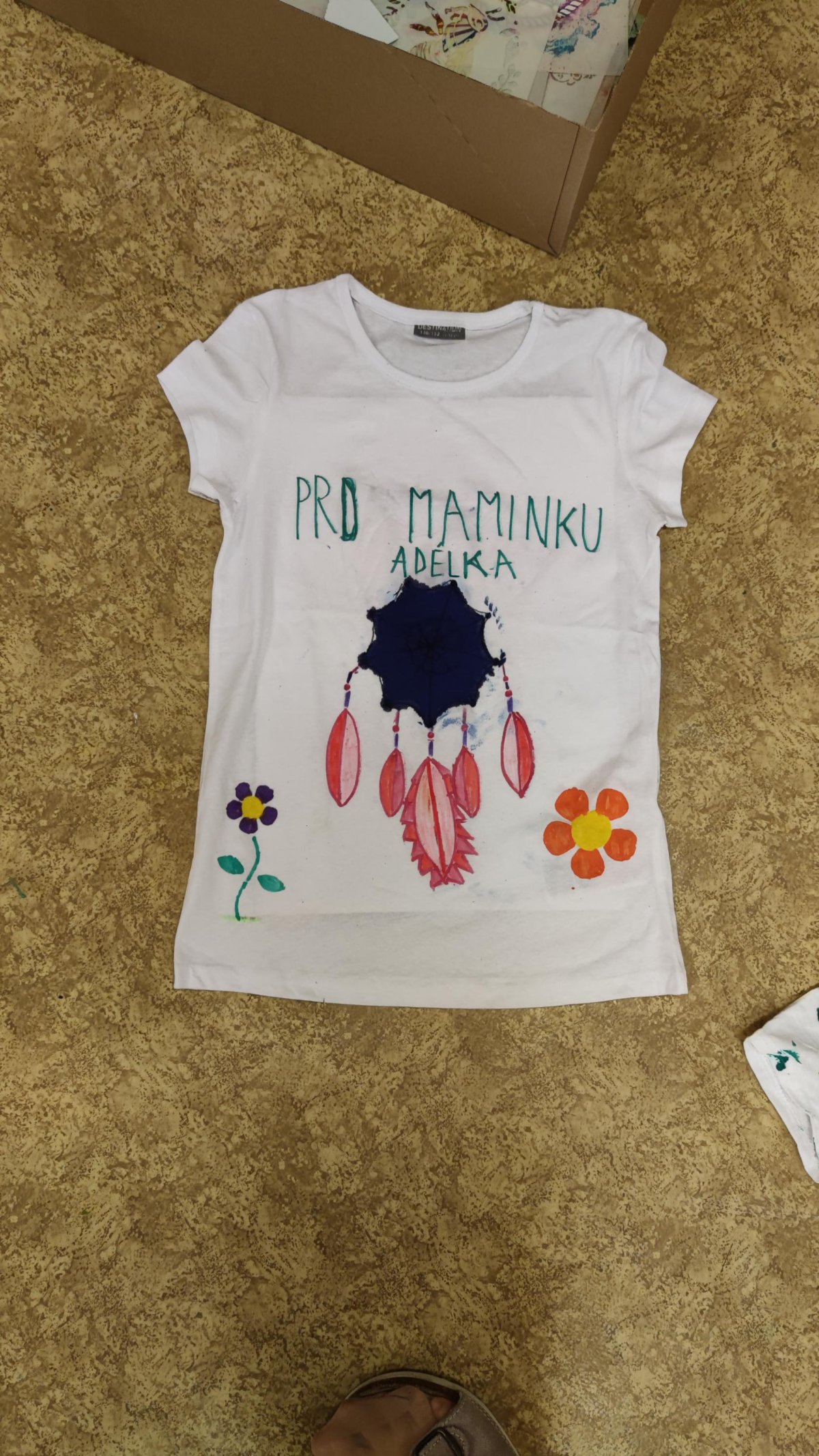 Seznámili jsme se s některými možnostmi, jak si nazdobit svá trička - využili jsme textilní fixy a spreje. Část trička jsme zdobili podle vlastní fantazie, část podle šablon.