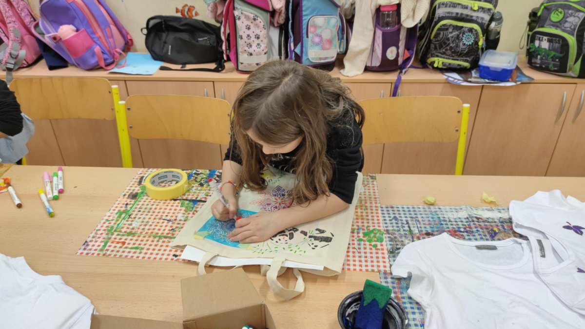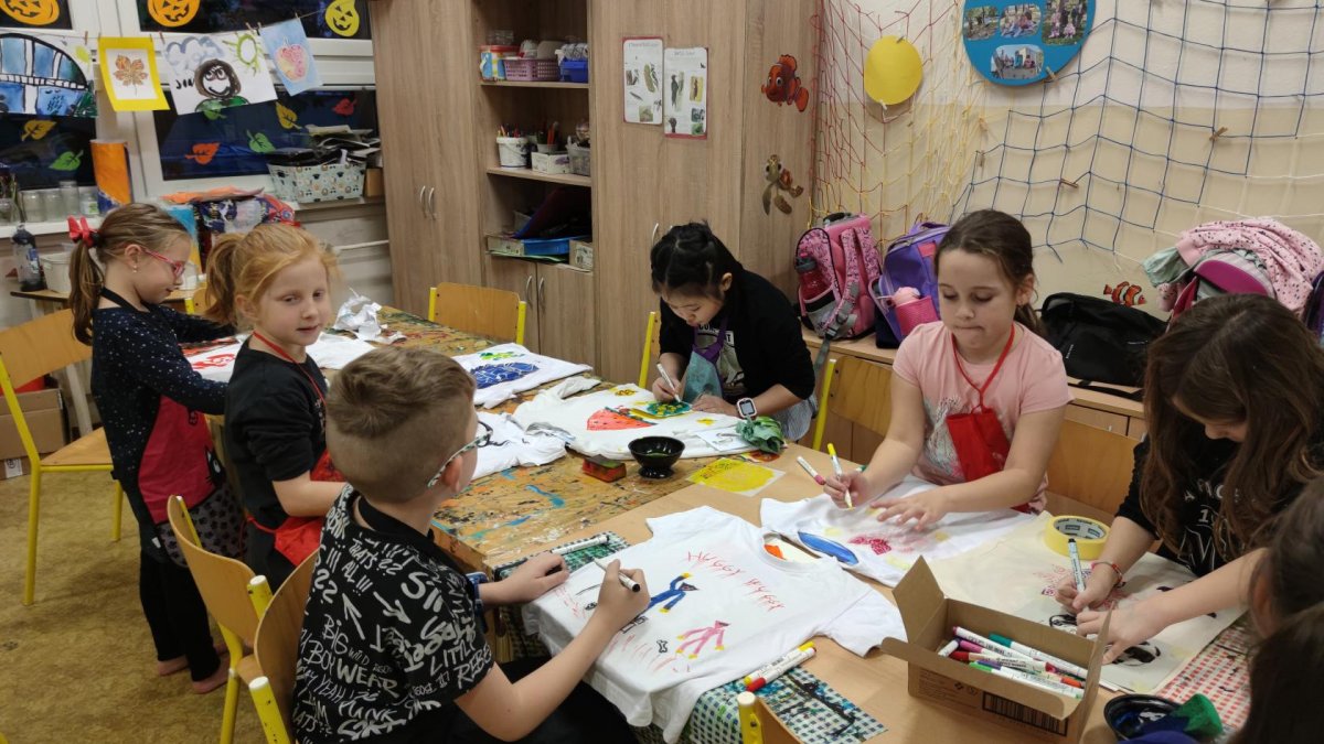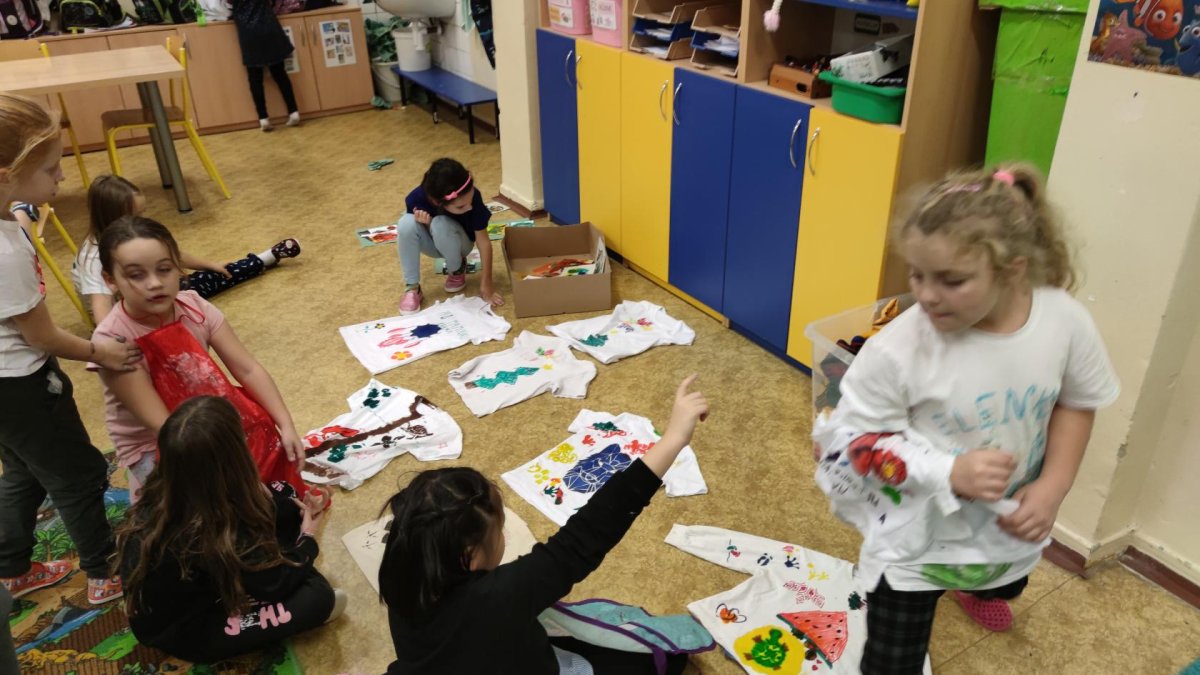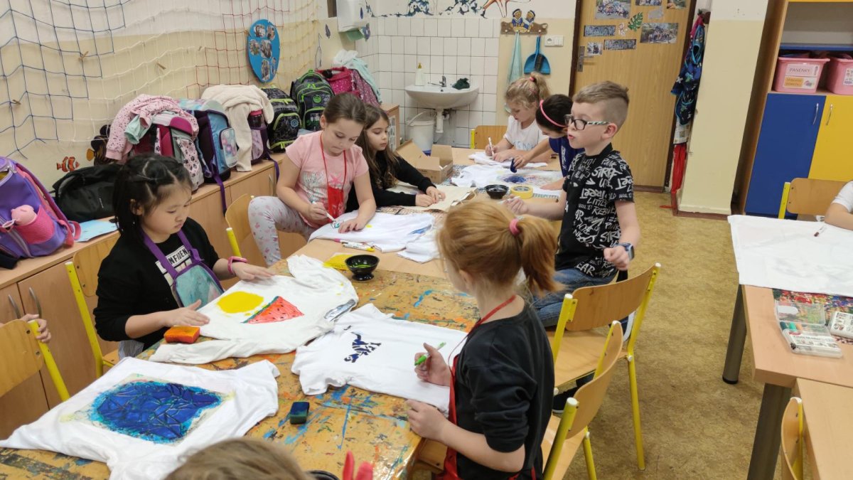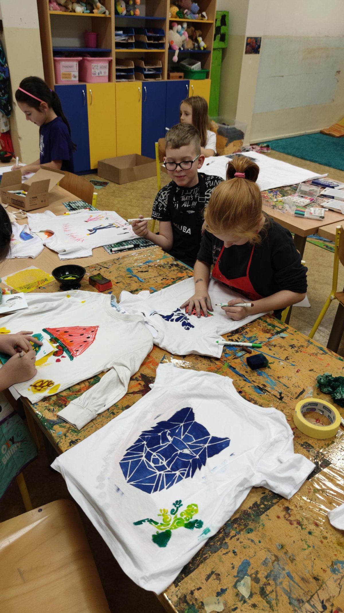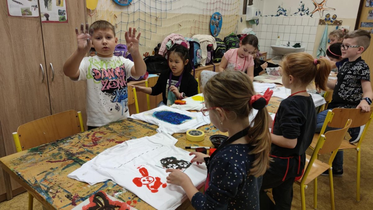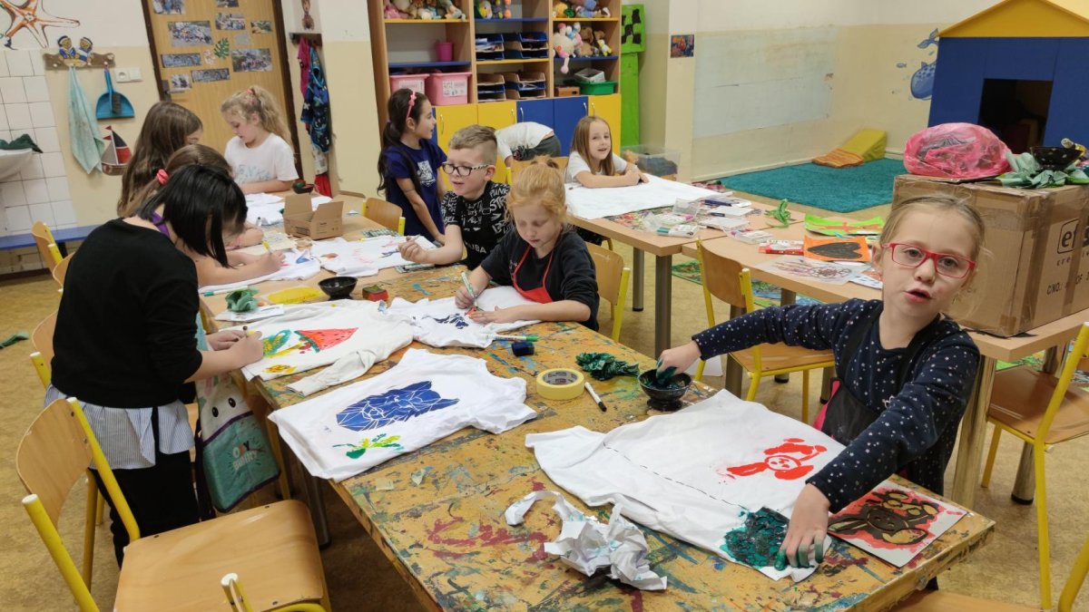 Seznámili jsme se s některými možnostmi, jak si nazdobit svá trička - využili jsme textilní fixy a spreje. Část trička jsme zdobili podle vlastní fantazie, část podle šablon.