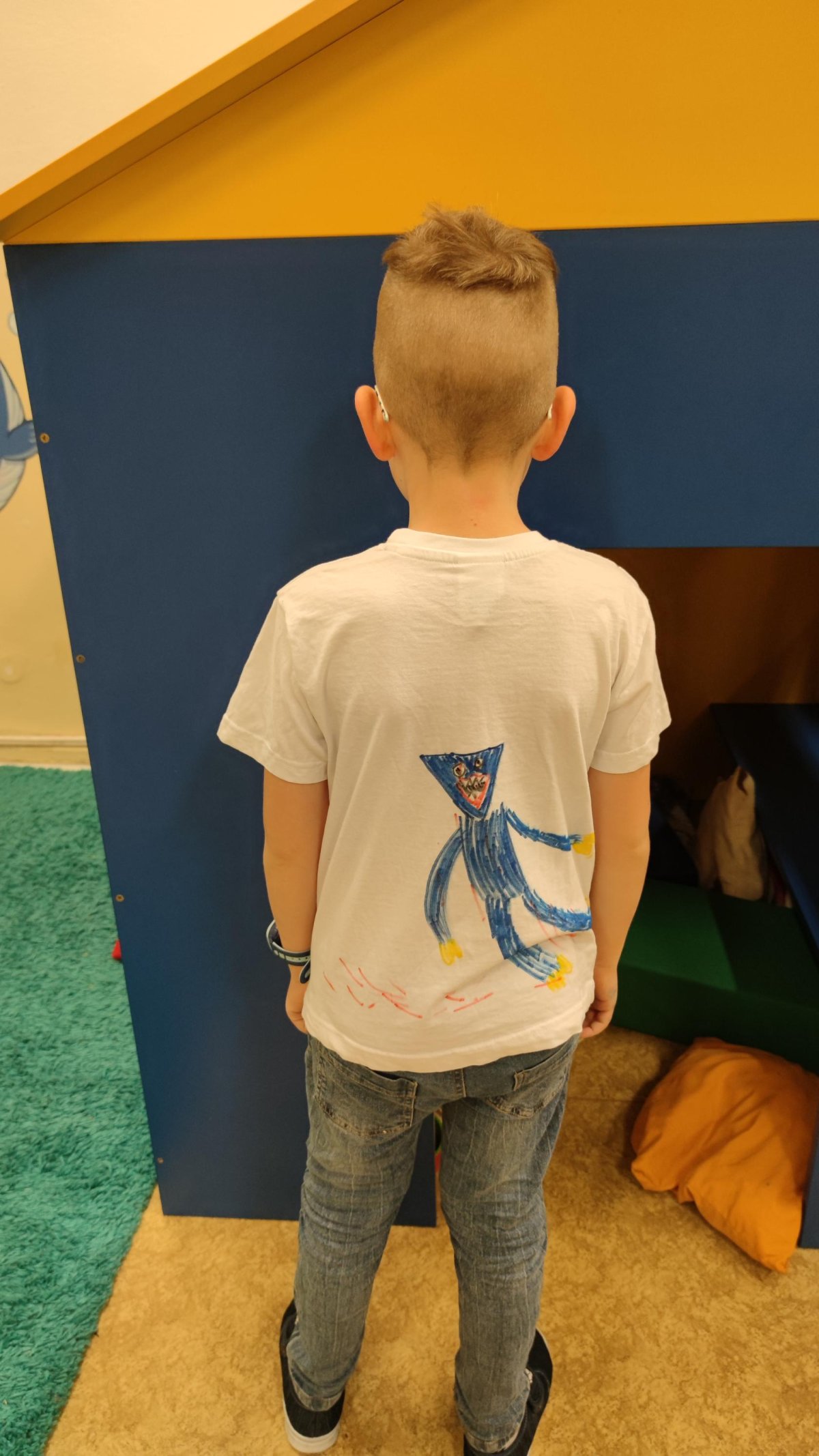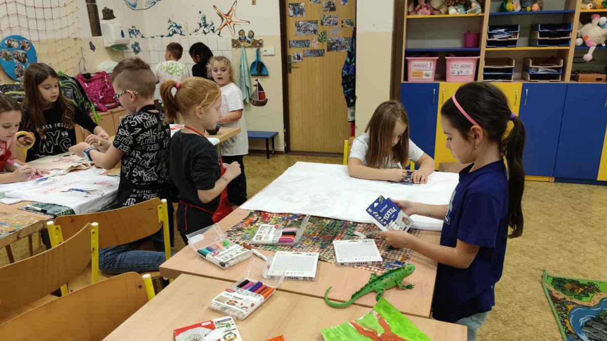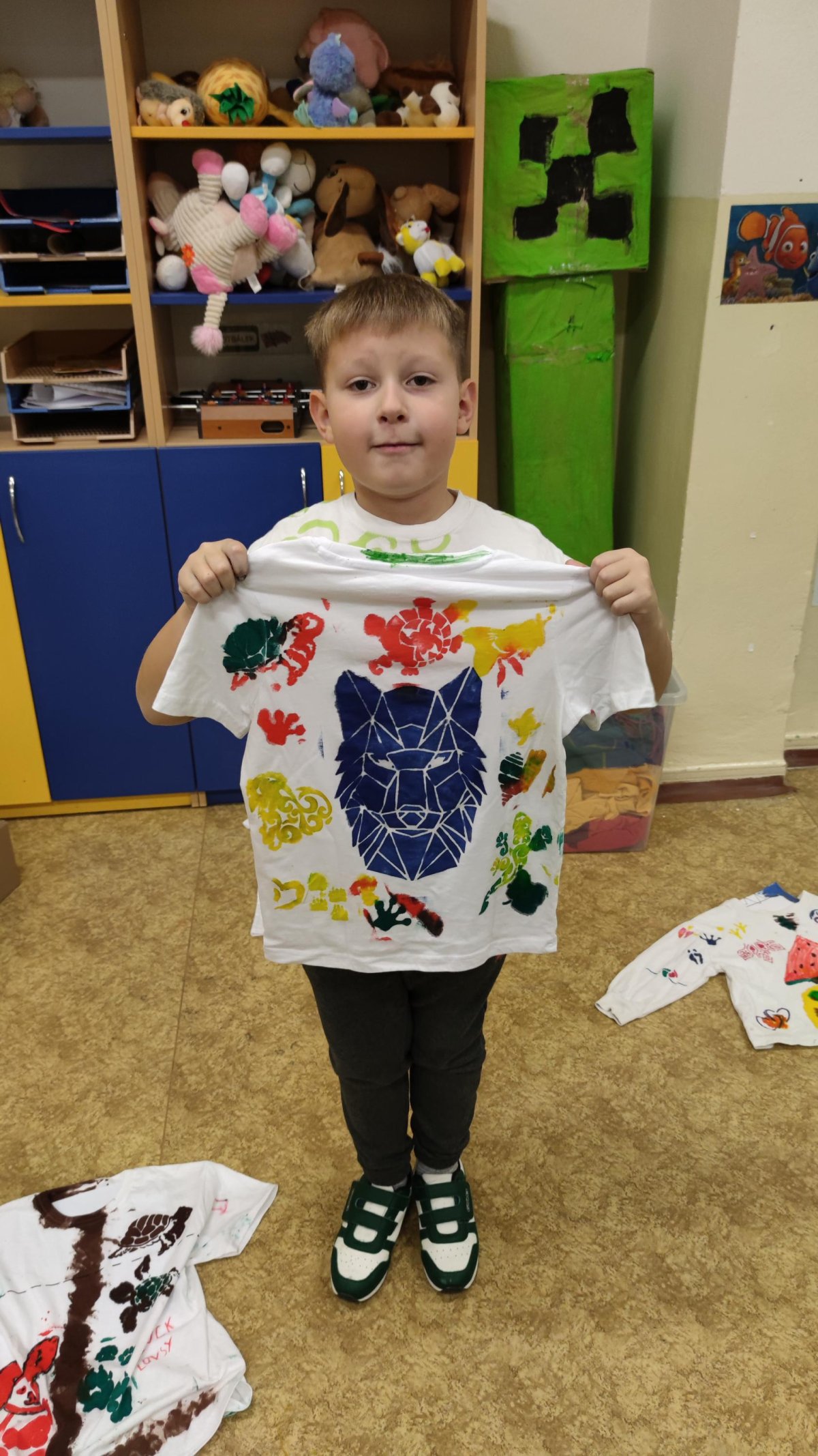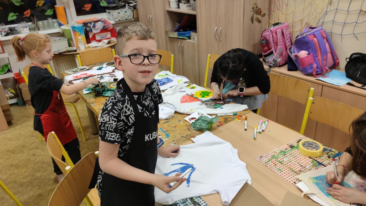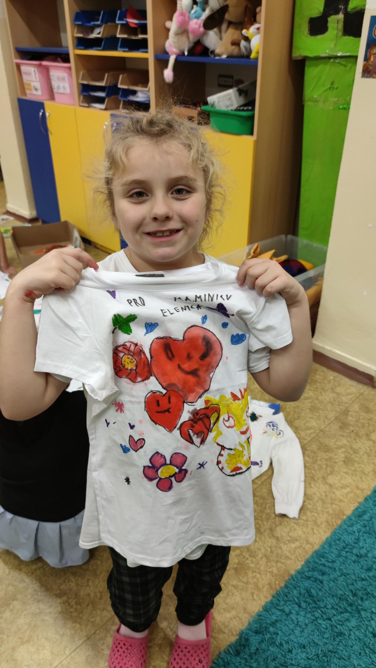 Seznámili jsme se s některými možnostmi, jak si nazdobit svá trička - využili jsme textilní fixy a spreje. Část trička jsme zdobili podle vlastní fantazie, část podle šablon.