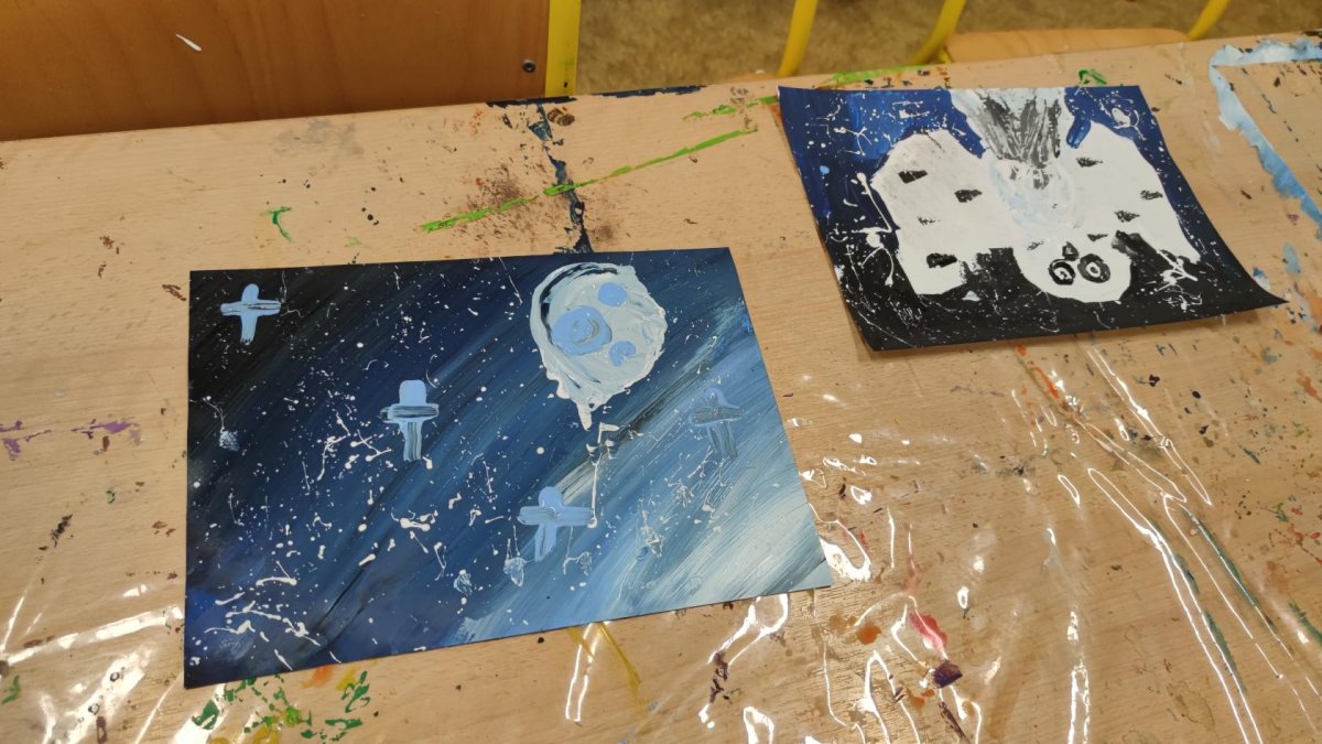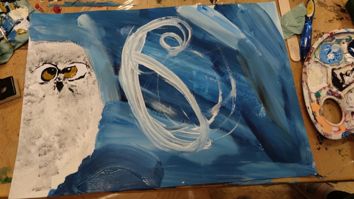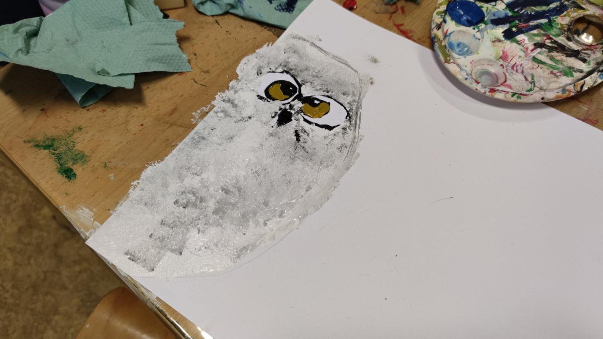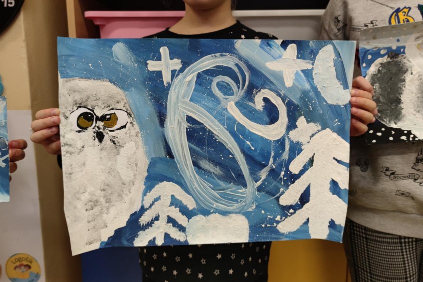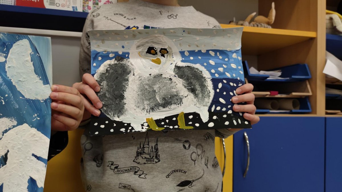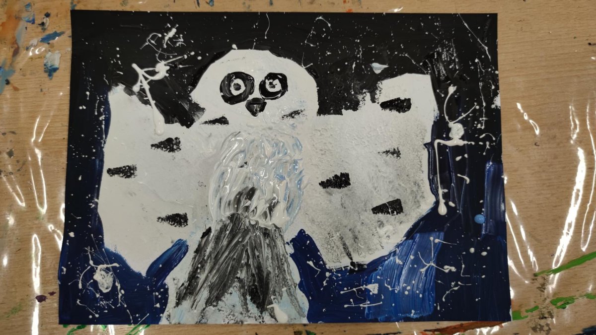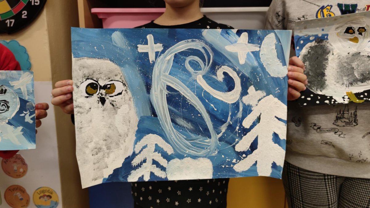 Druh této sovy se proslavil díky roli Hedviky z knížek a filmů o Harrym Potterovi. Na začátku kroužku nás čekala hádanka - pomocí nápověd ve formě obrázků a fotografií jsme hádali, co budeme malovat. Pak už jsme se pustili do tvorby pomocí štětců, kartáčků u špachtlí. Na papír jsme natírali, ťupkovali, roztírali i stříkali akrylové barvy. Někteří z nás se odklonili od tématu, a tak jsme na konci kroužku kromě sovic sněžných mohli vidět i obrazy z vesmíru.