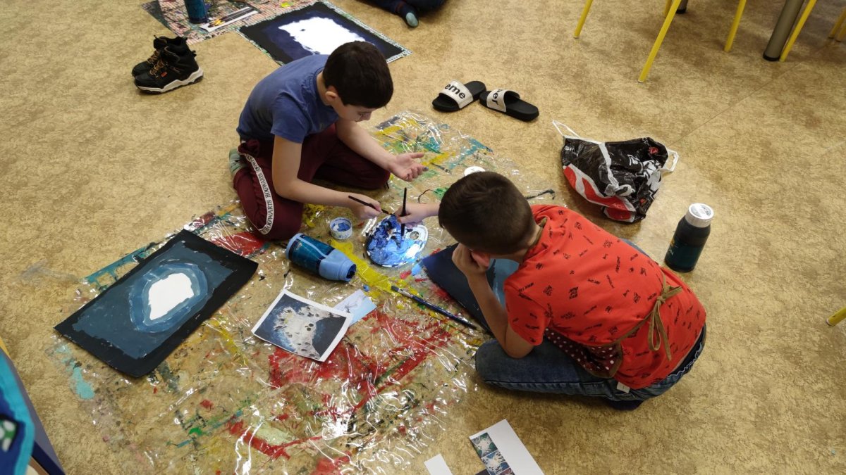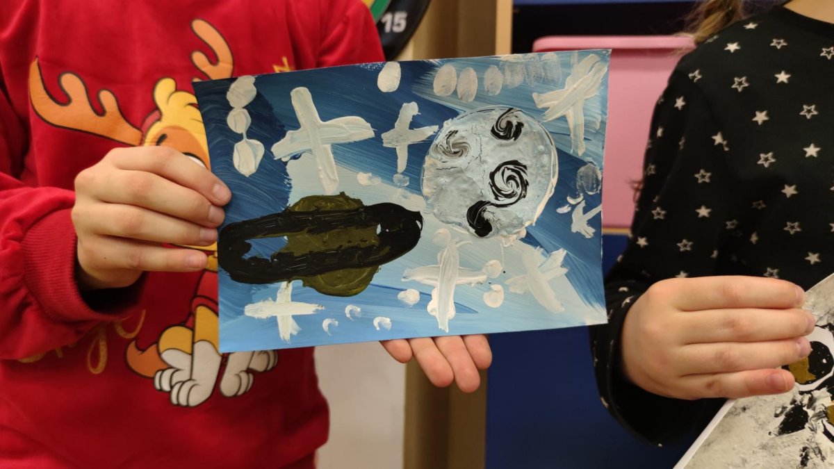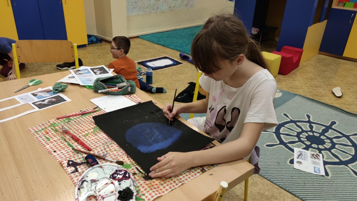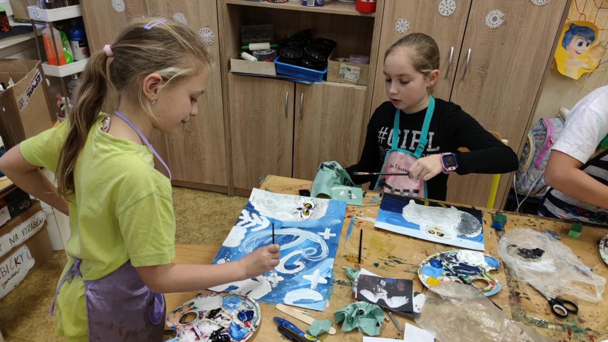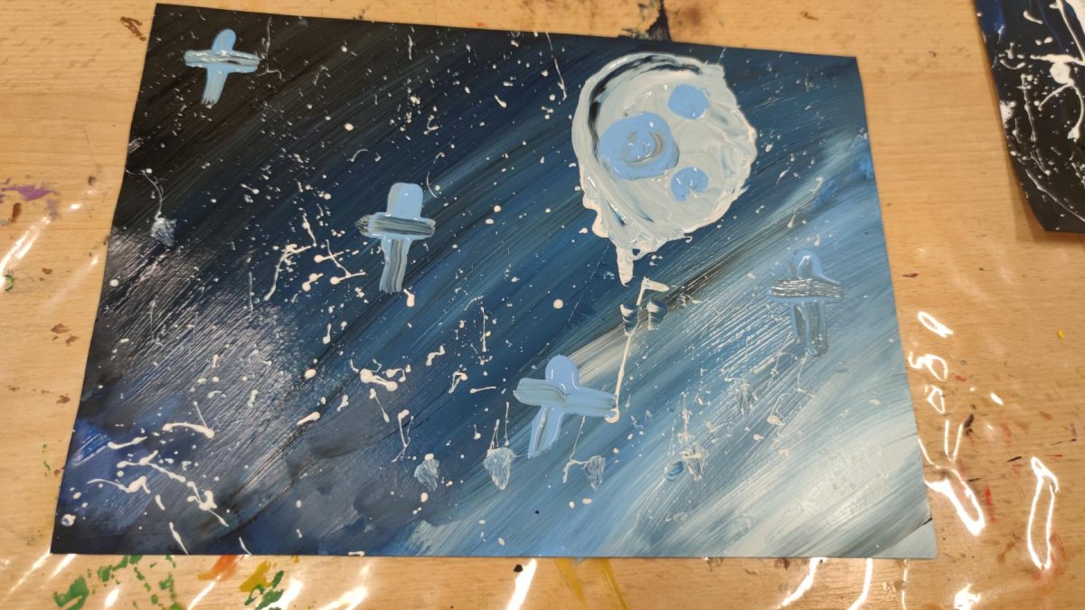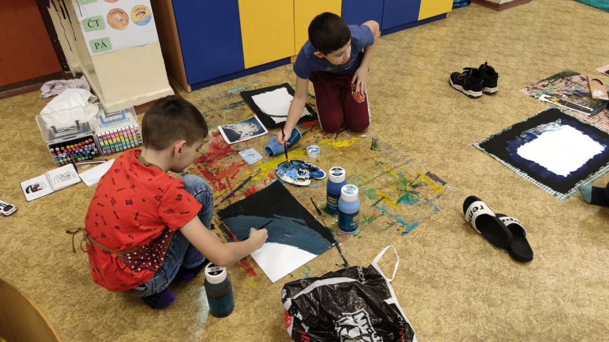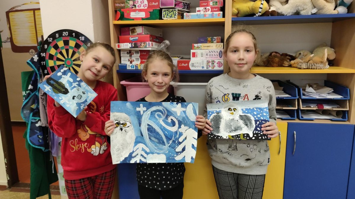 Druh této sovy se proslavil díky roli Hedviky z knížek a filmů o Harrym Potterovi. Na začátku kroužku nás čekala hádanka - pomocí nápověd ve formě obrázků a fotografií jsme hádali, co budeme malovat. Pak už jsme se pustili do tvorby pomocí štětců, kartáčků u špachtlí. Na papír jsme natírali, ťupkovali, roztírali i stříkali akrylové barvy. Někteří z nás se odklonili od tématu, a tak jsme na konci kroužku kromě sovic sněžných mohli vidět i obrazy z vesmíru.