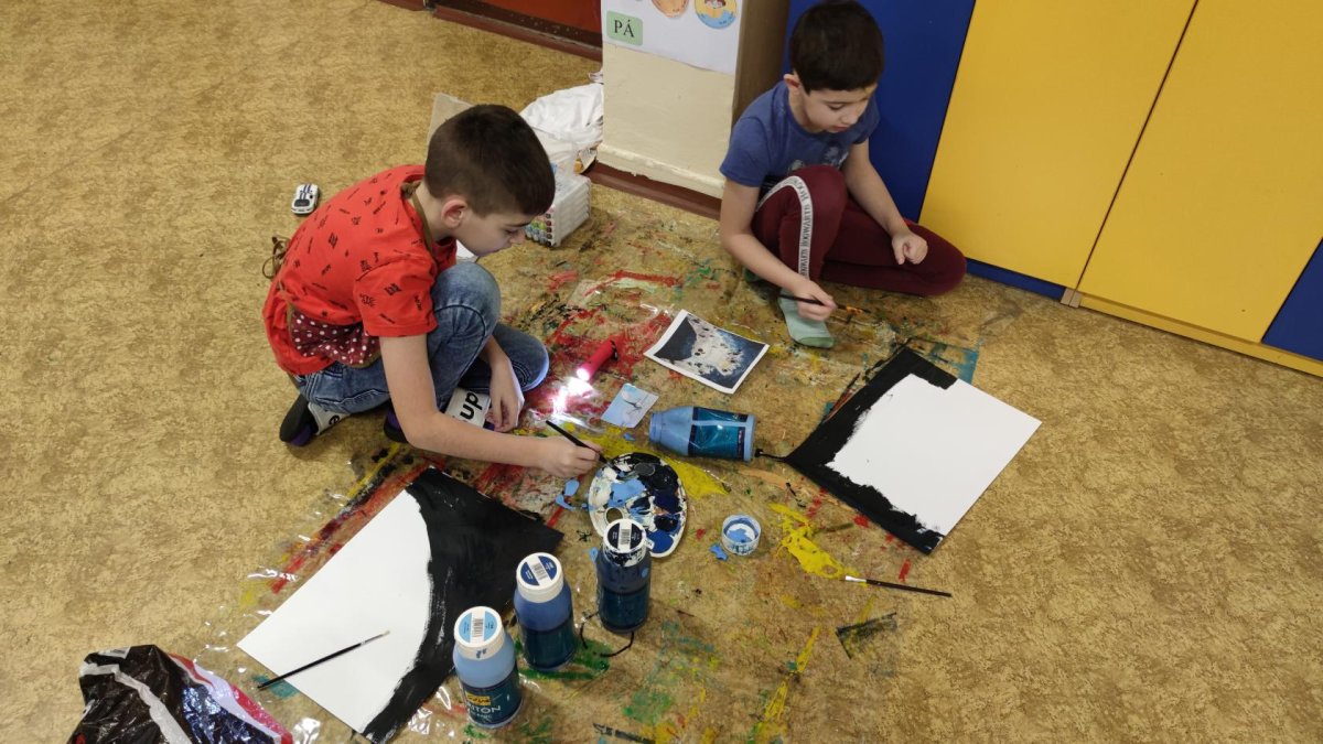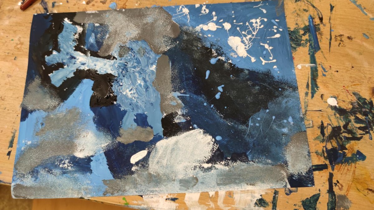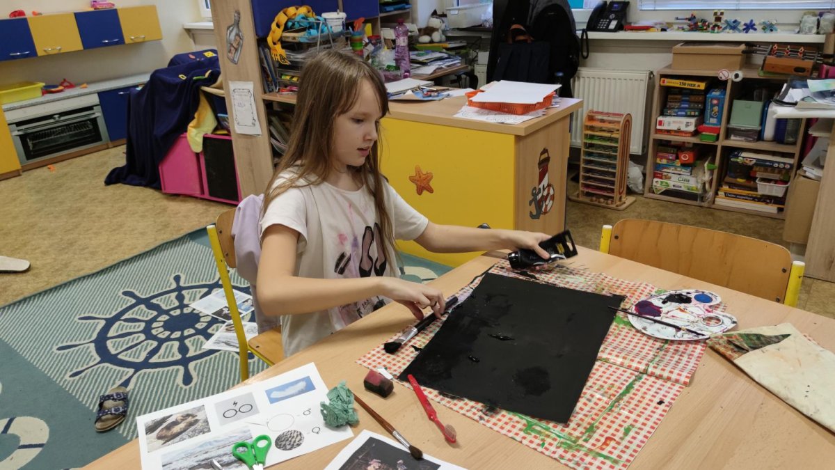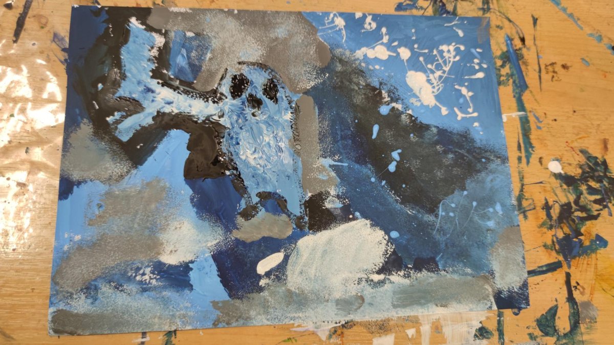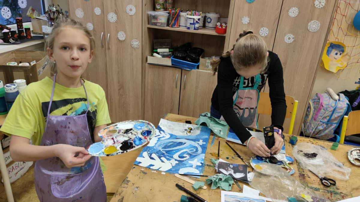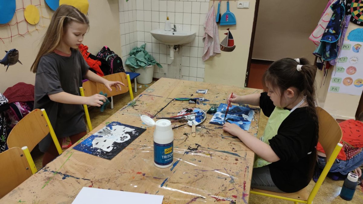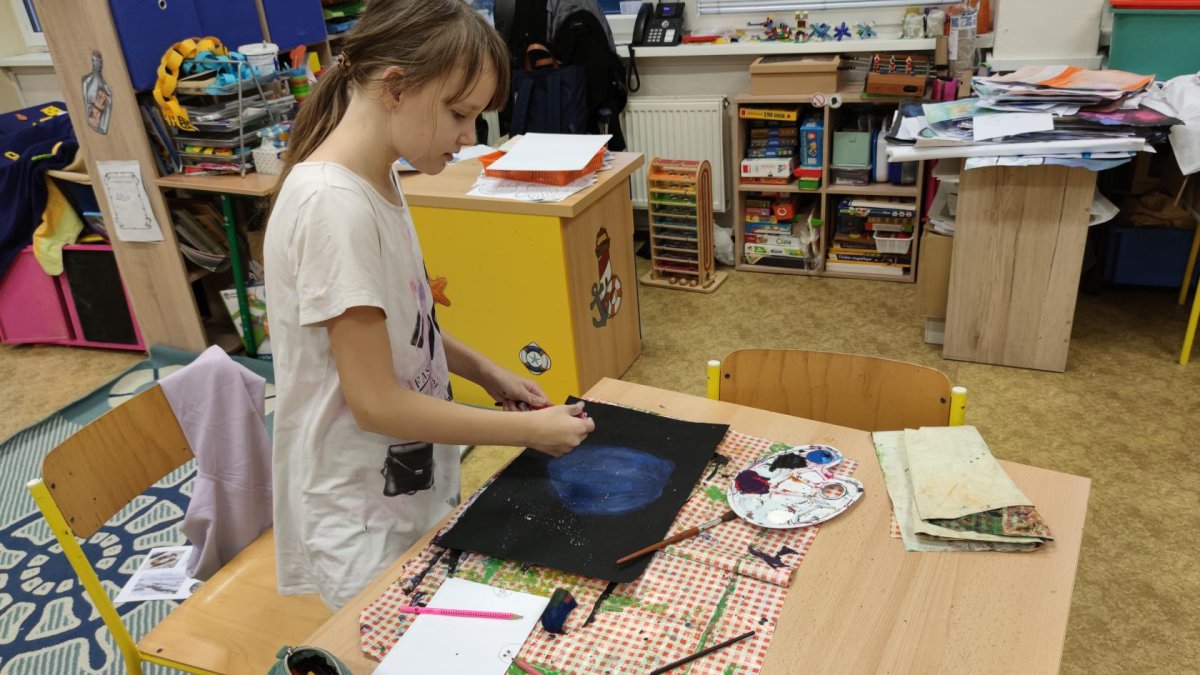 Druh této sovy se proslavil díky roli Hedviky z knížek a filmů o Harrym Potterovi. Na začátku kroužku nás čekala hádanka - pomocí nápověd ve formě obrázků a fotografií jsme hádali, co budeme malovat. Pak už jsme se pustili do tvorby pomocí štětců, kartáčků u špachtlí. Na papír jsme natírali, ťupkovali, roztírali i stříkali akrylové barvy. Někteří z nás se odklonili od tématu, a tak jsme na konci kroužku kromě sovic sněžných mohli vidět i obrazy z vesmíru.