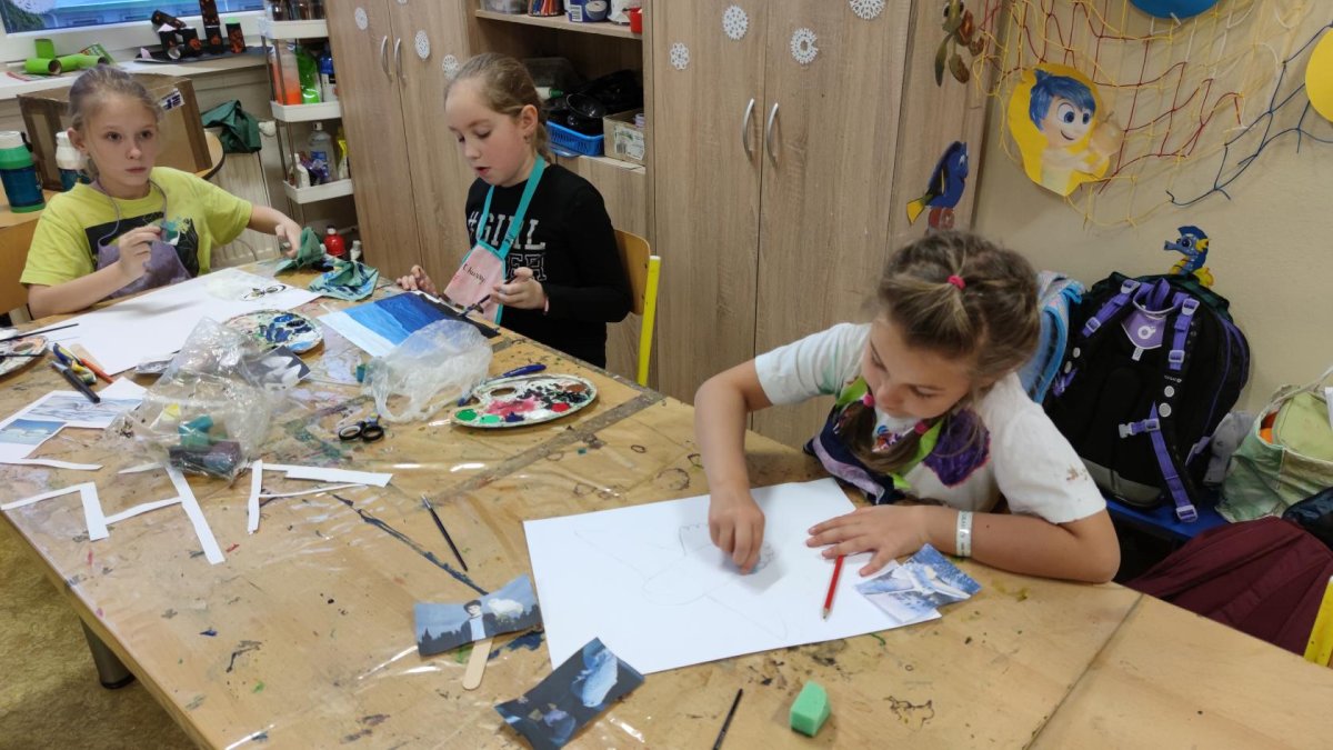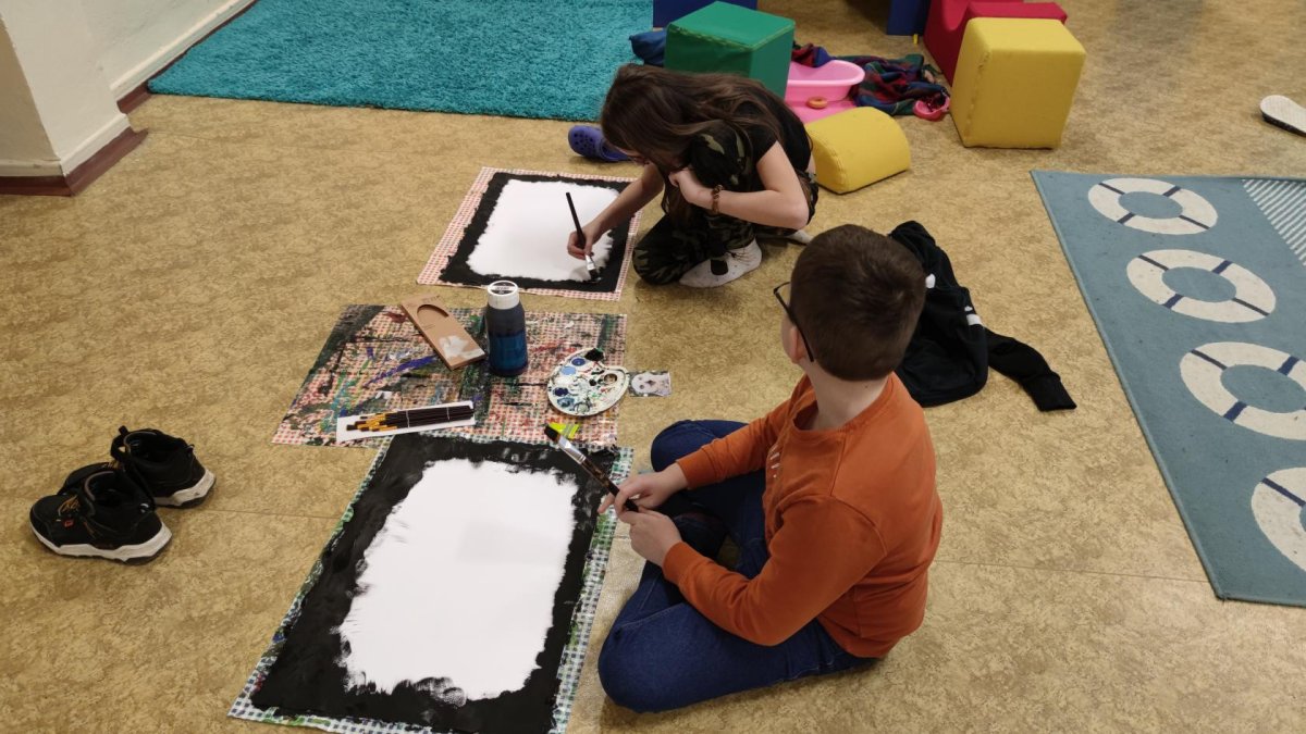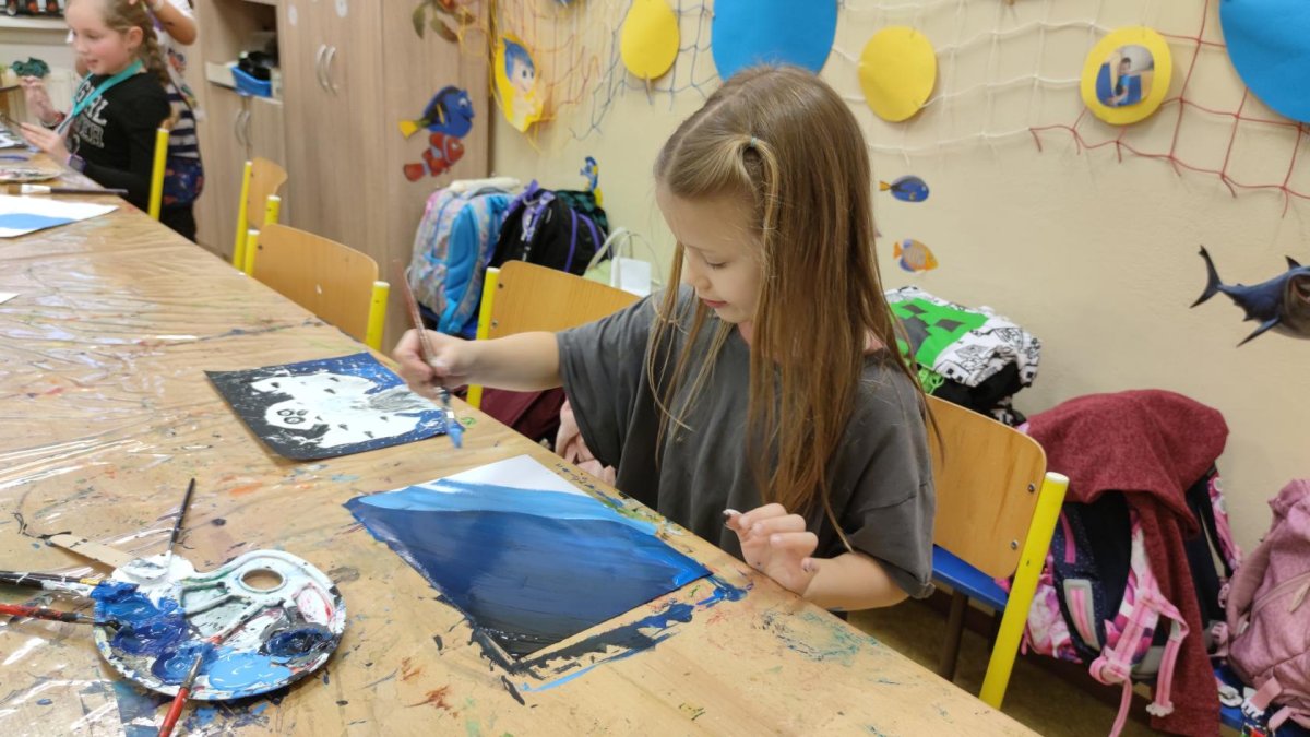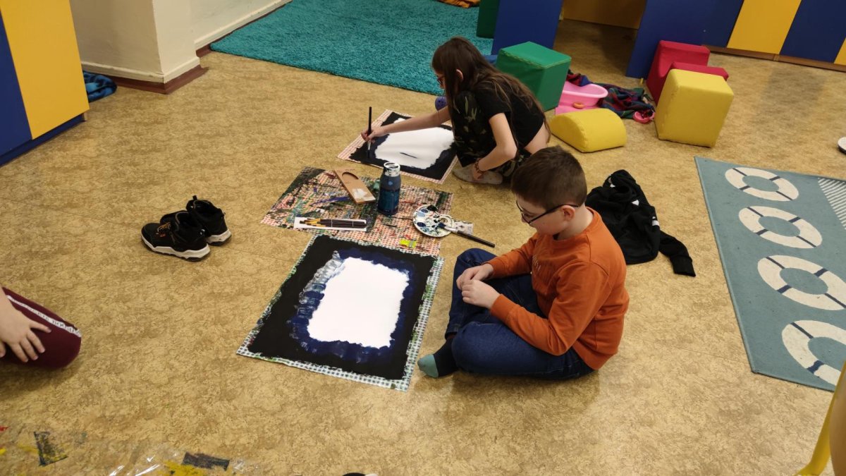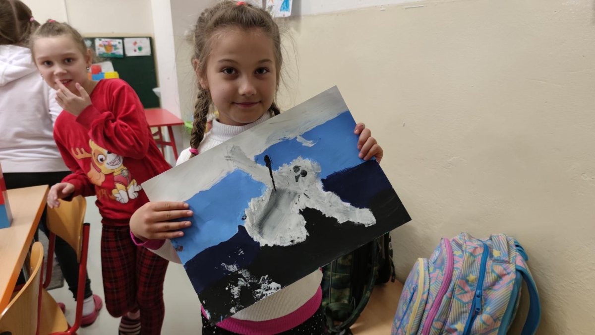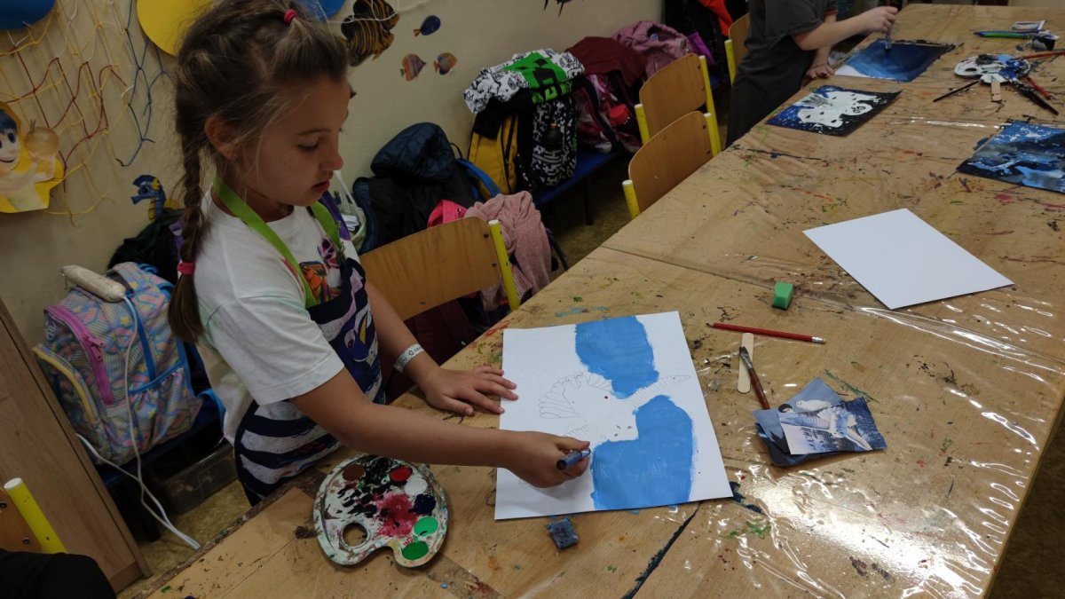 Druh této sovy se proslavil díky roli Hedviky z knížek a filmů o Harrym Potterovi. Na začátku kroužku nás čekala hádanka - pomocí nápověd ve formě obrázků a fotografií jsme hádali, co budeme malovat. Pak už jsme se pustili do tvorby pomocí štětců, kartáčků u špachtlí. Na papír jsme natírali, ťupkovali, roztírali i stříkali akrylové barvy. Někteří z nás se odklonili od tématu, a tak jsme na konci kroužku kromě sovic sněžných mohli vidět i obrazy z vesmíru.