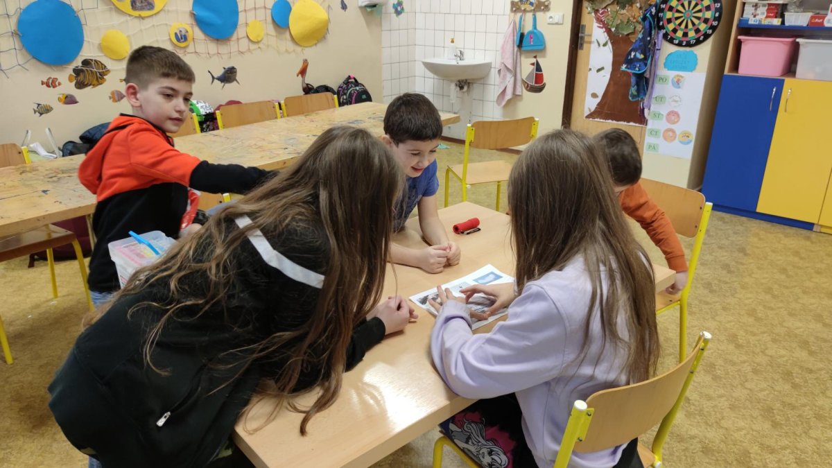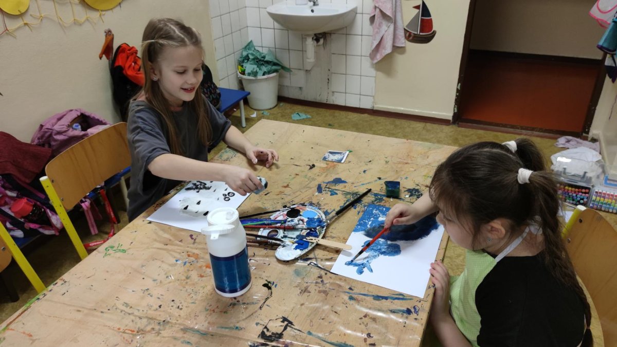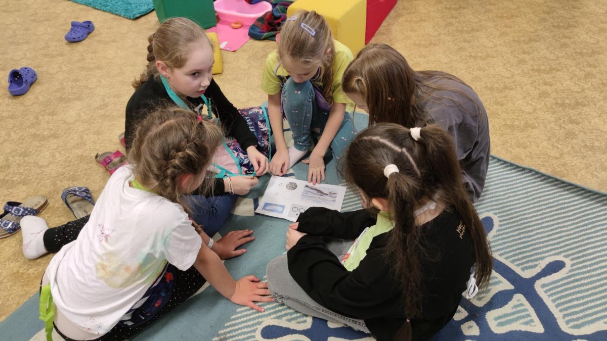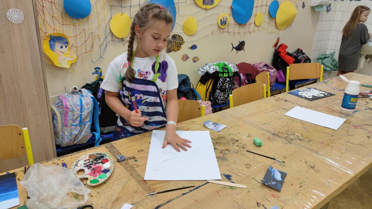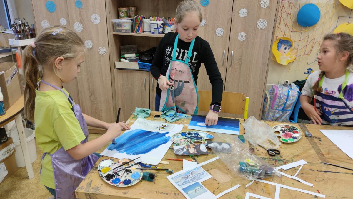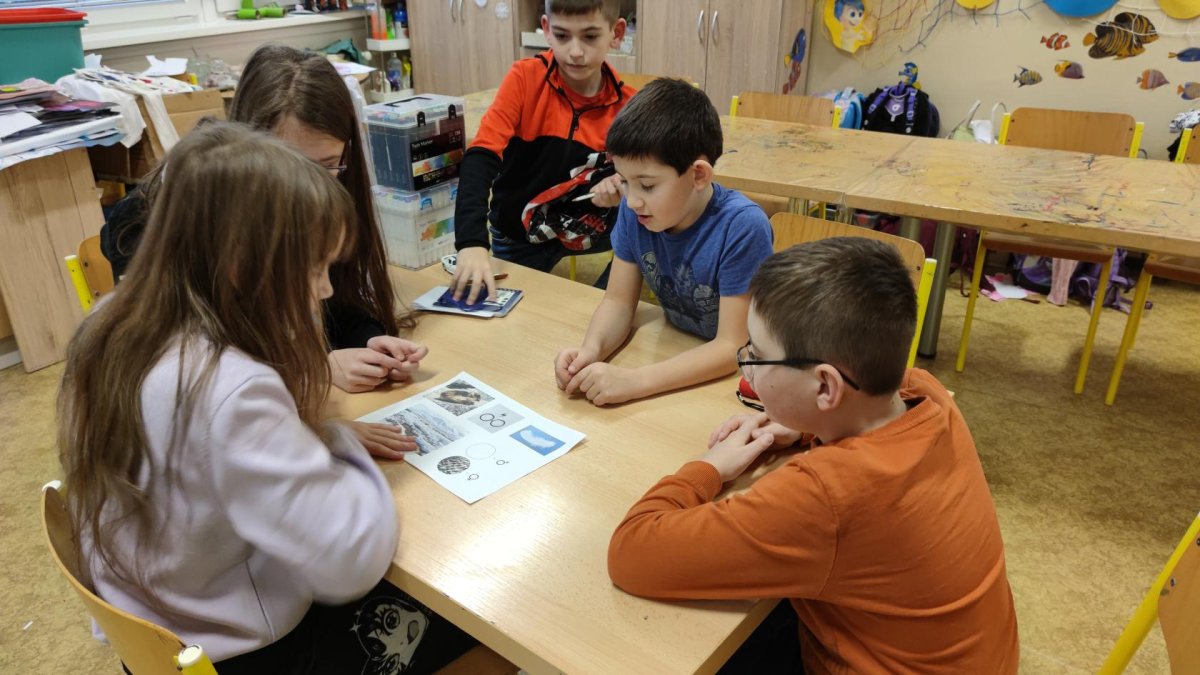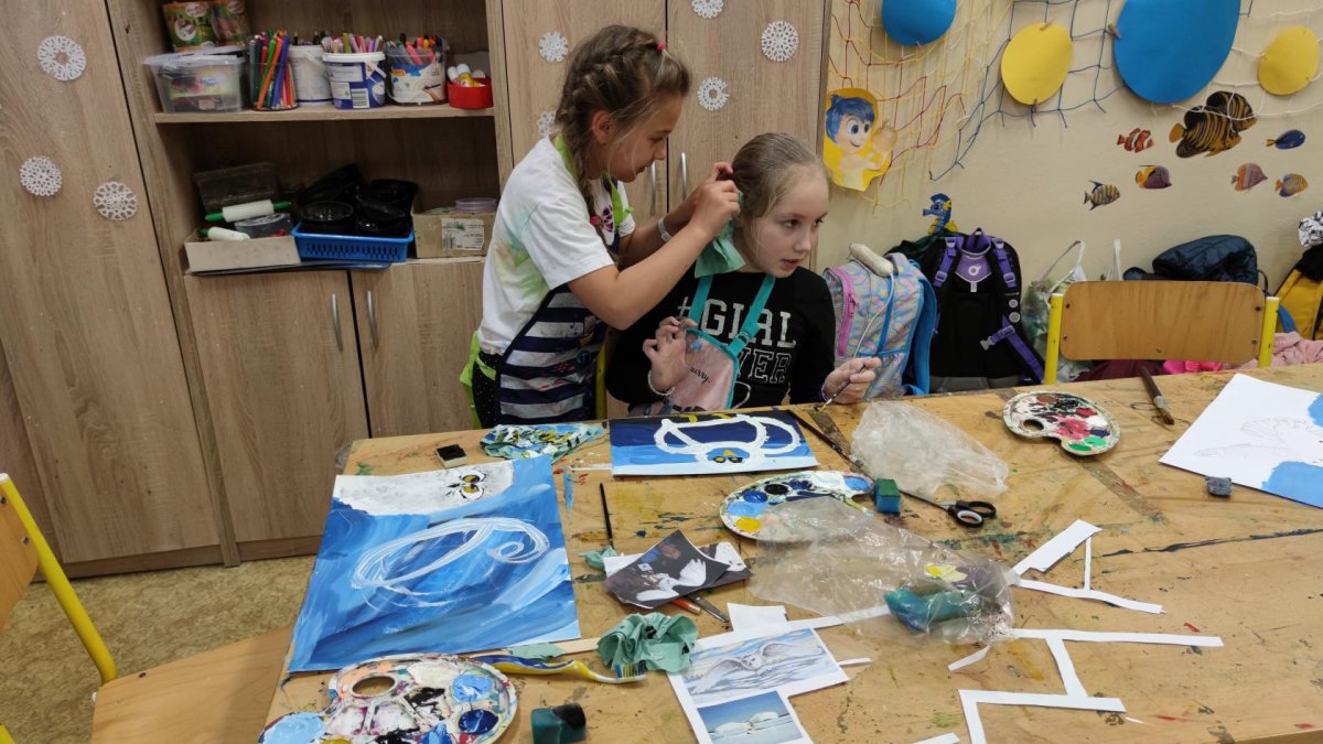 Druh této sovy se proslavil díky roli Hedviky z knížek a filmů o Harrym Potterovi. Na začátku kroužku nás čekala hádanka - pomocí nápověd ve formě obrázků a fotografií jsme hádali, co budeme malovat. Pak už jsme se pustili do tvorby pomocí štětců, kartáčků u špachtlí. Na papír jsme natírali, ťupkovali, roztírali i stříkali akrylové barvy. Někteří z nás se odklonili od tématu, a tak jsme na konci kroužku kromě sovic sněžných mohli vidět i obrazy z vesmíru.