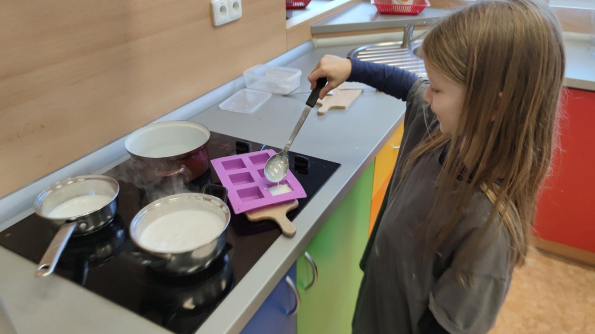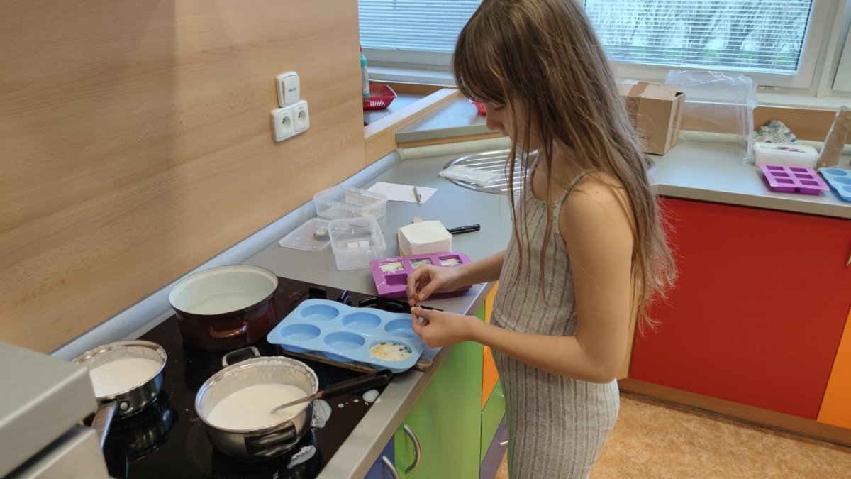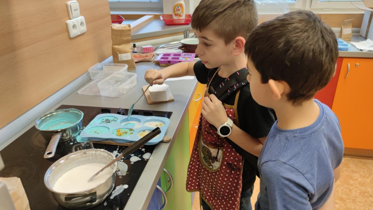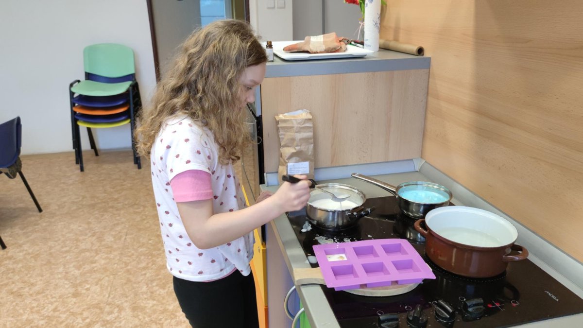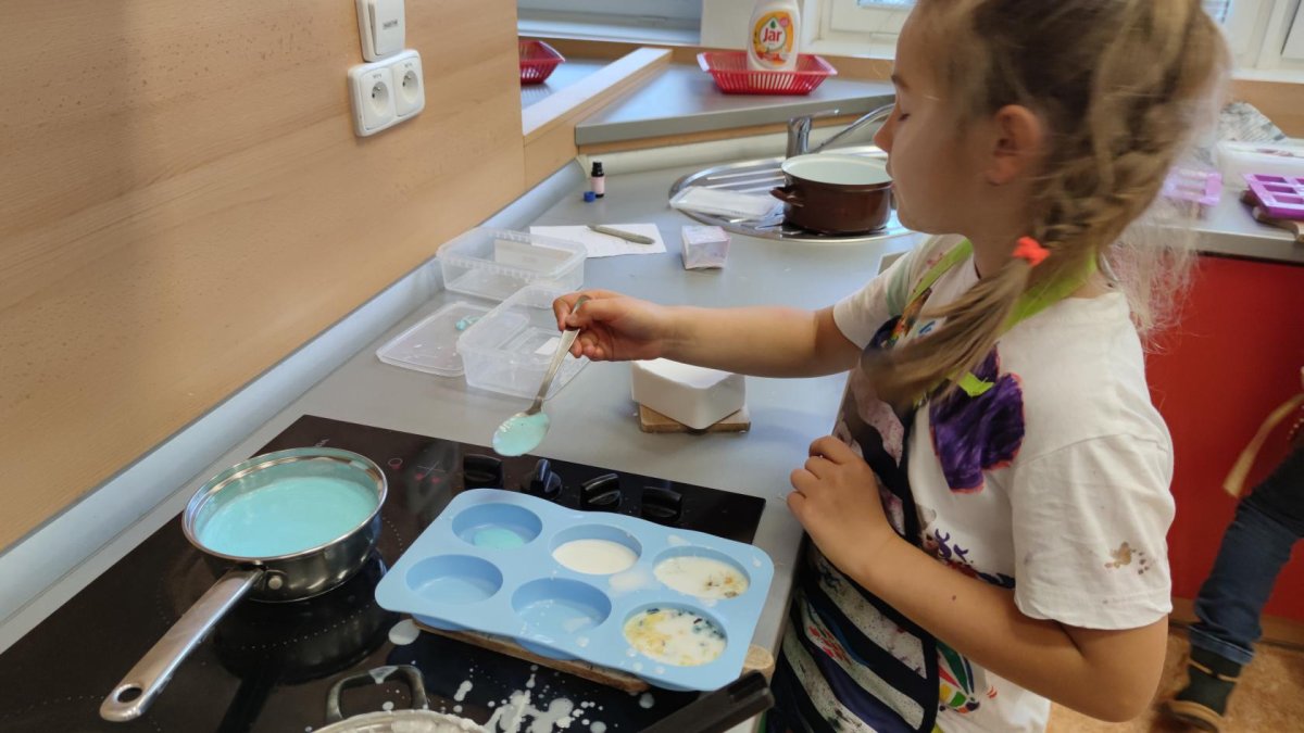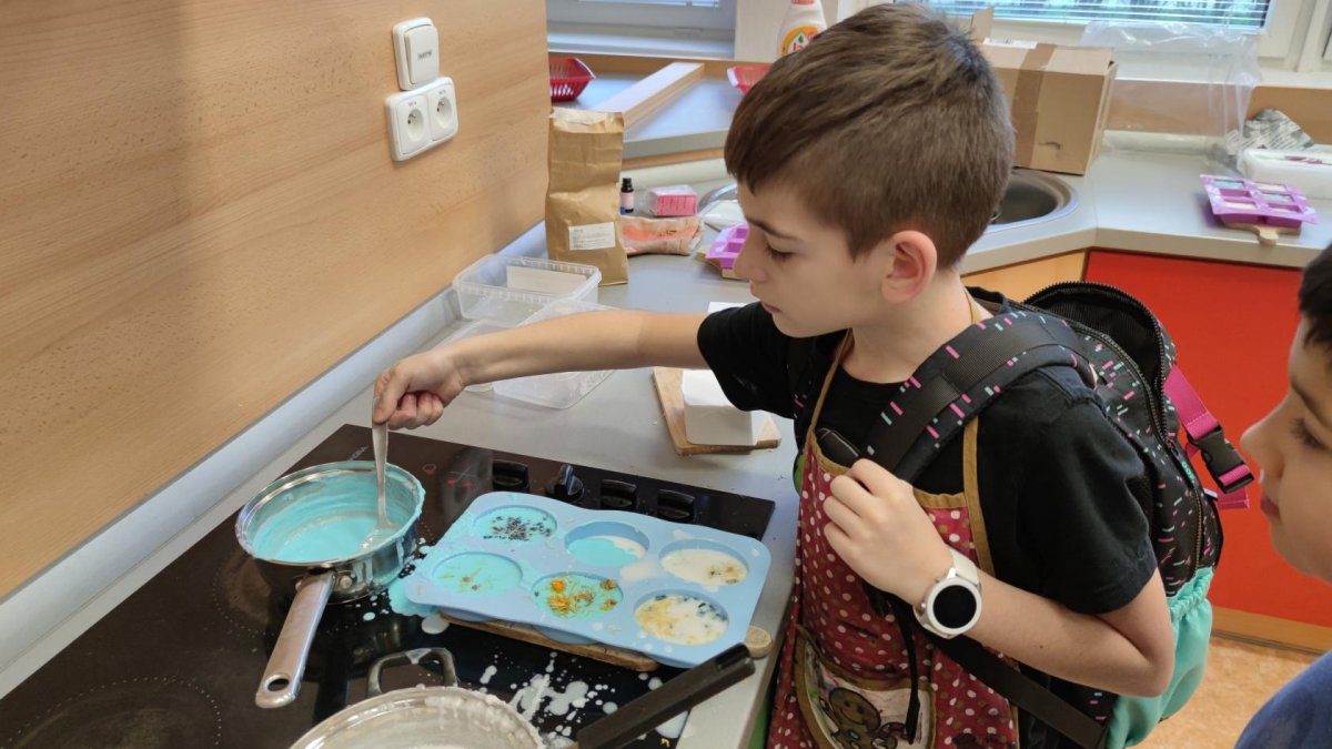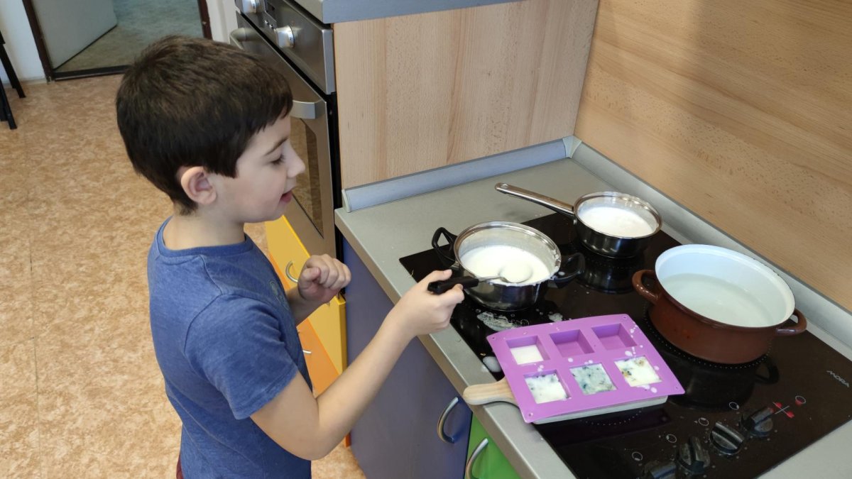 Rádi si vyrobíme domácí mýdlo. Tentokrát jsme naši výrobu posunuli zase o kousek dál a poprvé jsme si vyzkoušeli obarvení mýdlové hmoty, a tak máme krásně šmoulí modrou. Mýdla budeme ještě příště dokončovat. Kdo zrovna netvořil mýdlo, rozvíjel představivost a výtvarné myšlení - kreslili jsme totiž to, co k sobě (ne)patří :).