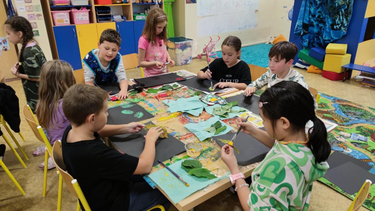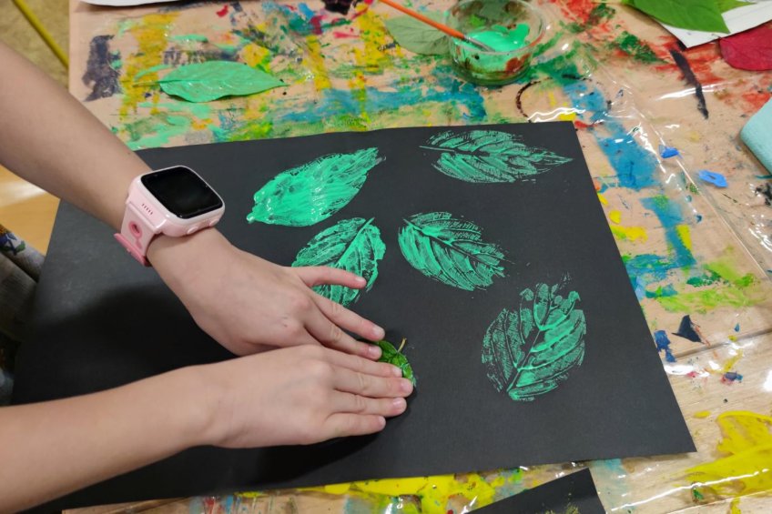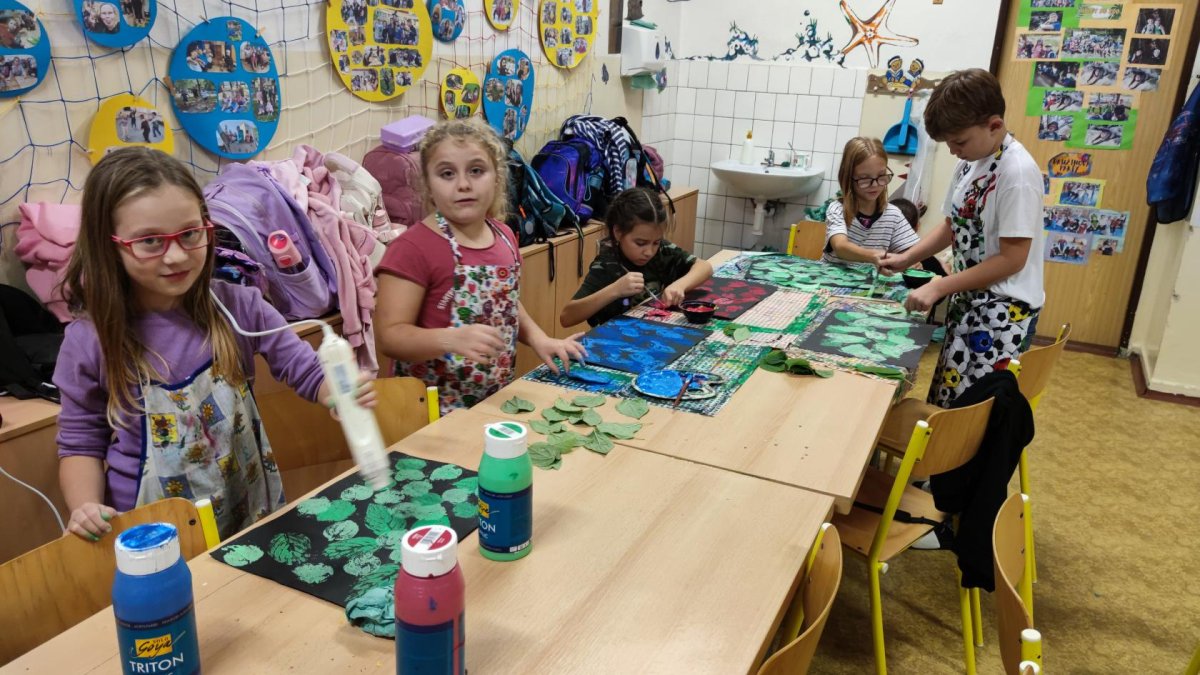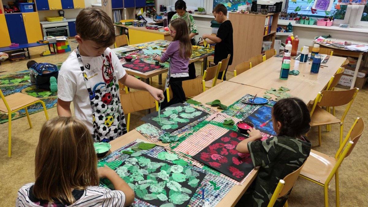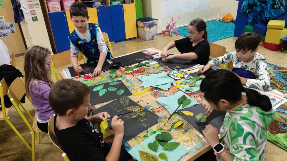 První kroužek byl ve znamení seznamování se. Zahráli jsme si výtvarnou seznamovací hru se slavnými obrazy umělců. Poté už jsme se vrhli na tvoření. Otiskávali jsme listy v několika vrstvách, díky čemuž jsme si vyzkoušeli zesvětlování a poznali vlastnosti akrylových barev.