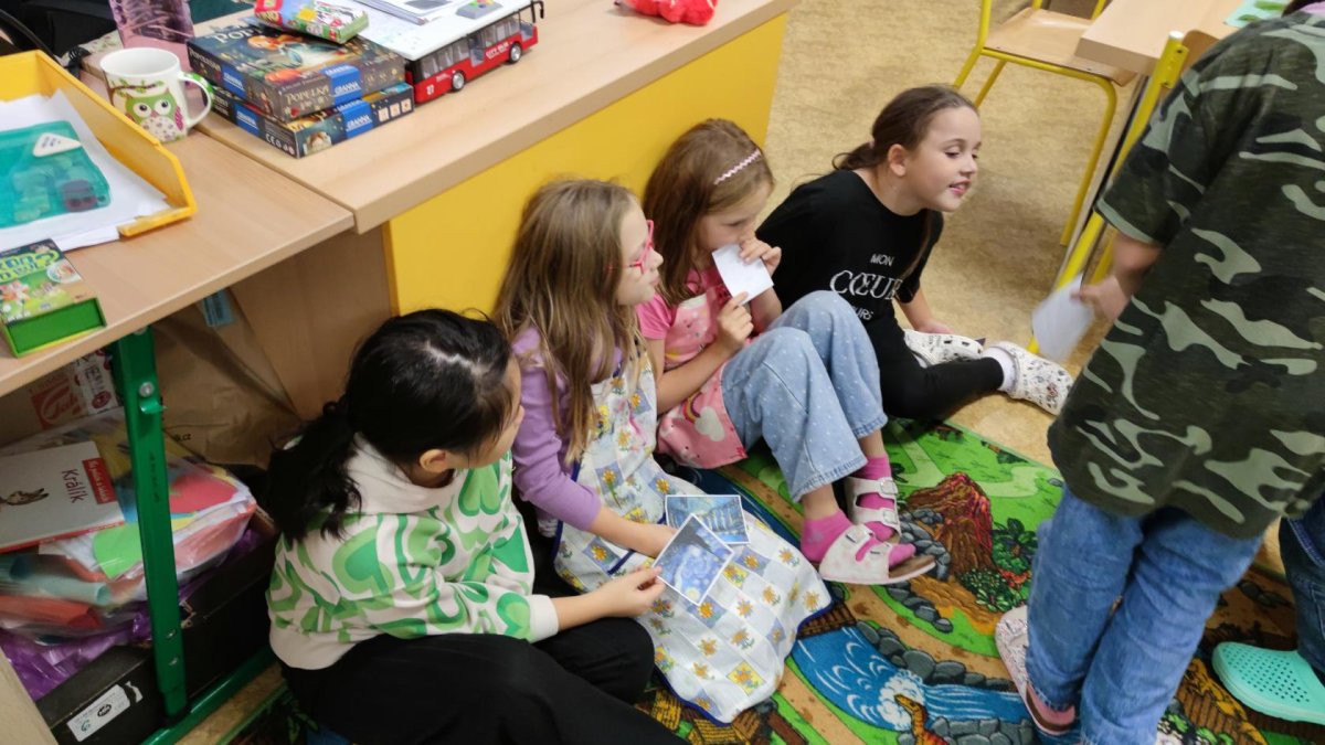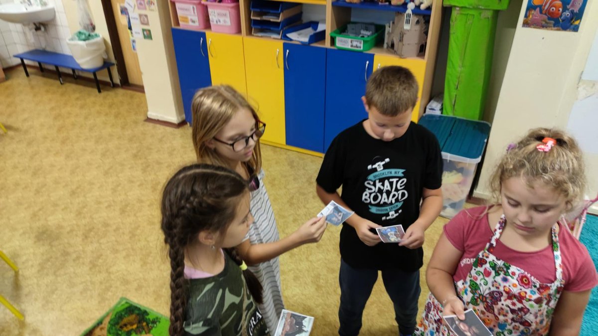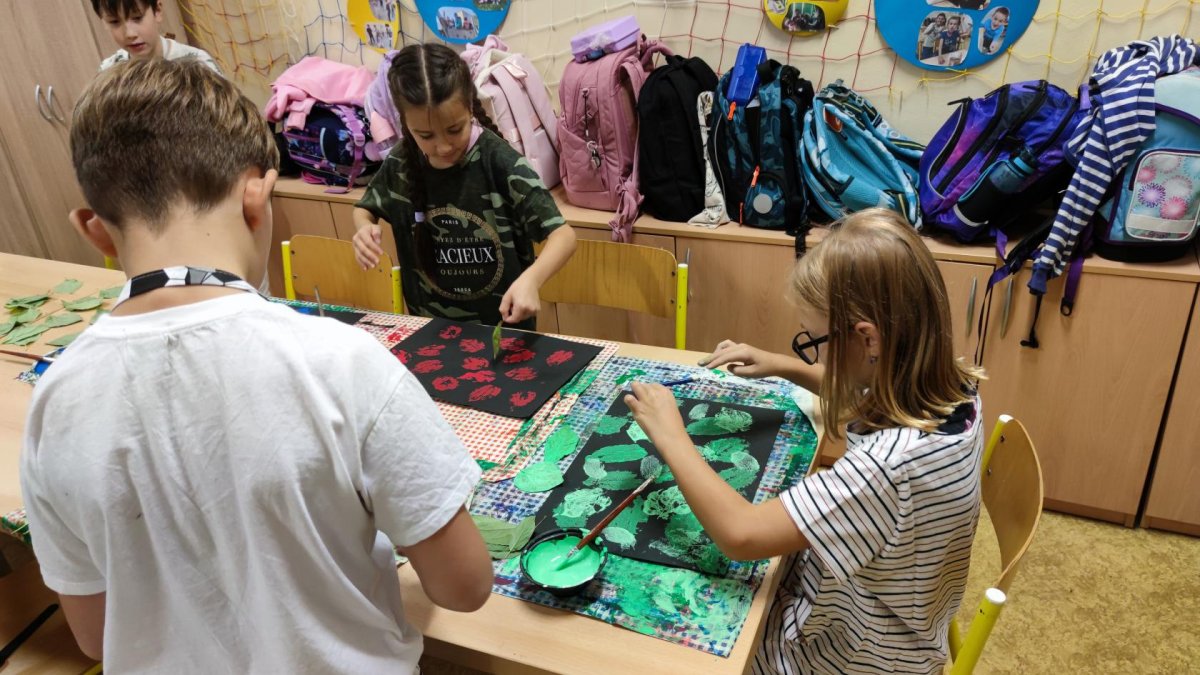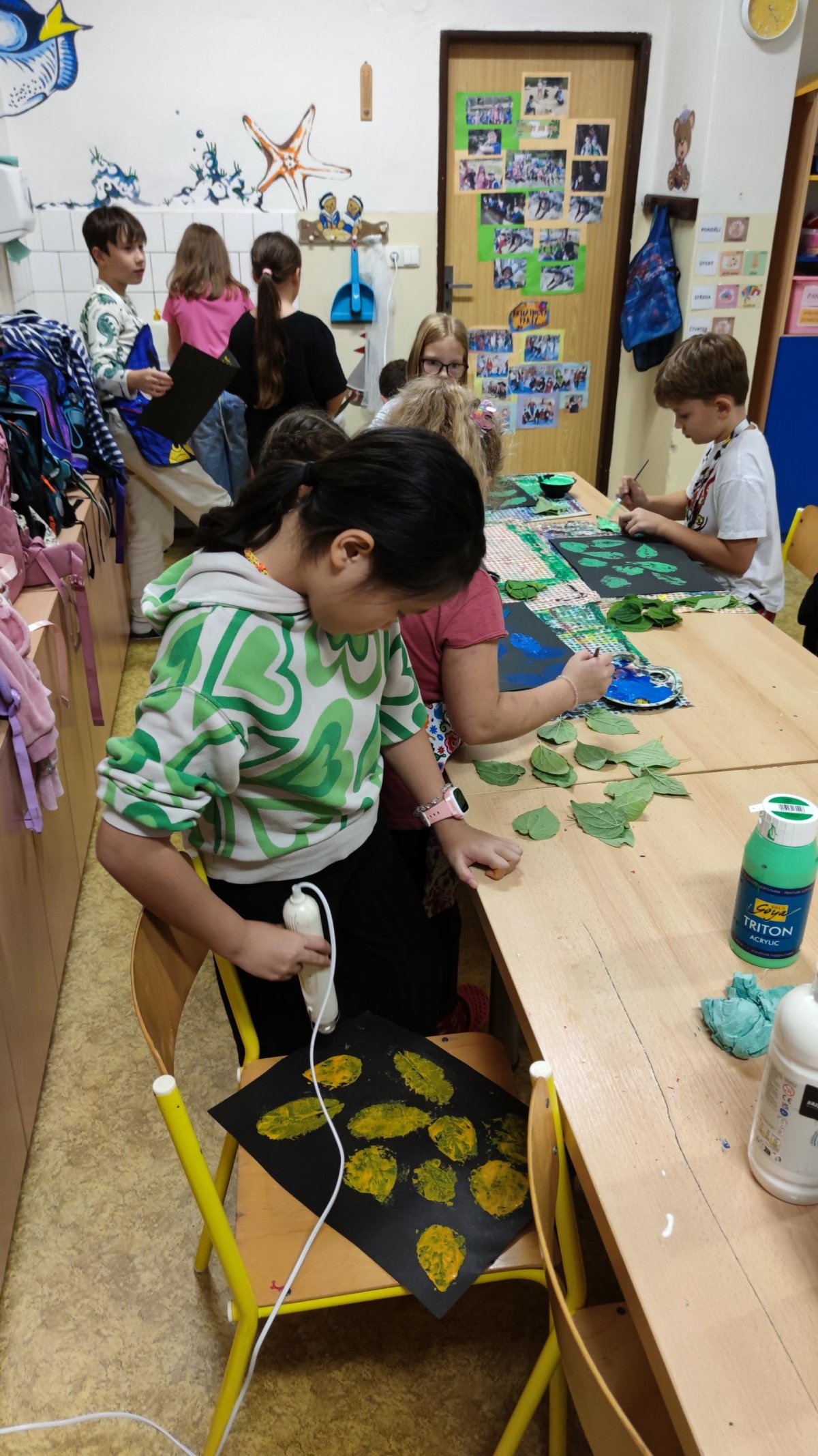 První kroužek byl ve znamení seznamování se. Zahráli jsme si výtvarnou seznamovací hru se slavnými obrazy umělců. Poté už jsme se vrhli na tvoření. Otiskávali jsme listy v několika vrstvách, díky čemuž jsme si vyzkoušeli zesvětlování a poznali vlastnosti akrylových barev.