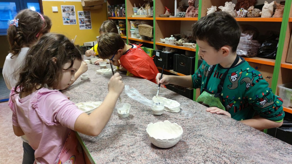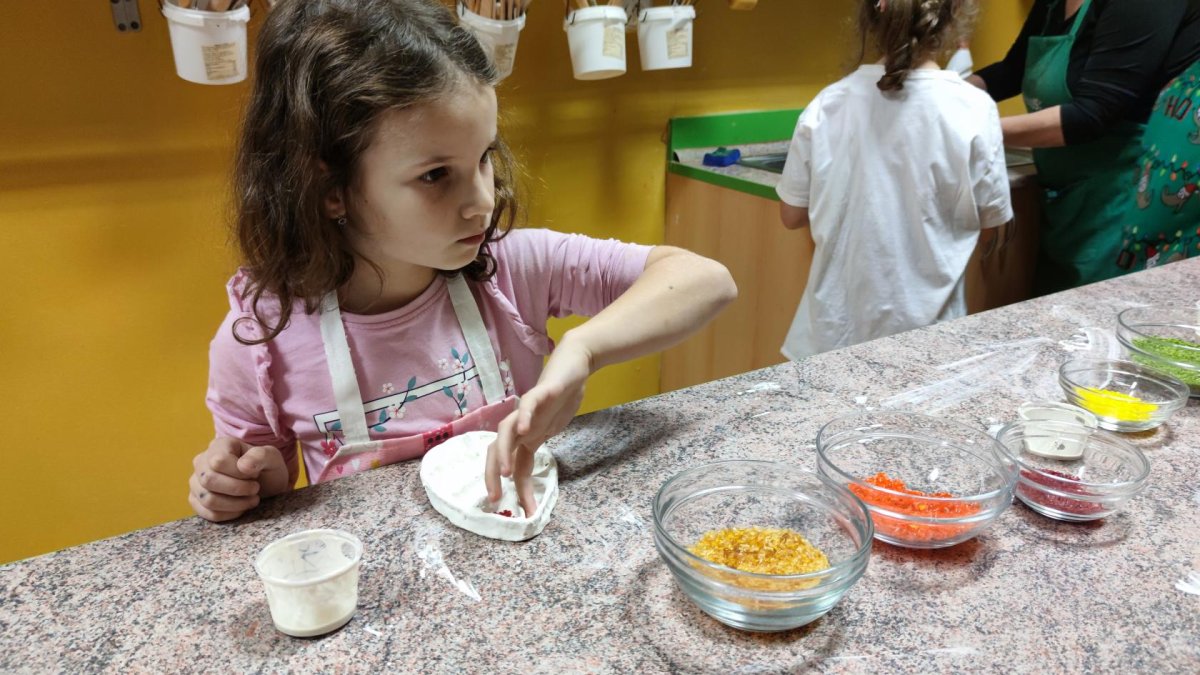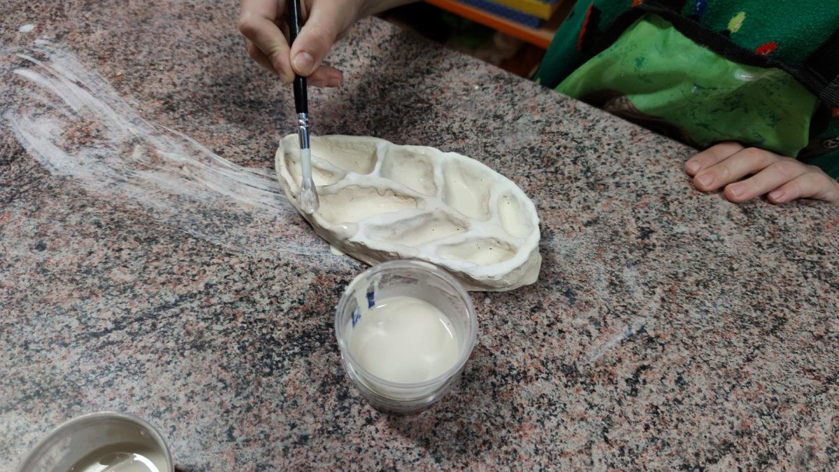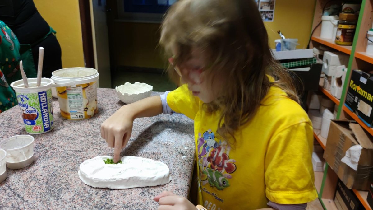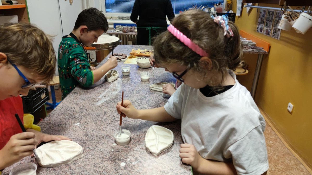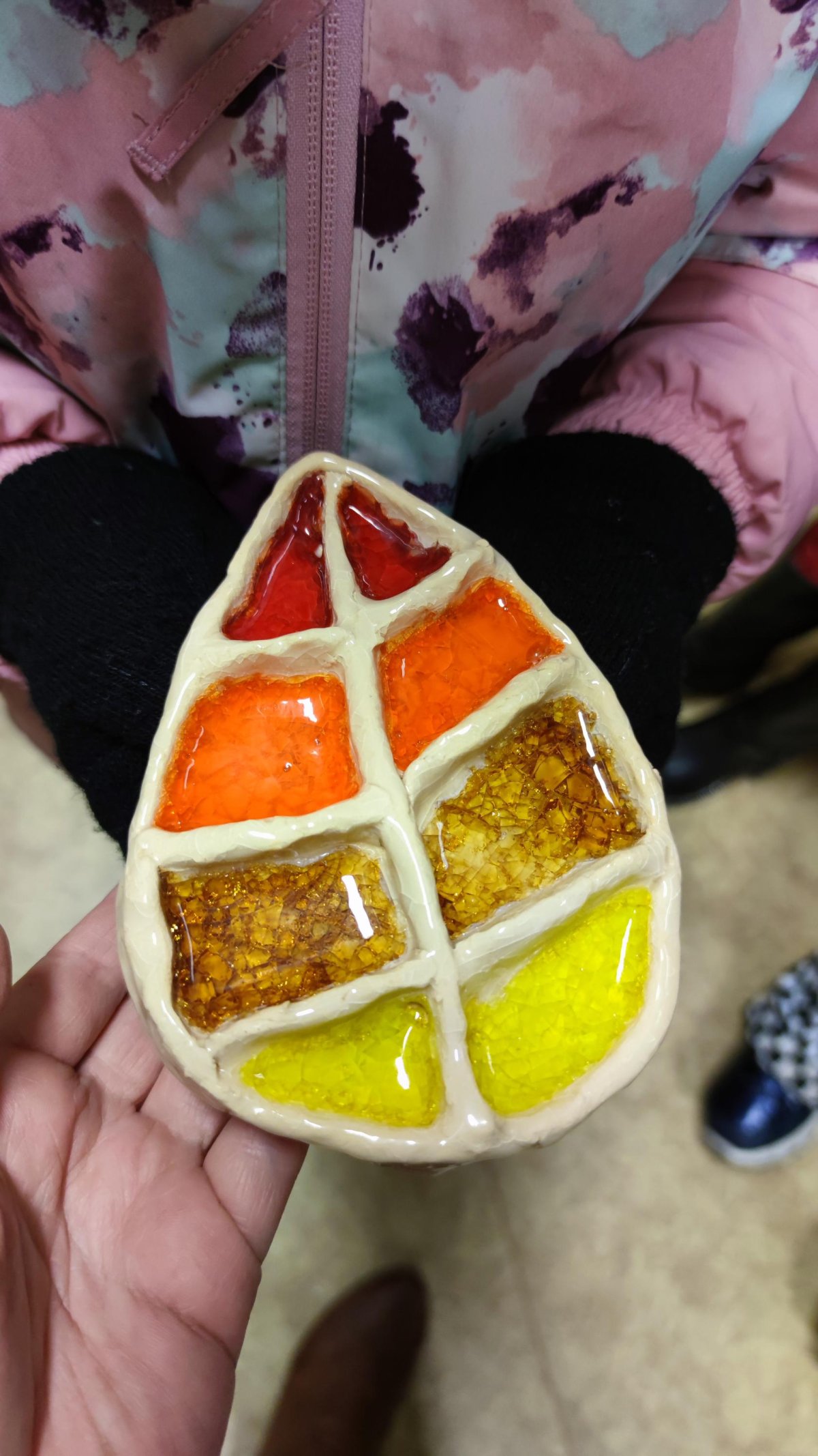 Listy jsme naglazovali transparentní glazurou a vyplnili barevnými sklíčky. Kdo měl čas, bureloval/feprenoval misky.