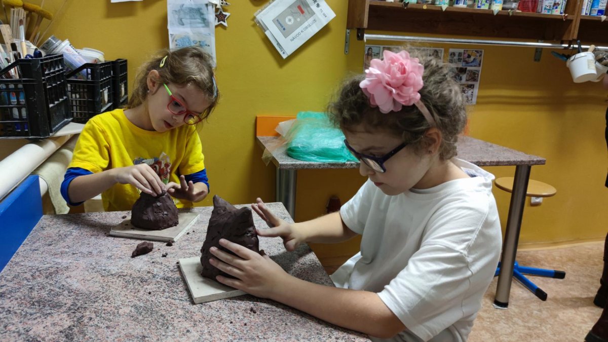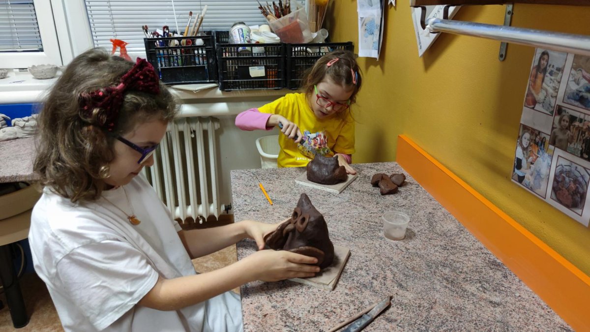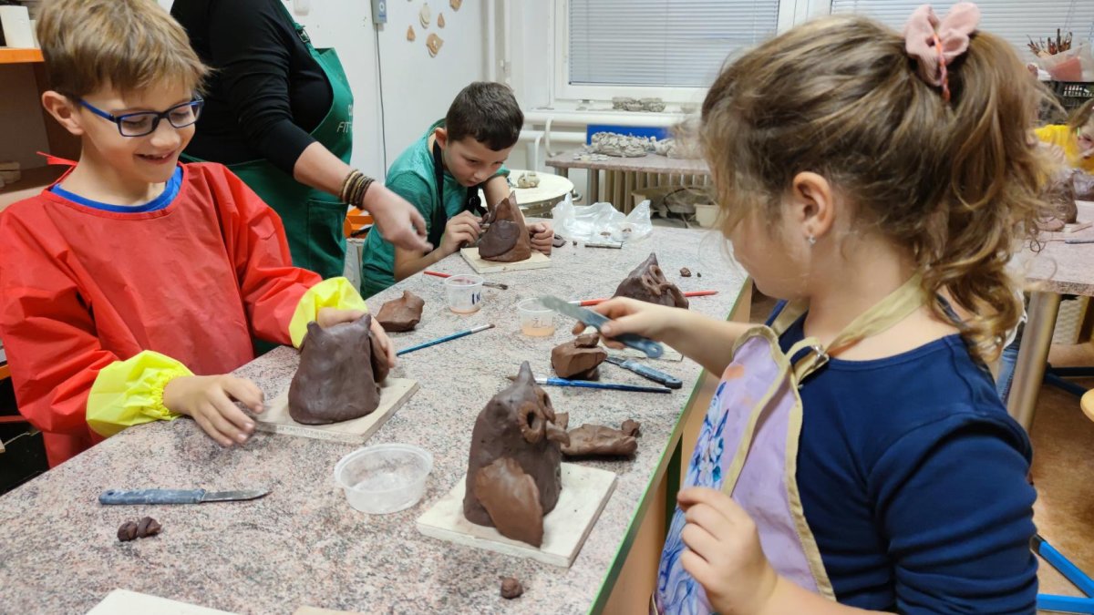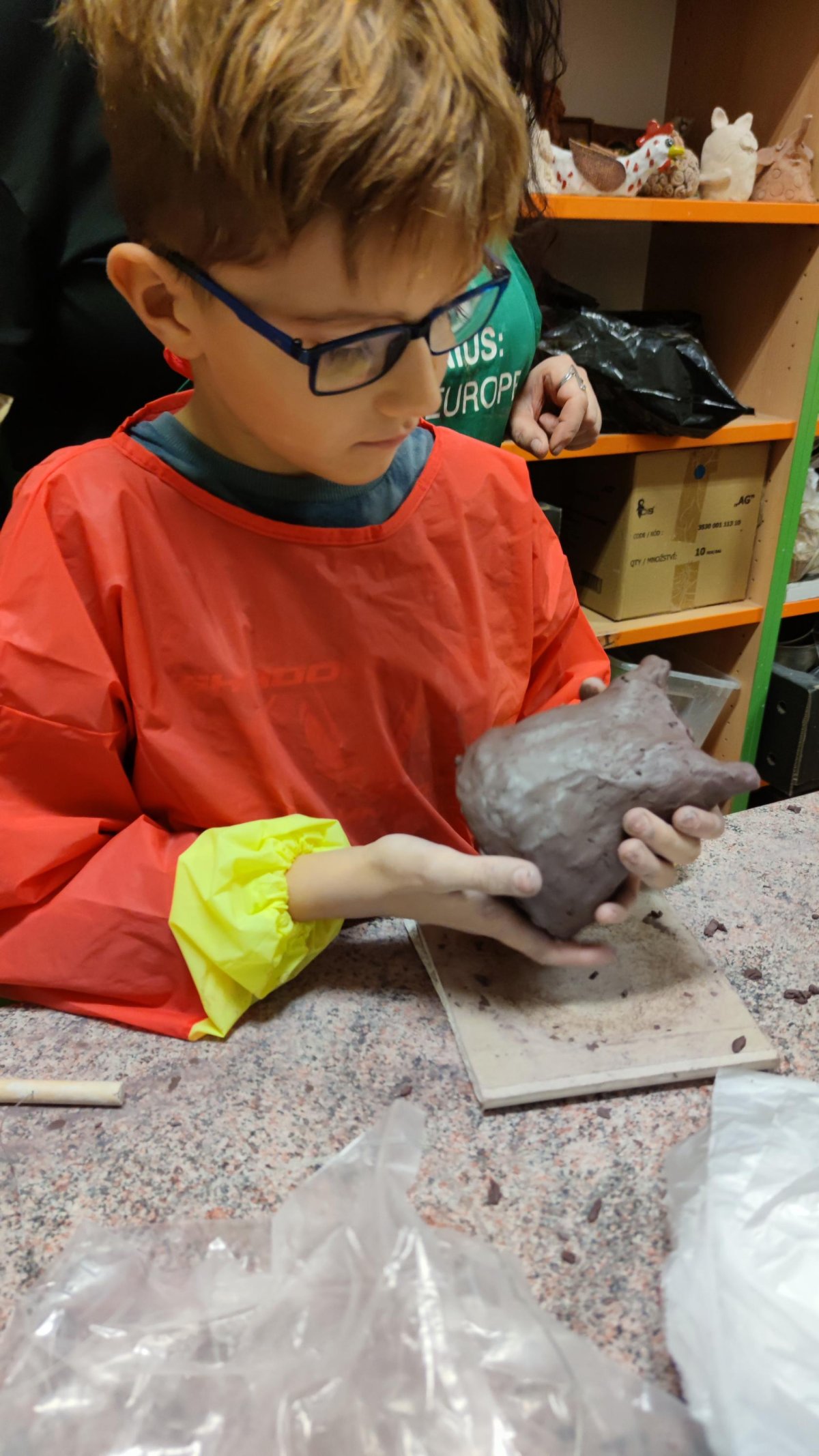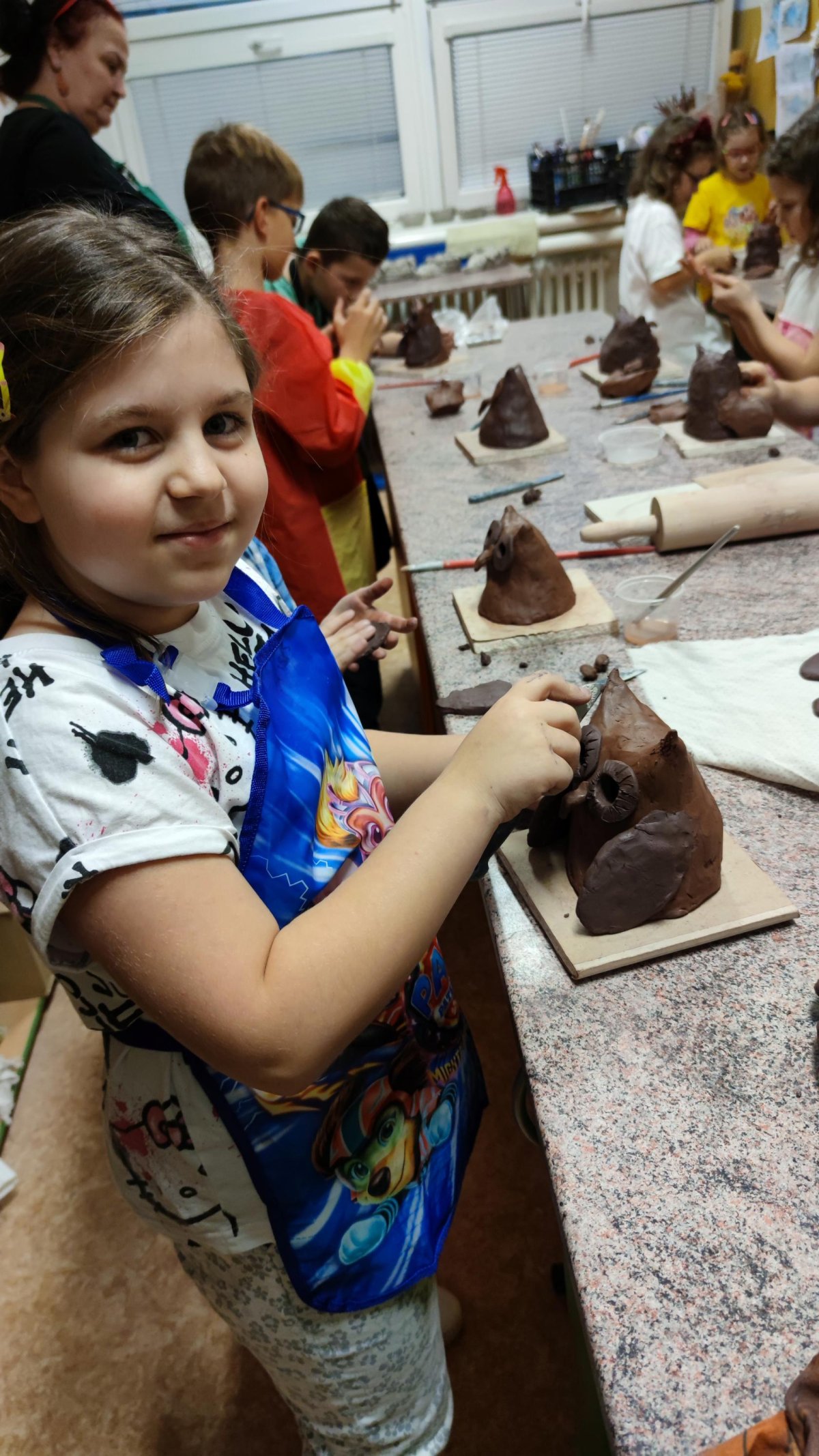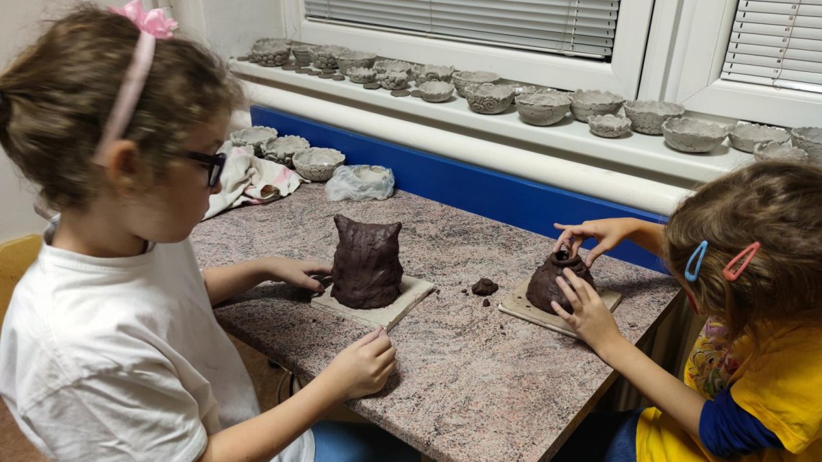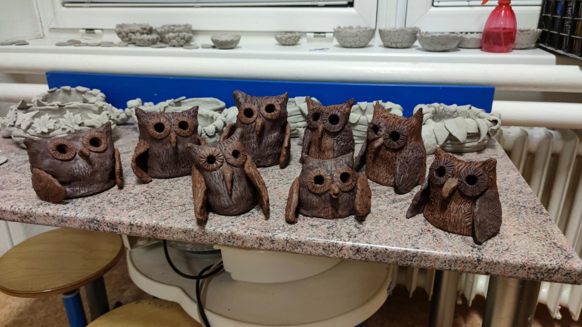 Naším prvním větším keramickým výrobkem se stala sovička. Tvořili jsme ze dvou různých druhů hlín. Po výpalu sovička poslouží jako dekorativní lucernička.