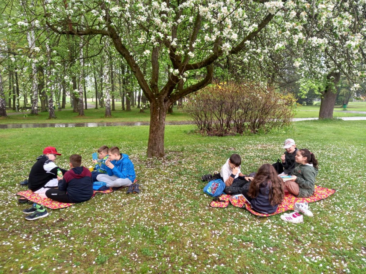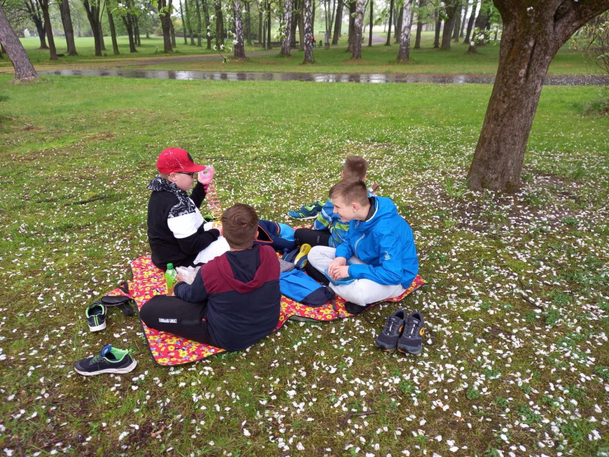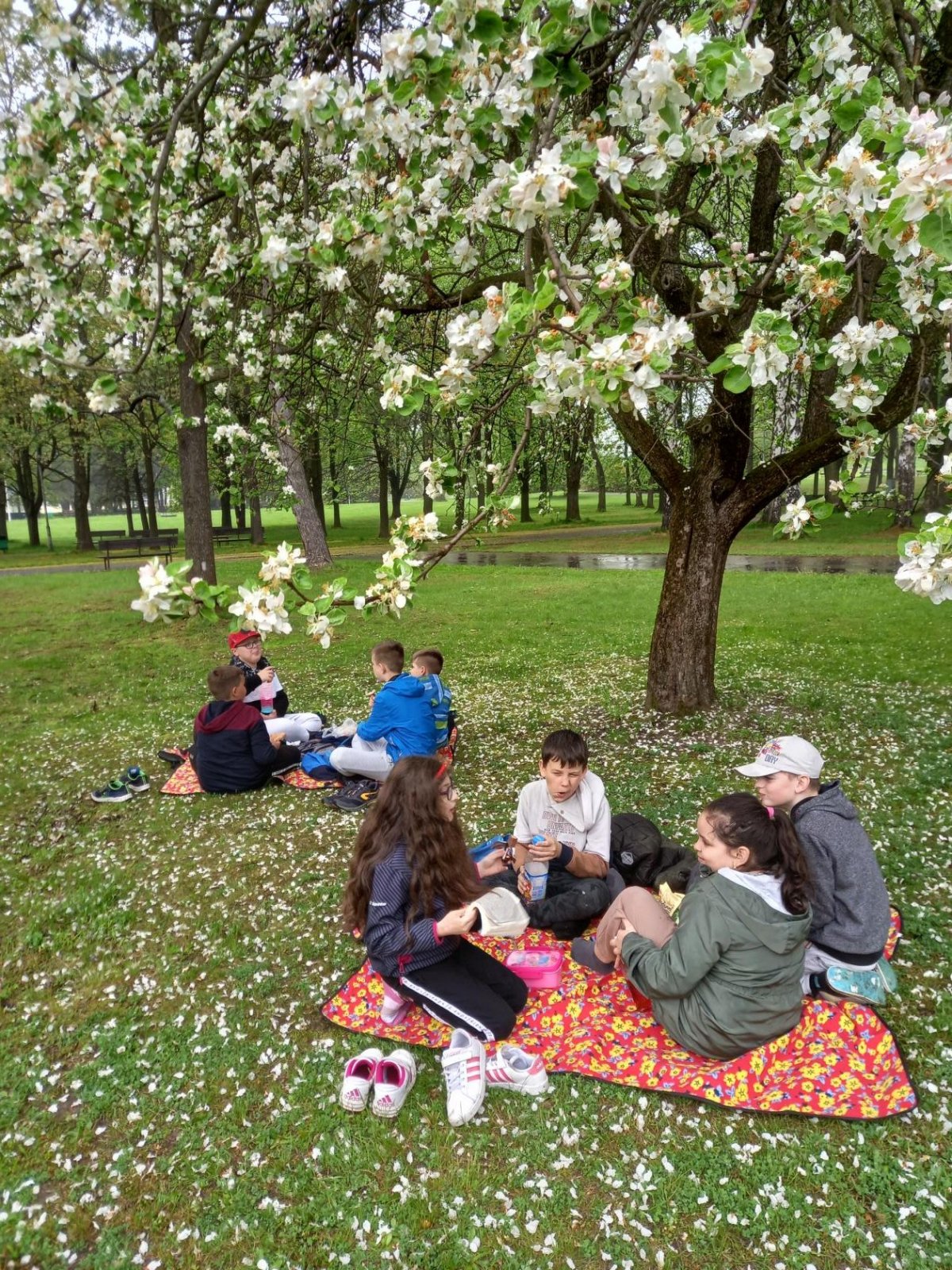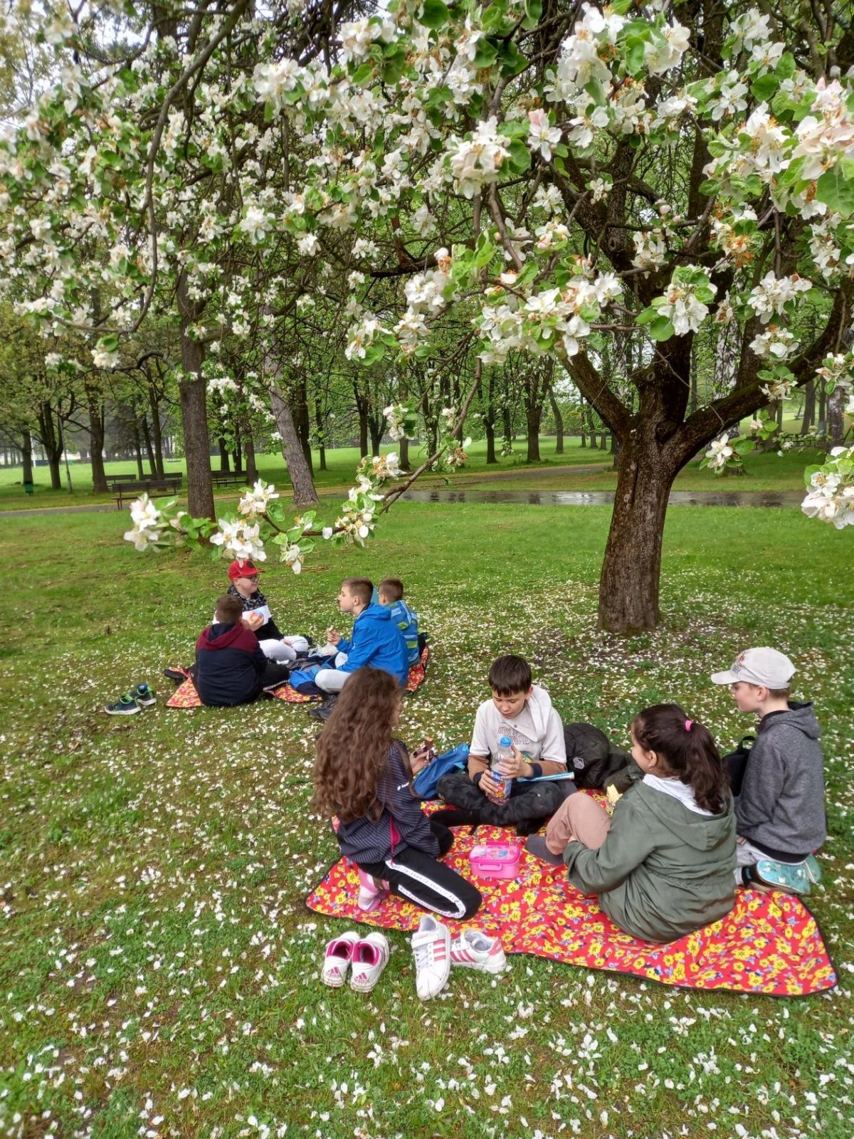 Protože pršelo, tak jsme si nejdříve dlouho povídali ve škole u klavíru. Pak jsme stihli jen prozkoumat blízký park. Nejhezčí byla svačina pod rozkvetlou jabloní.