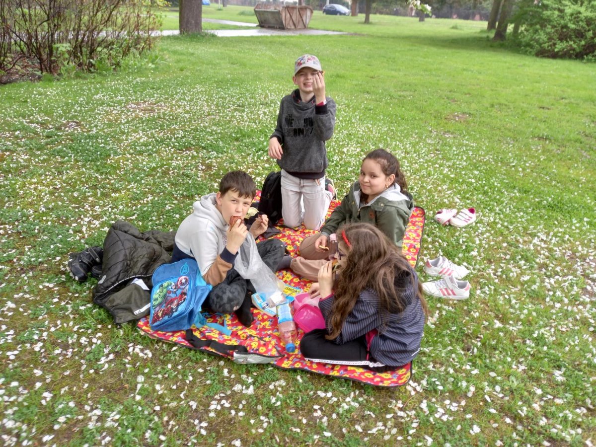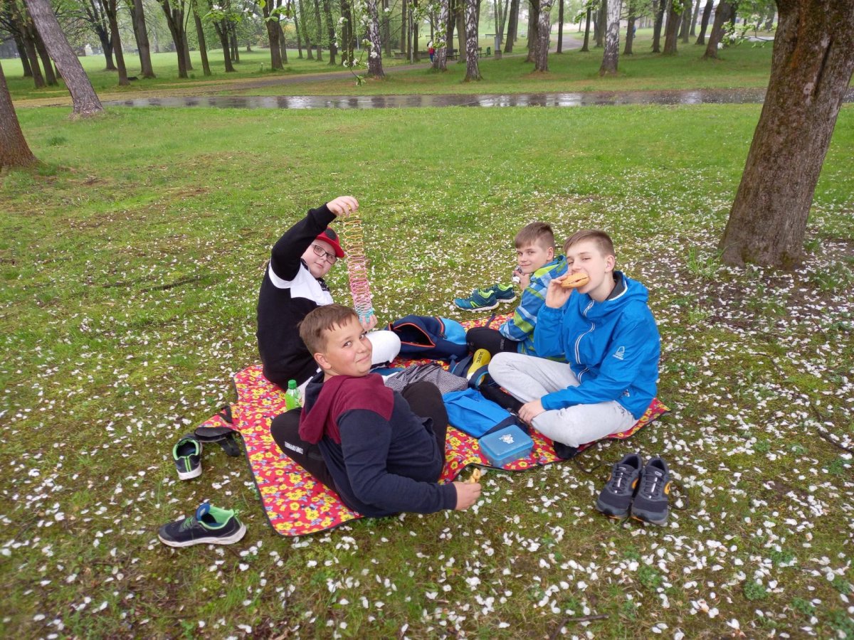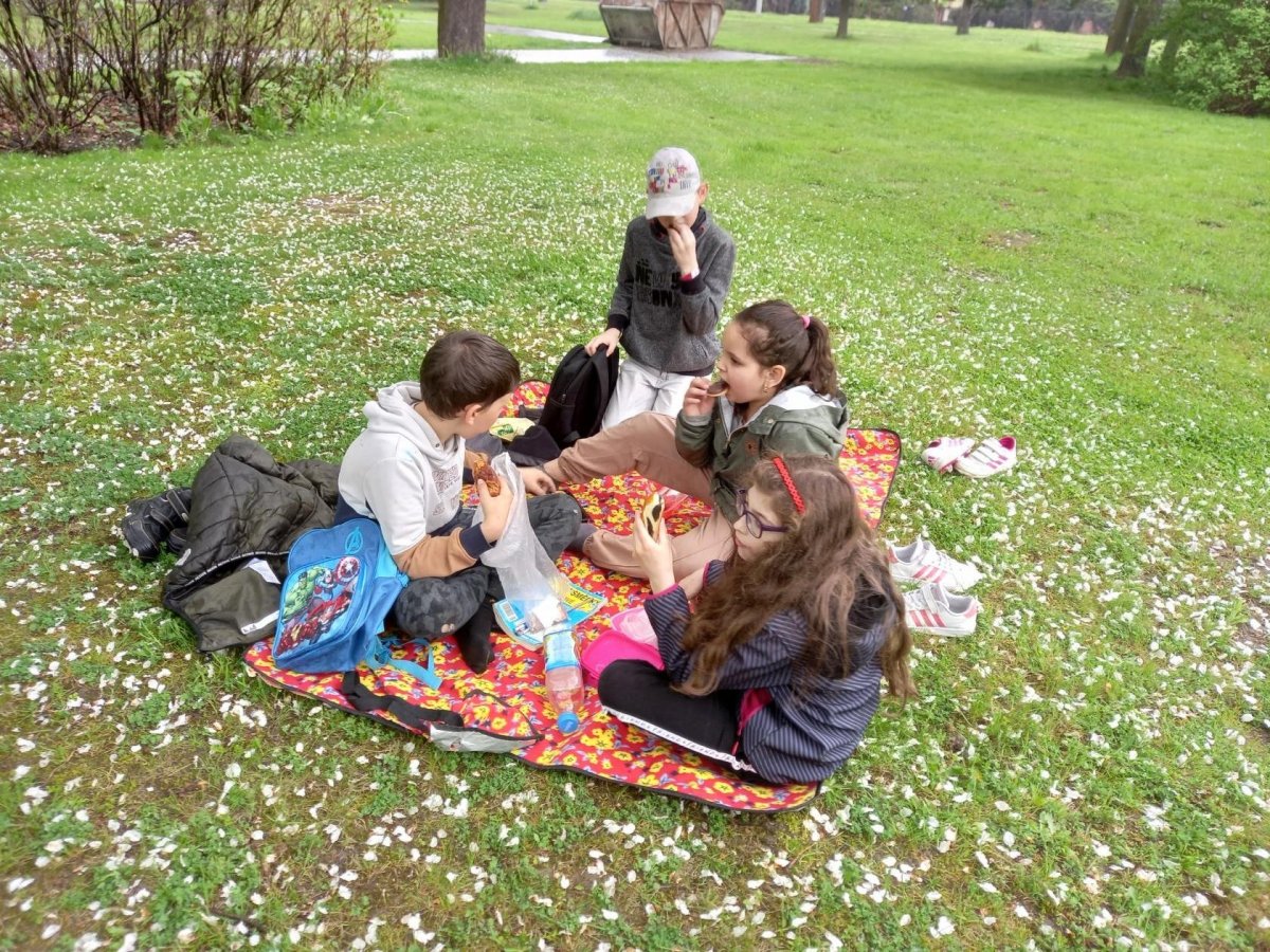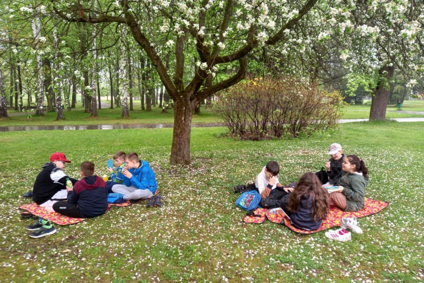 Protože pršelo, tak jsme si nejdříve dlouho povídali ve škole u klavíru. Pak jsme stihli jen prozkoumat blízký park. Nejhezčí byla svačina pod rozkvetlou jabloní.