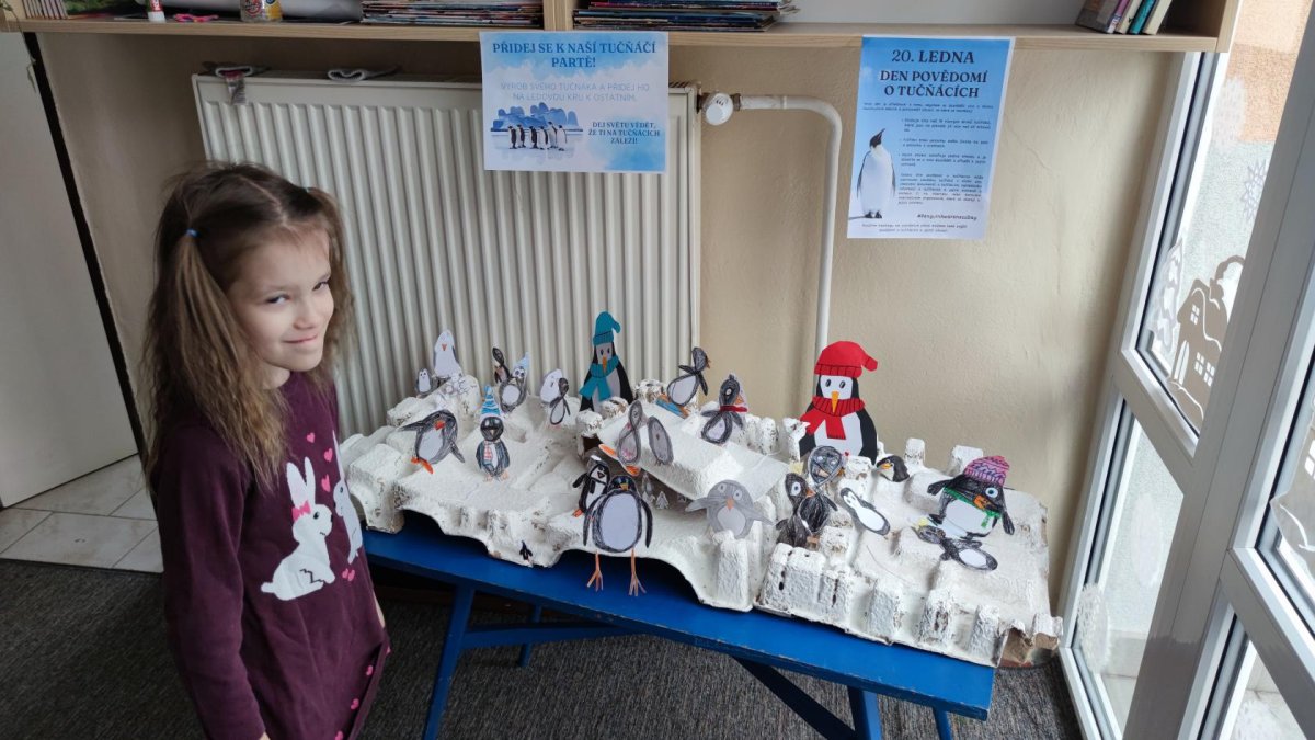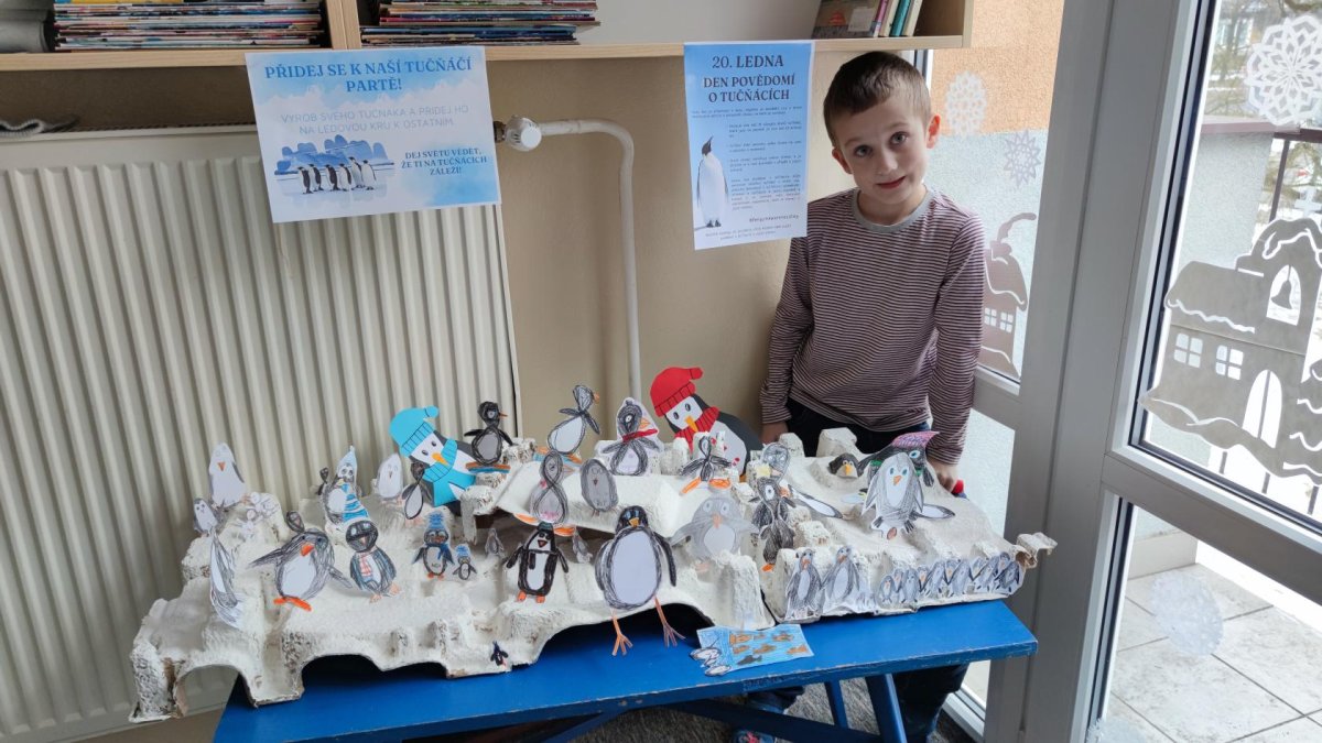 Každoročně se 20. ledna ve světě slaví Den povědomí o tučňácích. I ve školní družině si děti povídaly o životě tučňáků a jejich ochraně. Každý měl možnost vyrobit si svého tučňáka, a tak ve fotogalerii můžete vidět celé tučňáčí rodinky, tučňáky v klobouku, na lovu ryb nebo pod slunečníkem (kvůli změně klimatu :D).