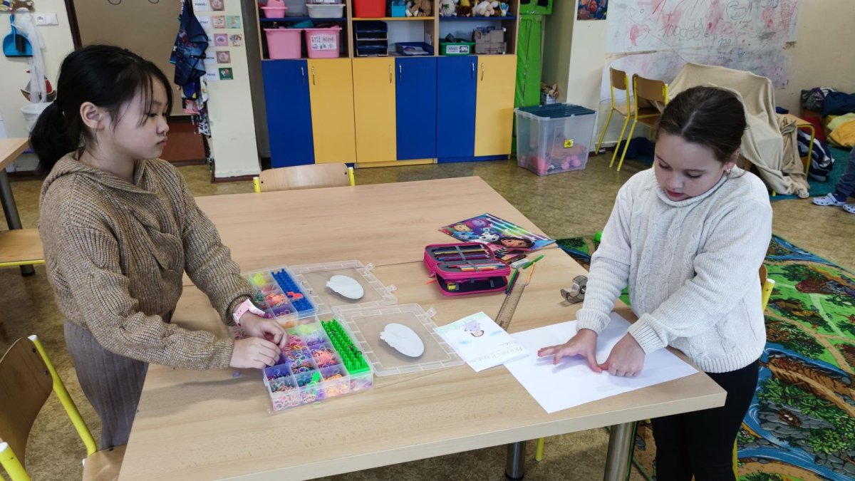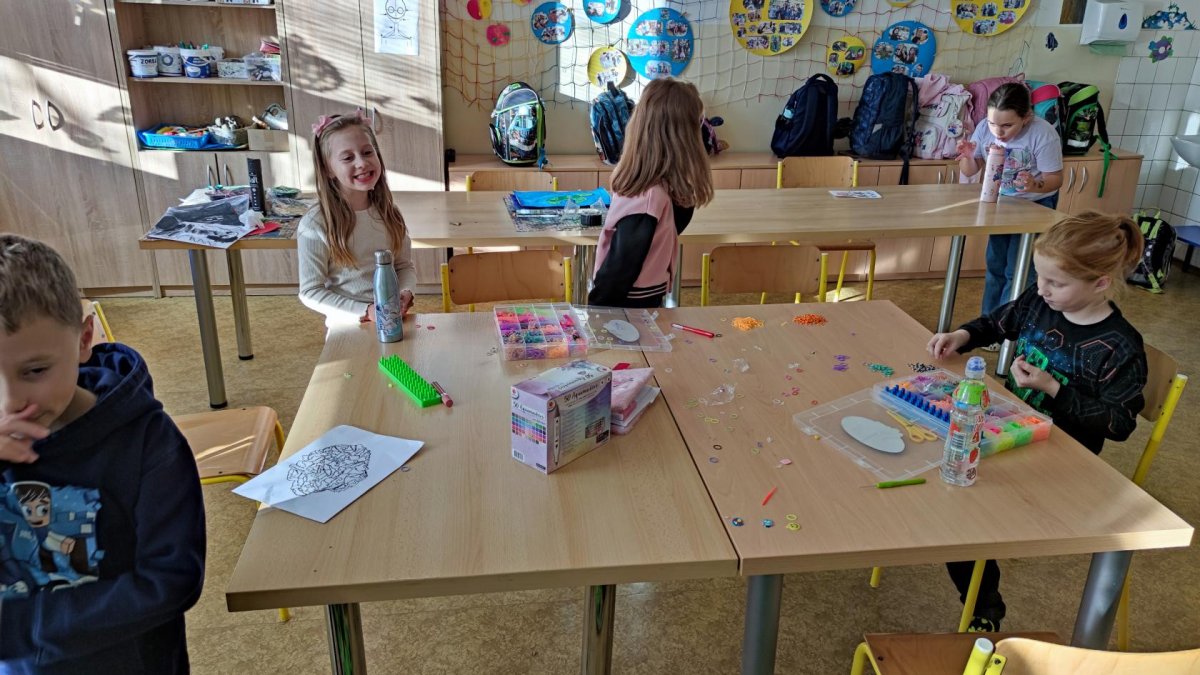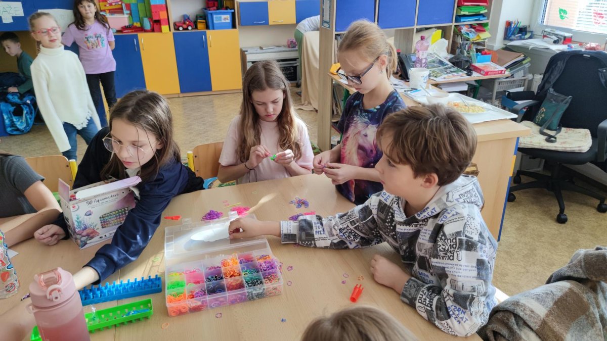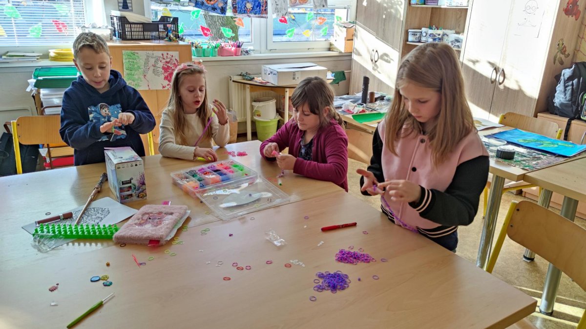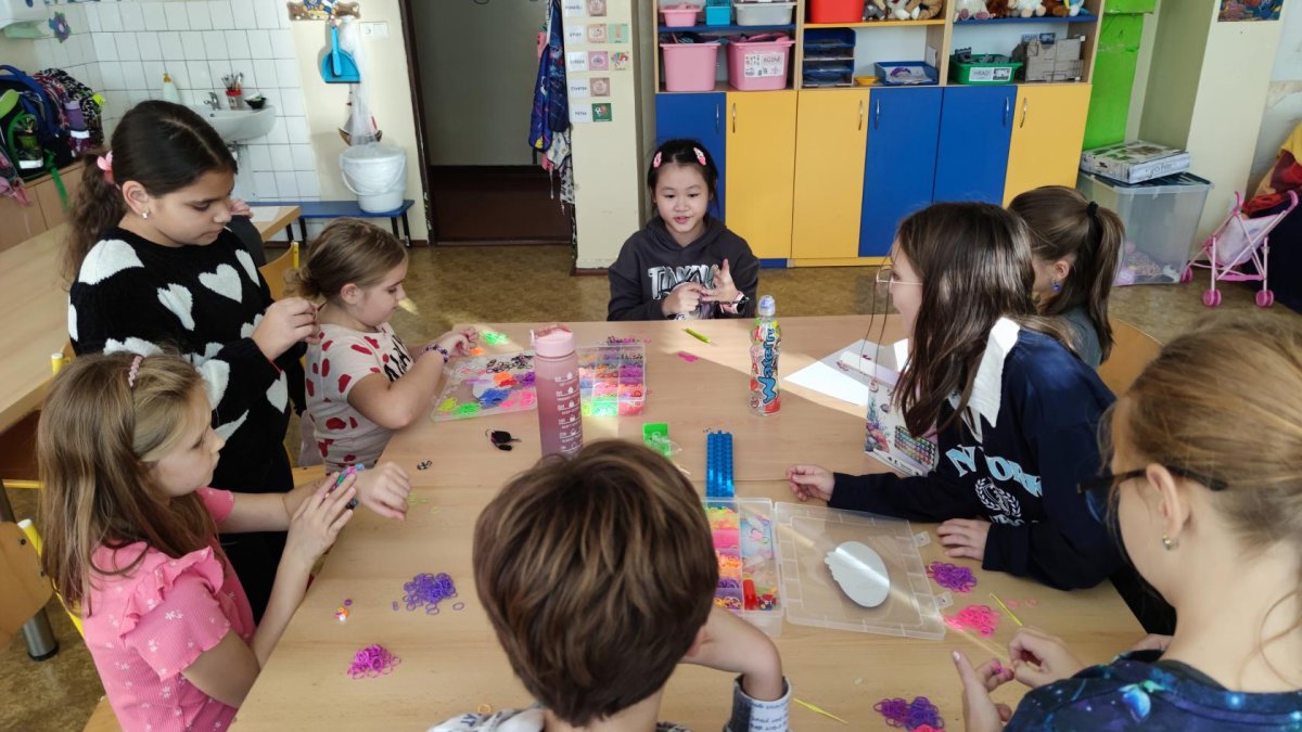 V odděleních pro žáky z 3.-5. tříd zavládla gumičková mánie, a tak se hned po příchodu z oběda pletou náramky, náhrdelníky i prstýnky.