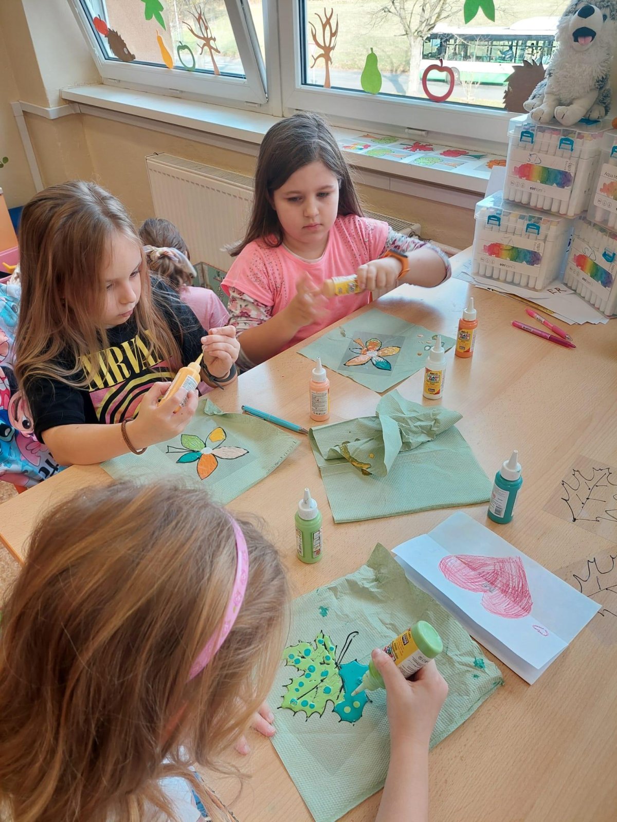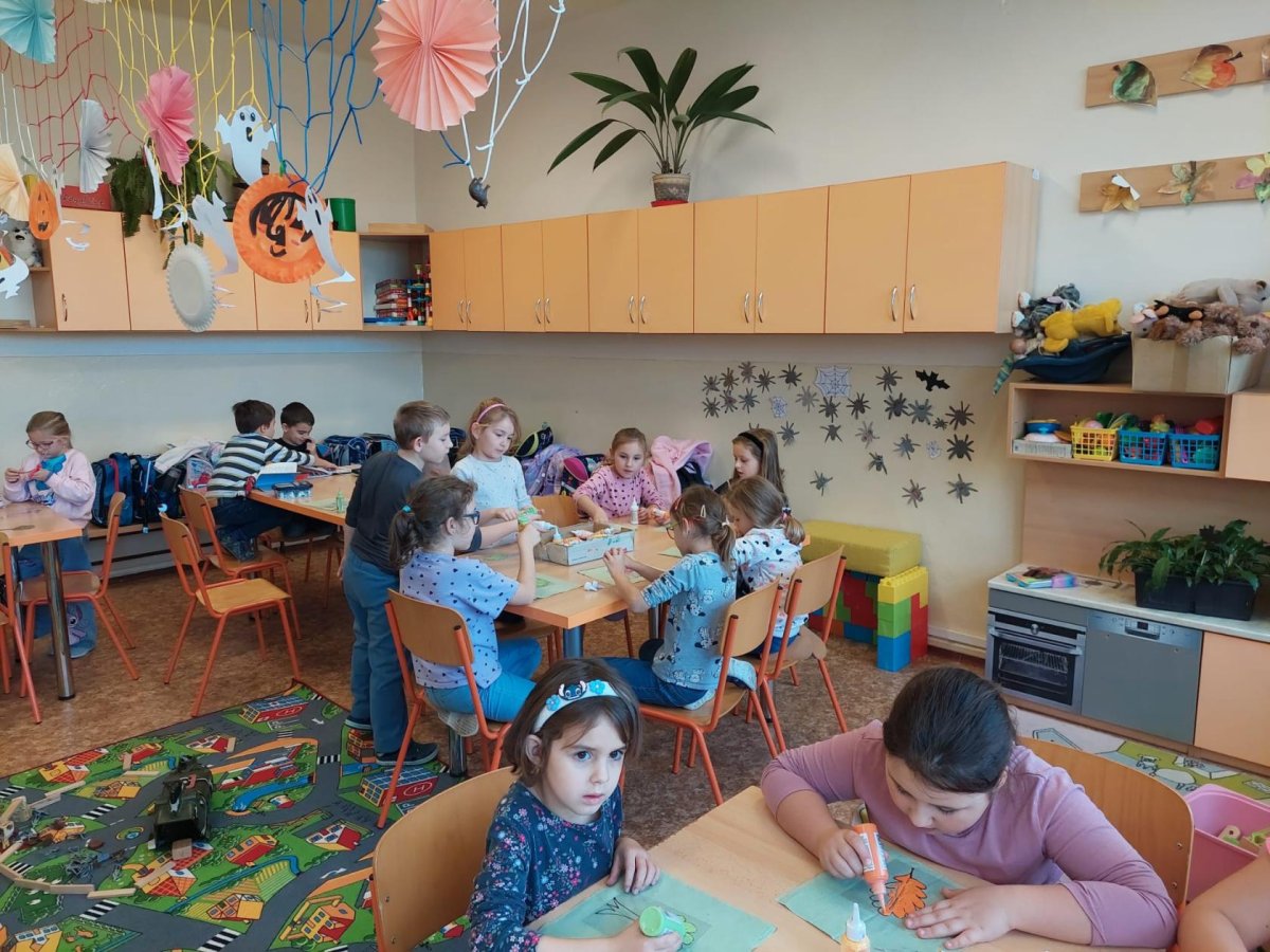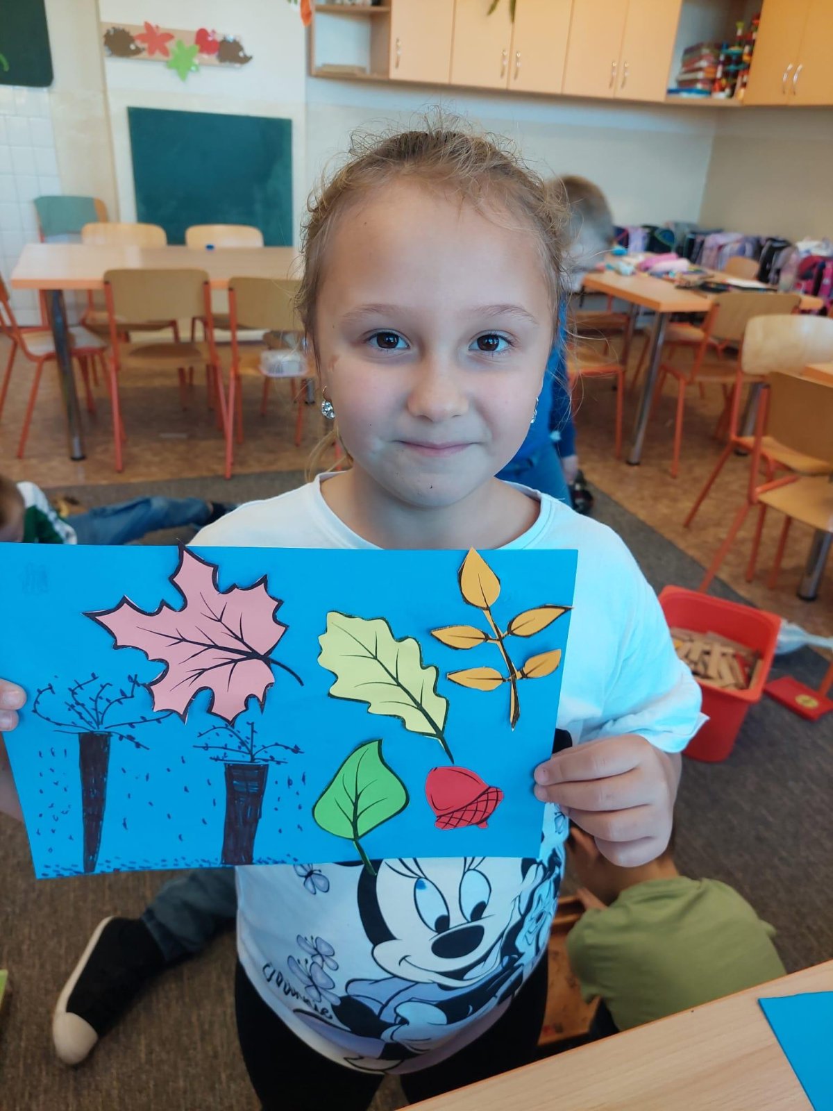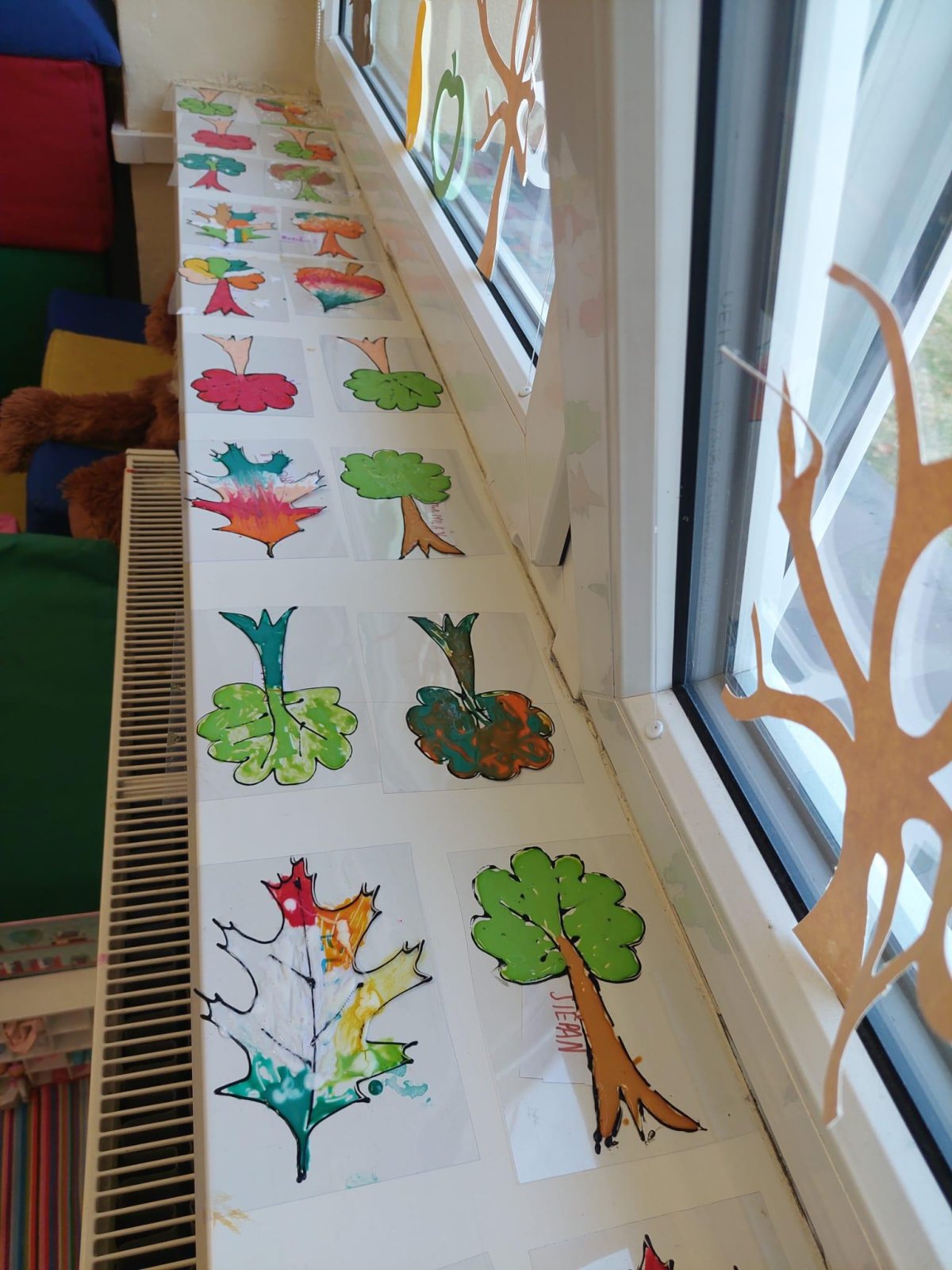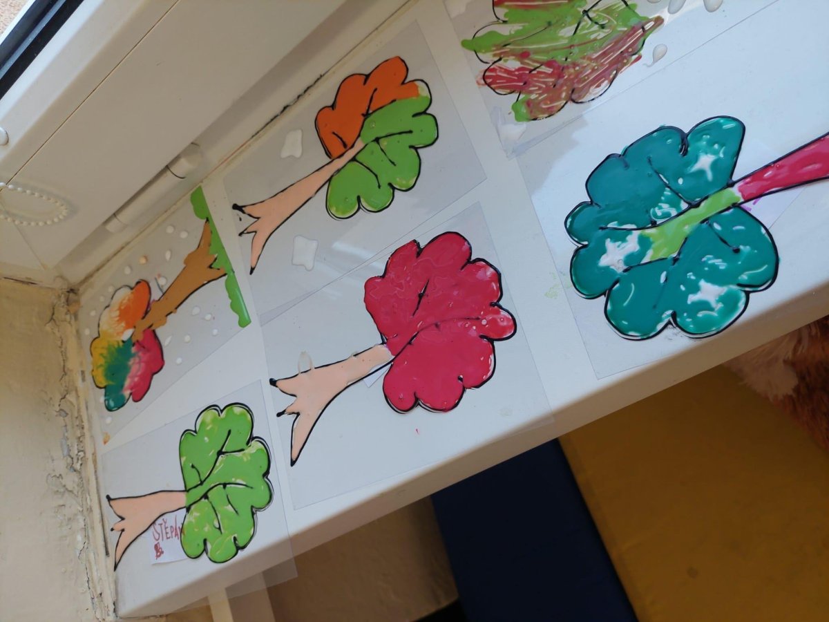 Stromy a listy zbarvené do podzimních barev byly inspirací pro 2. oddělení, které pracovalo s papírem i slupovacími barvami.
