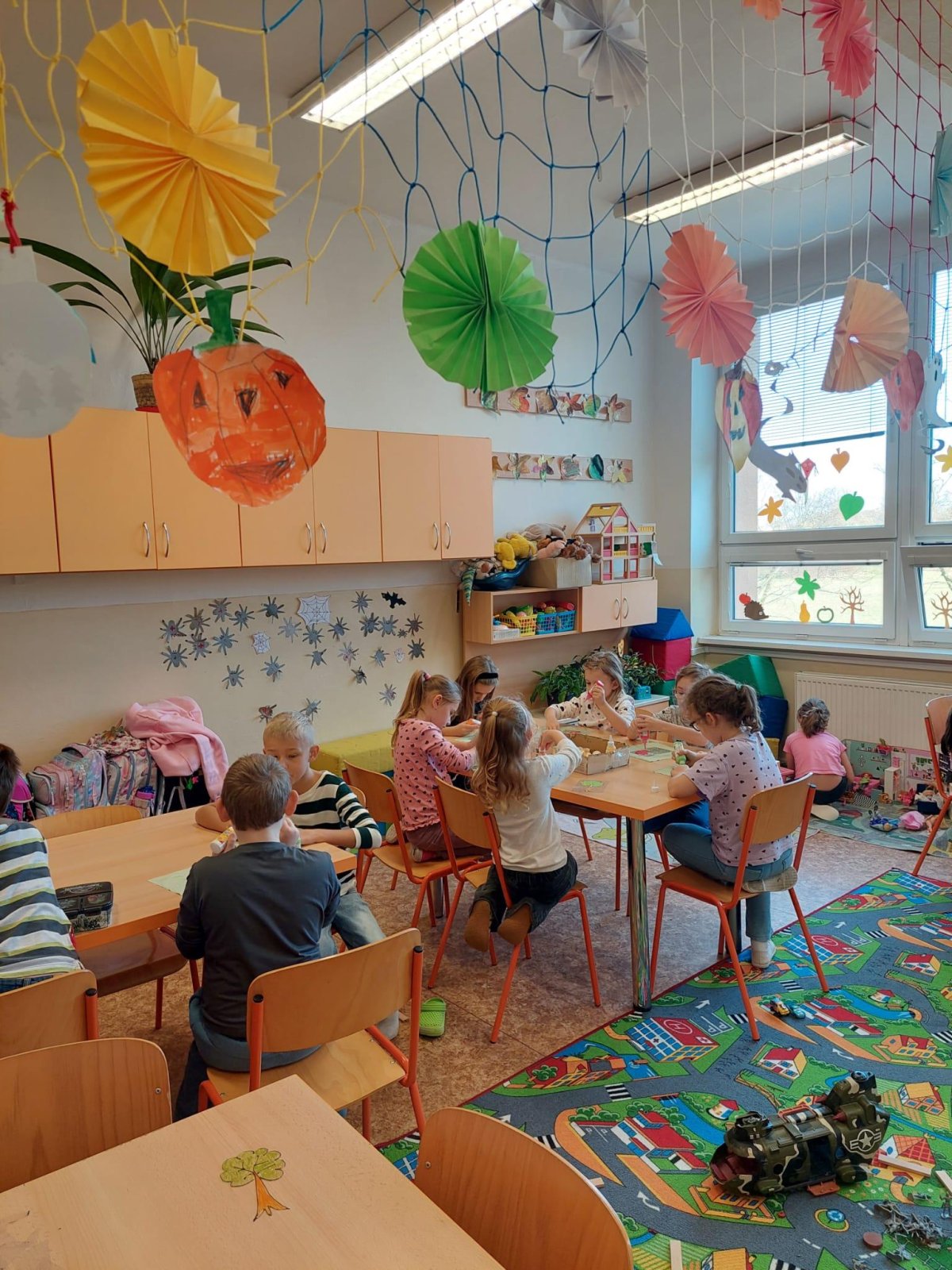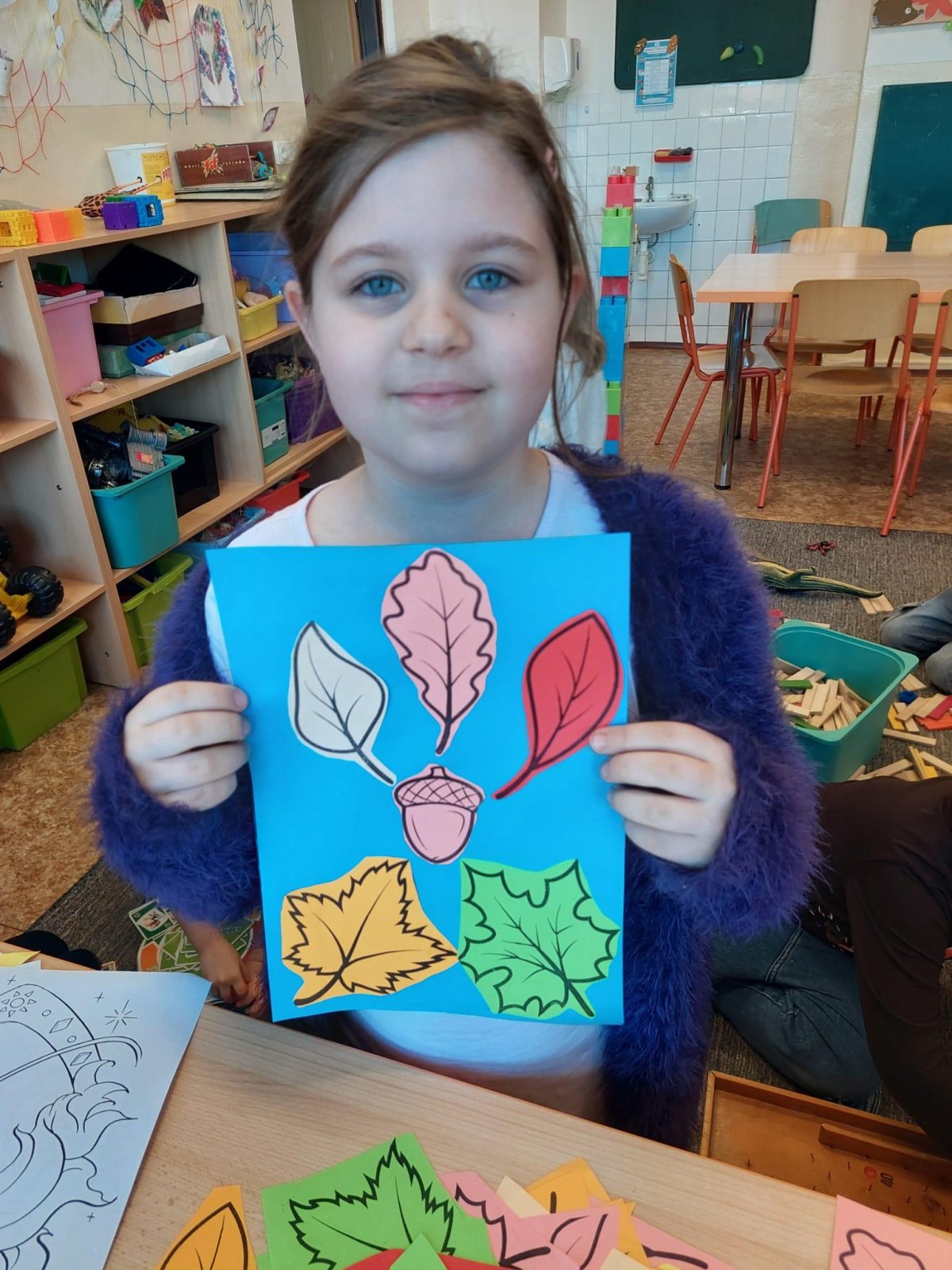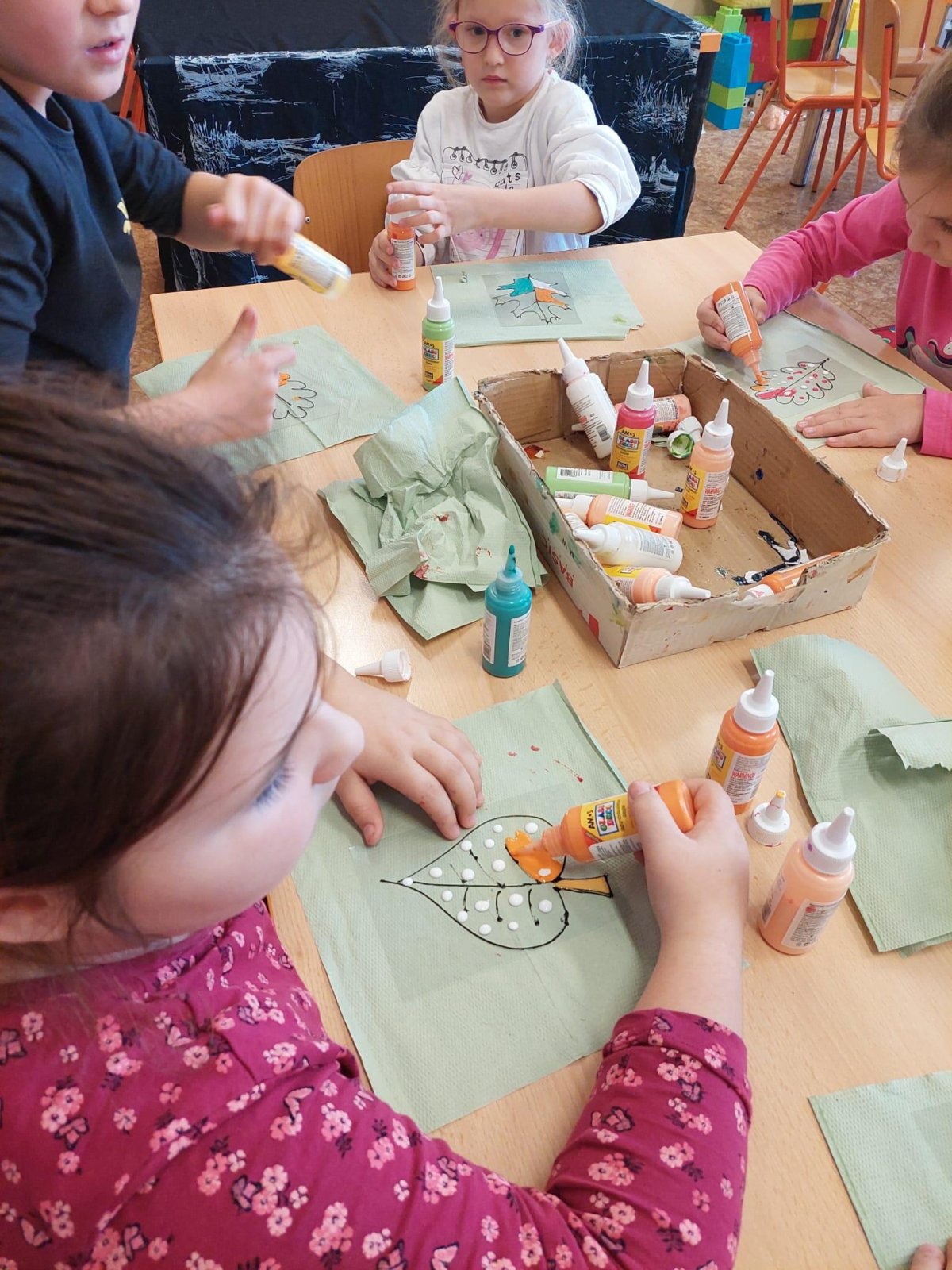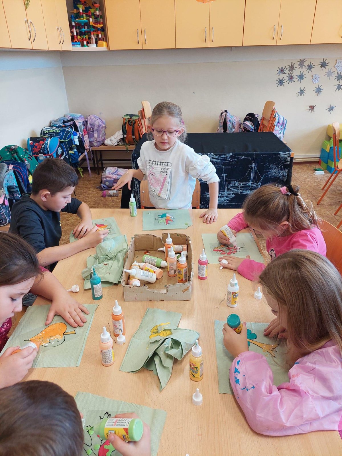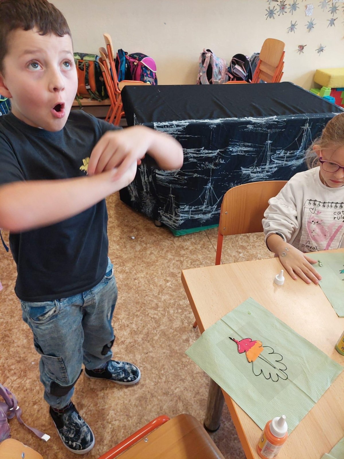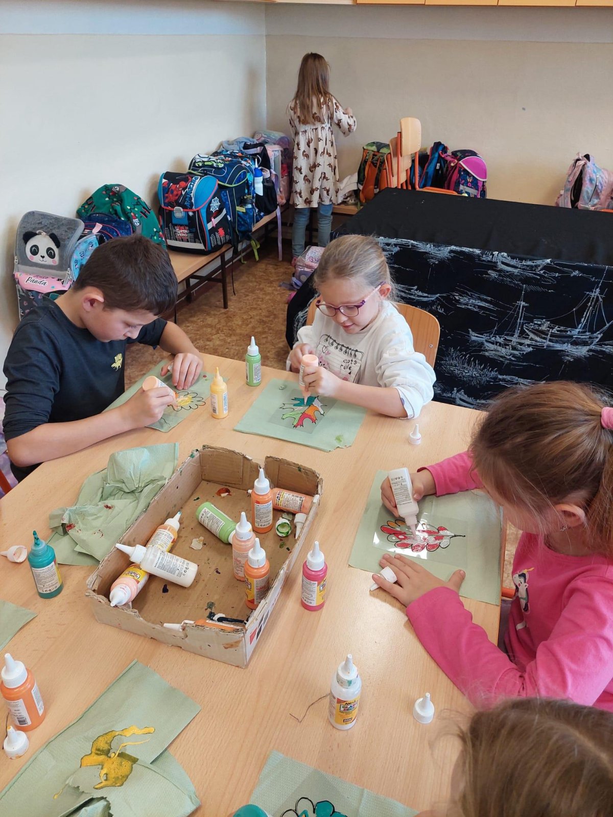 Stromy a listy zbarvené do podzimních barev byly inspirací pro 2. oddělení, které pracovalo s papírem i slupovacími barvami.