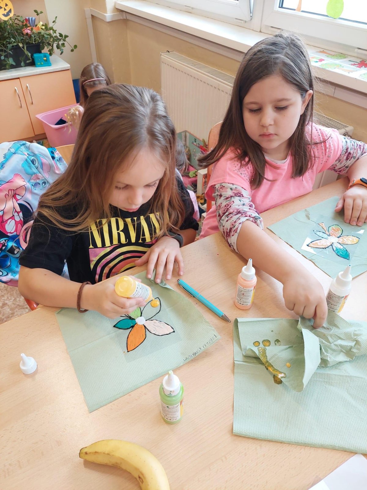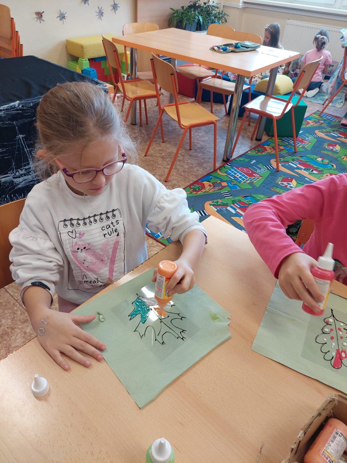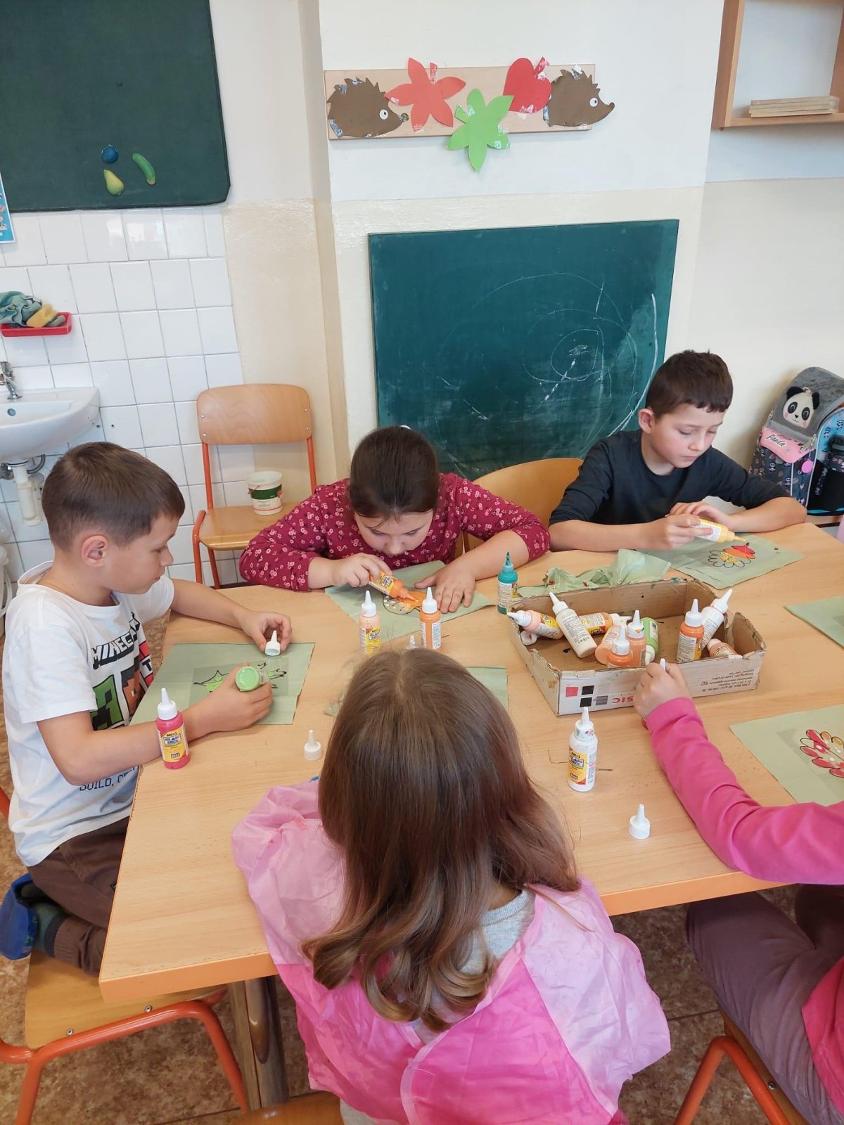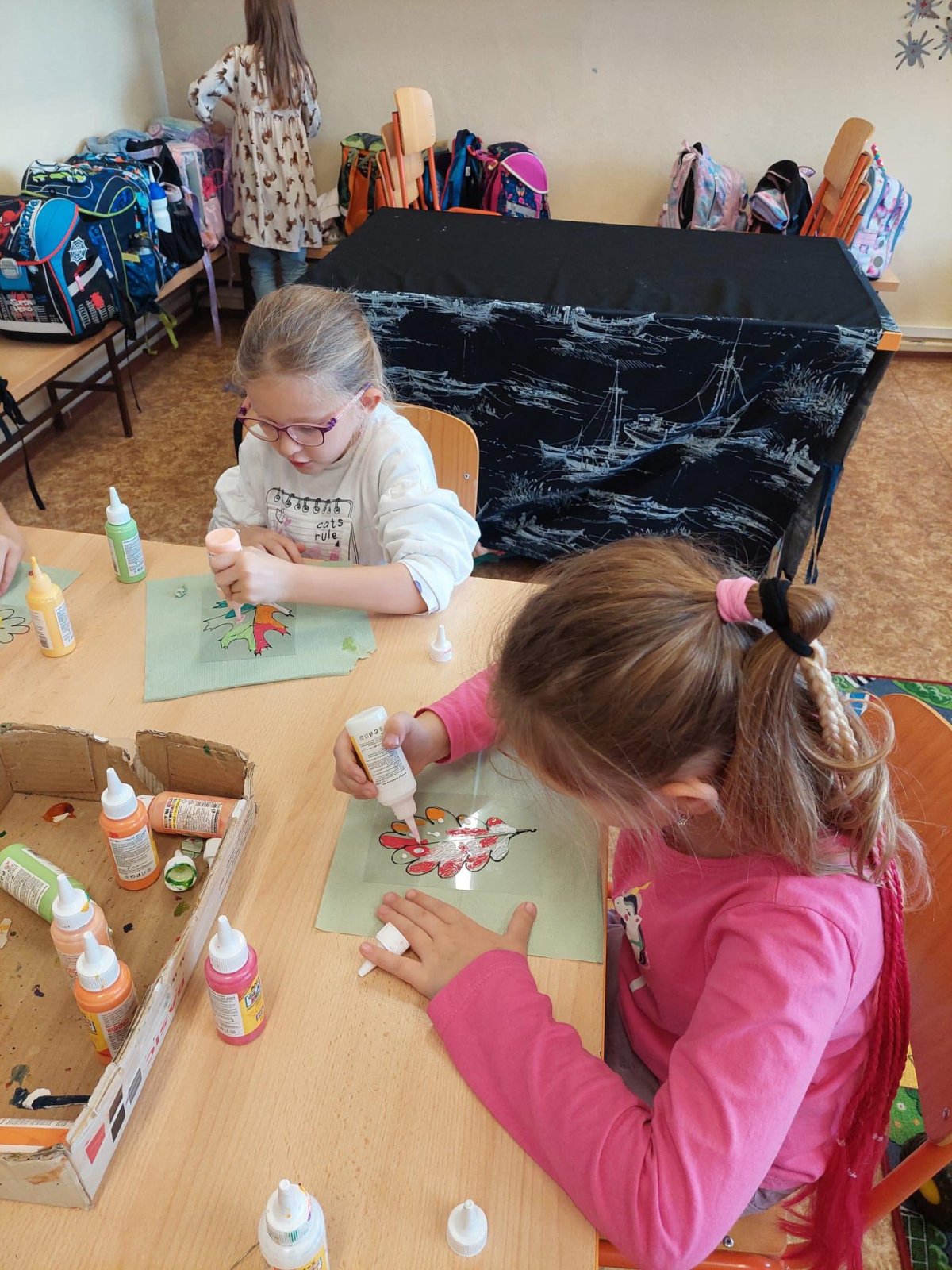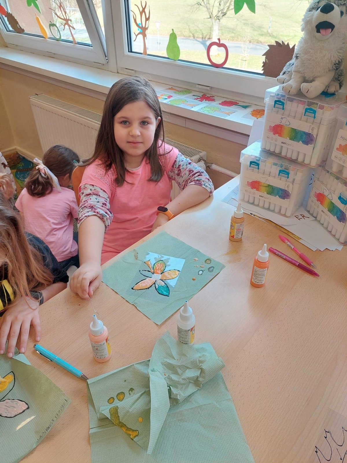Stromy a listy zbarvené do podzimních barev byly inspirací pro 2. oddělení, které pracovalo s papírem i slupovacími barvami.