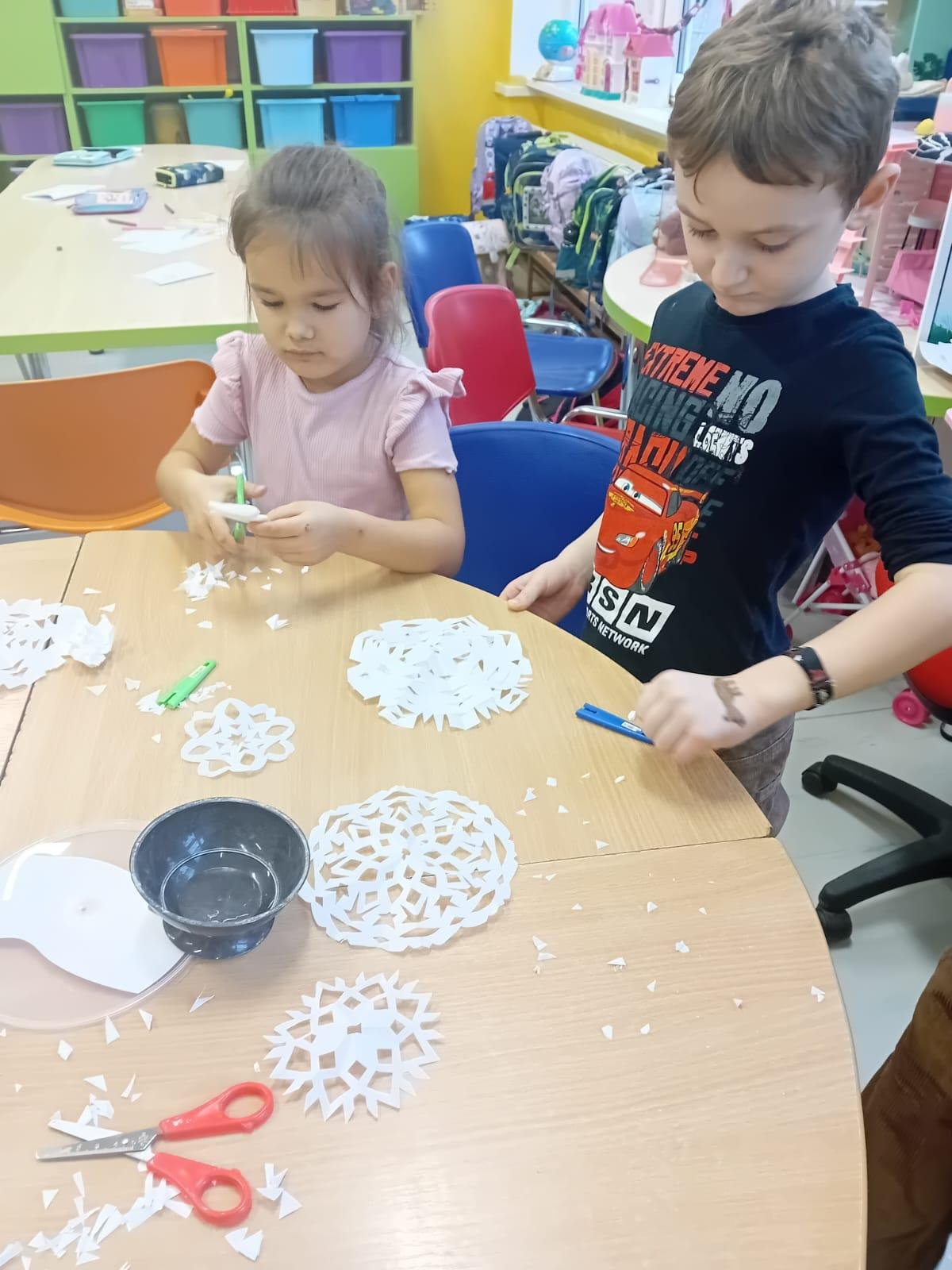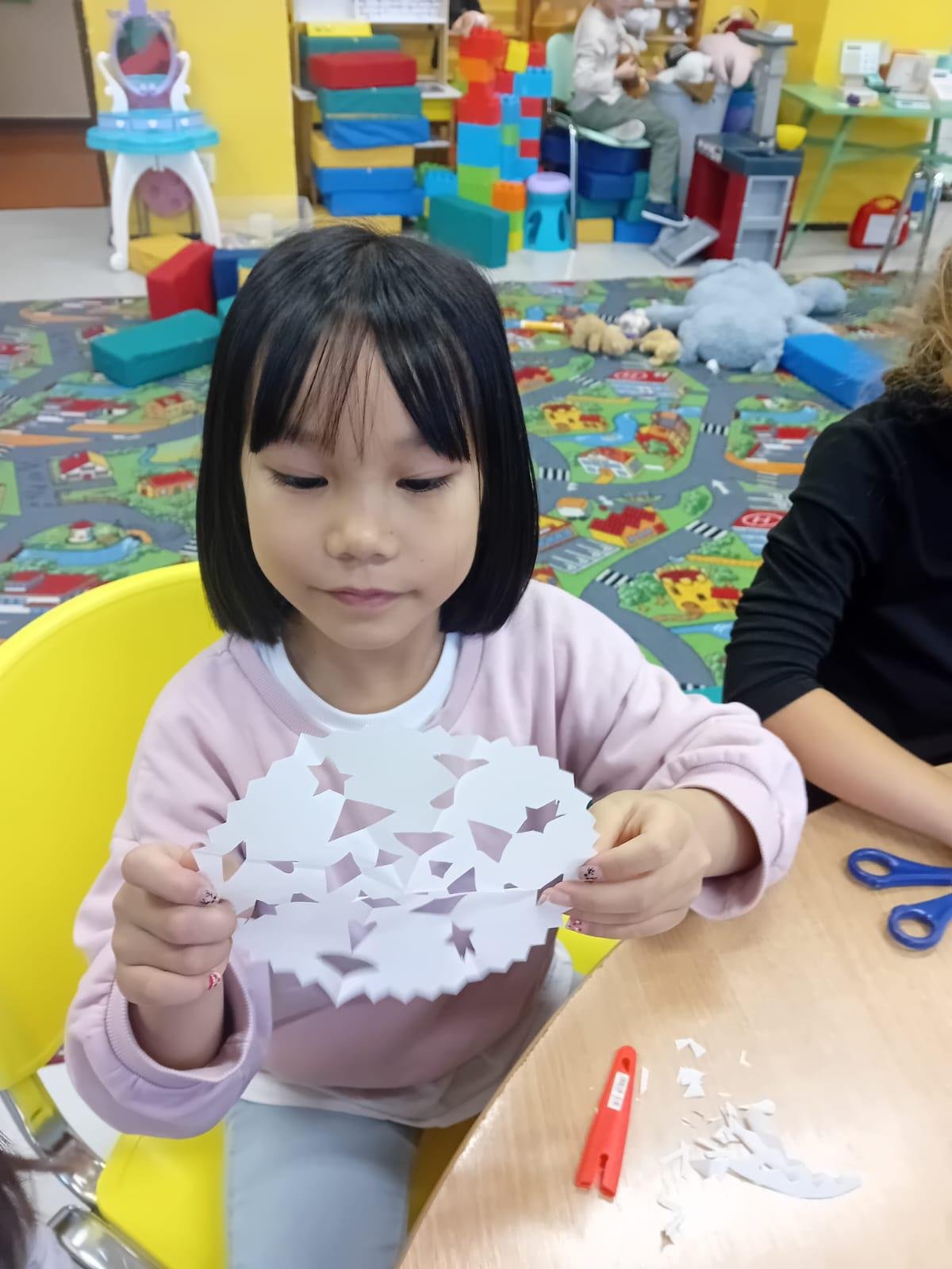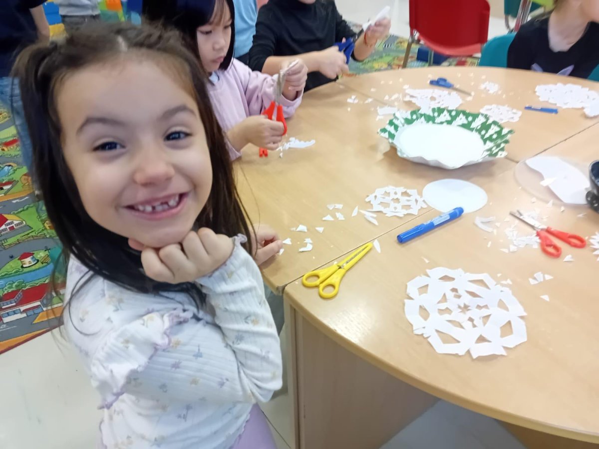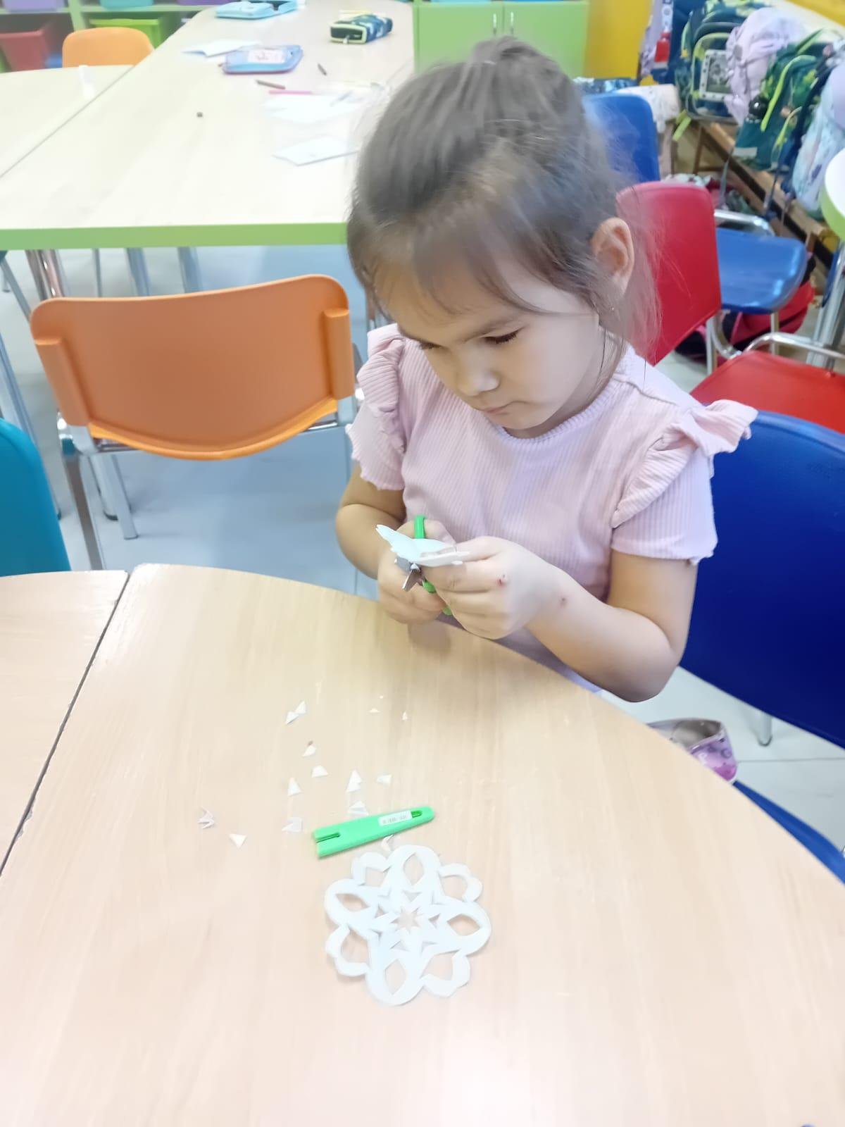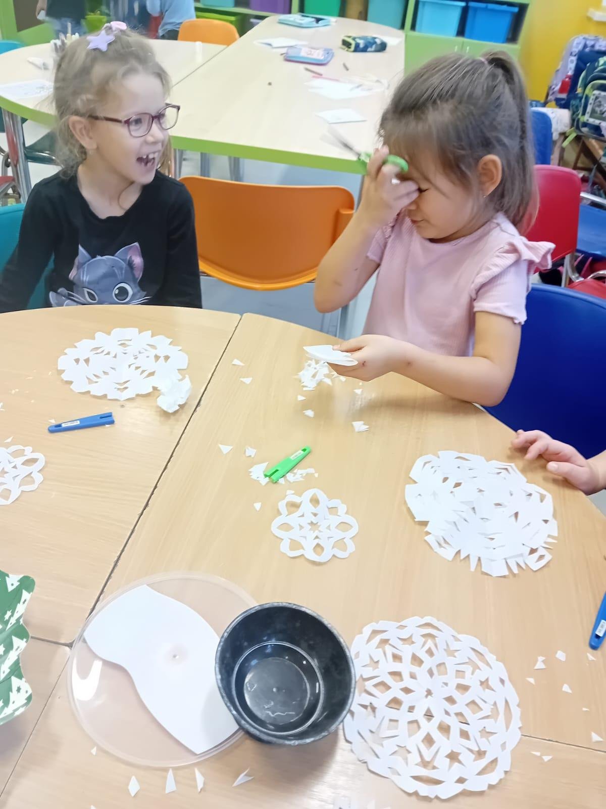 Prvňáčci trénují motoriku při stříhání sněhových vloček.