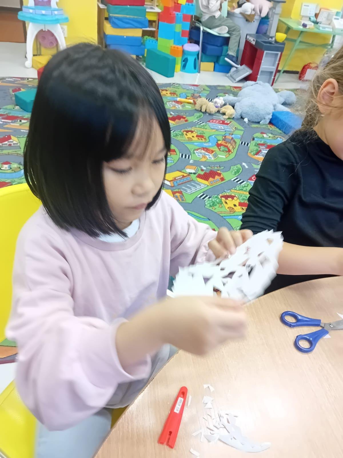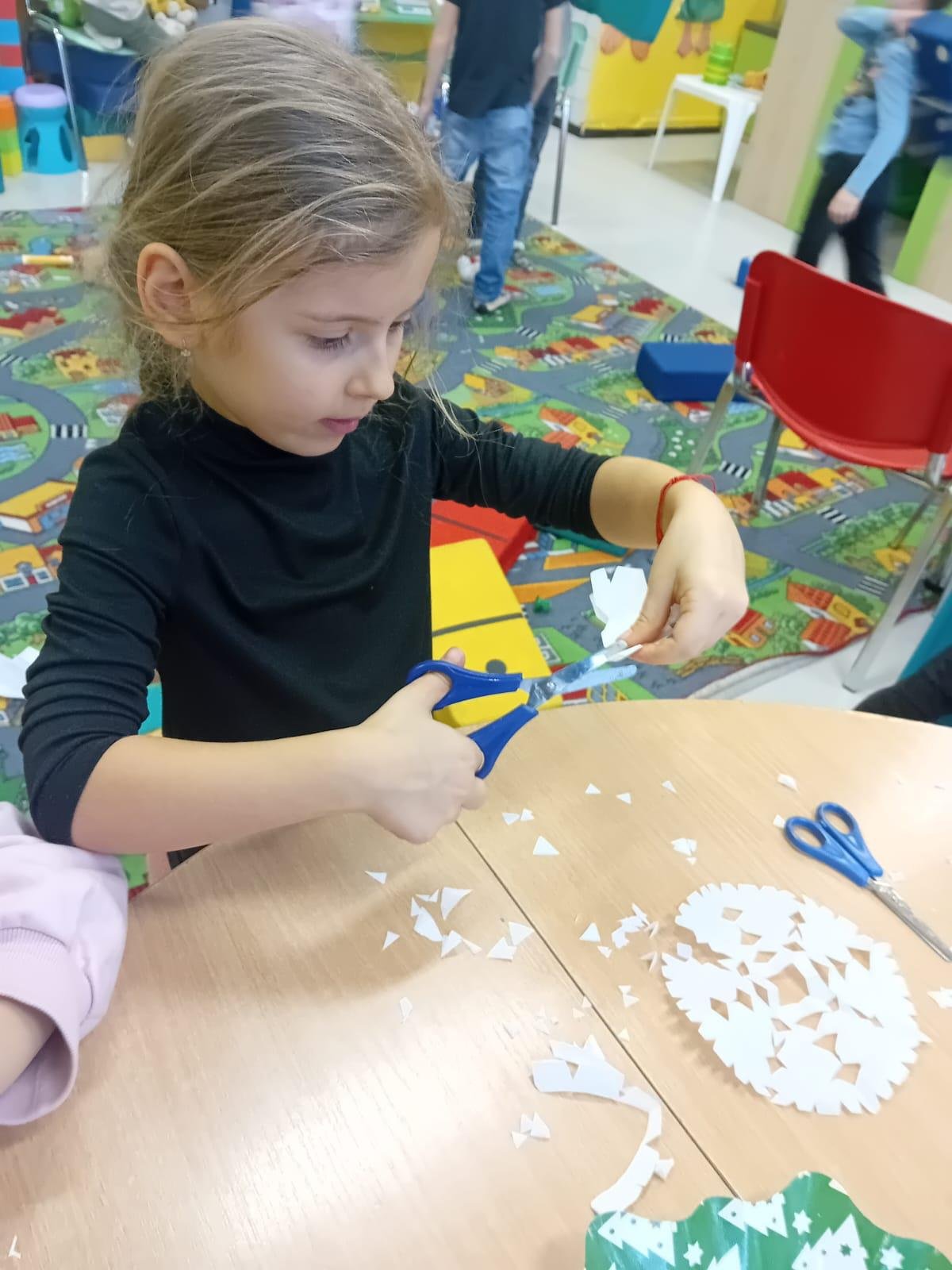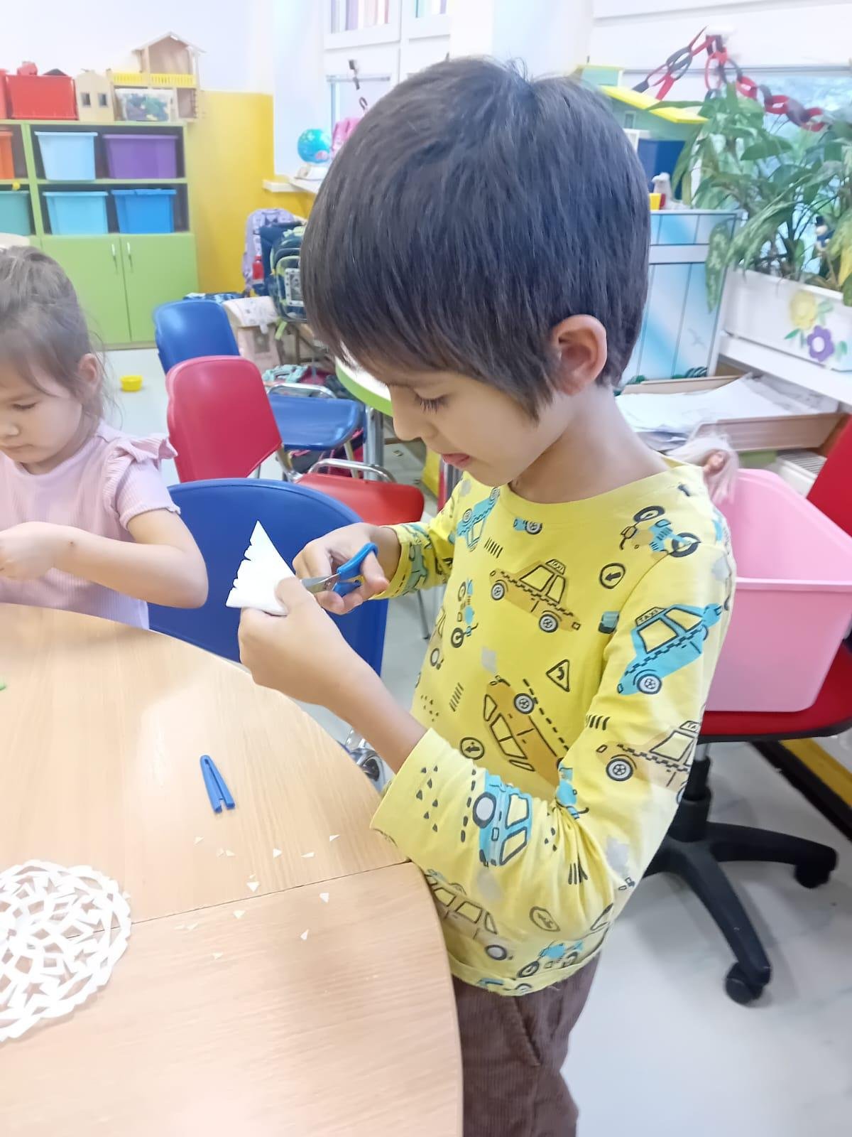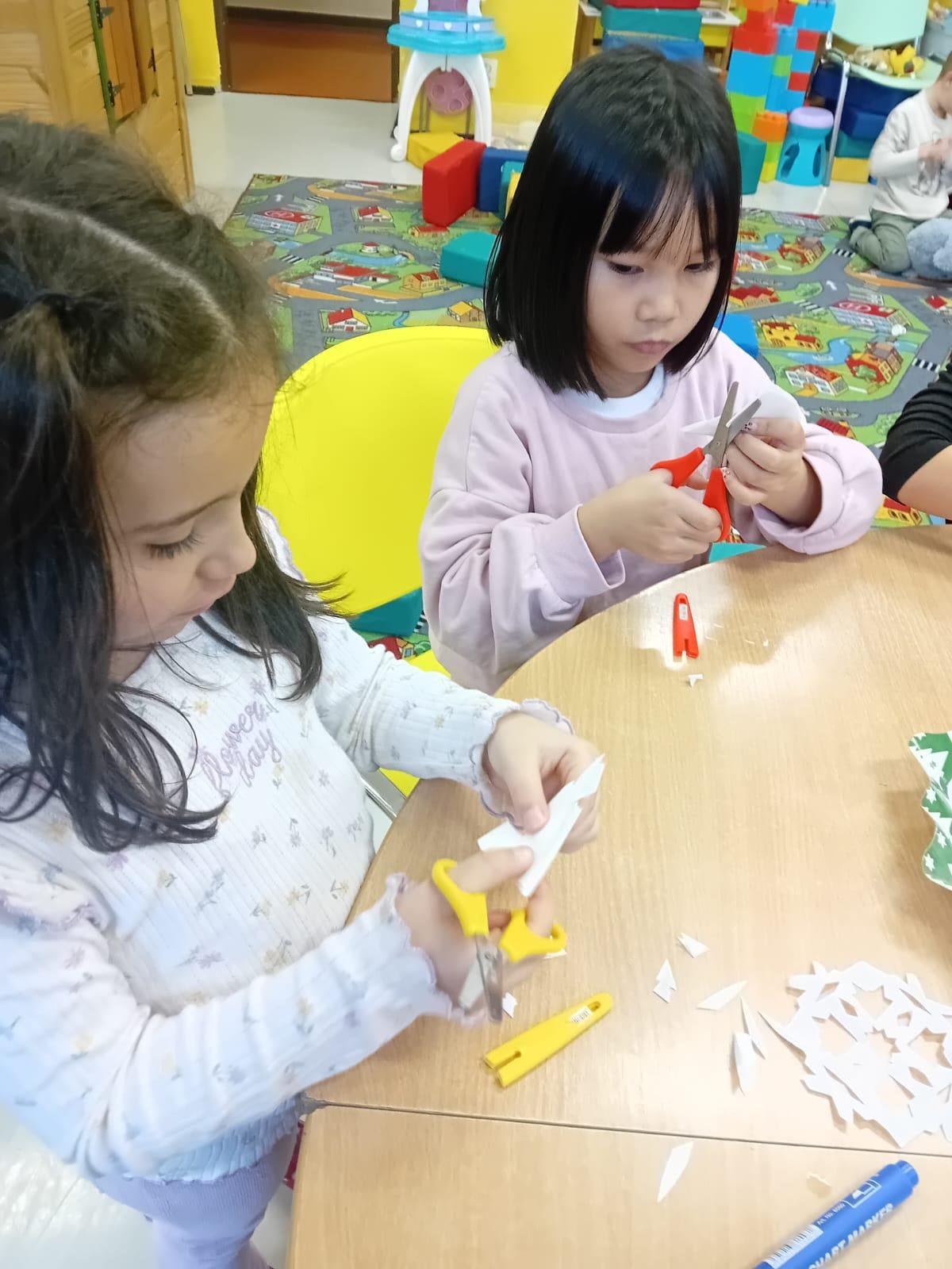 Prvňáčci trénují motoriku při stříhání sněhových vloček.