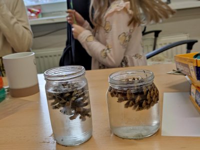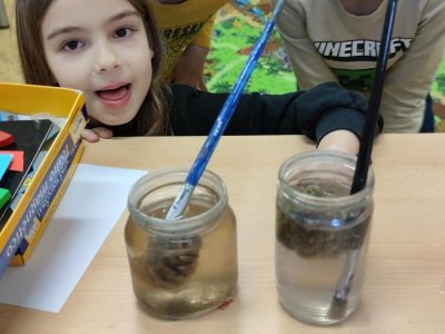 Protože jsme zimní skřítky vyráběli ze šišek, rozhodli jsme se vyzkoušet si s nimi i pokus. Nejdříve jsme napsali své hypotézy: Co se stane se šiškou ve studené a co v teplé vodě? Po 15 minutách jsme náš pokus zkontrolovali.
