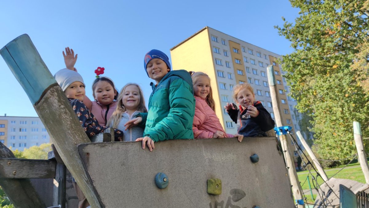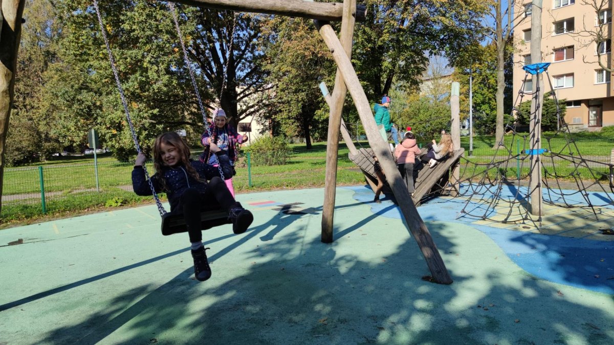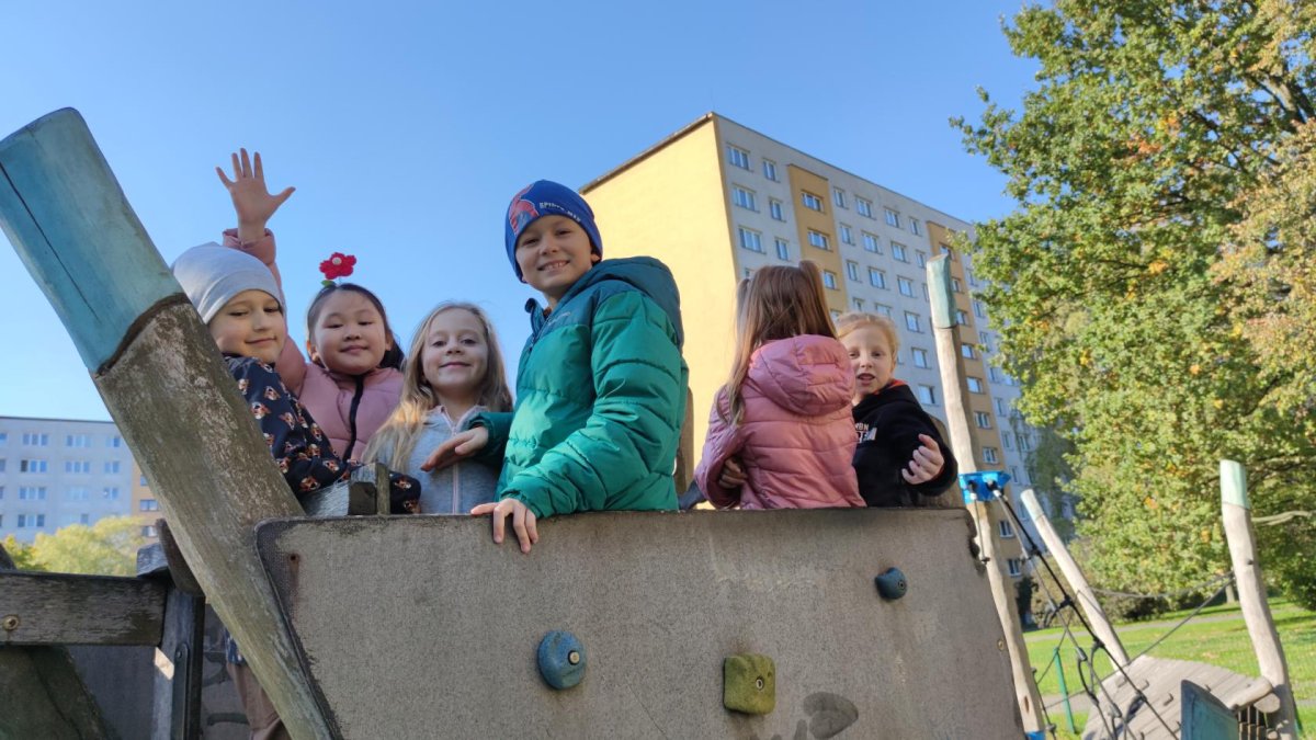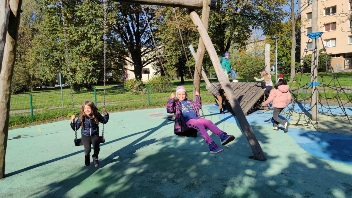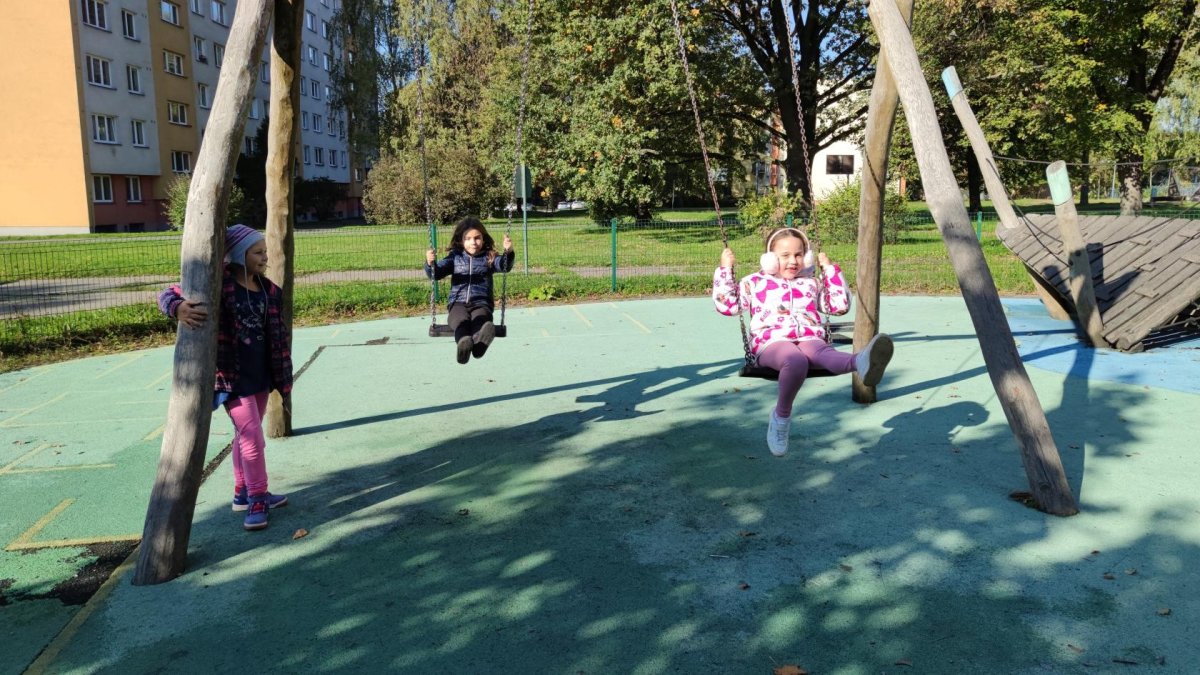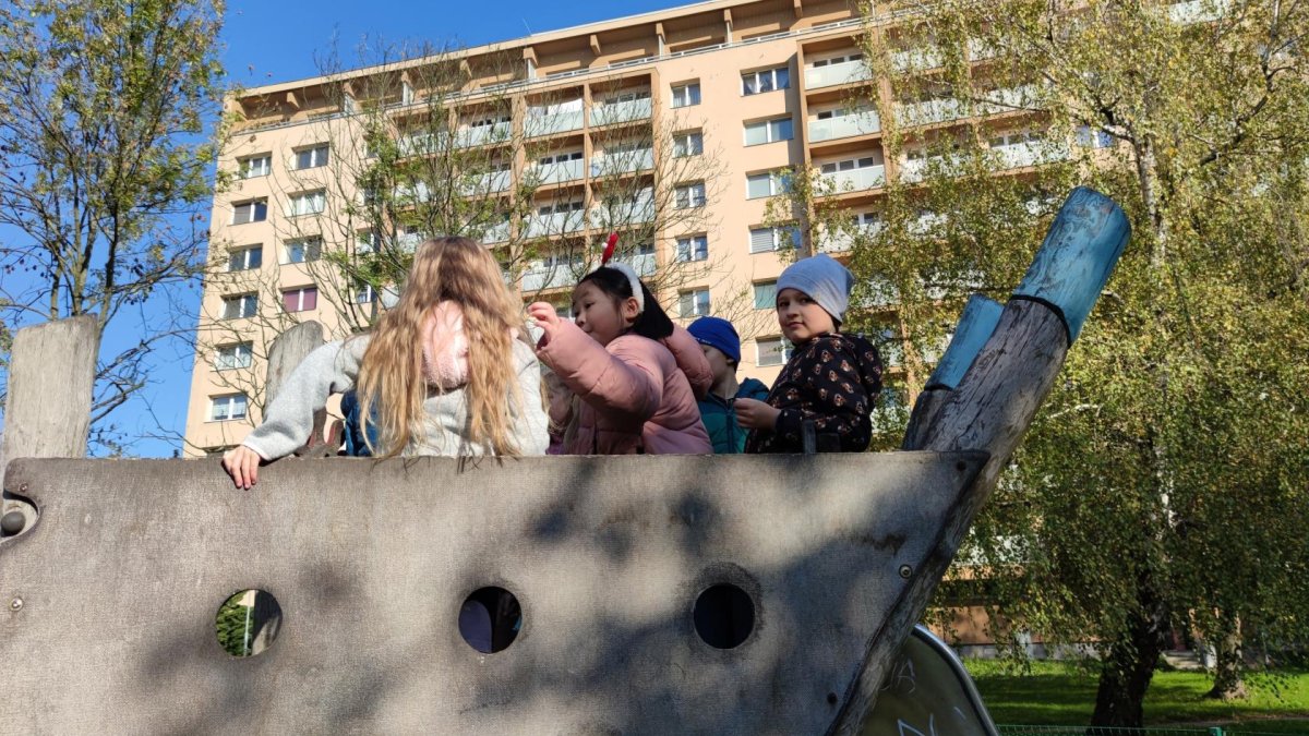 Mezi 14:00-15:00 většinou trávíme čas venku. Nejradši máme prolézačky a hry na honěnou.