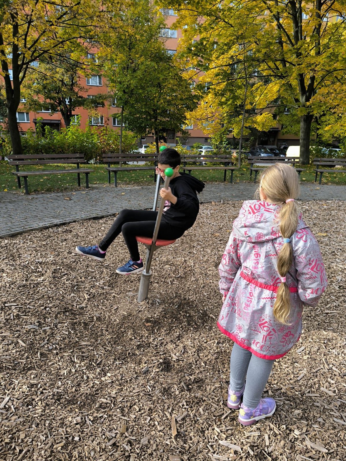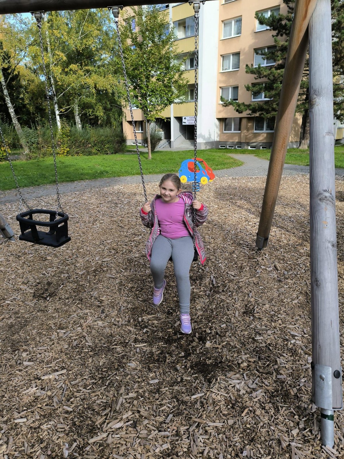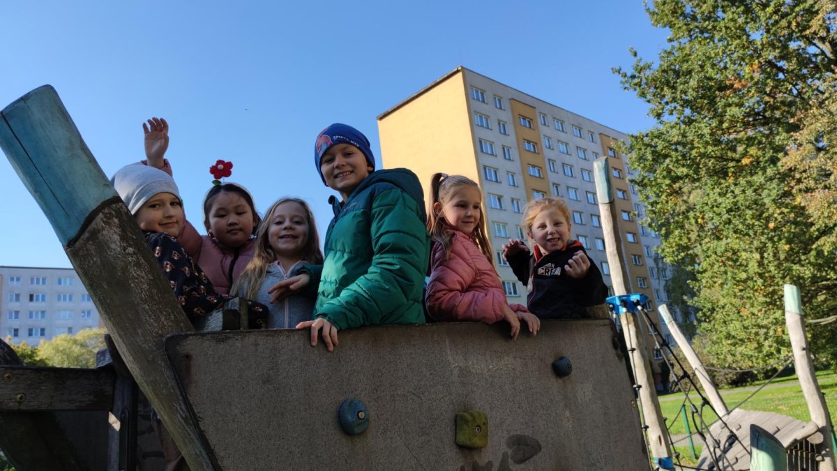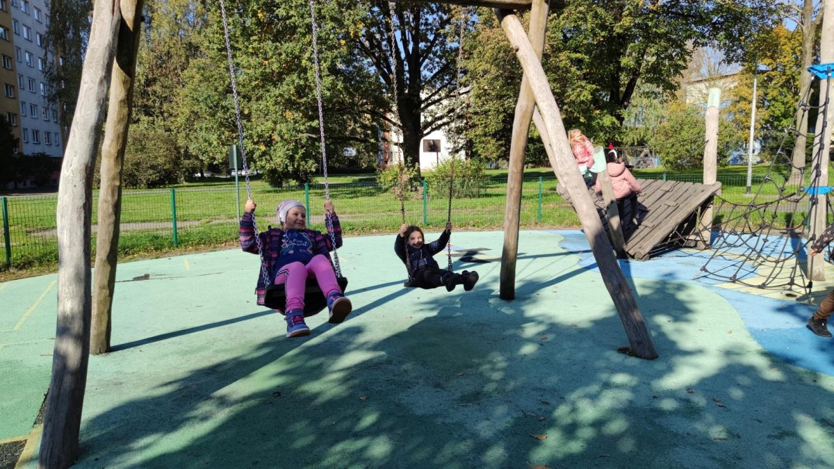 Mezi 14:00-15:00 většinou trávíme čas venku. Nejradši máme prolézačky a hry na honěnou.