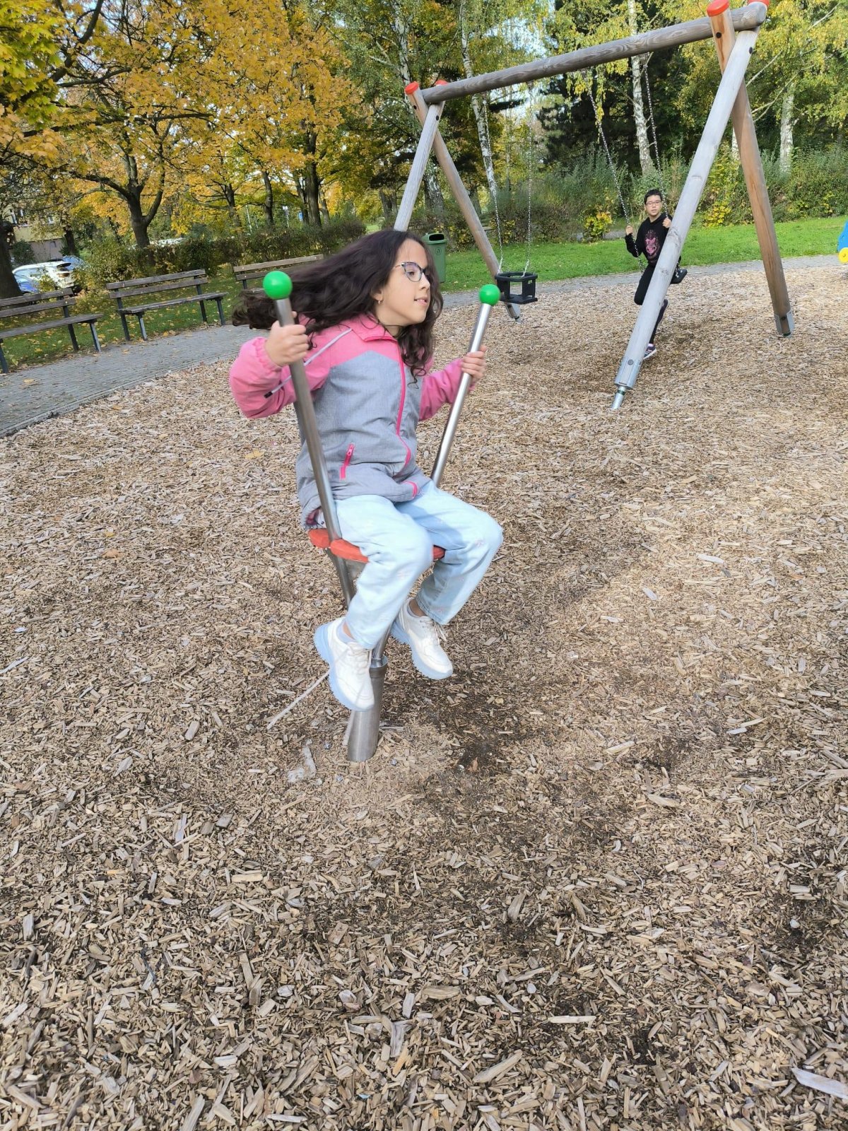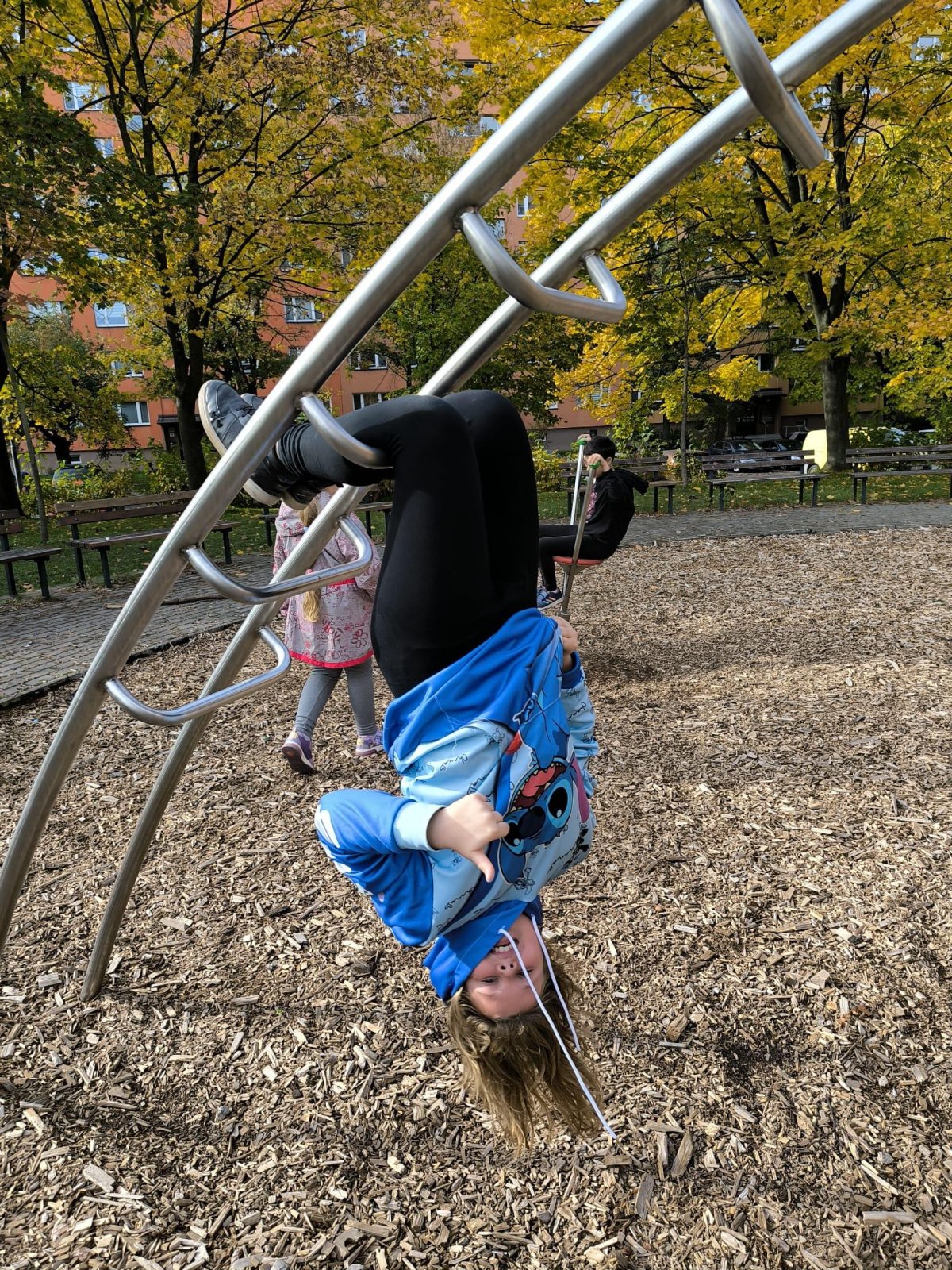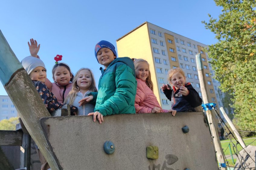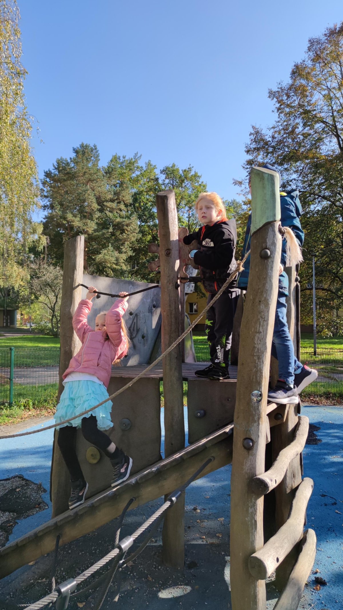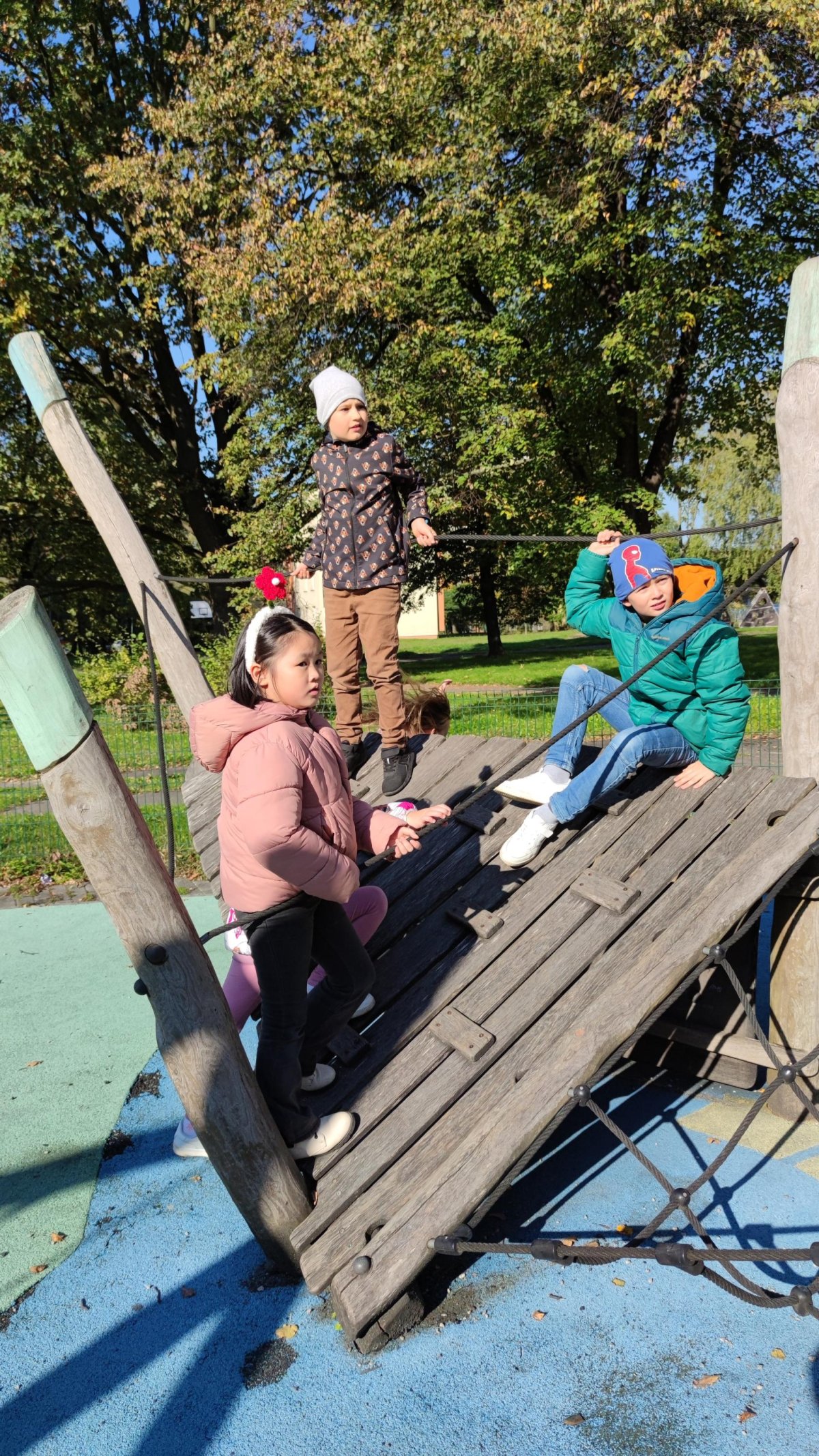 Mezi 14:00-15:00 většinou trávíme čas venku. Nejradši máme prolézačky a hry na honěnou.