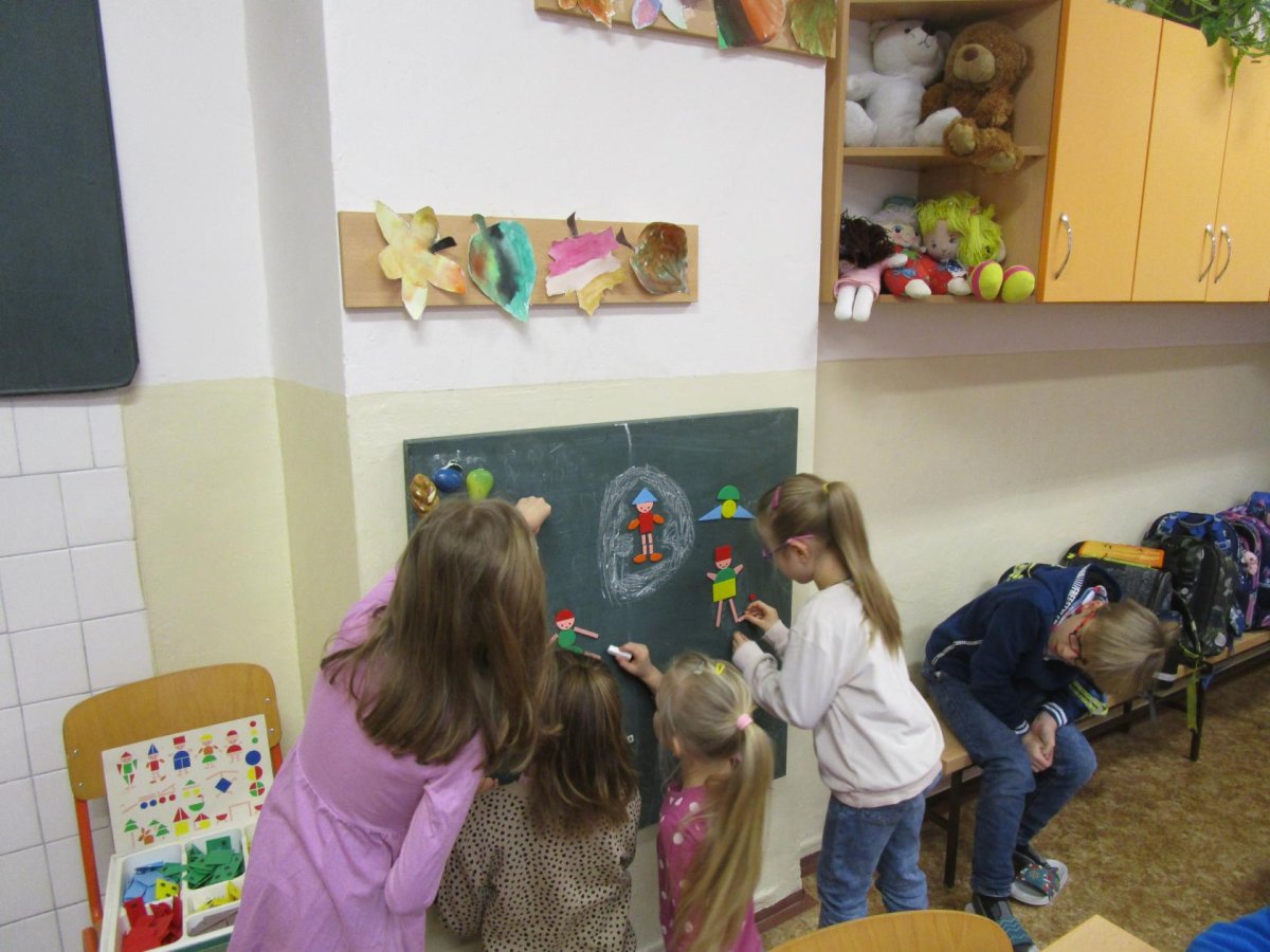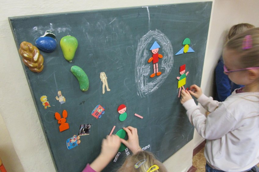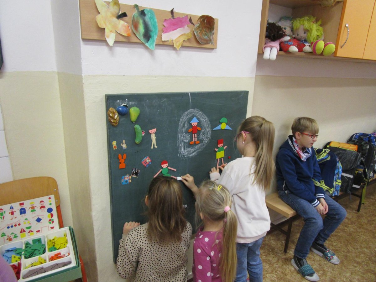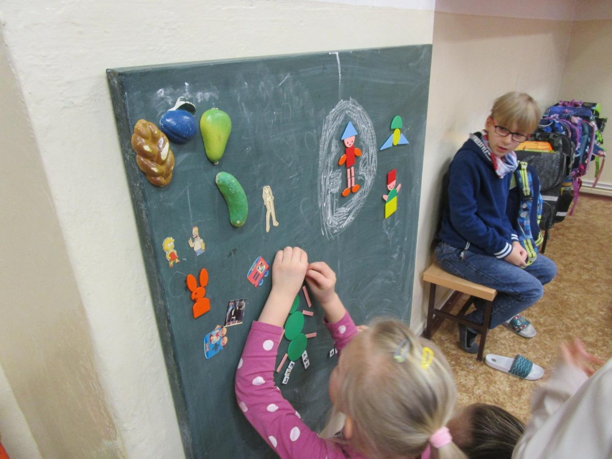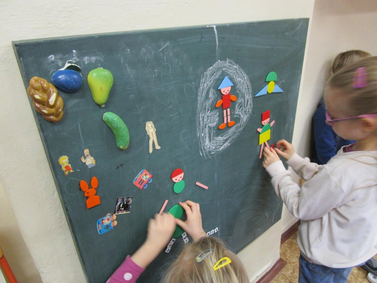 Magnetická tabule má u nás mnohé využití - hrajeme si na školu, kreslíme křídou, skládáme obrázky z geometrických tvarů...