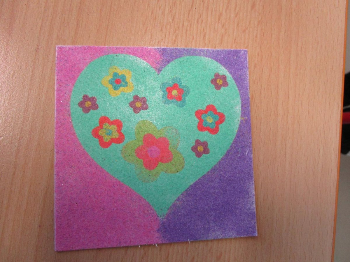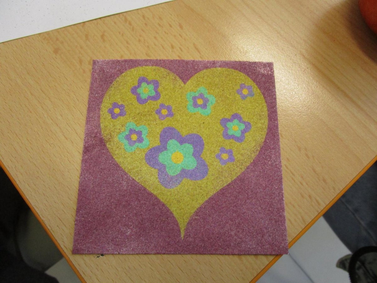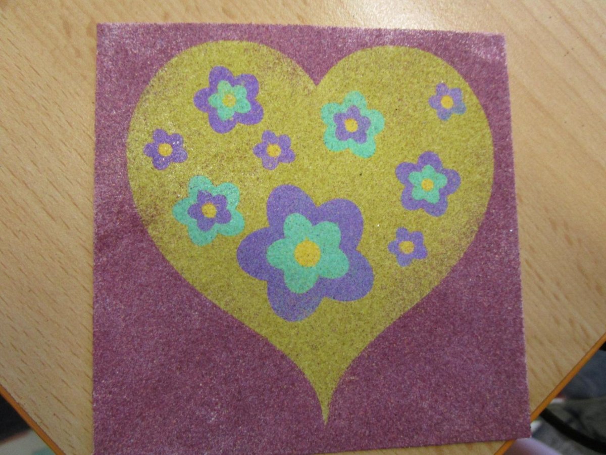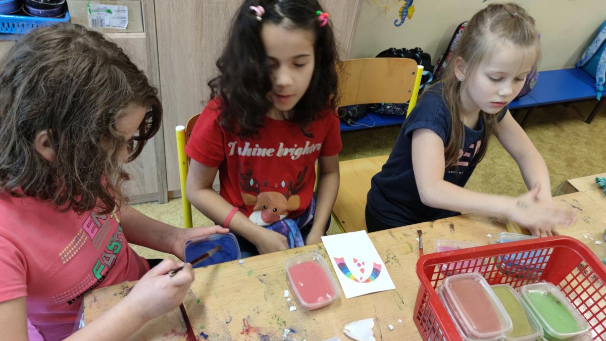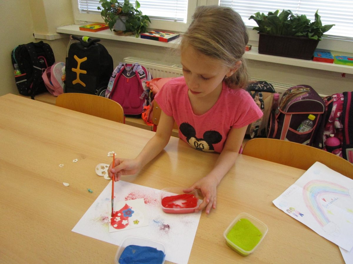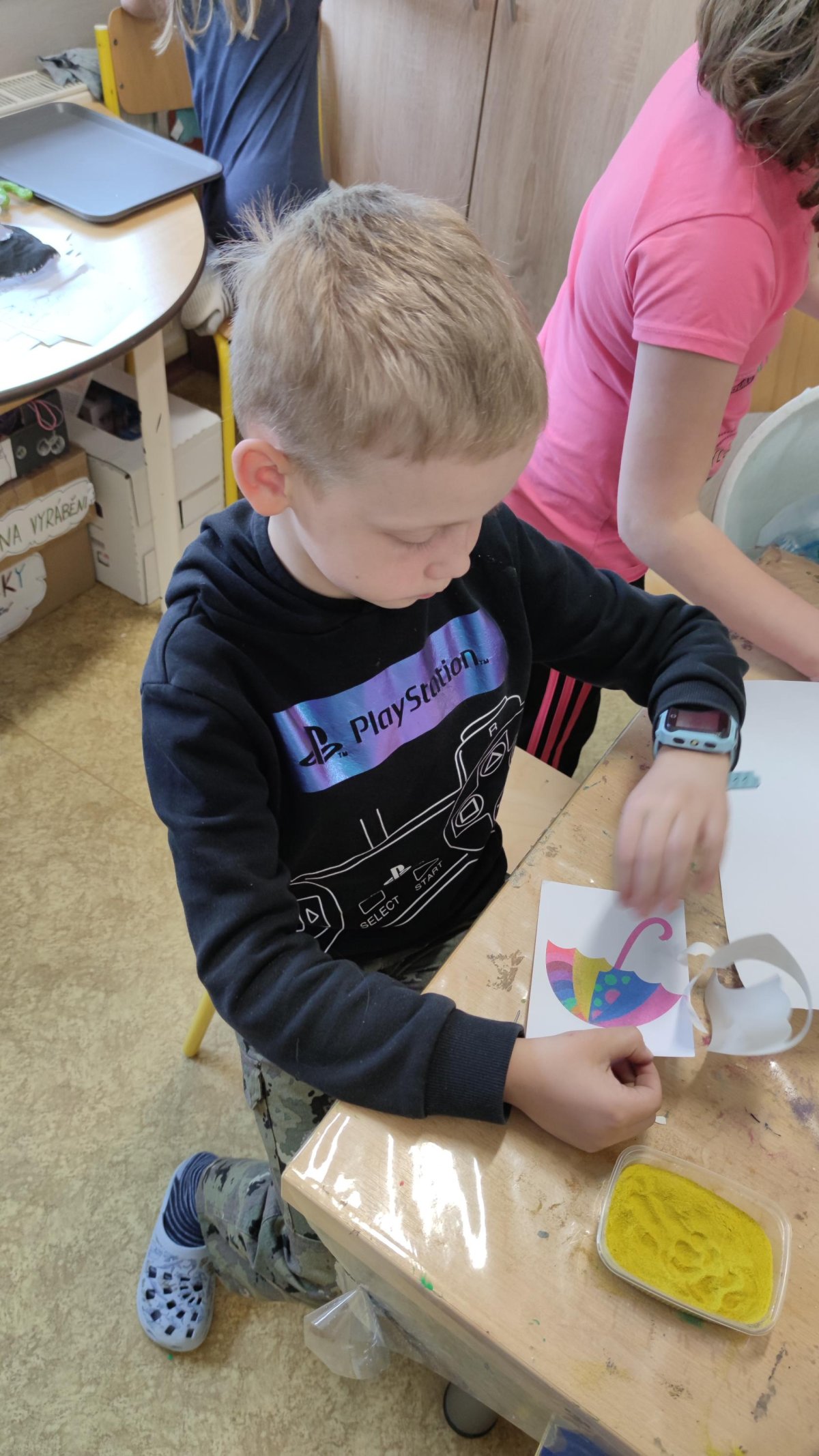 Tvoříme obrázky z barevných písků napříč odděleními... Někde deštníčky, jinde kytičky nebo srdíčka.