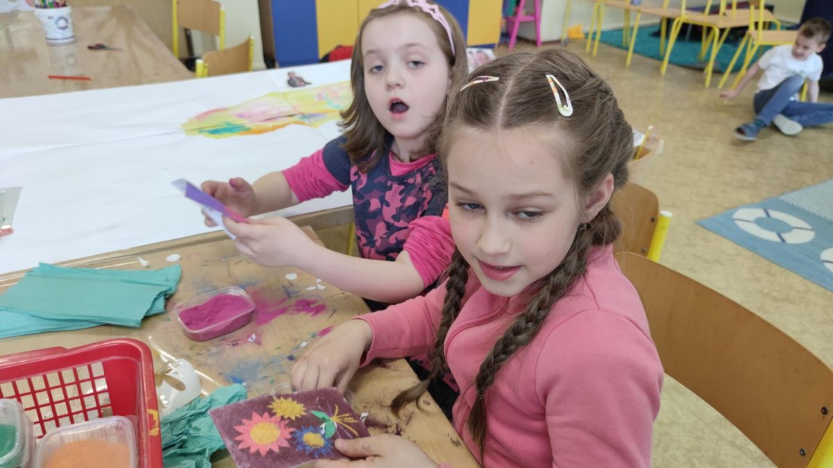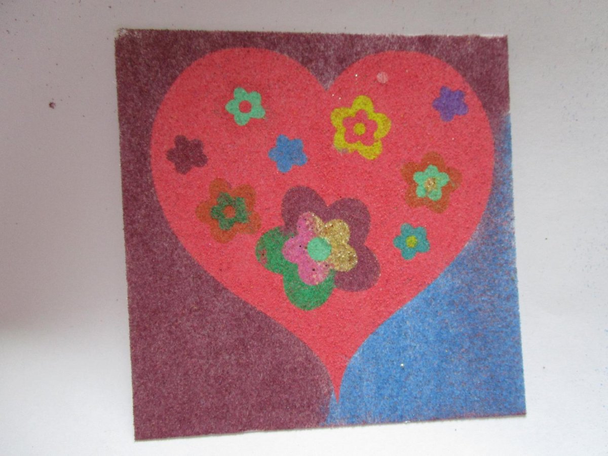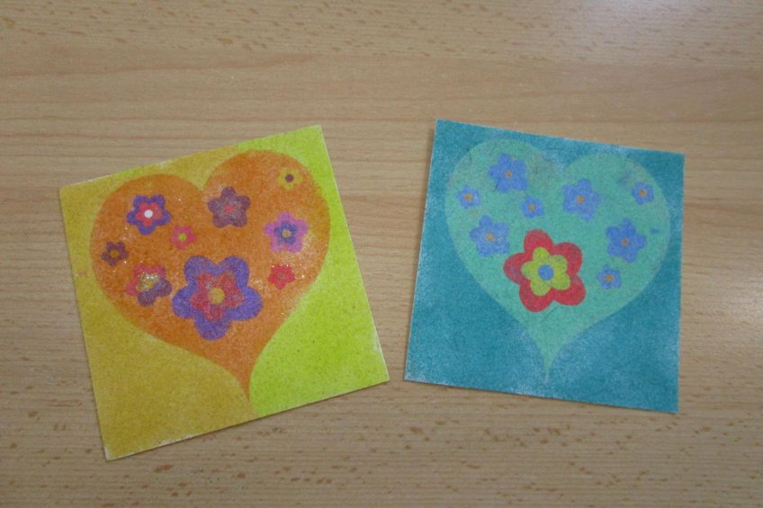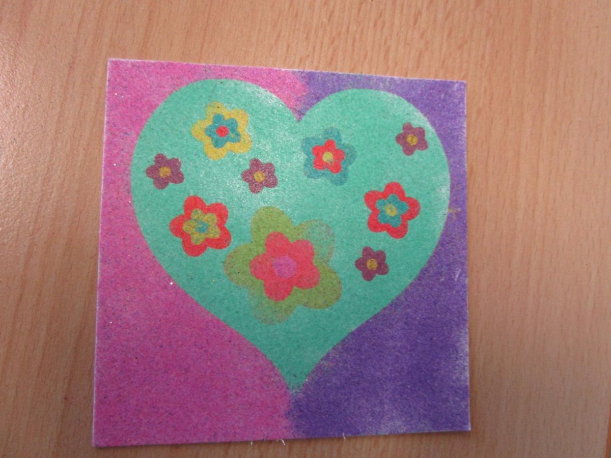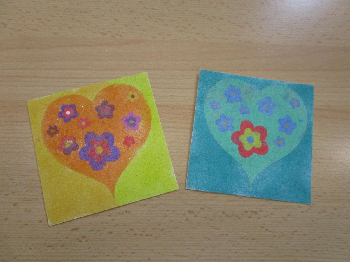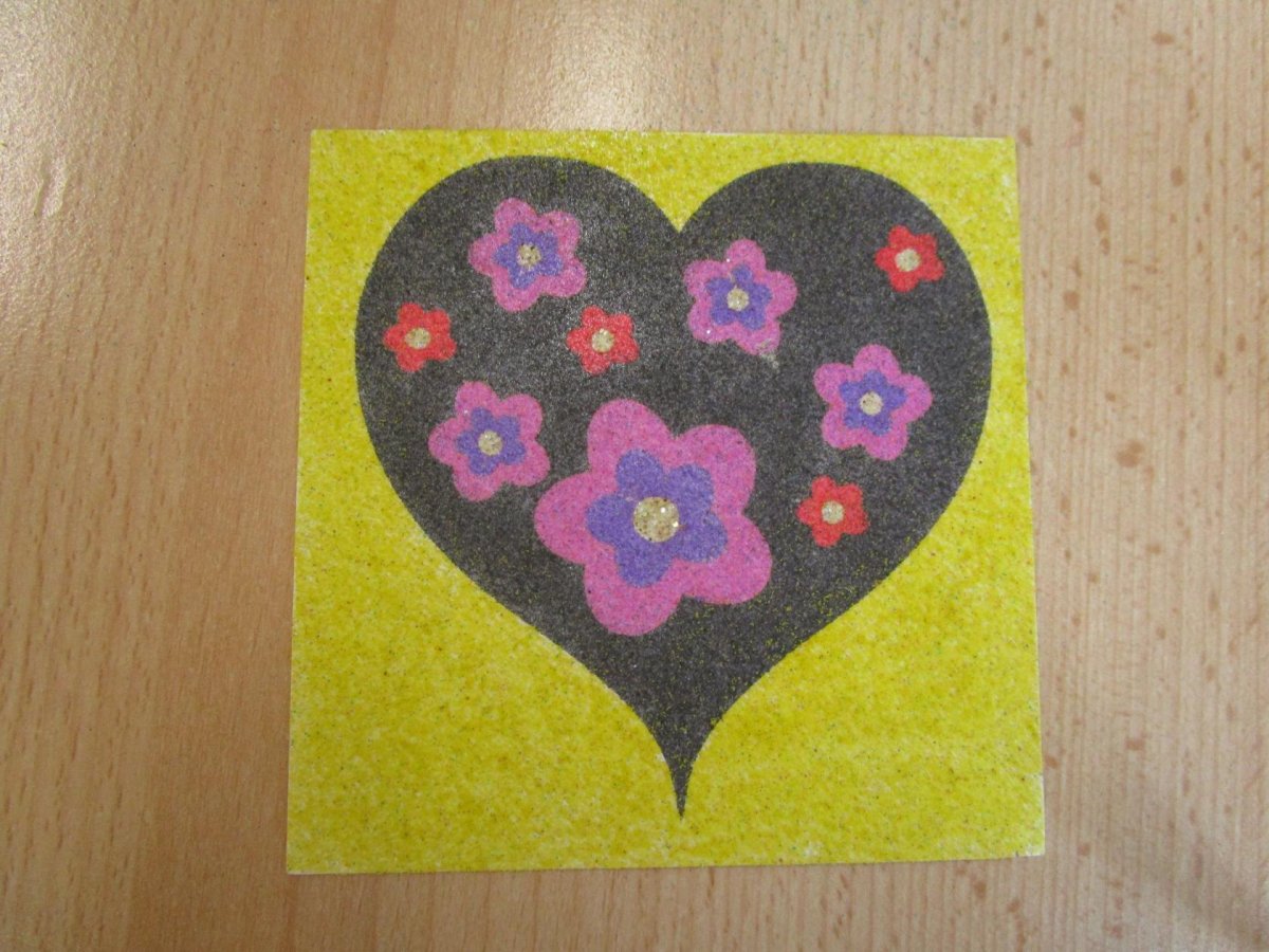 Tvoříme obrázky z barevných písků napříč odděleními... Někde deštníčky, jinde kytičky nebo srdíčka.