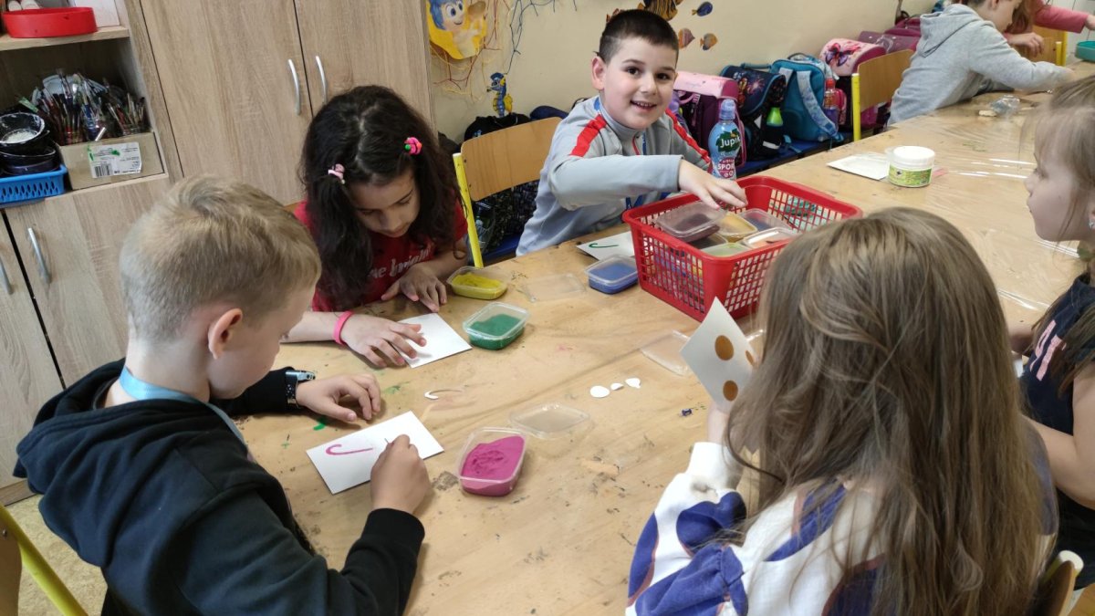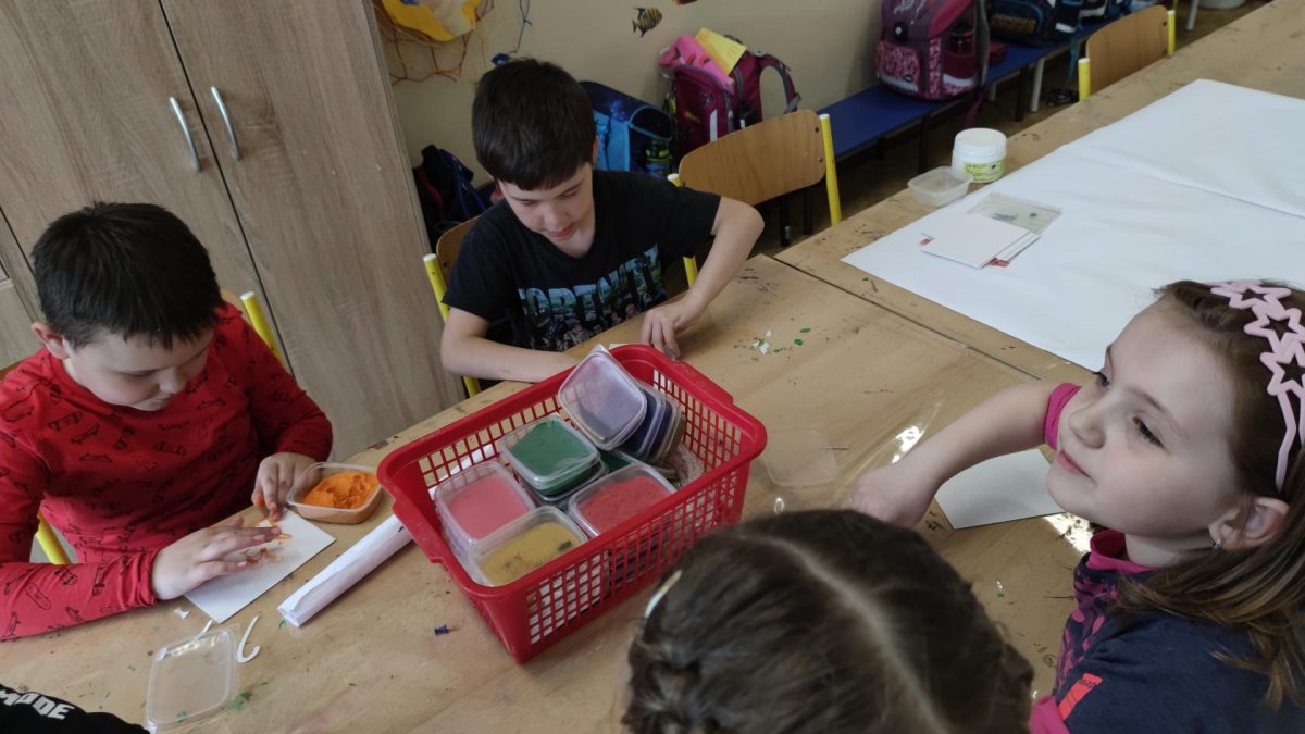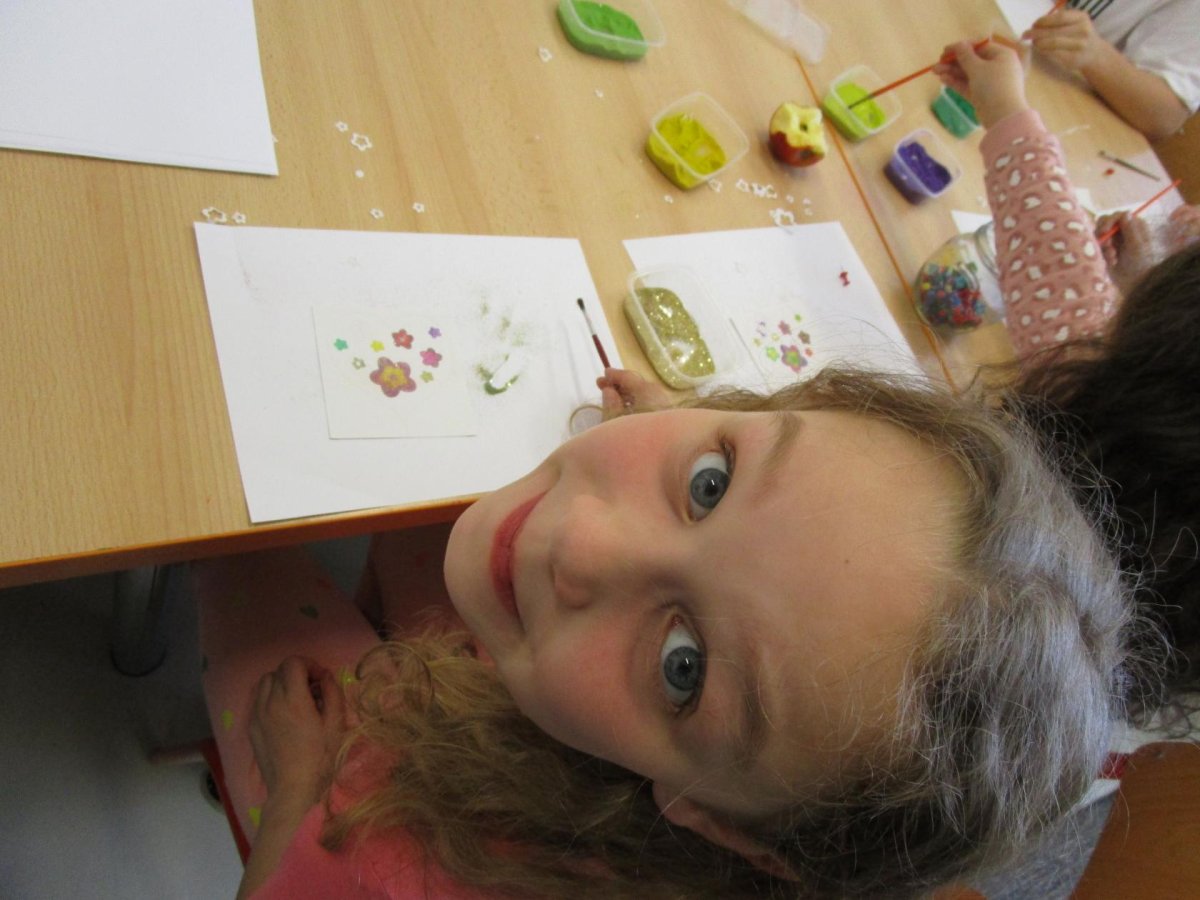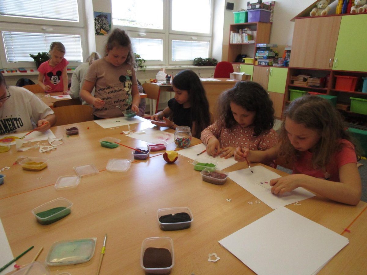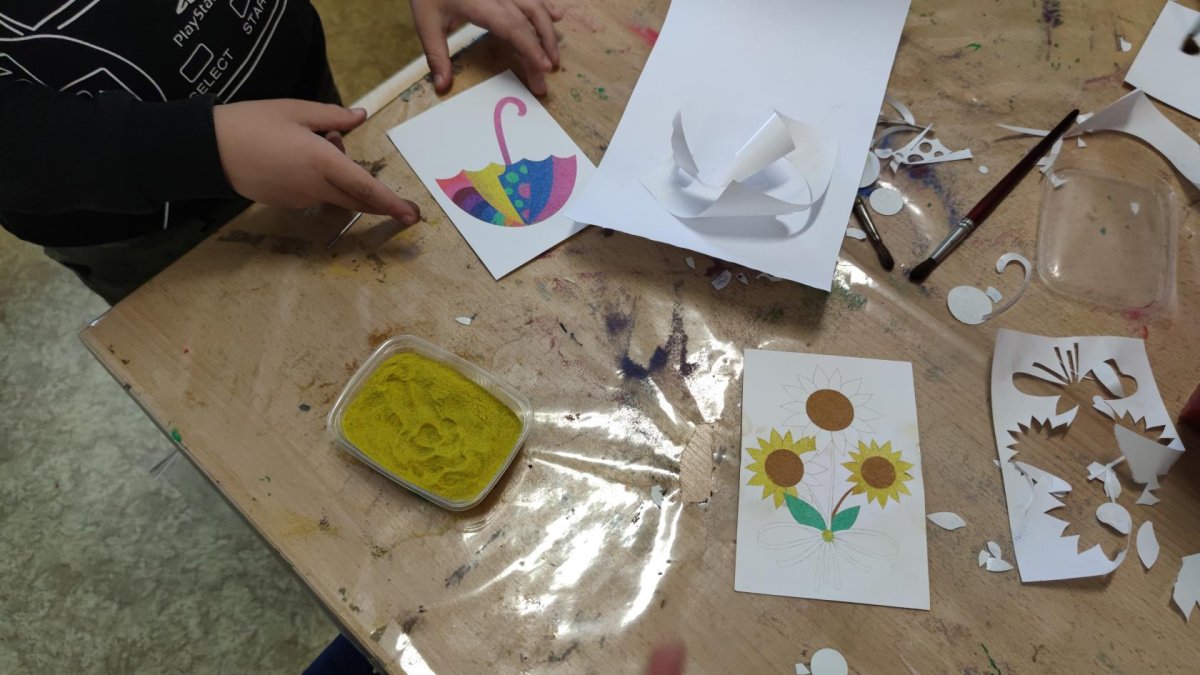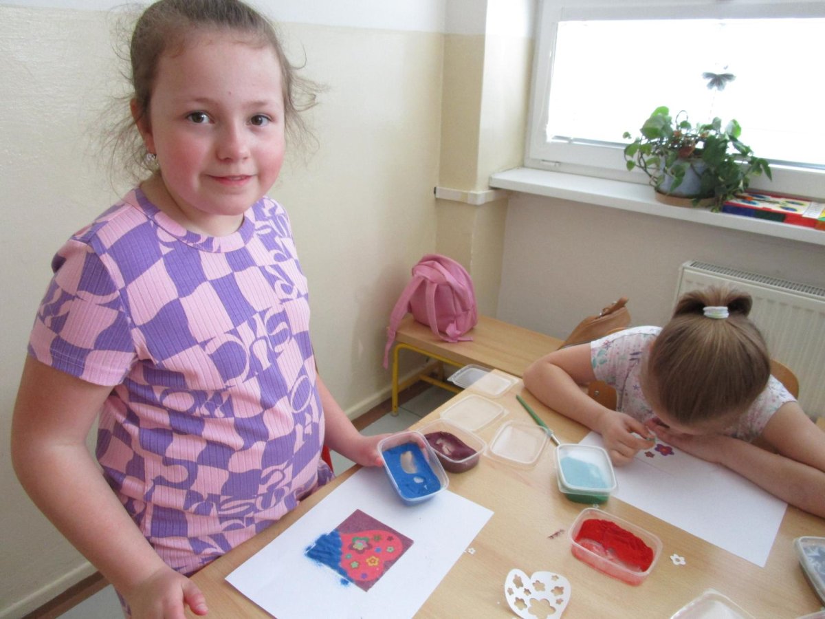 Tvoříme obrázky z barevných písků napříč odděleními... Někde deštníčky, jinde kytičky nebo srdíčka.