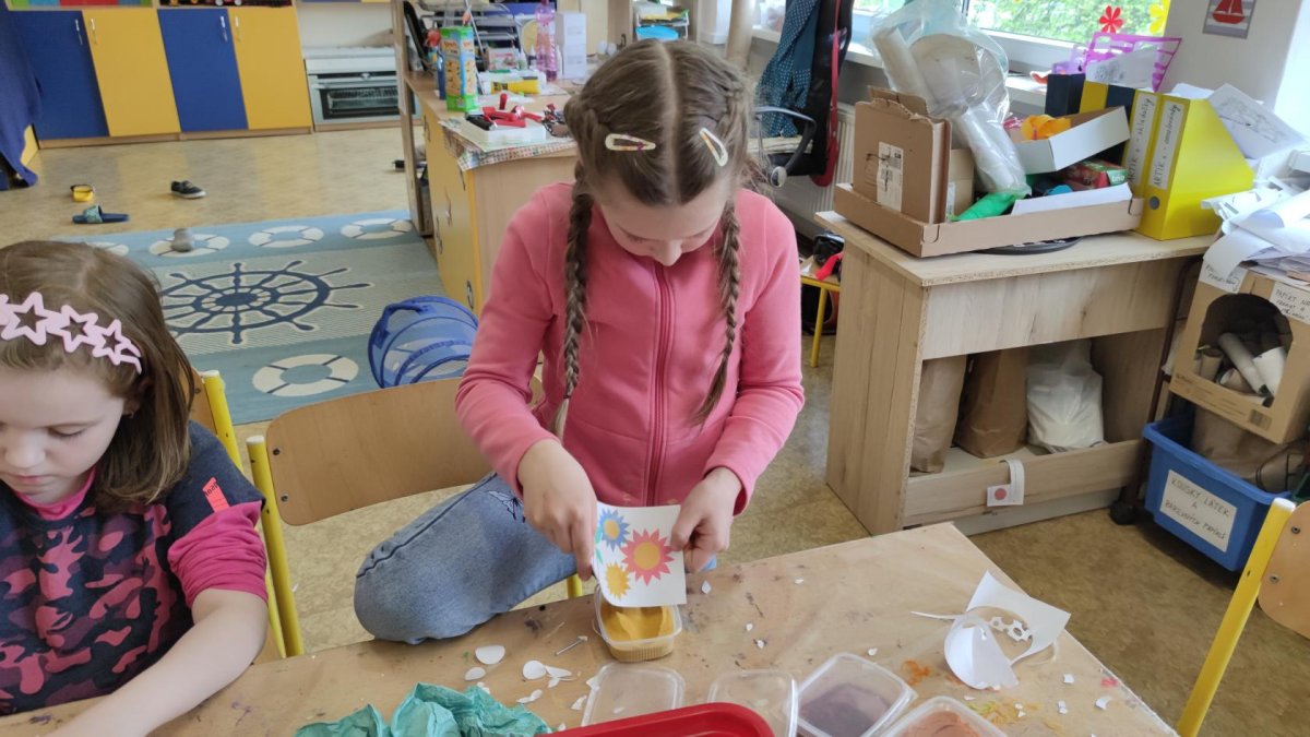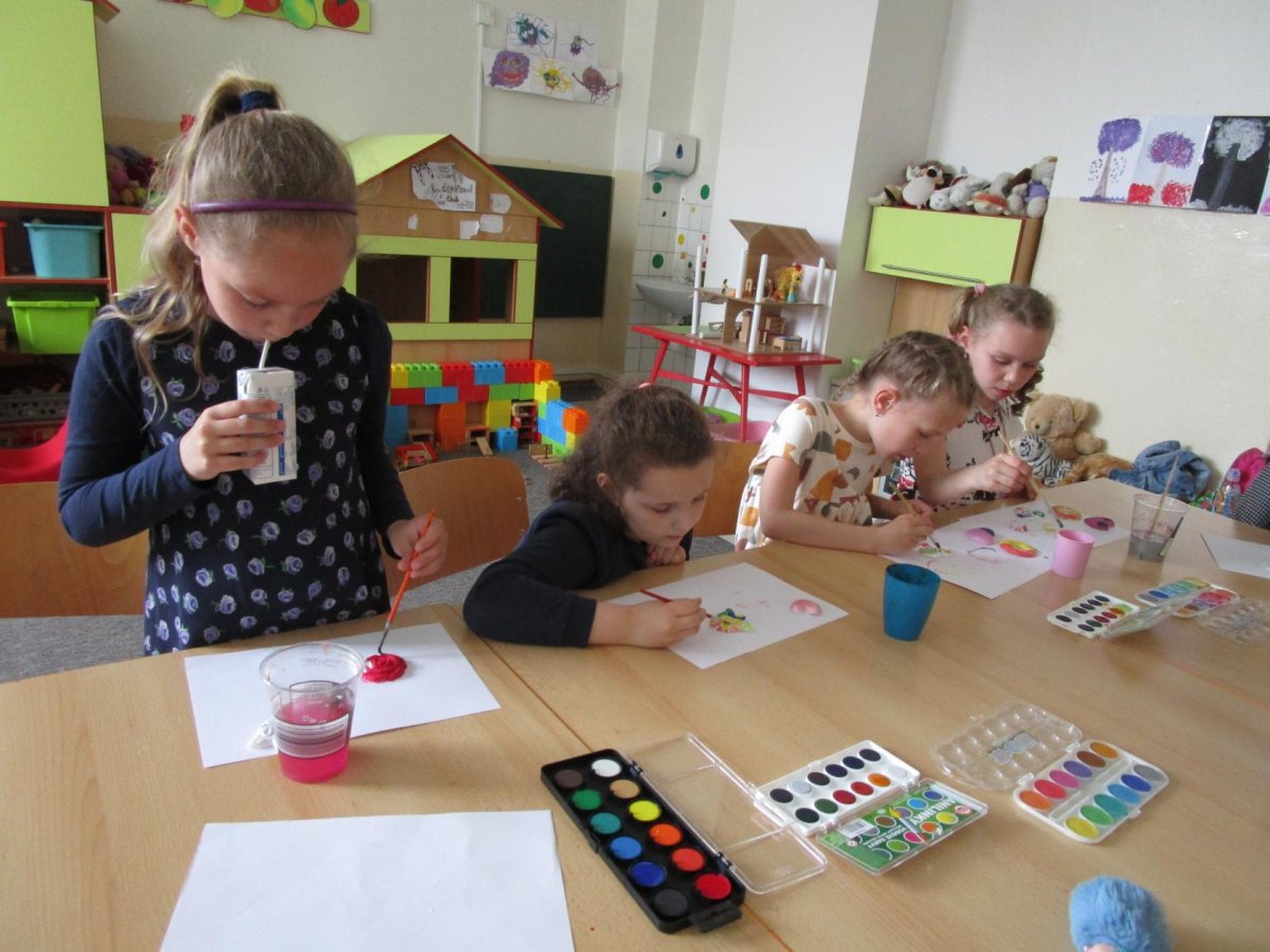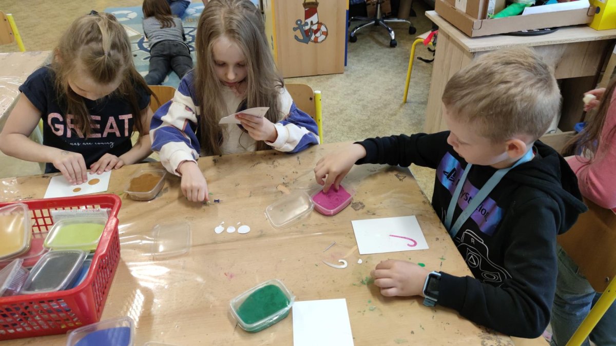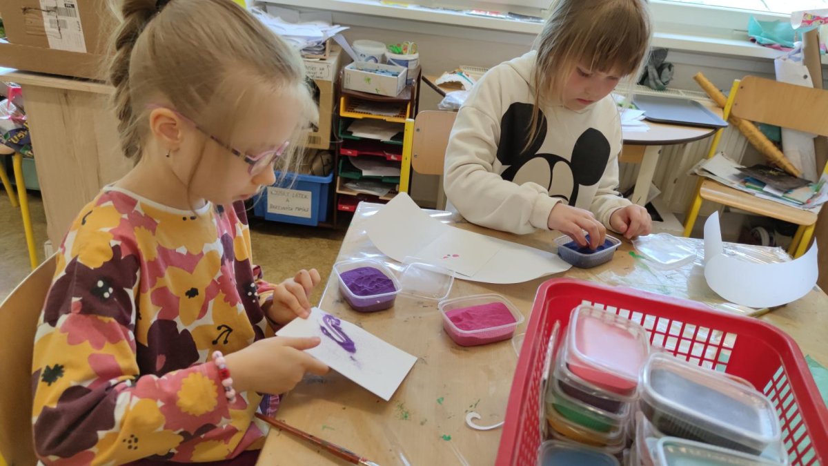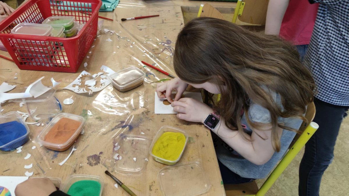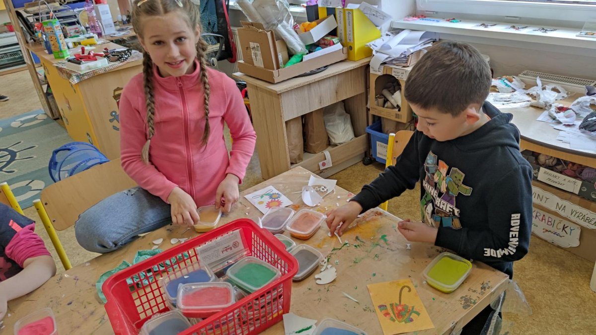 Tvoříme obrázky z barevných písků napříč odděleními... Někde deštníčky, jinde kytičky nebo srdíčka.