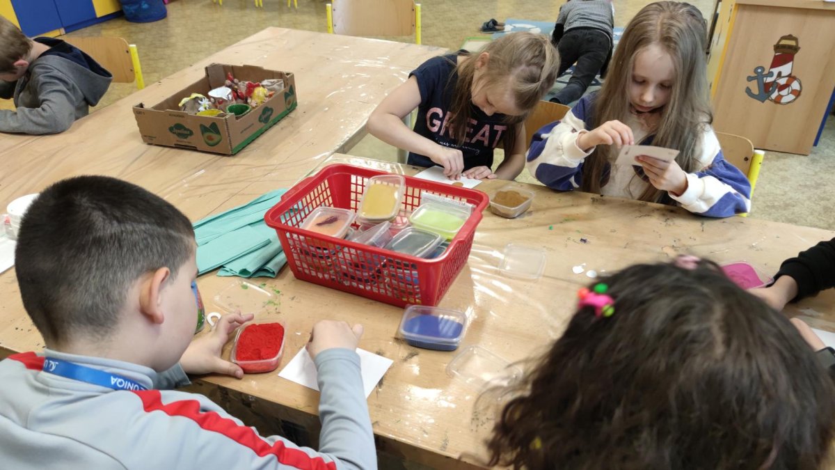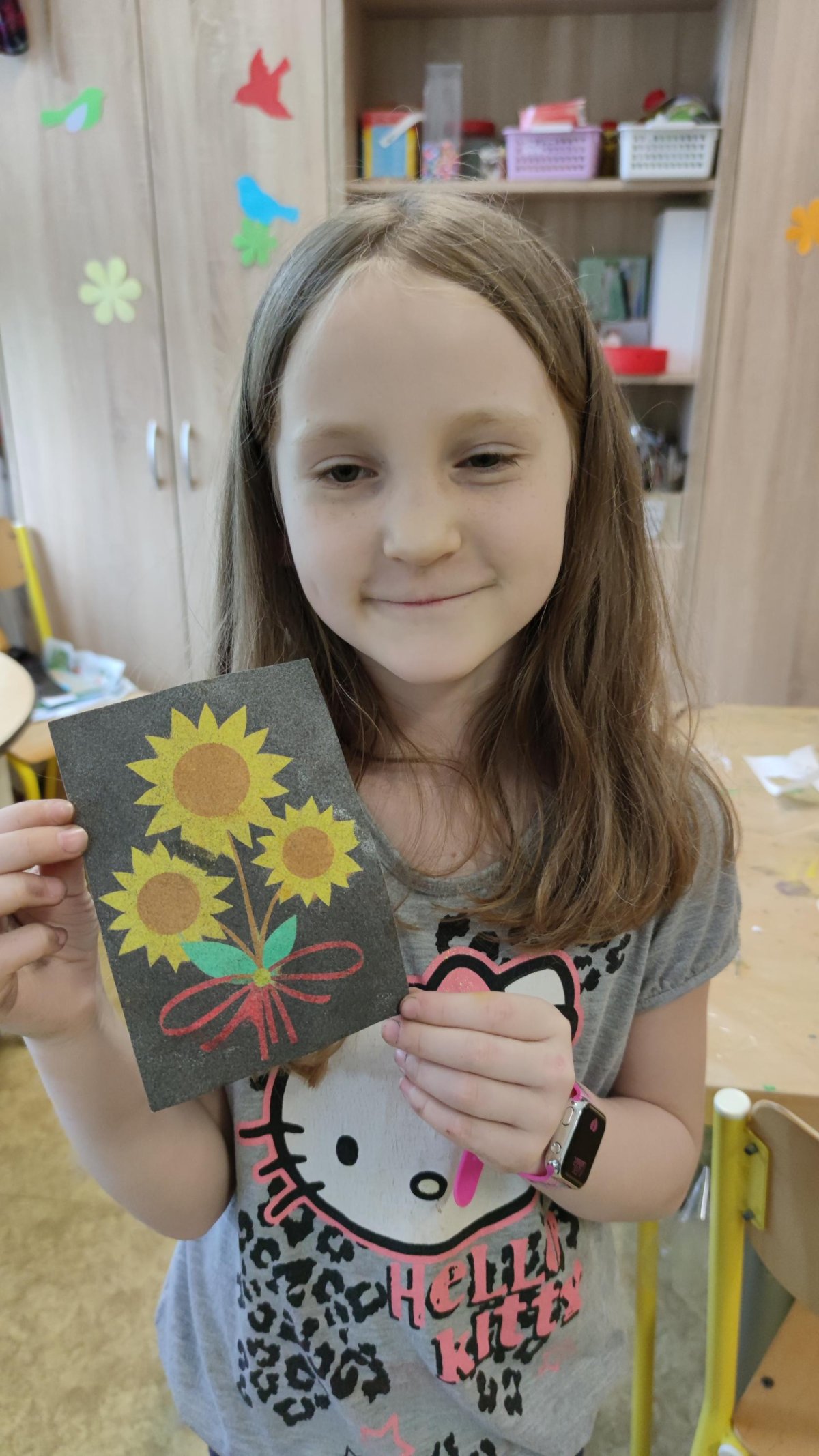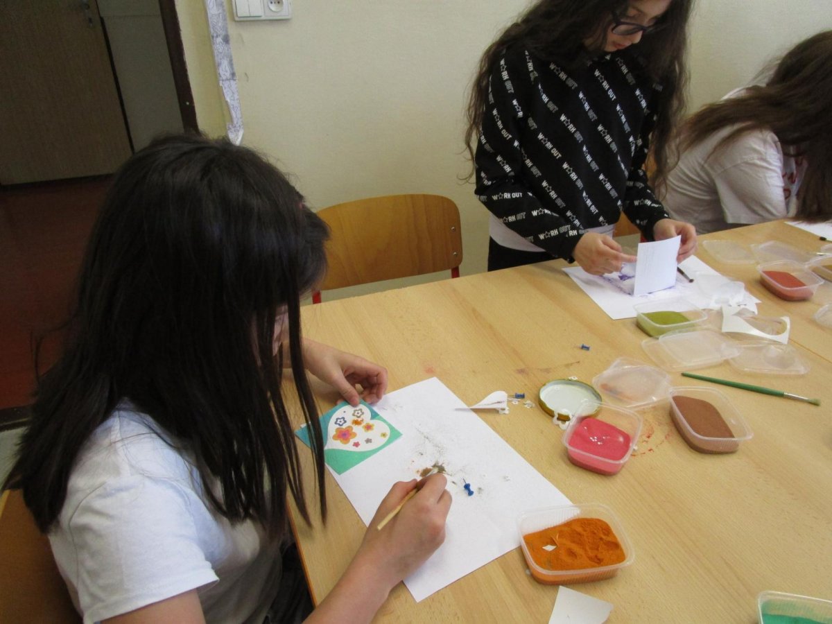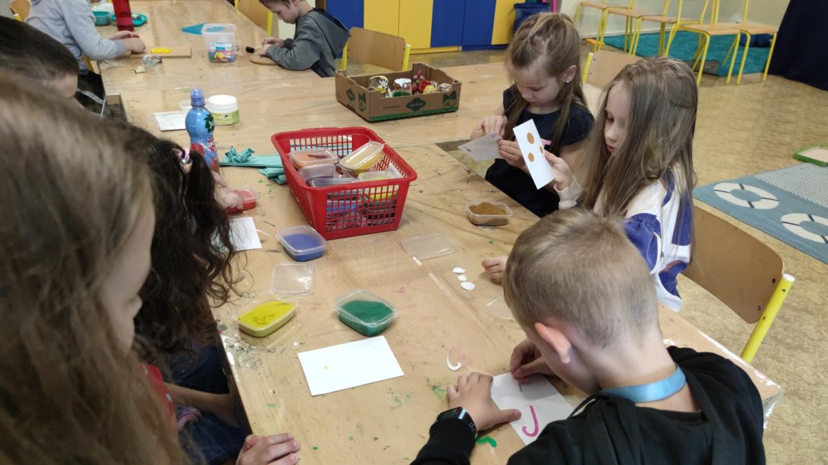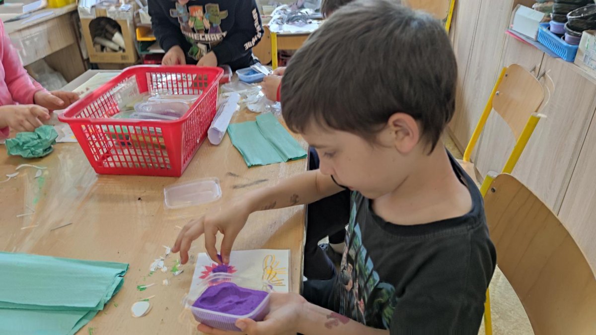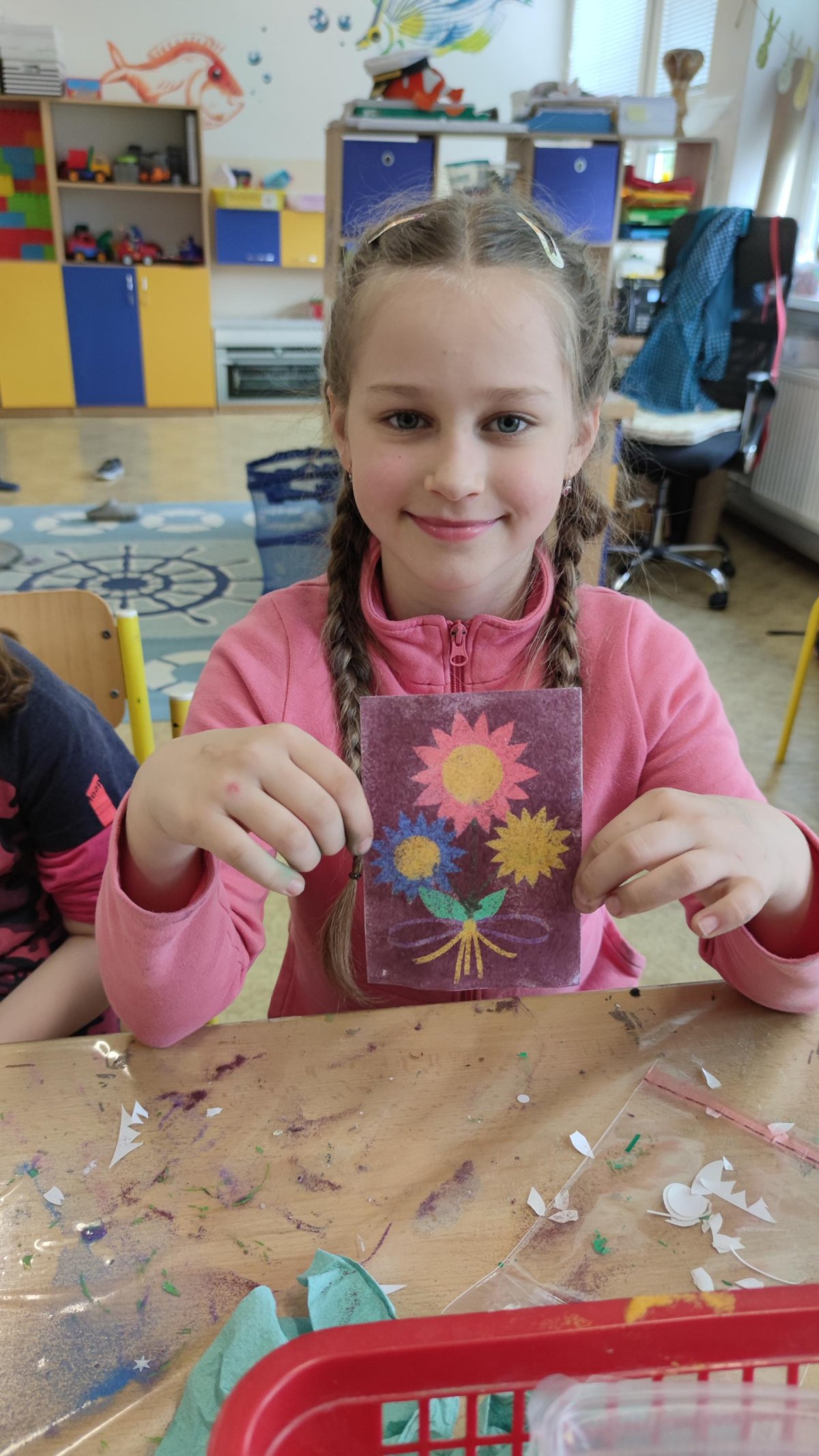 Tvoříme obrázky z barevných písků napříč odděleními... Někde deštníčky, jinde kytičky nebo srdíčka.