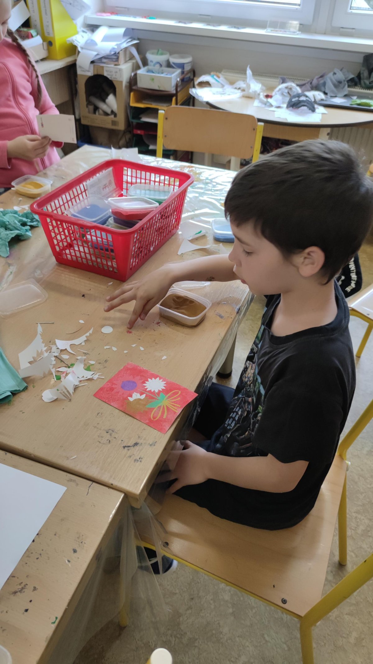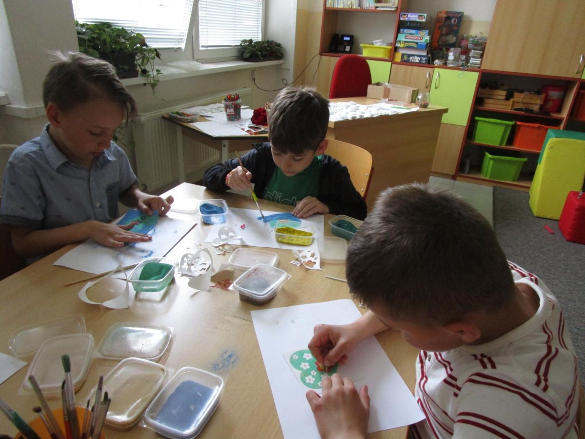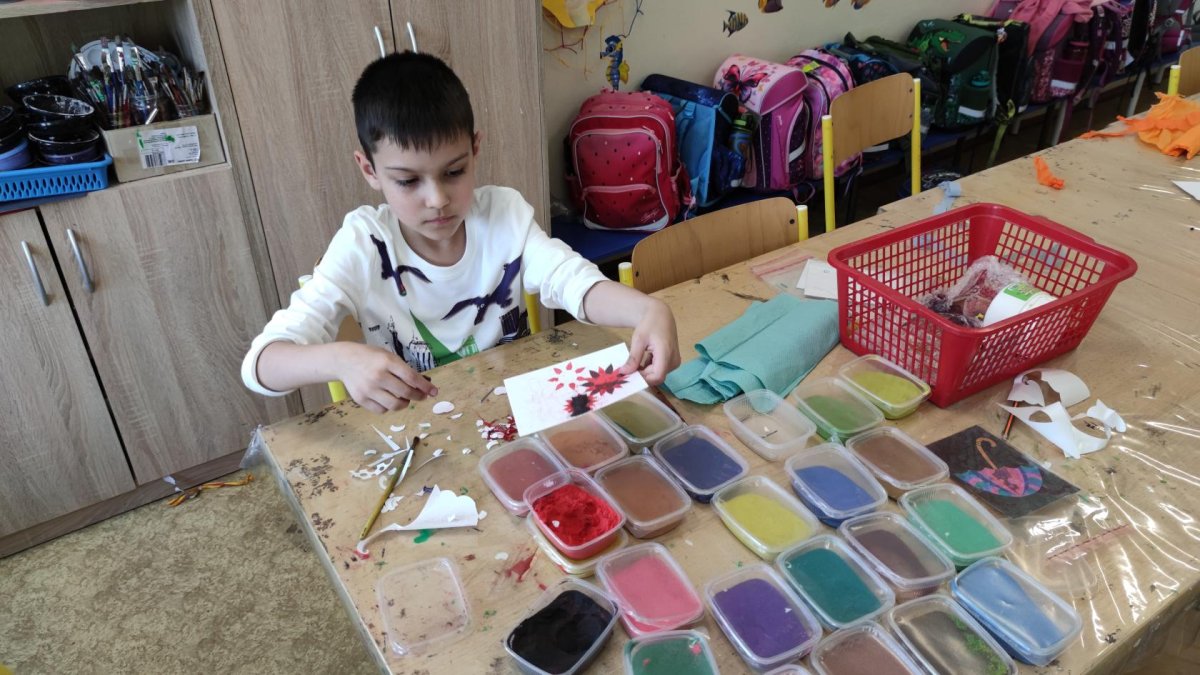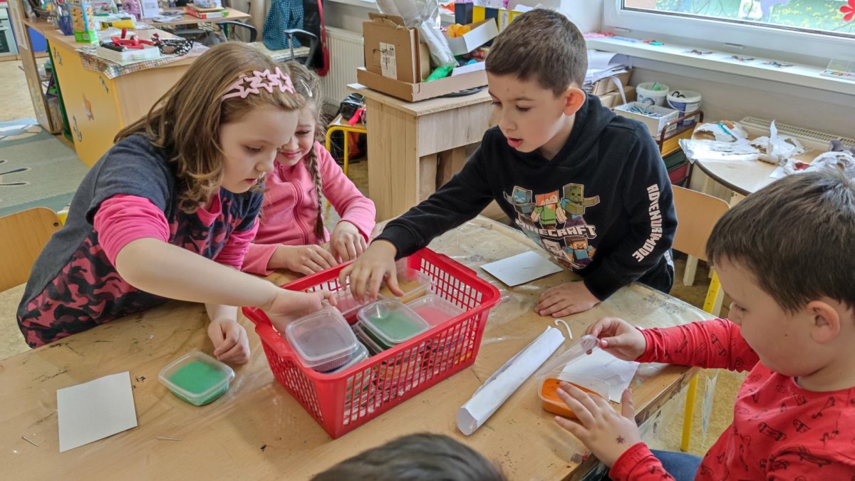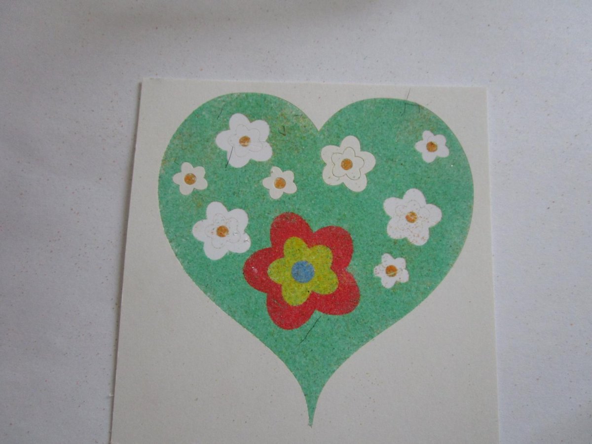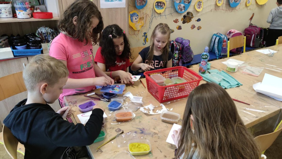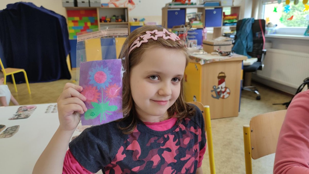 Tvoříme obrázky z barevných písků napříč odděleními... Někde deštníčky, jinde kytičky nebo srdíčka.