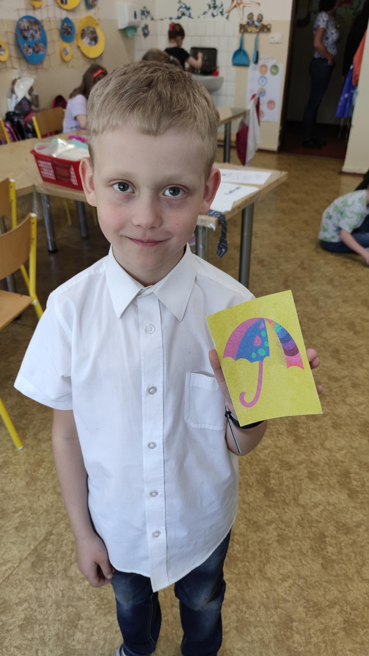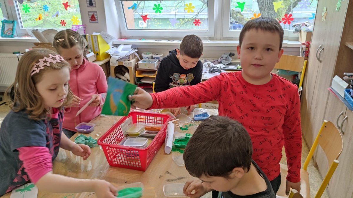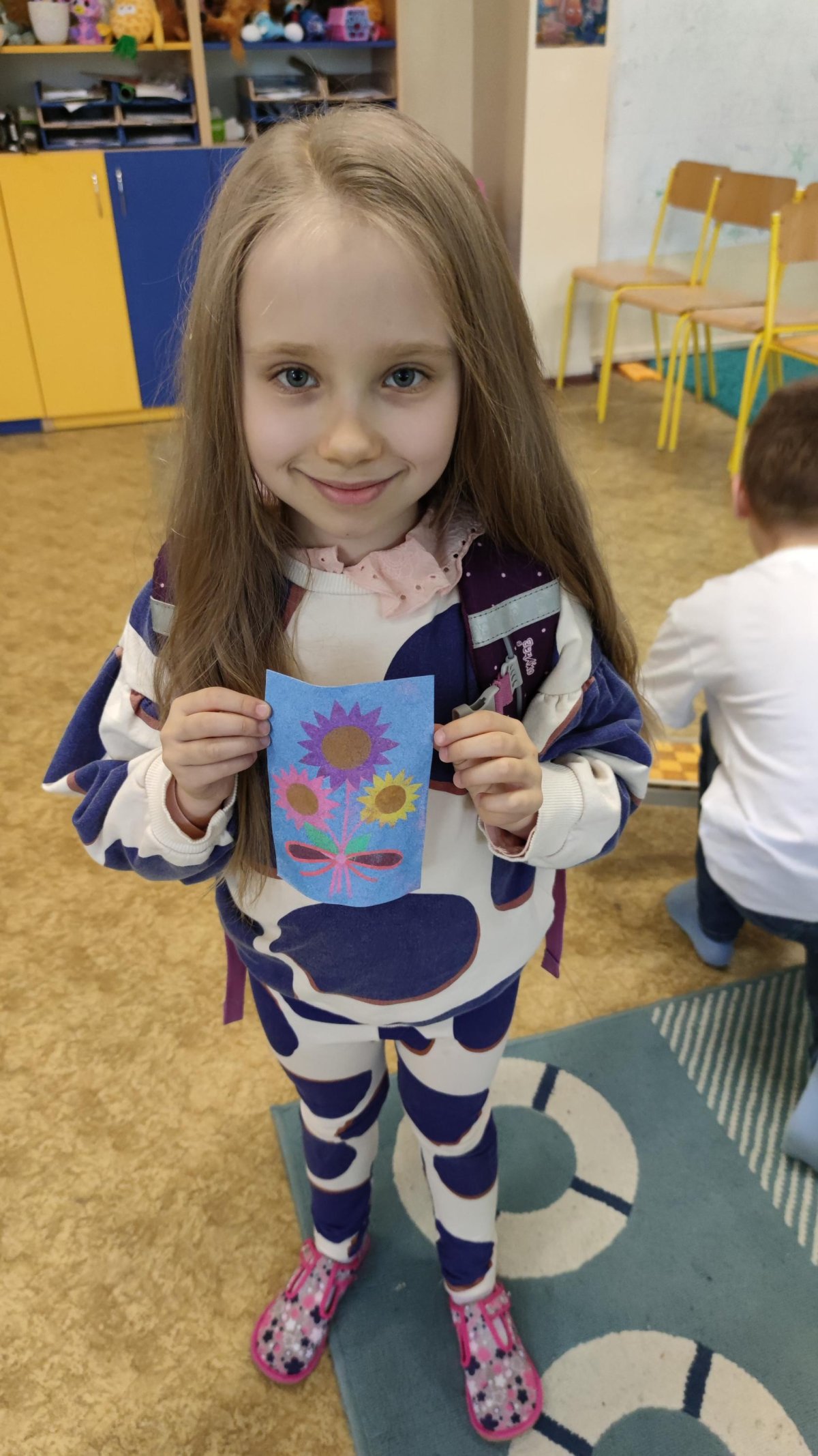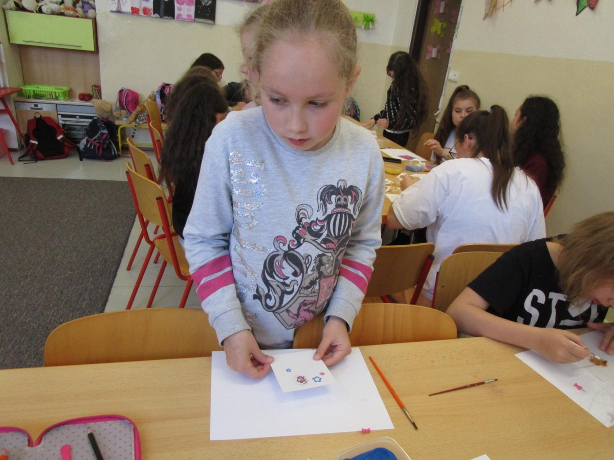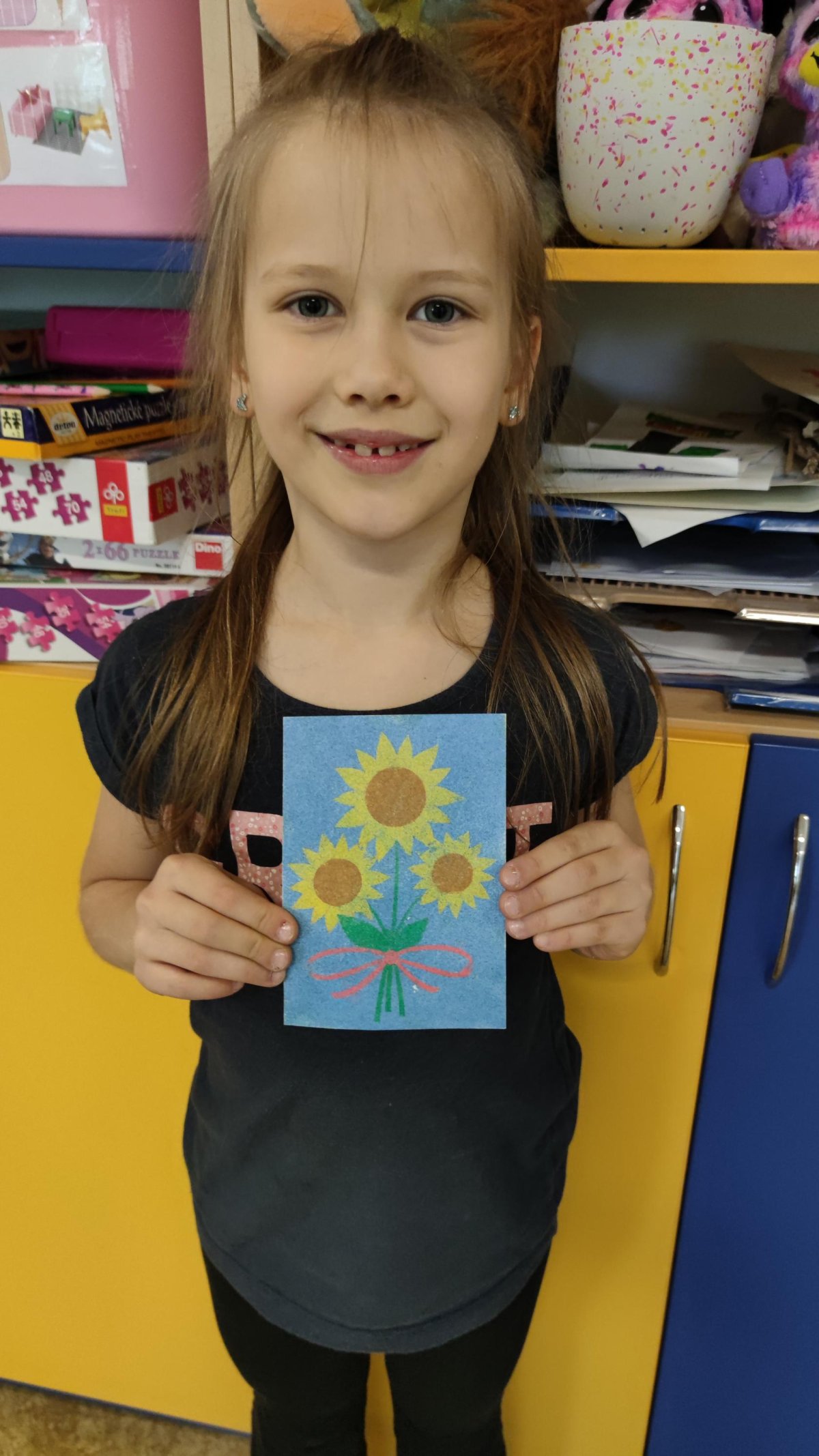 Tvoříme obrázky z barevných písků napříč odděleními... Někde deštníčky, jinde kytičky nebo srdíčka.