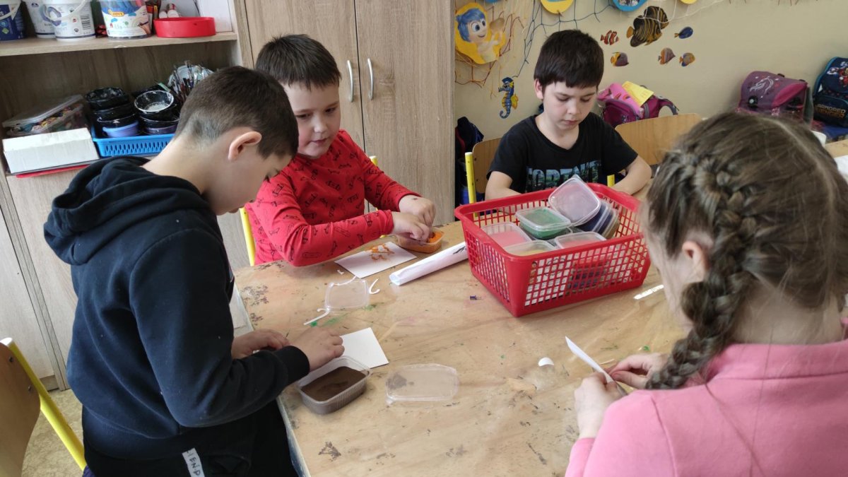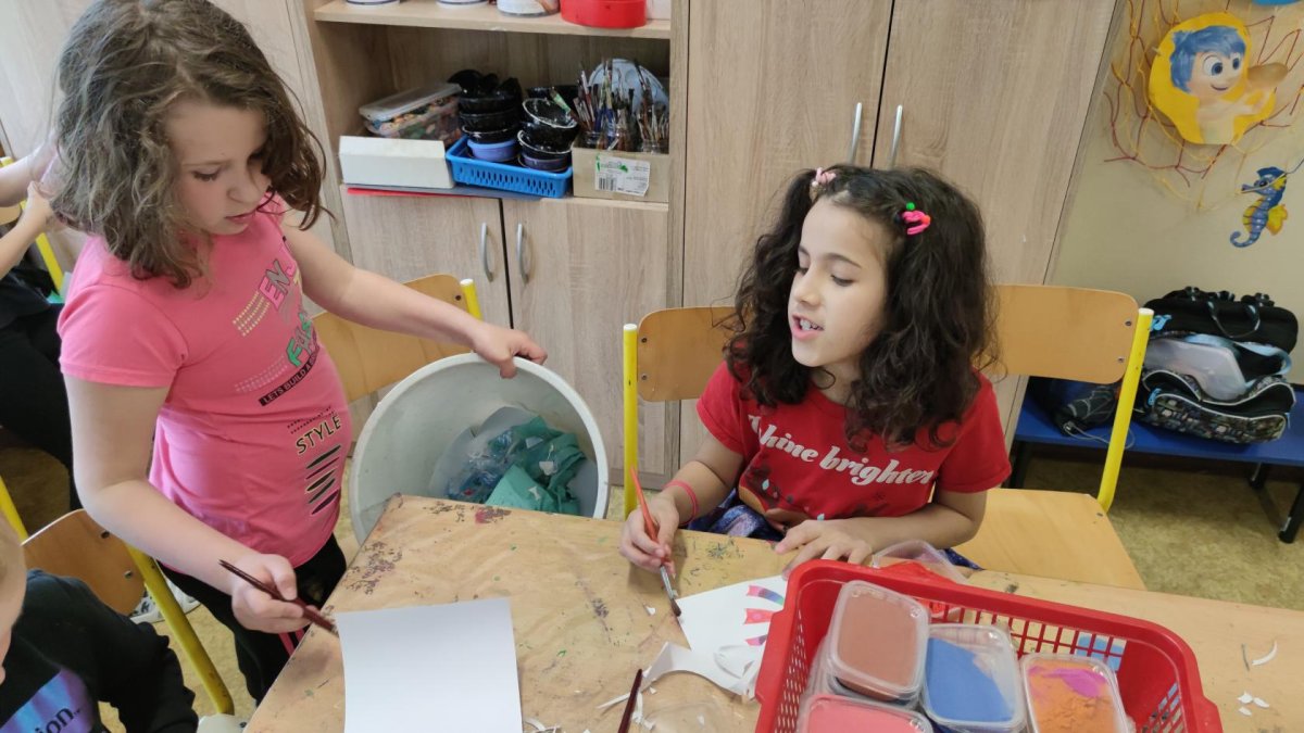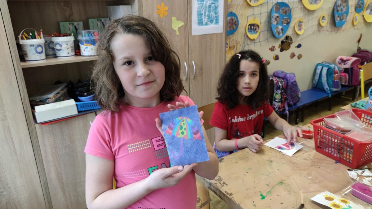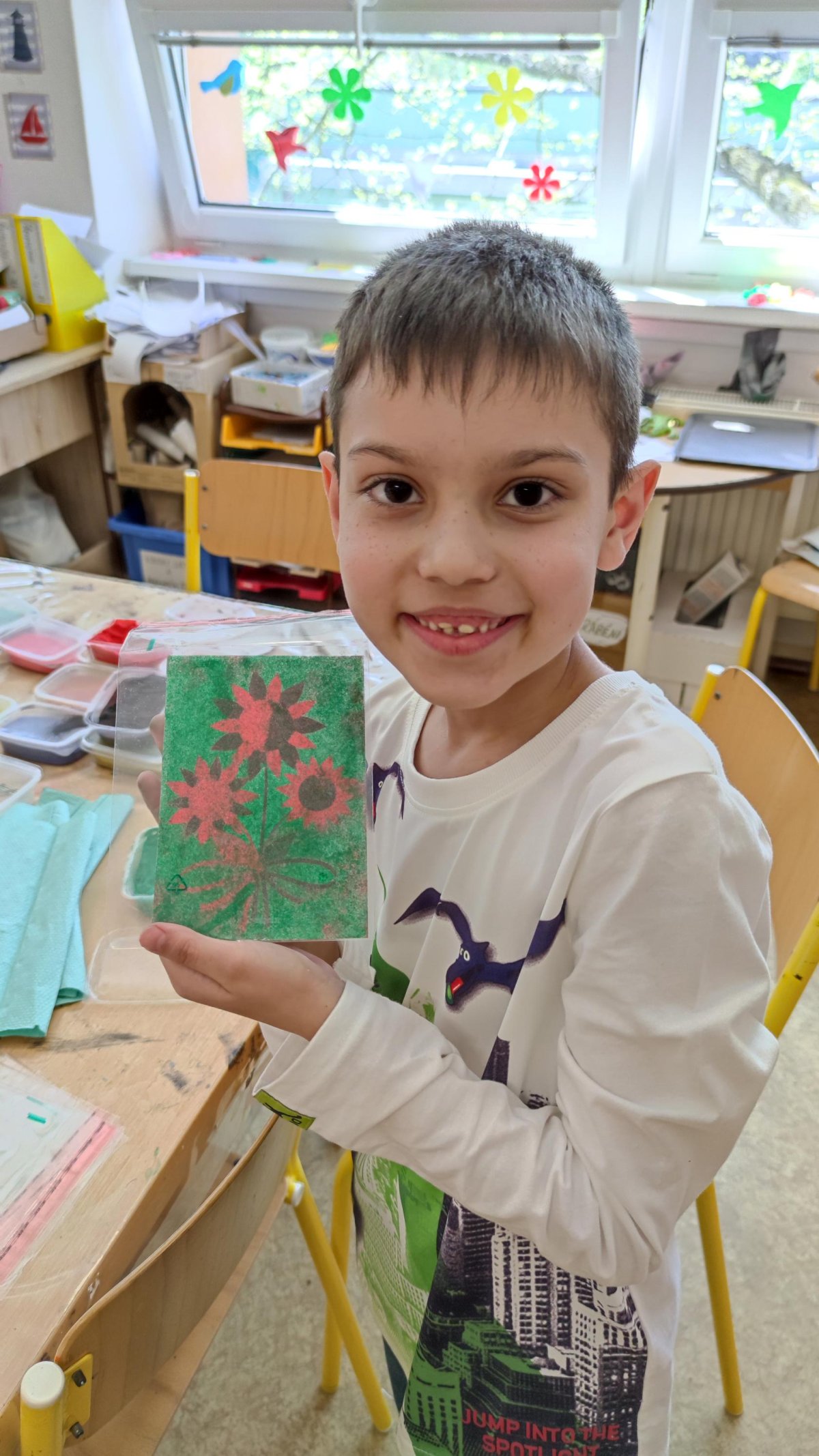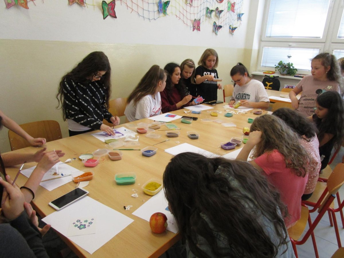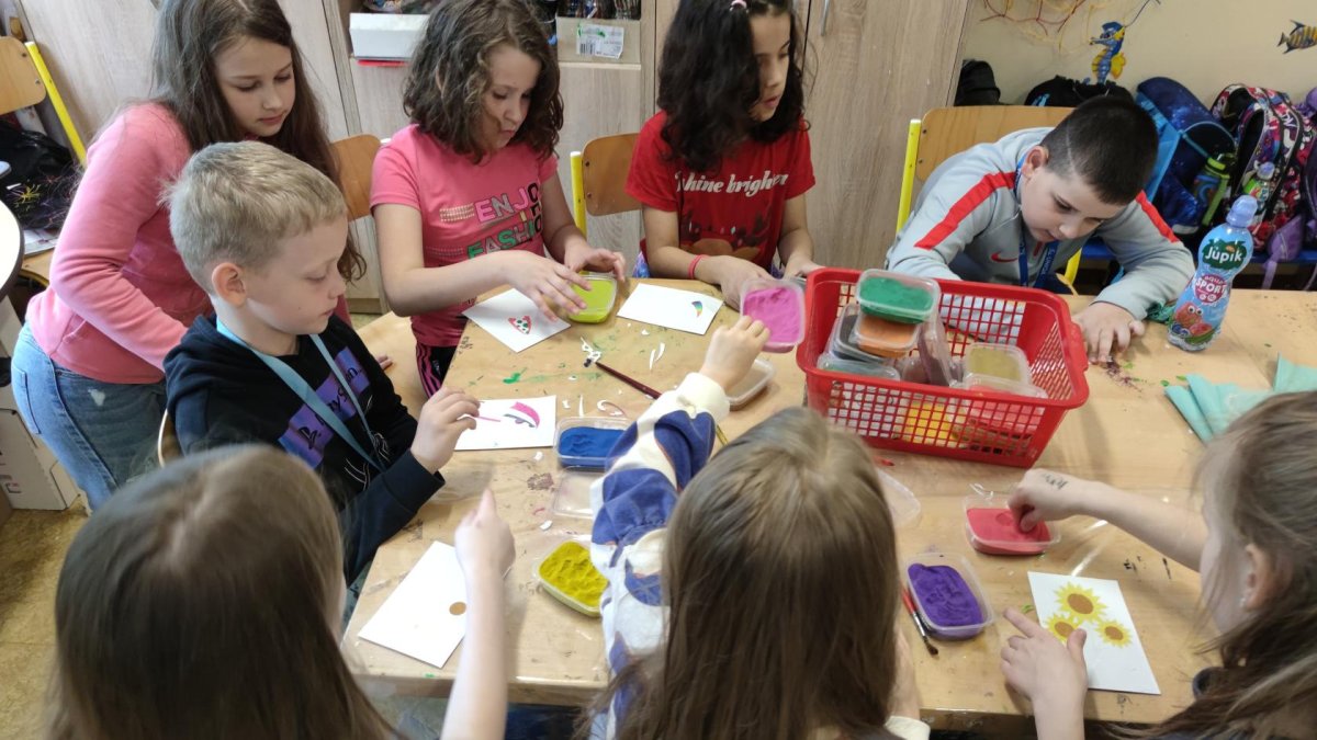 Tvoříme obrázky z barevných písků napříč odděleními... Někde deštníčky, jinde kytičky nebo srdíčka.