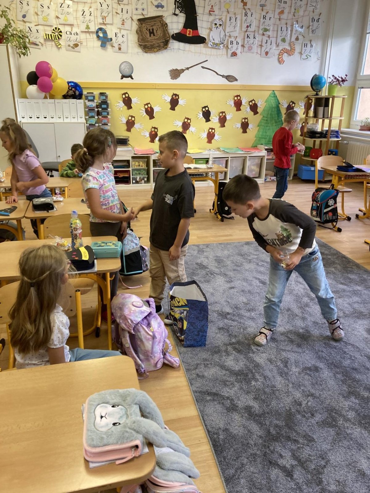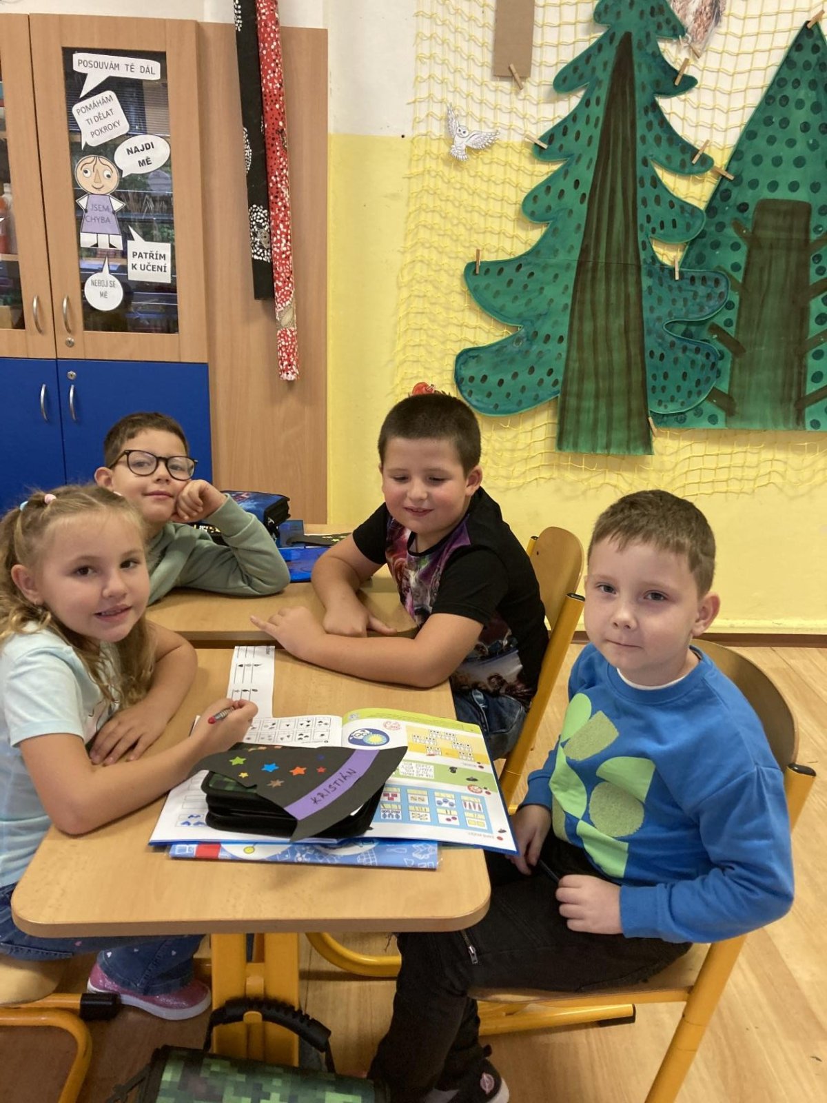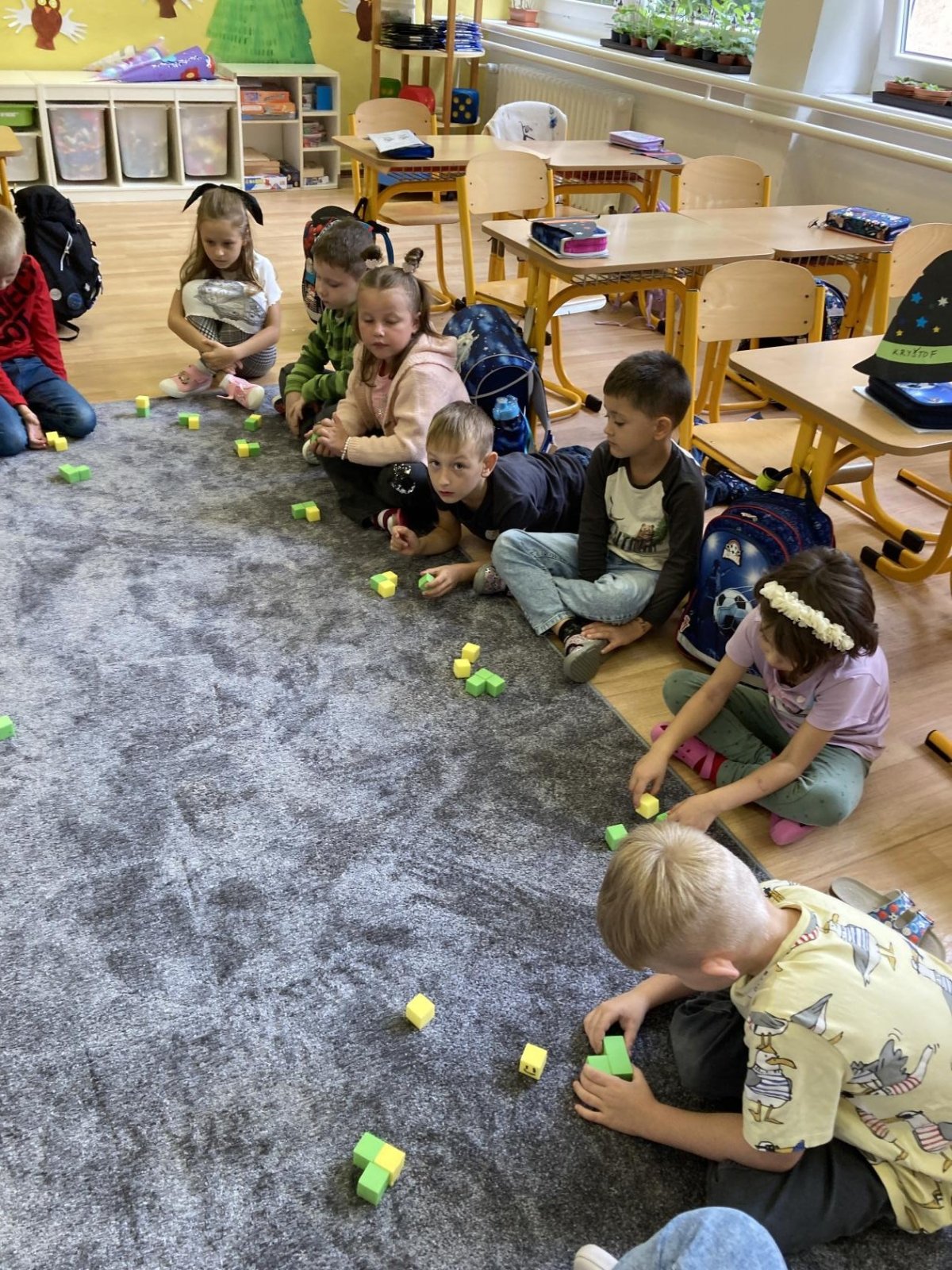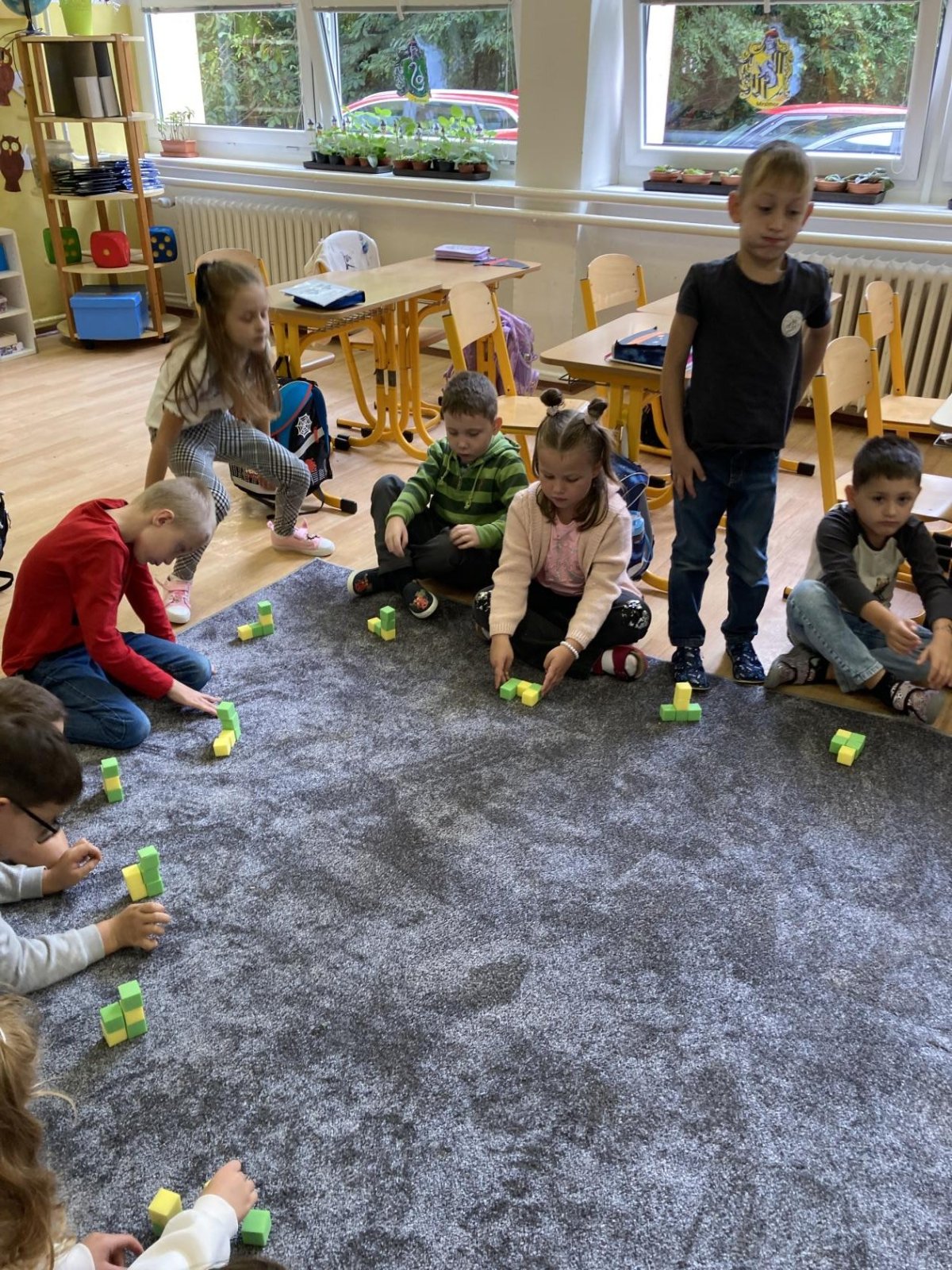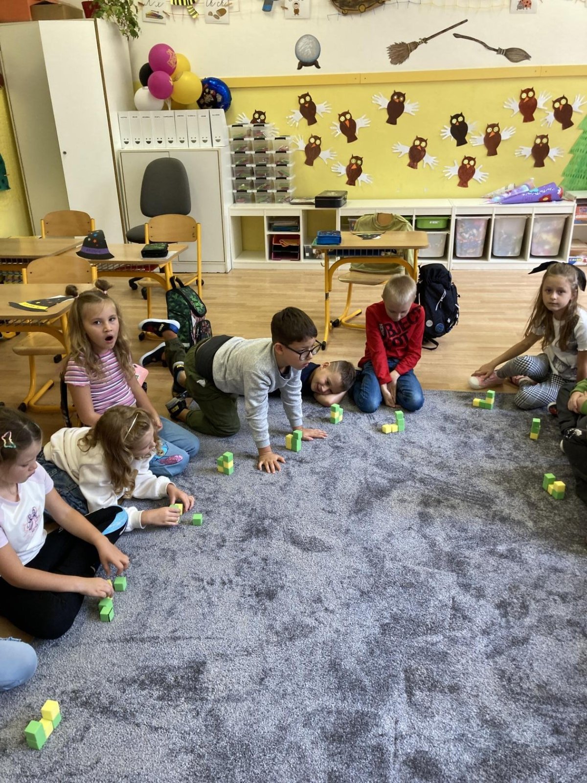 V matematice jsme si vyzkoušeli práci ve skupinkách. Moc jsme si to užili a zjistili jsme, že víc hlav, víc ví :-) Měli jsme první tělocvik, první Učení venku společně s kamarády z 1.A, první stavby z krychlí (na novém koberci) a první výtvarnou výchovu. Na závěr týdne jsme popřáli Filípkovi Szelongovi k narozeninám a dostali jsme od něj sladký balíček. DĚKUJEME!