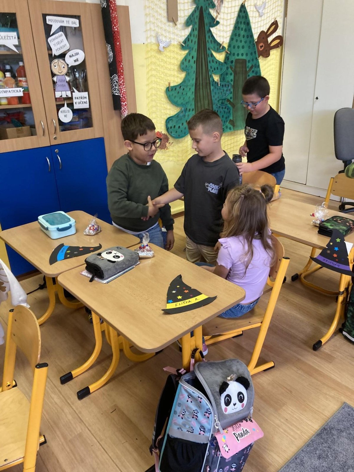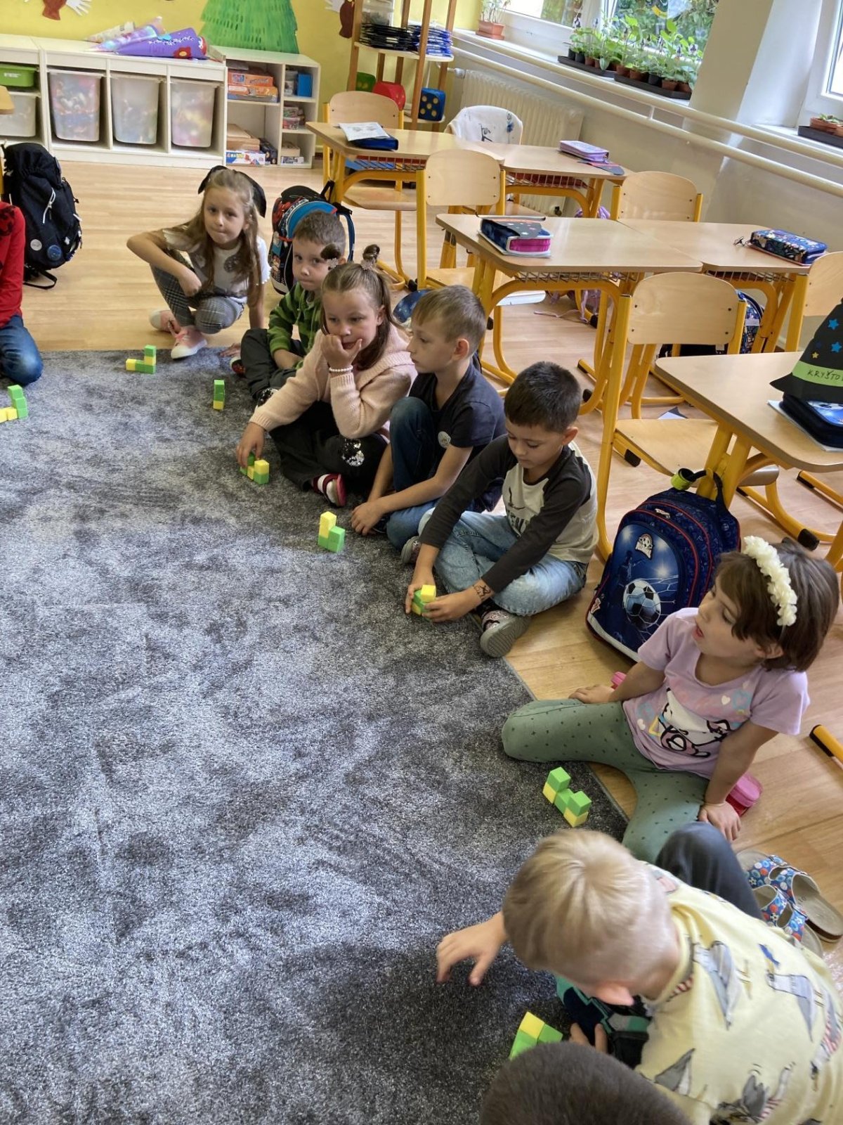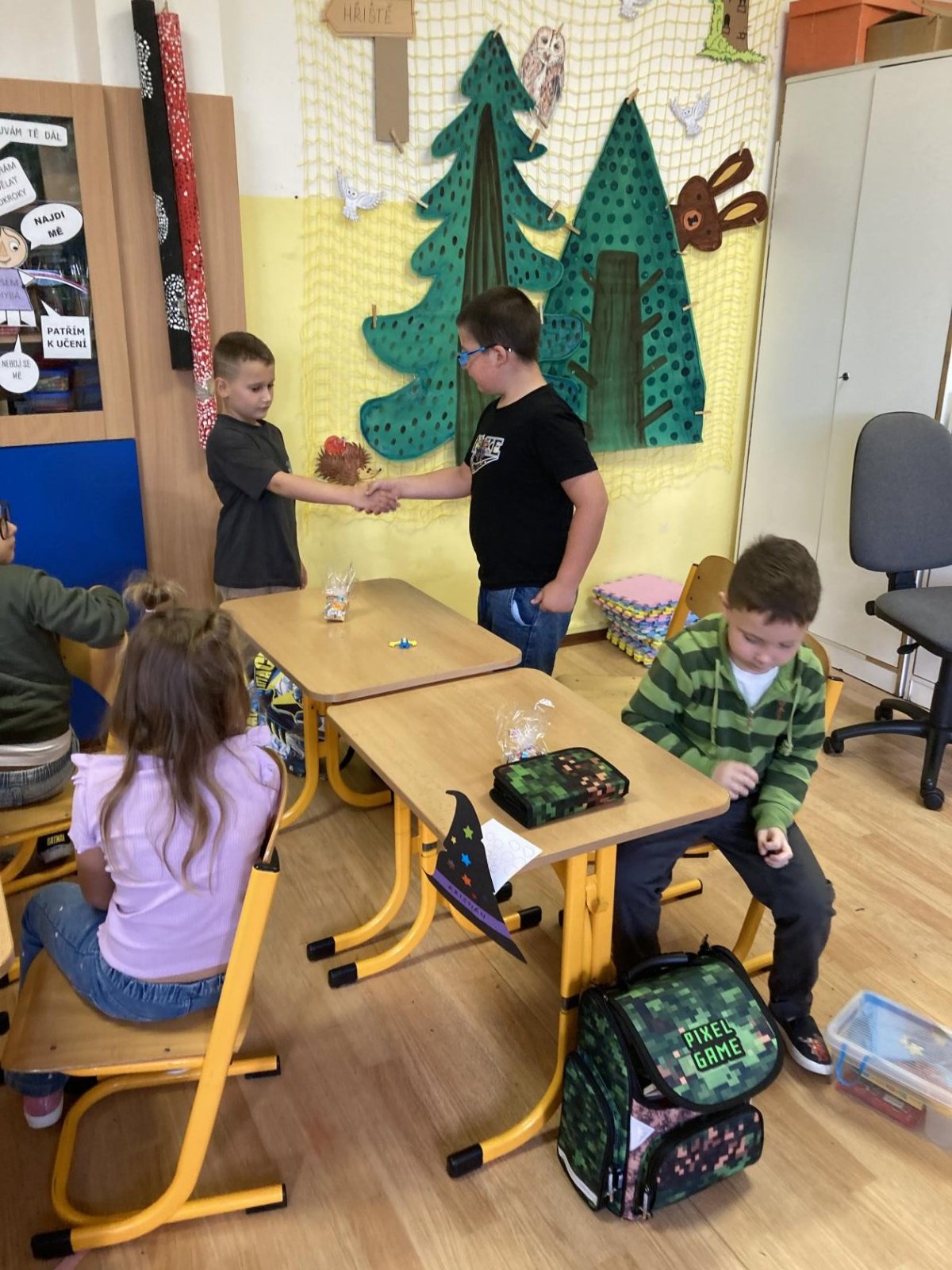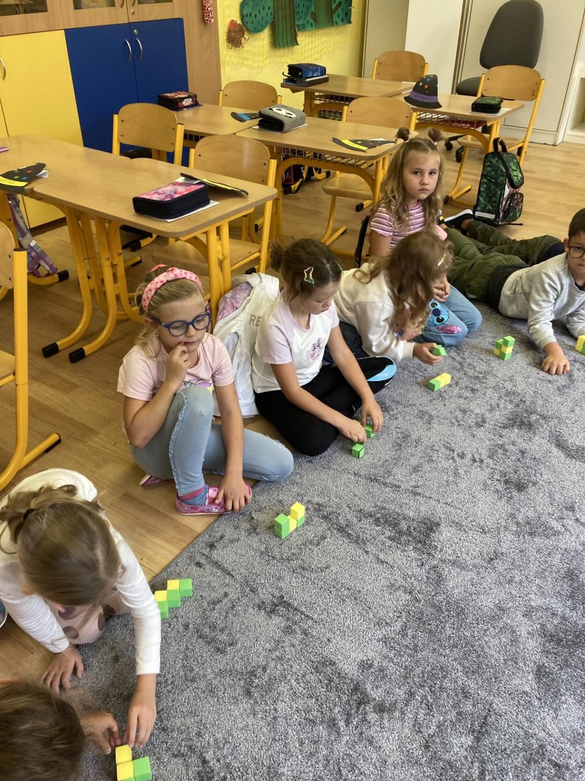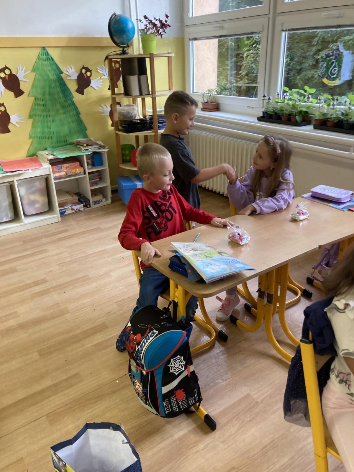 V matematice jsme si vyzkoušeli práci ve skupinkách. Moc jsme si to užili a zjistili jsme, že víc hlav, víc ví :-) Měli jsme první tělocvik, první Učení venku společně s kamarády z 1.A, první stavby z krychlí (na novém koberci) a první výtvarnou výchovu. Na závěr týdne jsme popřáli Filípkovi Szelongovi k narozeninám a dostali jsme od něj sladký balíček. DĚKUJEME!