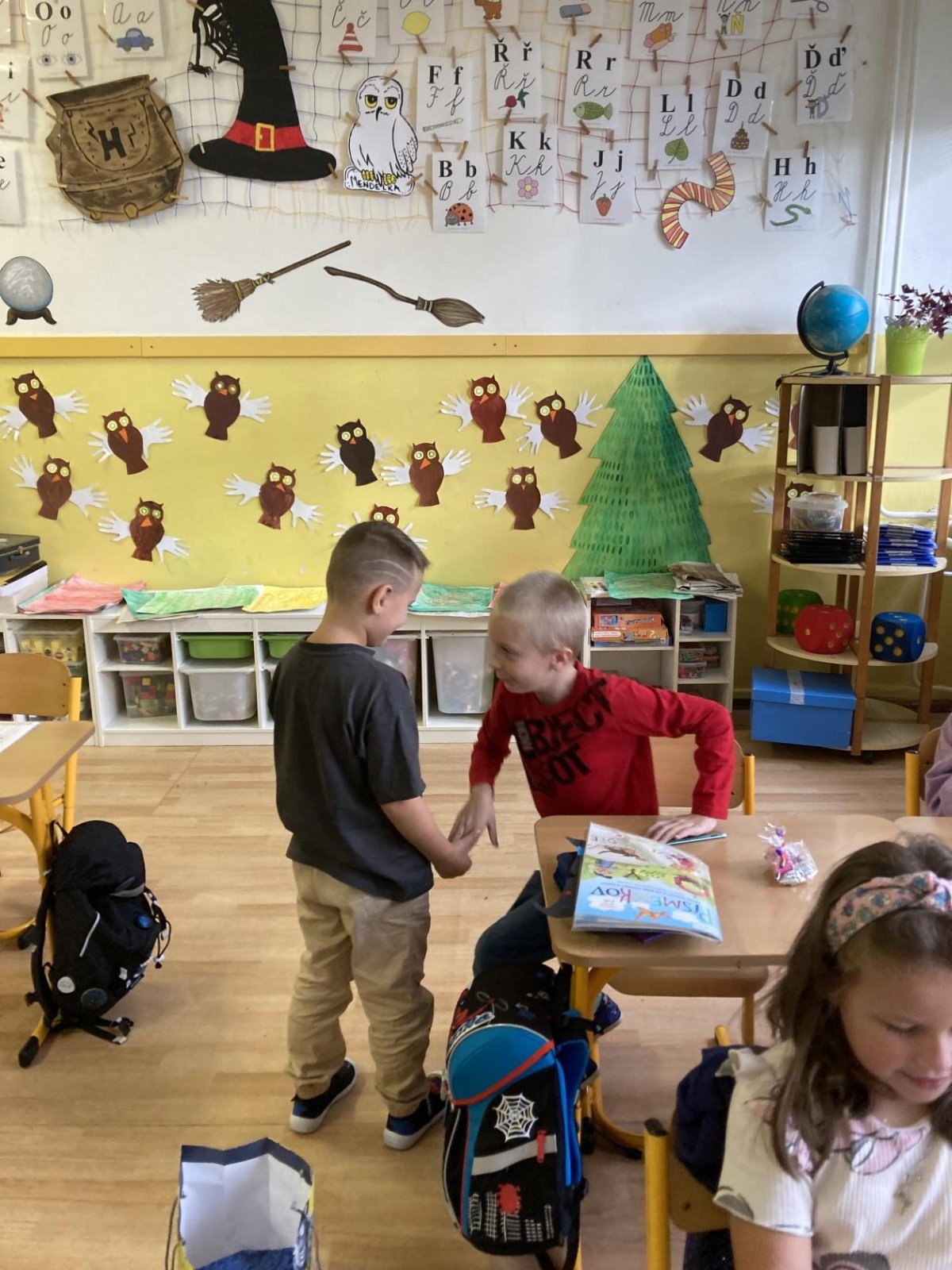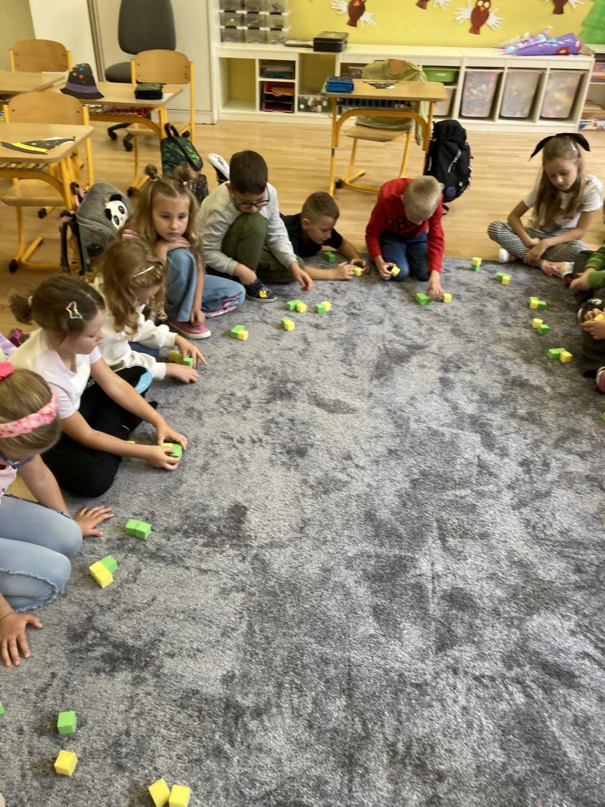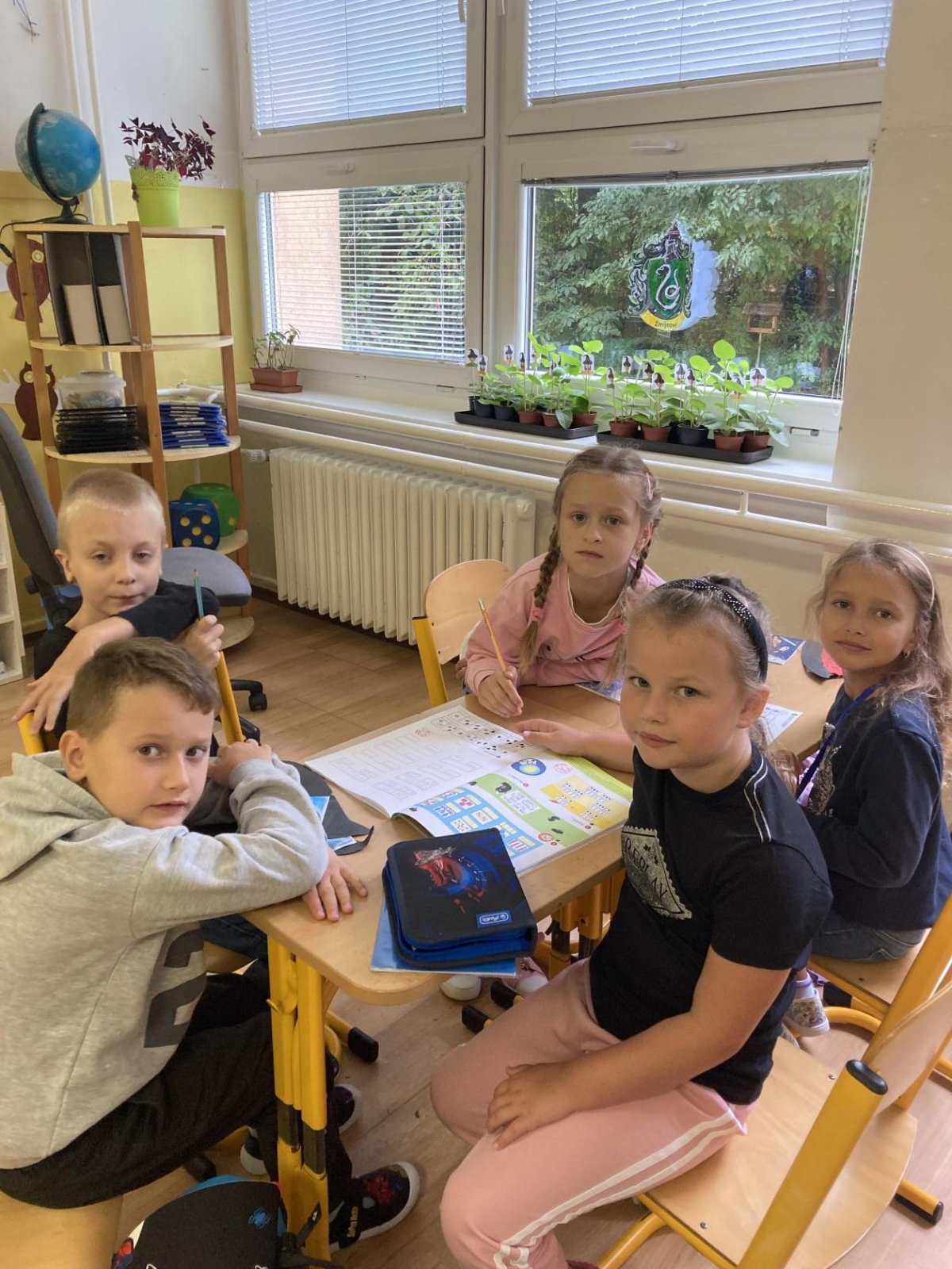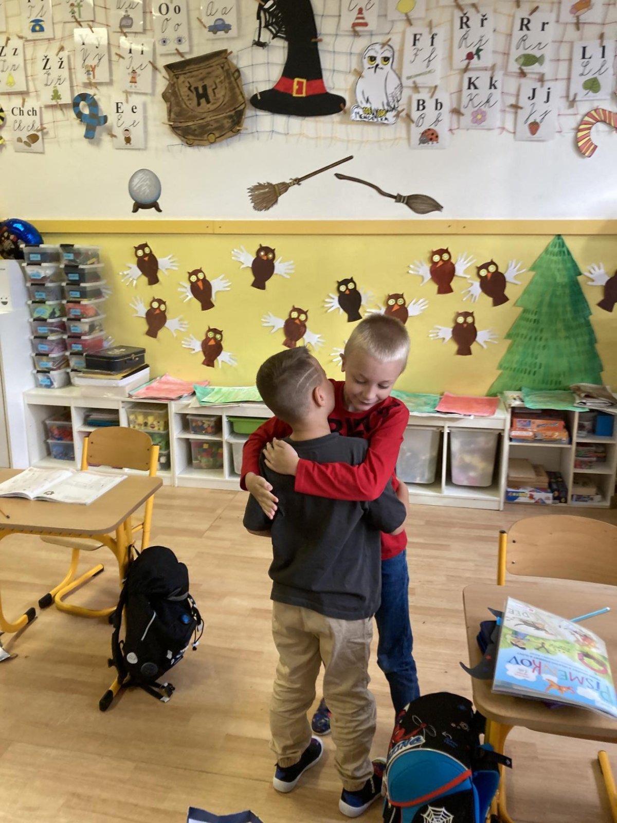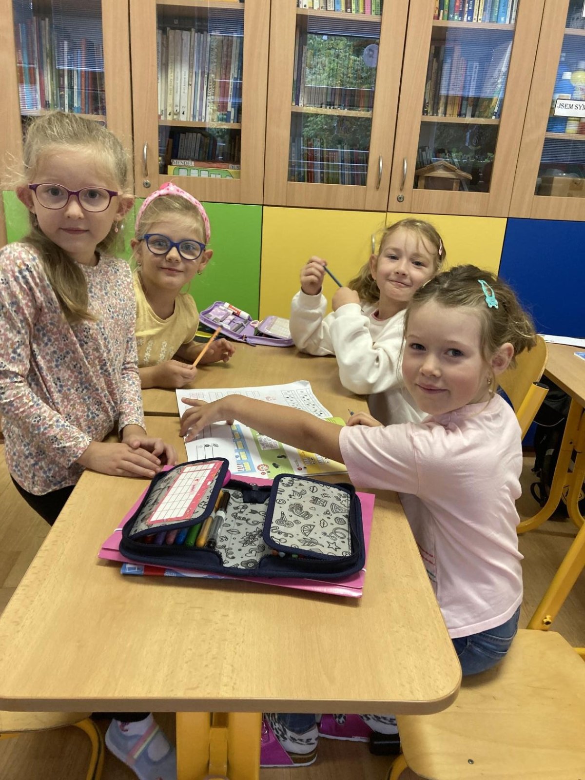 V matematice jsme si vyzkoušeli práci ve skupinkách. Moc jsme si to užili a zjistili jsme, že víc hlav, víc ví :-) Měli jsme první tělocvik, první Učení venku společně s kamarády z 1.A, první stavby z krychlí (na novém koberci) a první výtvarnou výchovu. Na závěr týdne jsme popřáli Filípkovi Szelongovi k narozeninám a dostali jsme od něj sladký balíček. DĚKUJEME!