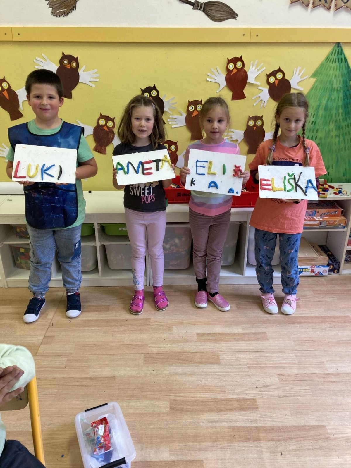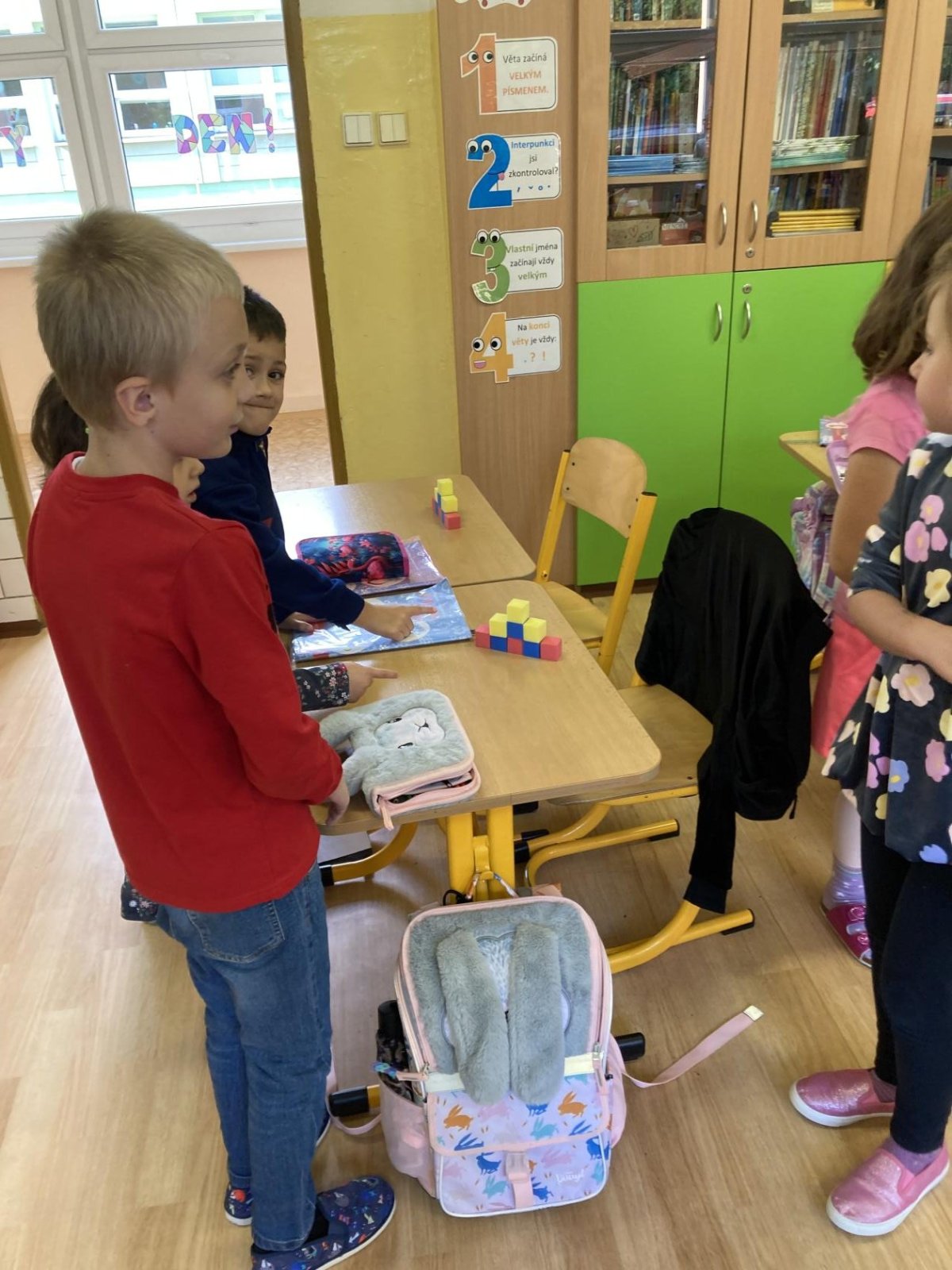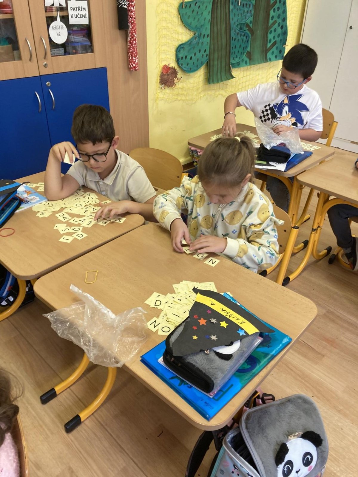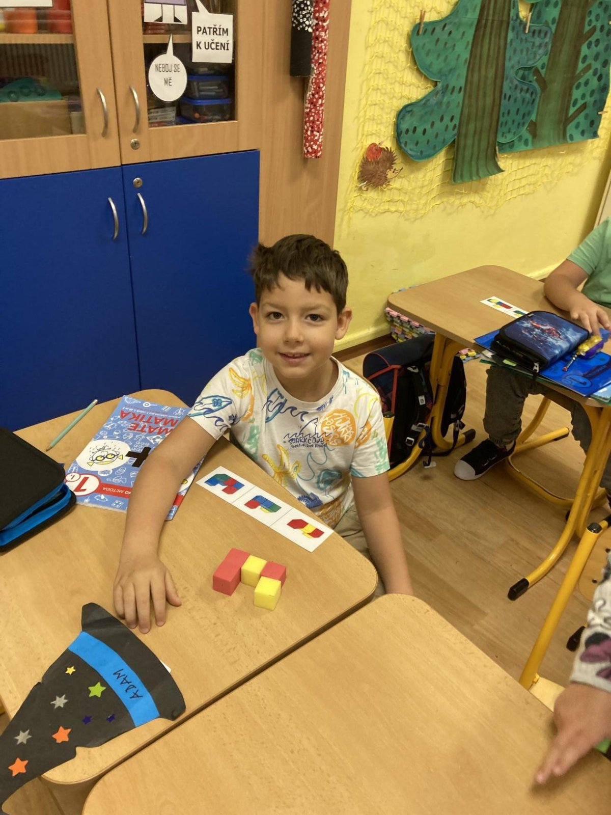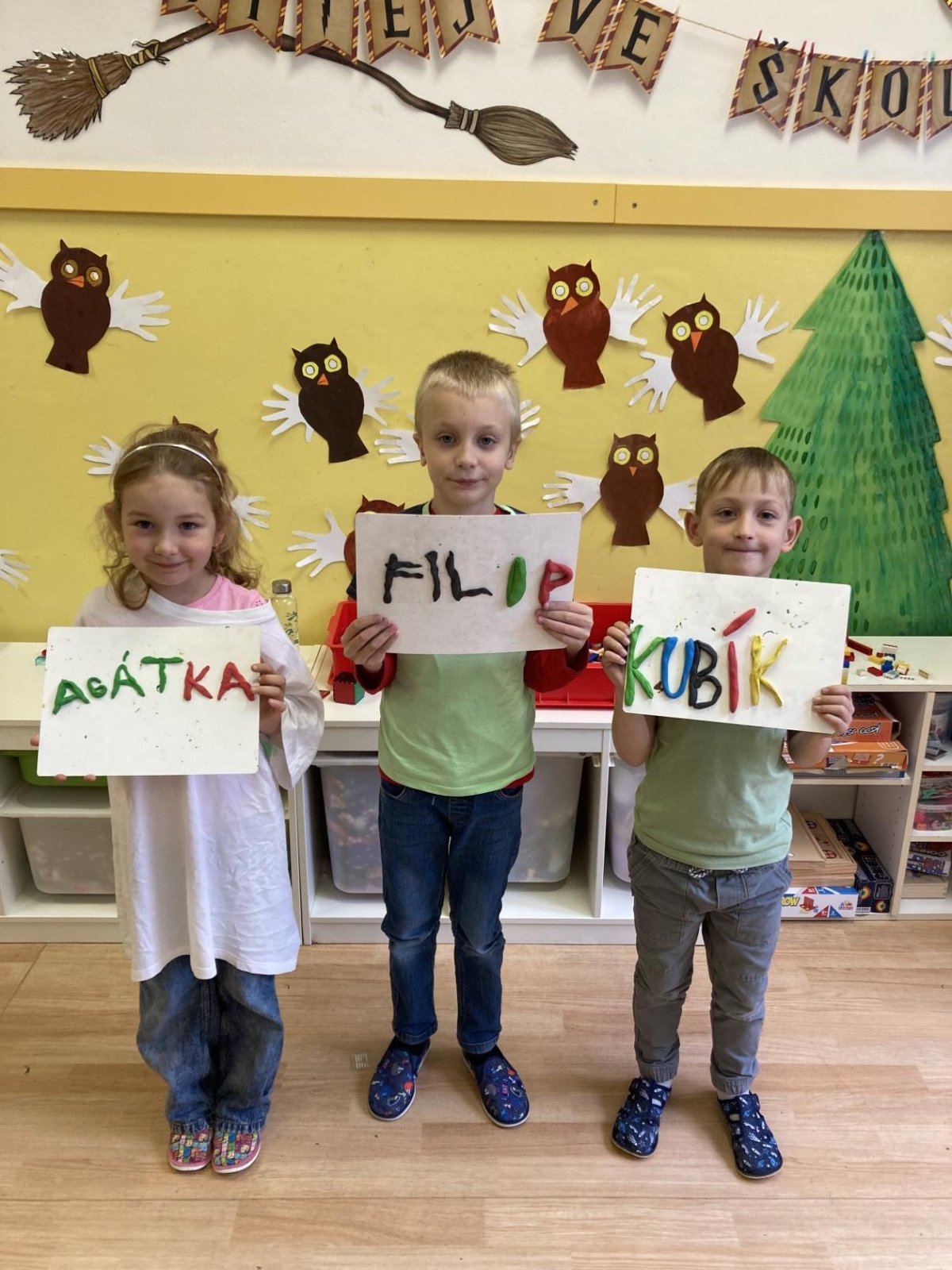 Tvořili jsme slova a jména z plastelíny i z písmenek, skládali jsme probraná písmenka z přezůvek, stavěli krychlové stavby podle plánu, užili si tělocvik místo Učení venku, ochutnávali ovoce a zeleninu a mnoho dalšího ...