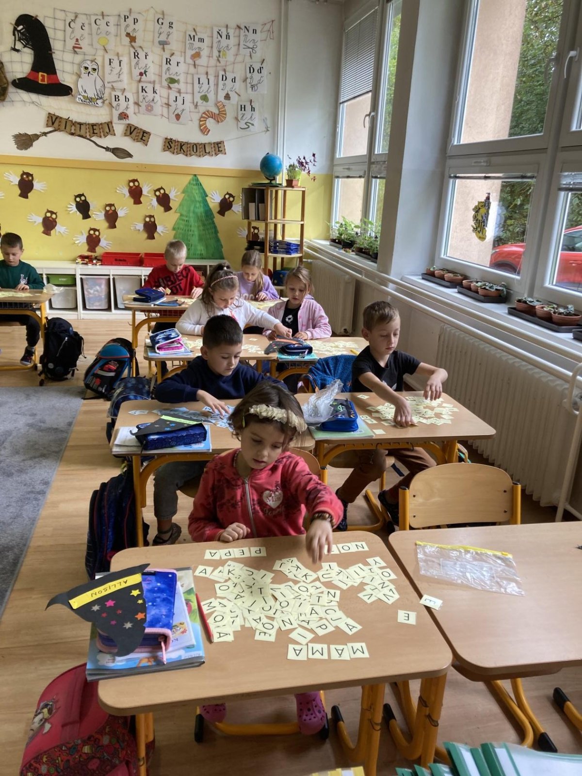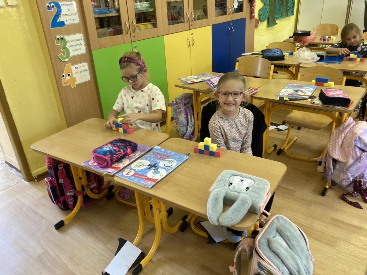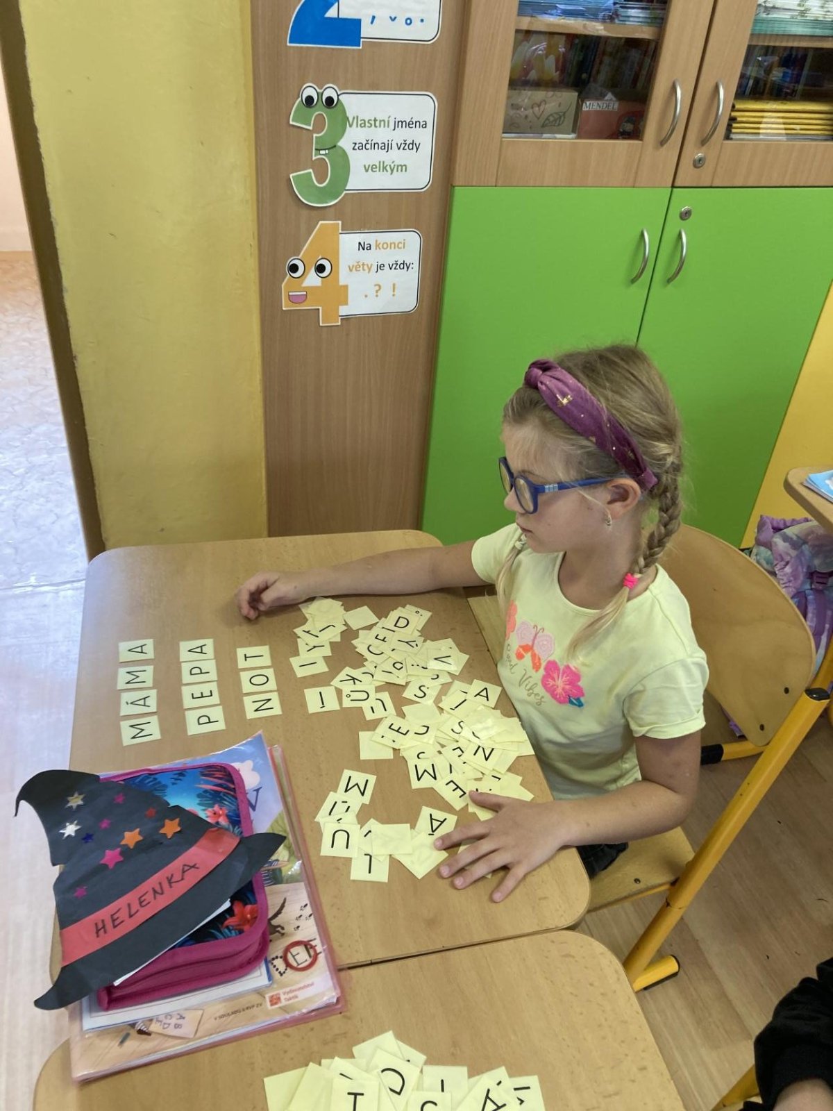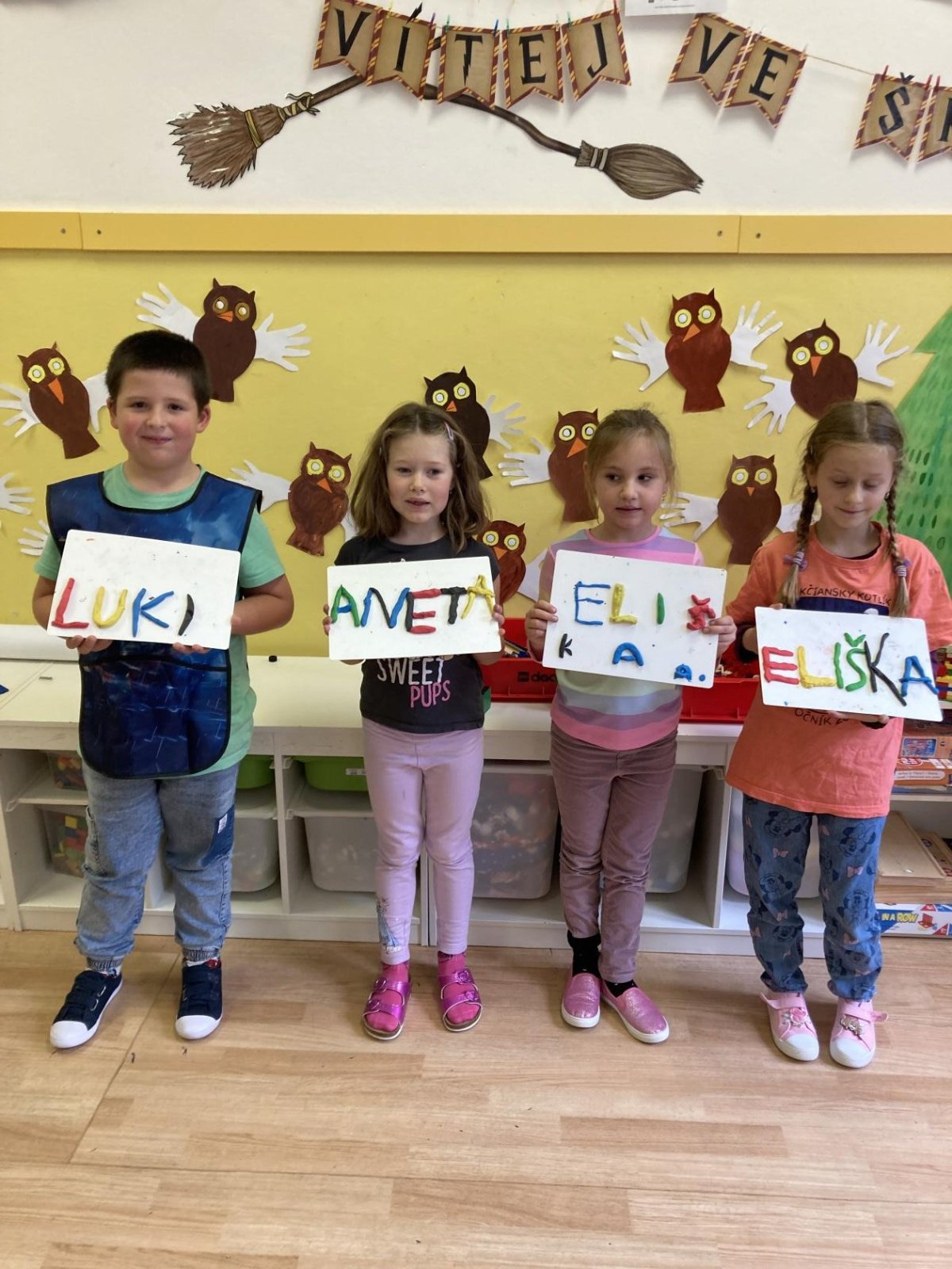 Tvořili jsme slova a jména z plastelíny i z písmenek, skládali jsme probraná písmenka z přezůvek, stavěli krychlové stavby podle plánu, užili si tělocvik místo Učení venku, ochutnávali ovoce a zeleninu a mnoho dalšího ...
