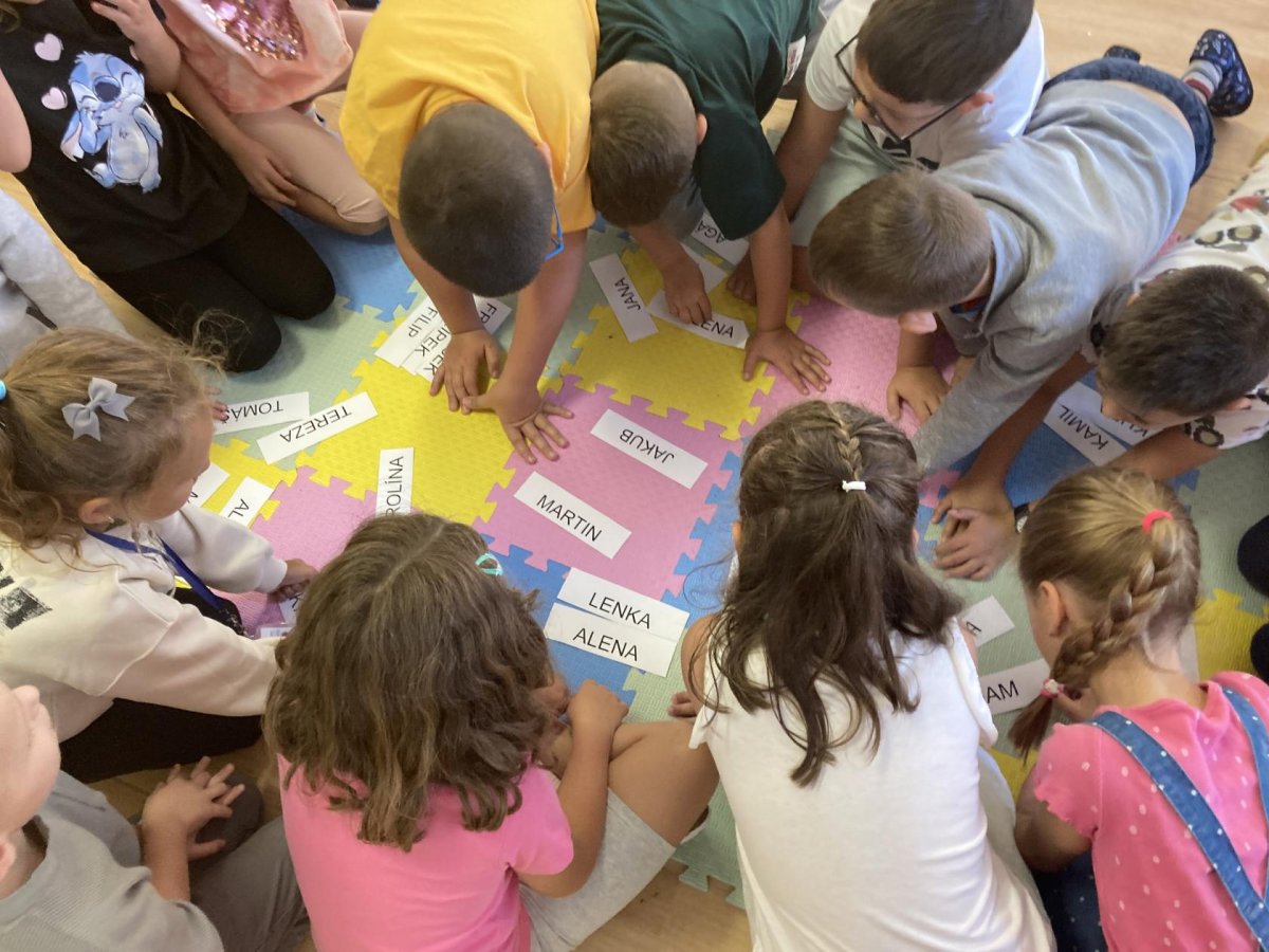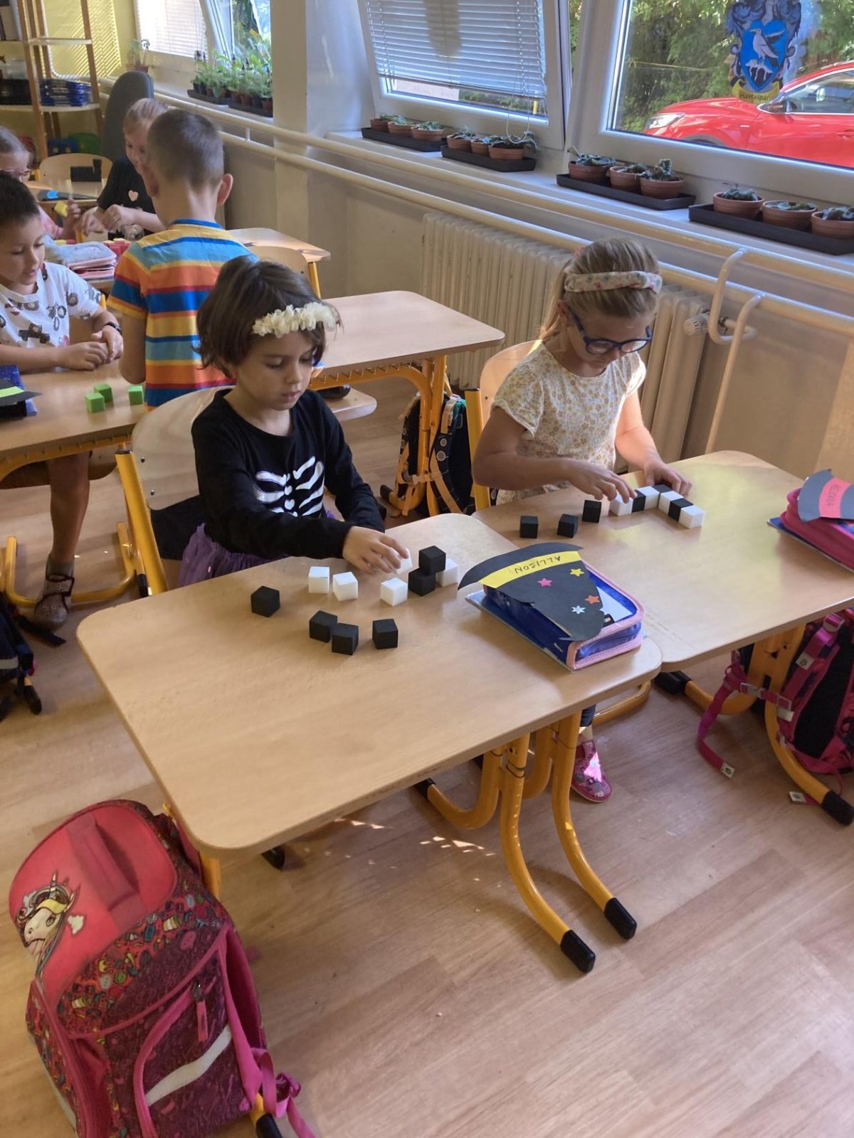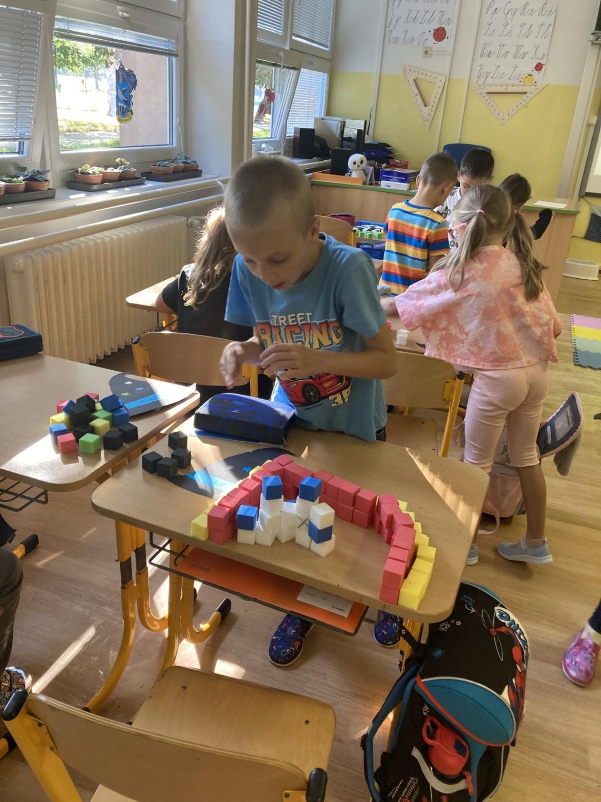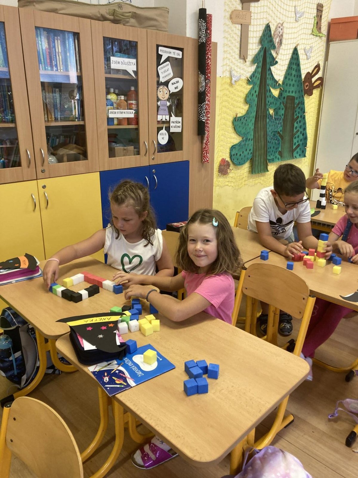 Hledáme své jméno, určujeme první hlásku, pátráme, kdo má s námi na začátku jména stejnou hlásku. Stavíme z krychlí.