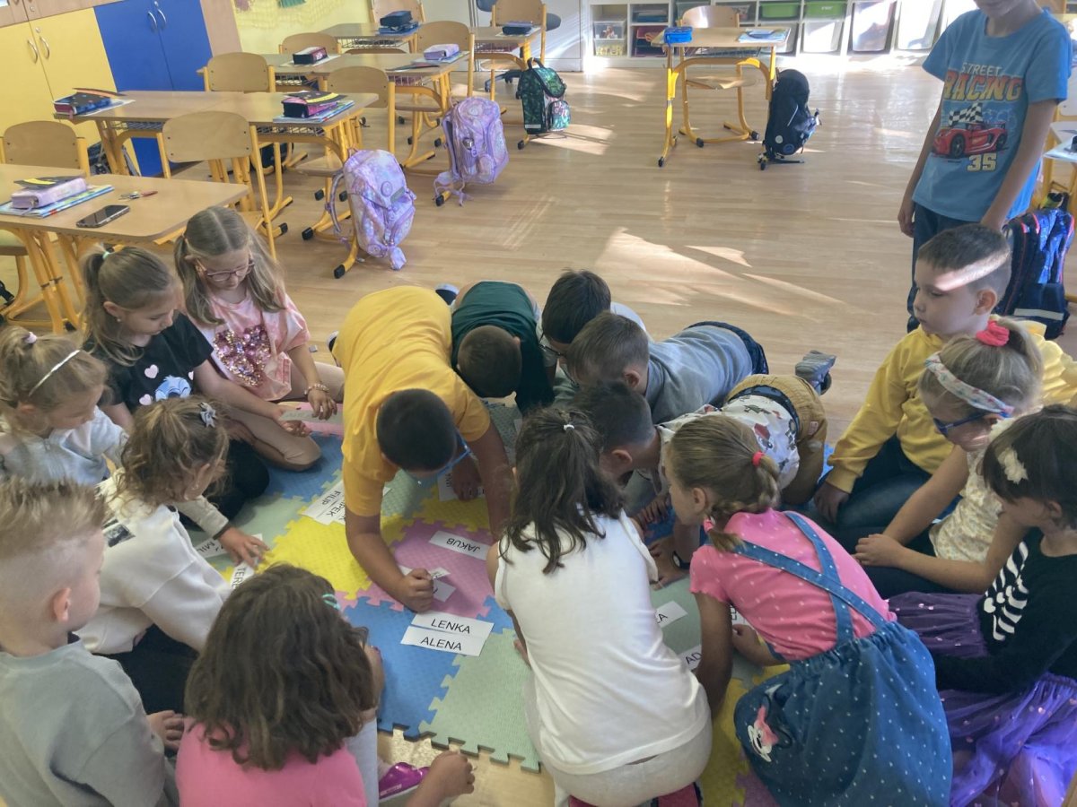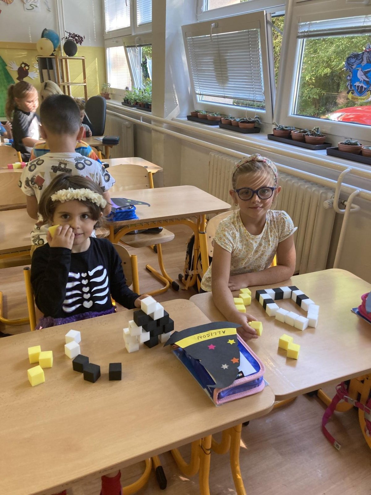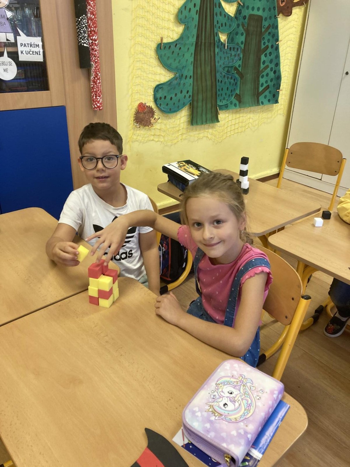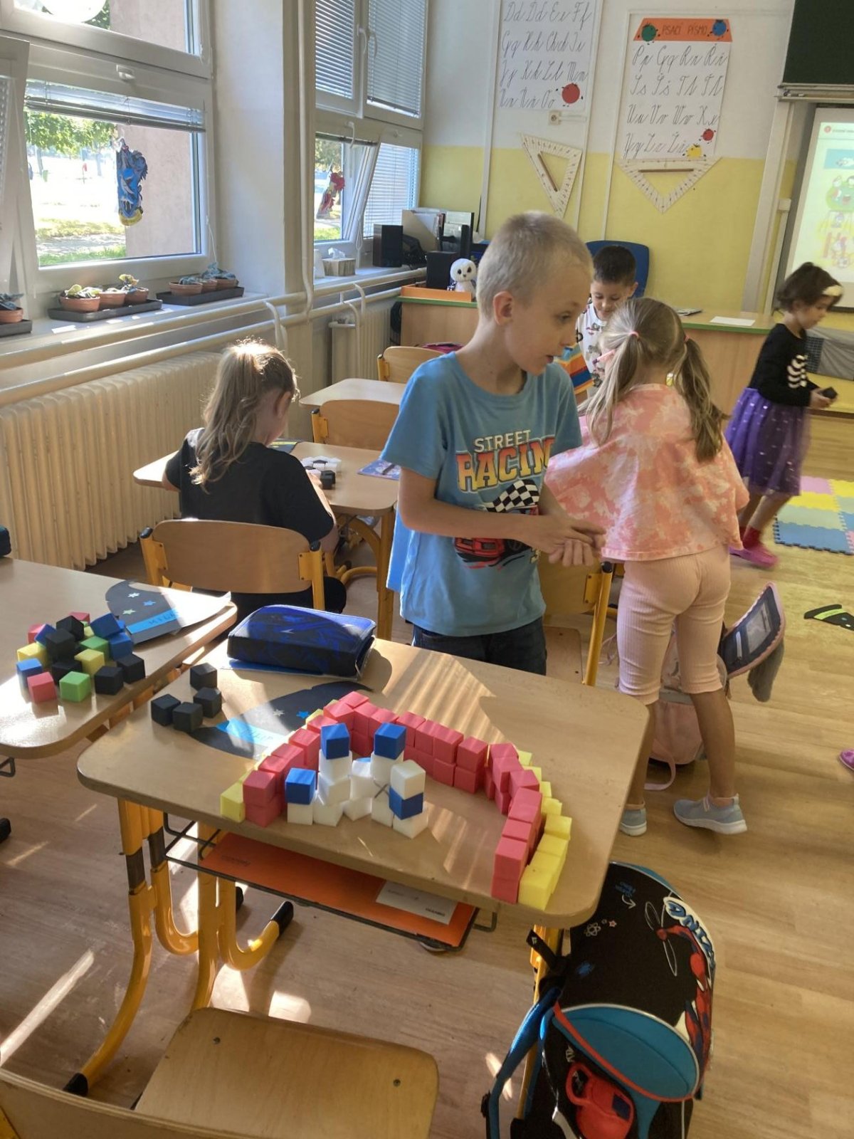 Hledáme své jméno, určujeme první hlásku, pátráme, kdo má s námi na začátku jména stejnou hlásku. Stavíme z krychlí.