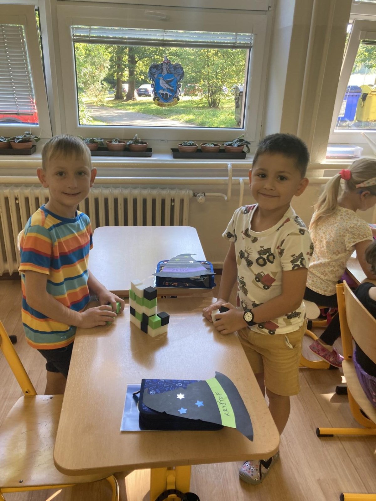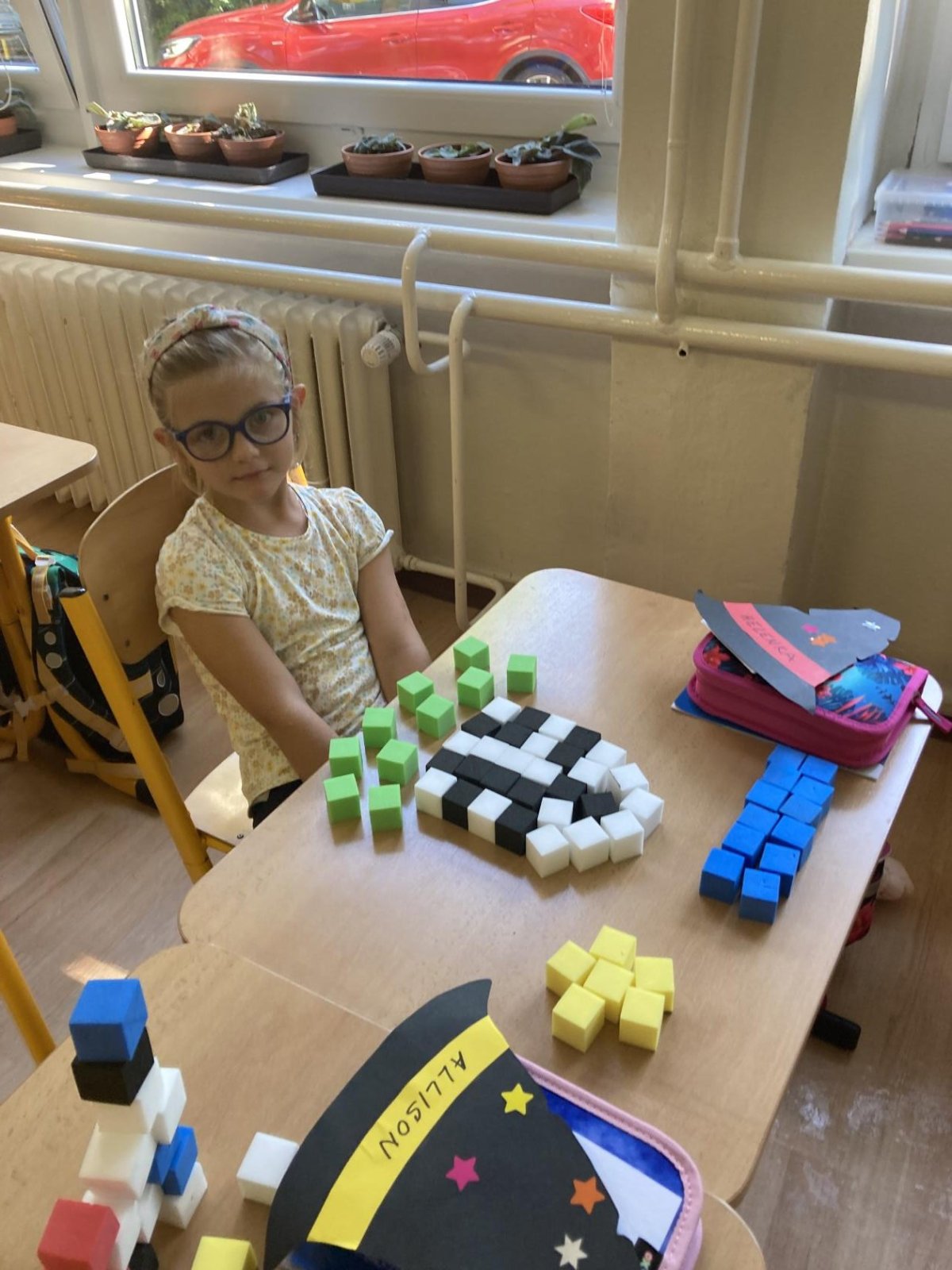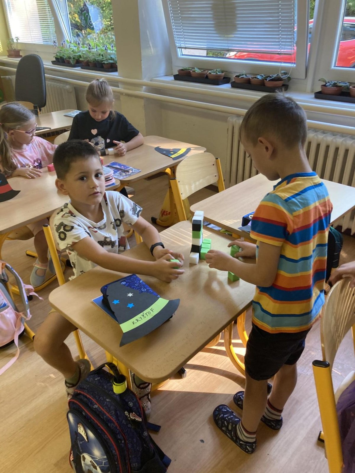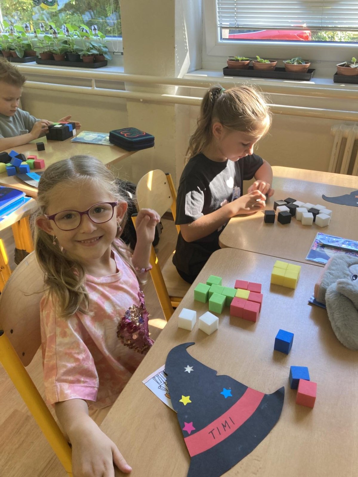 Hledáme své jméno, určujeme první hlásku, pátráme, kdo má s námi na začátku jména stejnou hlásku. Stavíme z krychlí.