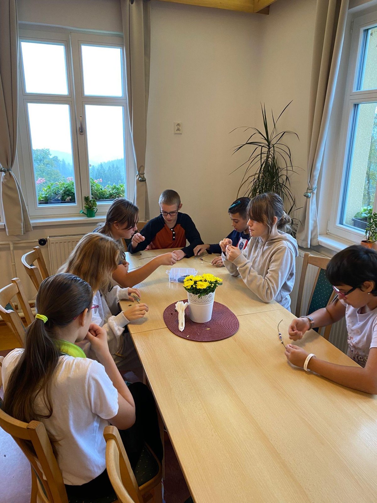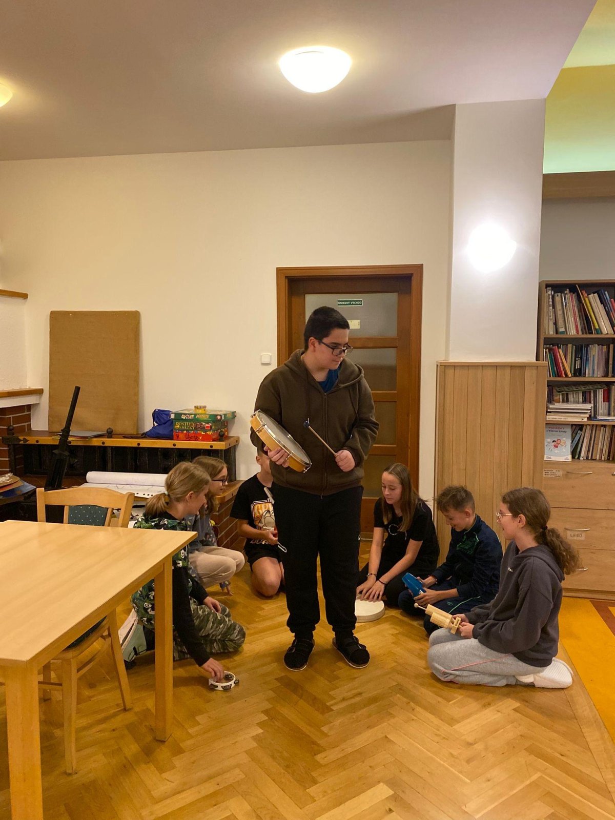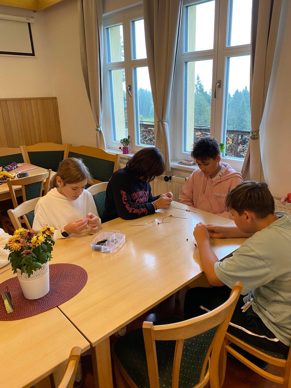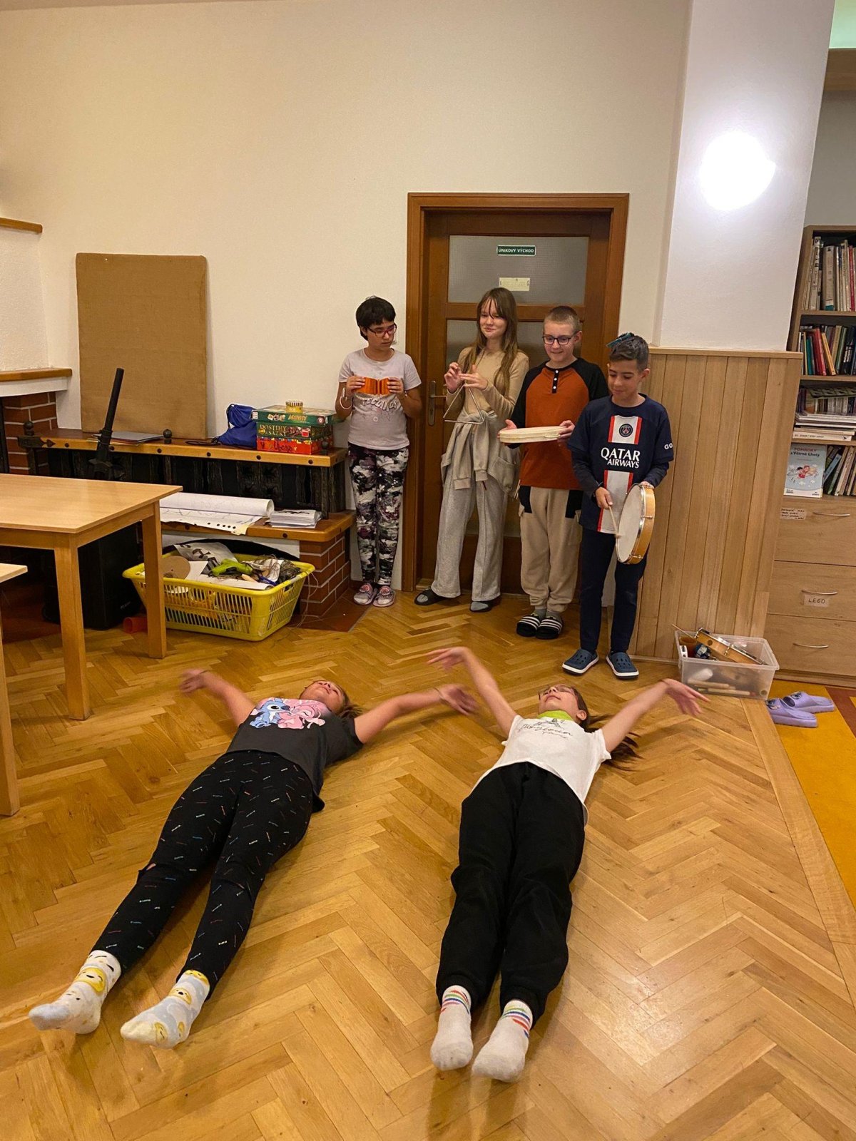 Dopoledne jsme se vrhli do tvorby rituálních tanců a pokřiků pro naše živly. Pomohly nám k tomu i hudební nástroje, které dodaly rytmus a energii. Poté jsme si vyráběli náramky, kde každá barva korálku symbolizovala jeden živel – oheň, vodu, zemi a vzduch. Příjemným zpestřením dopoledne byla i pohybová hra Twister, u které jsme se hodně nasmáli a všichni ji zvládli na jedničku.