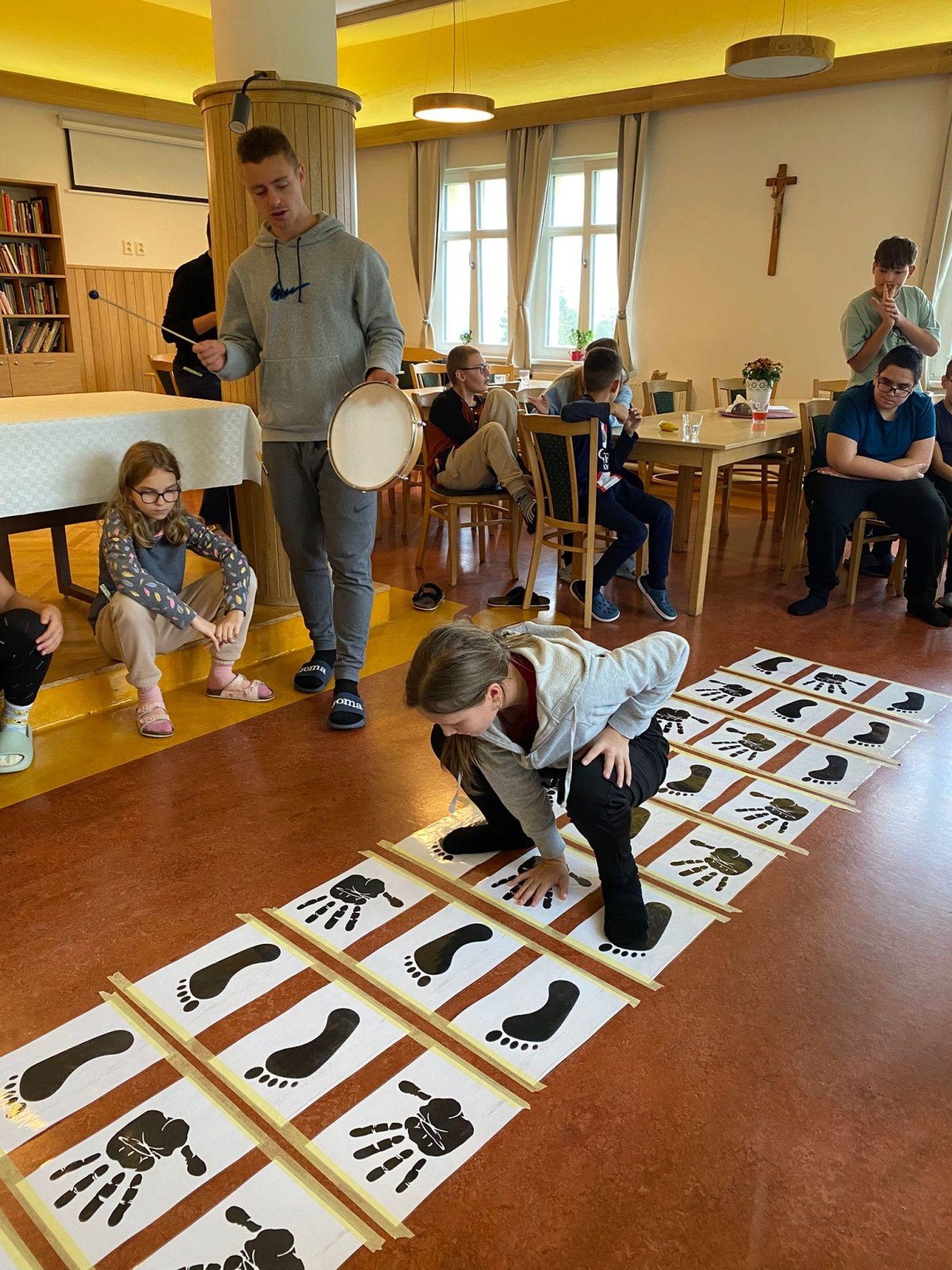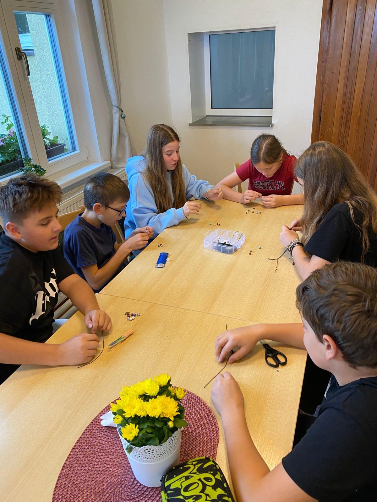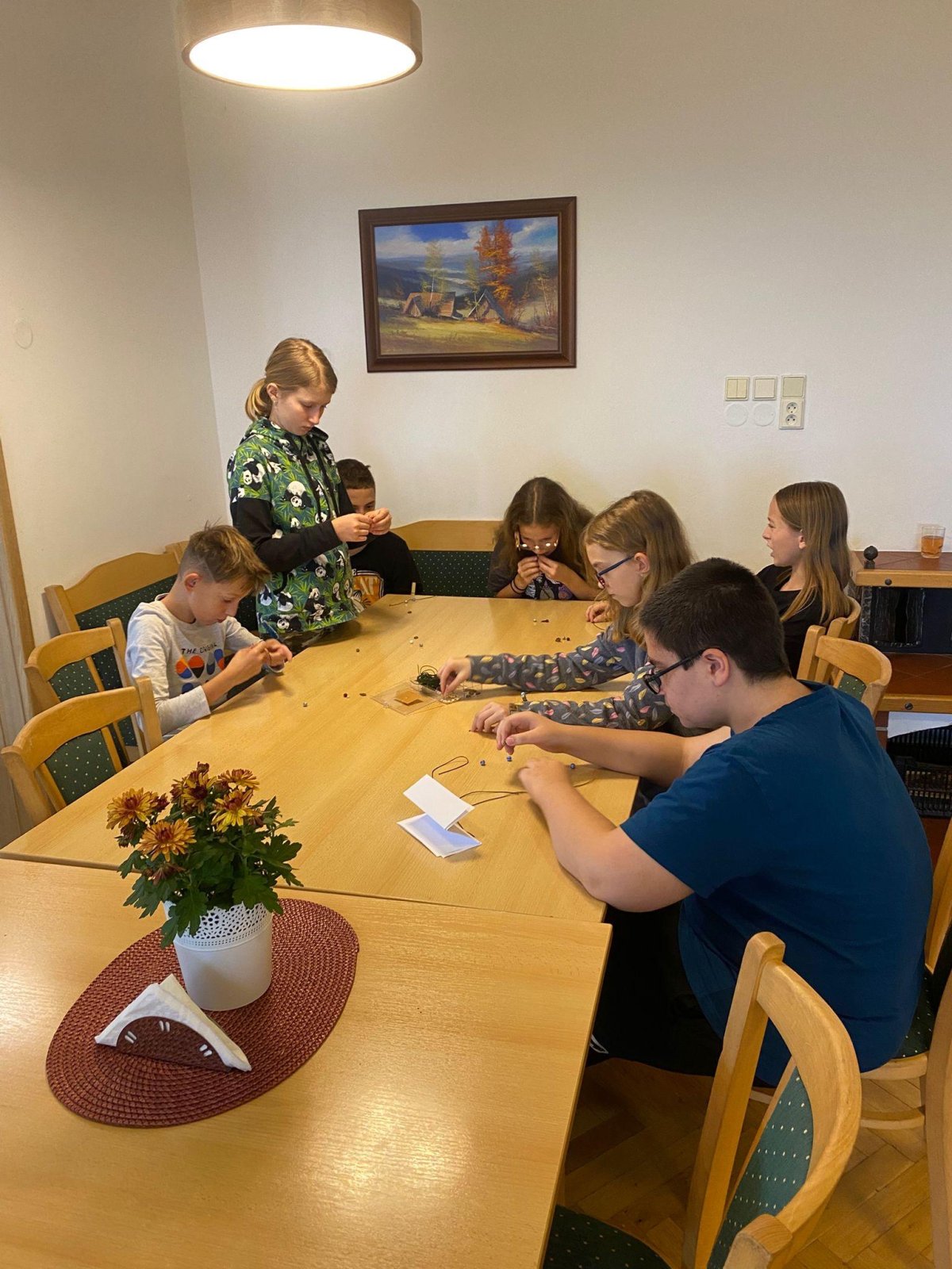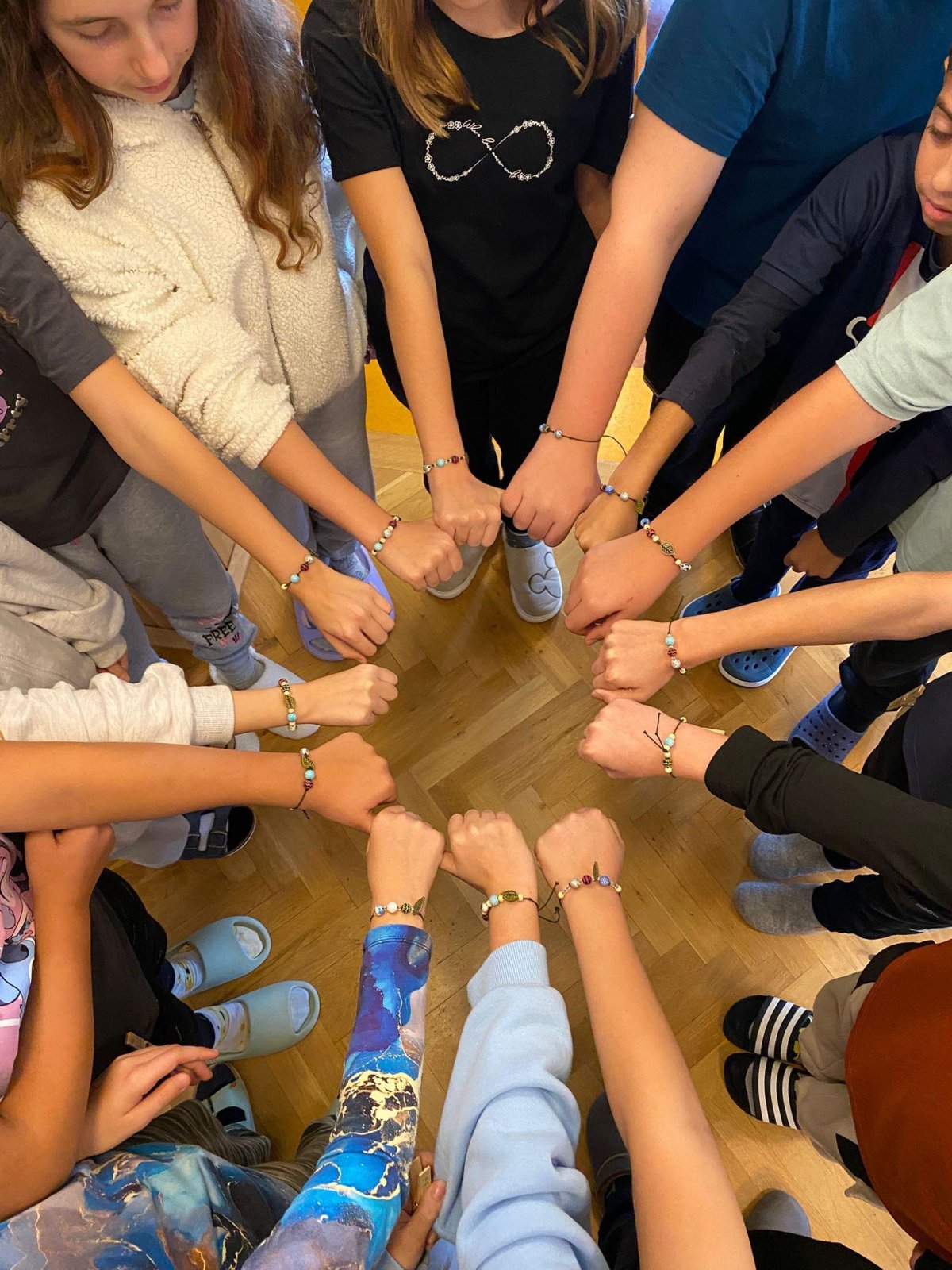 Dopoledne jsme se vrhli do tvorby rituálních tanců a pokřiků pro naše živly. Pomohly nám k tomu i hudební nástroje, které dodaly rytmus a energii. Poté jsme si vyráběli náramky, kde každá barva korálku symbolizovala jeden živel – oheň, vodu, zemi a vzduch. Příjemným zpestřením dopoledne byla i pohybová hra Twister, u které jsme se hodně nasmáli a všichni ji zvládli na jedničku.
