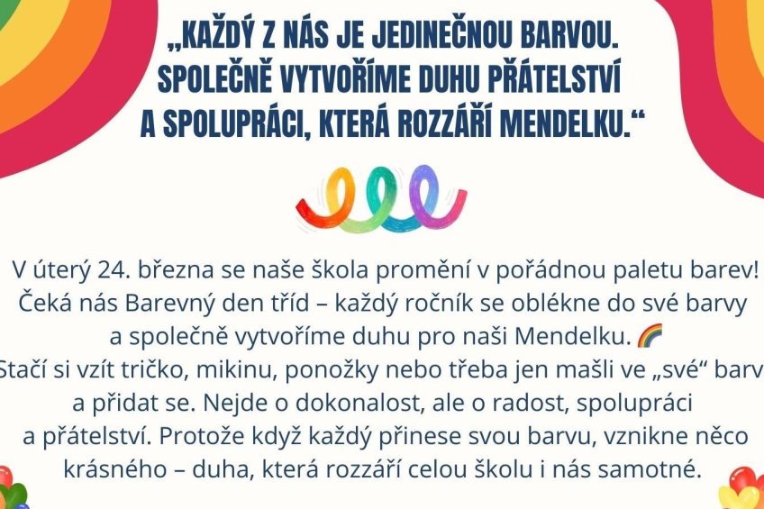 V úterý 24. března se naše škola promění v pořádnou paletu barev! Vytvoříme spolu duhu Mendelky. V přiloženém dokumentu uvidíte rozvržení barev pro jednotlivé třídy.