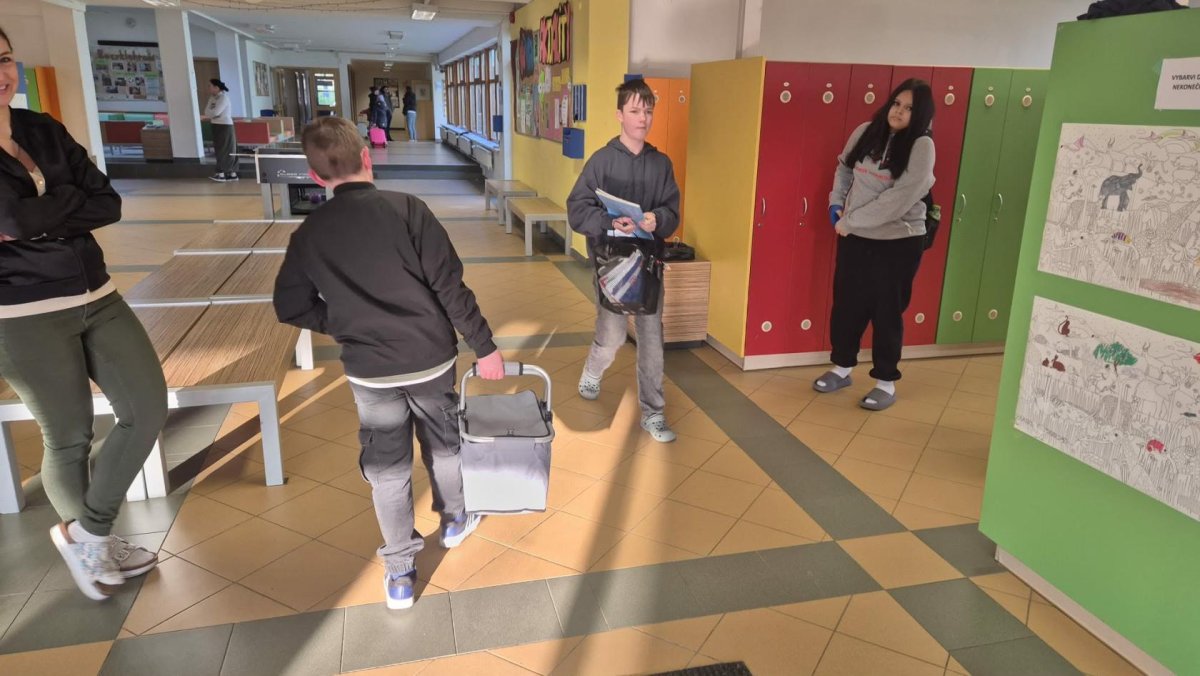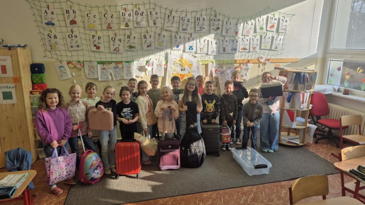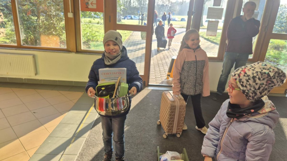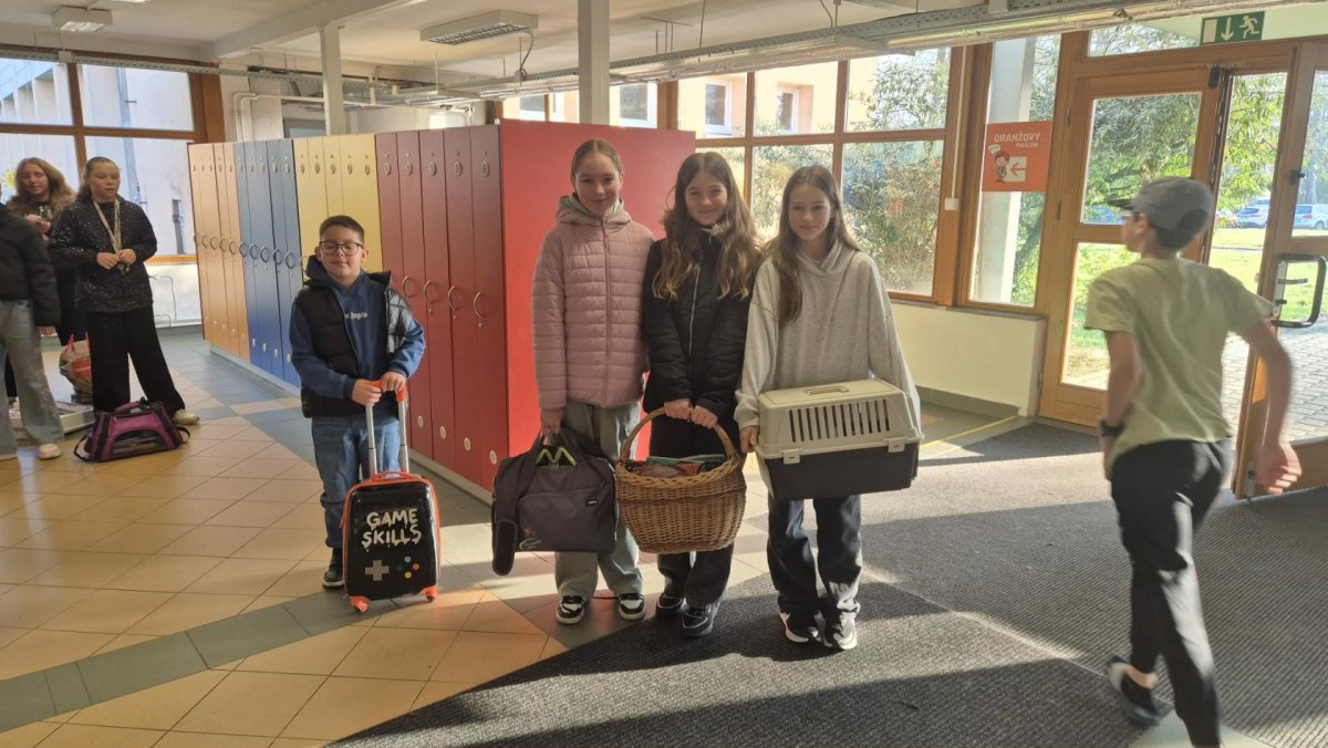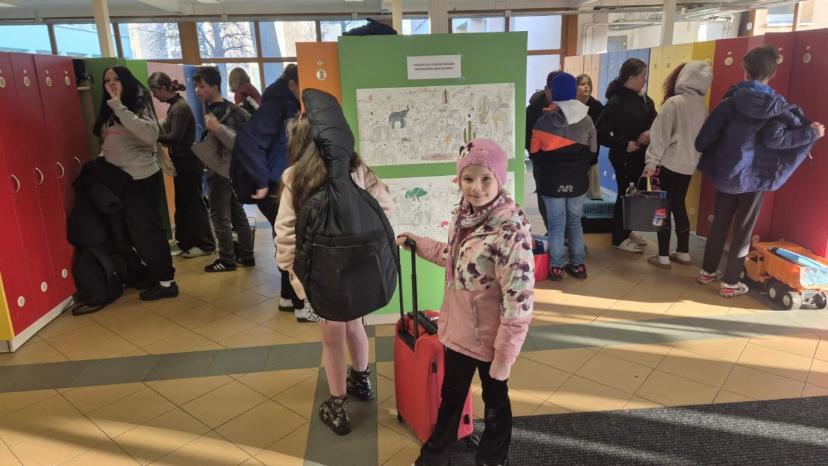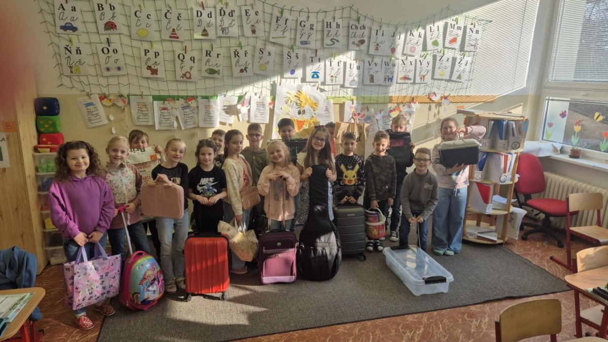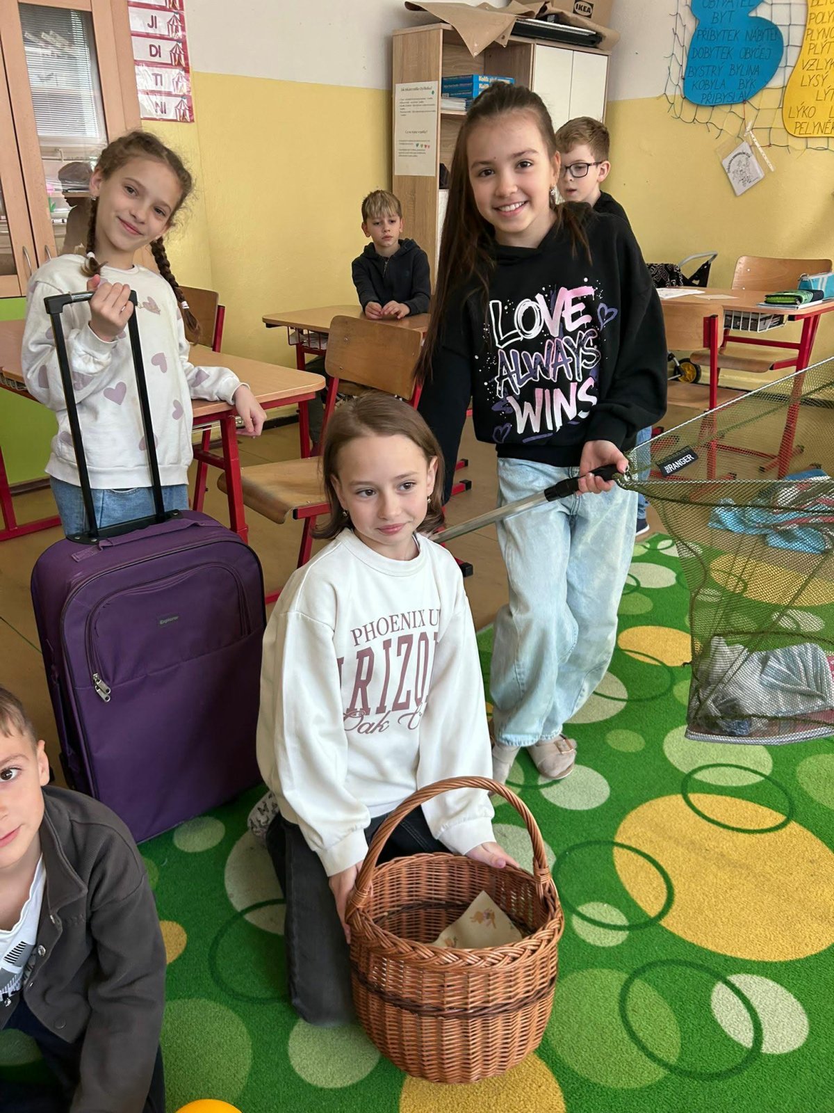 V rámci aprílového dne děti dorazily vybavené naprosto skvěle! Učebnice se vezly v nákupních vozících,sešity odpočívaly v hrncích...a někteří školáci dorazili i s výbavou,která by obstála i na expedici do divočiny...