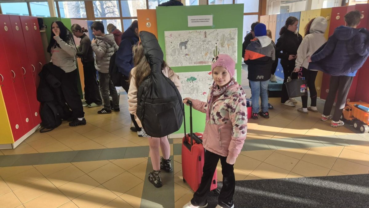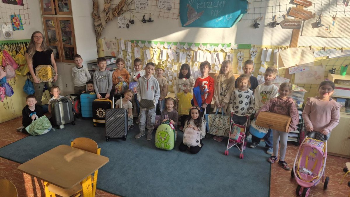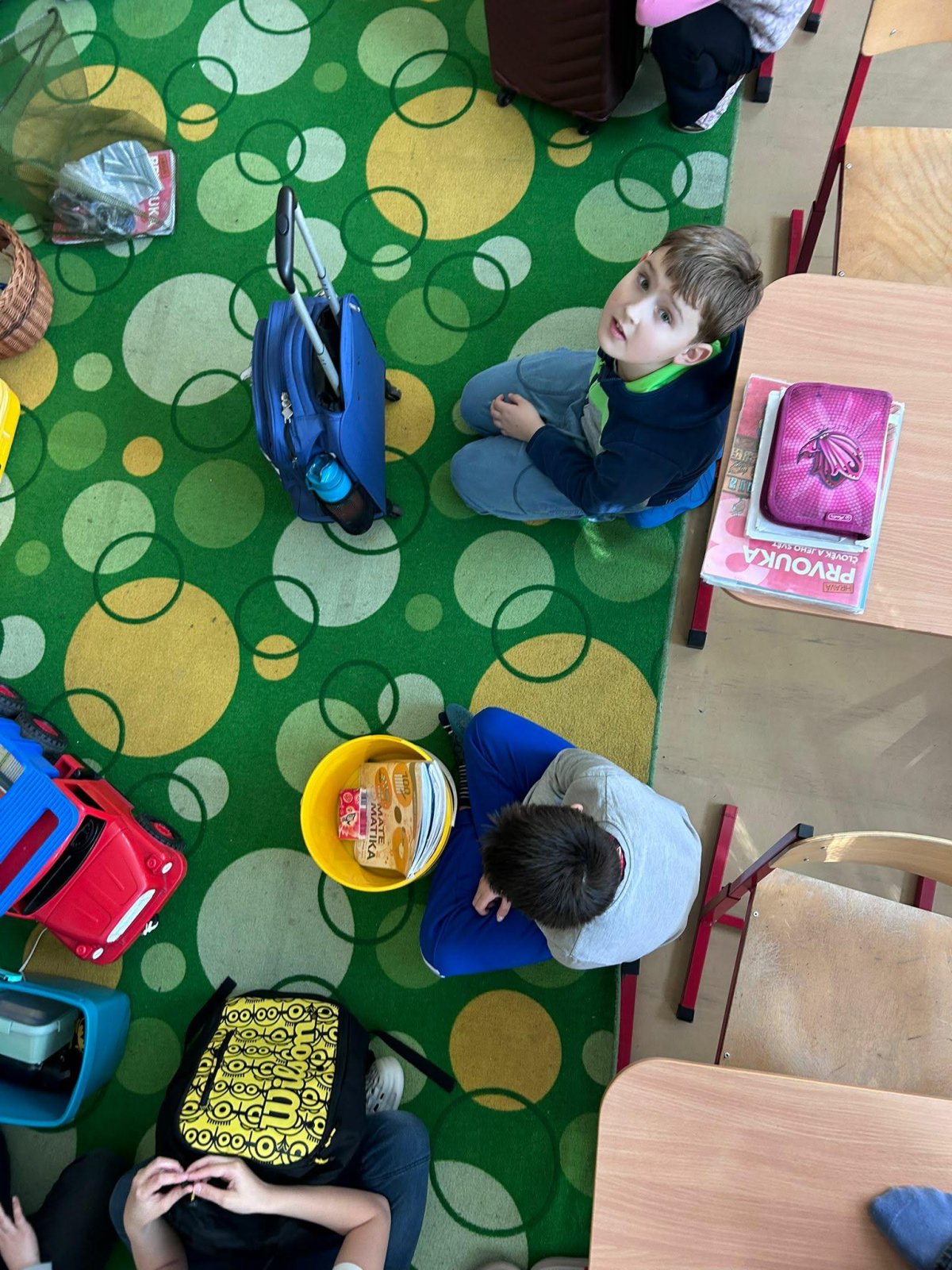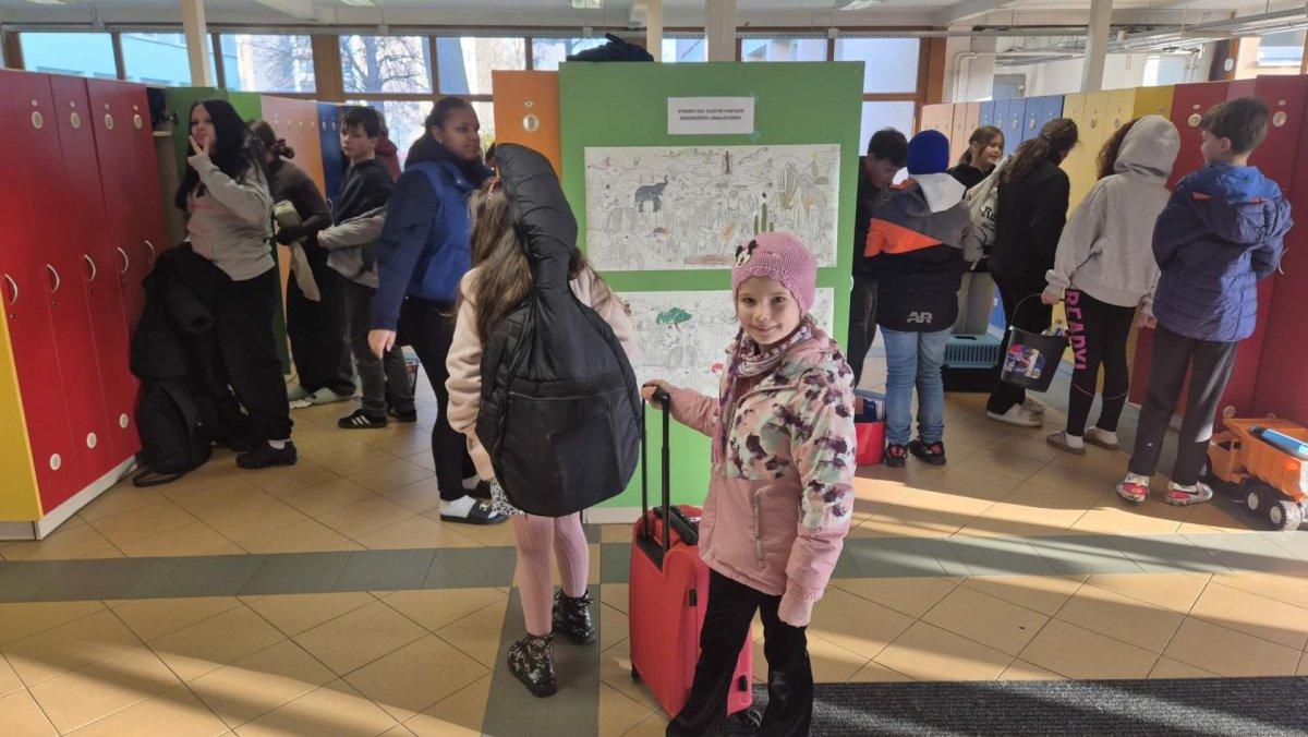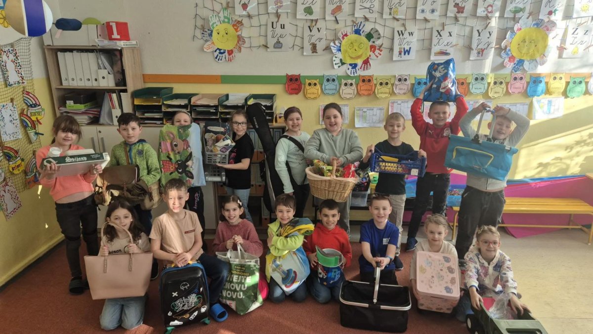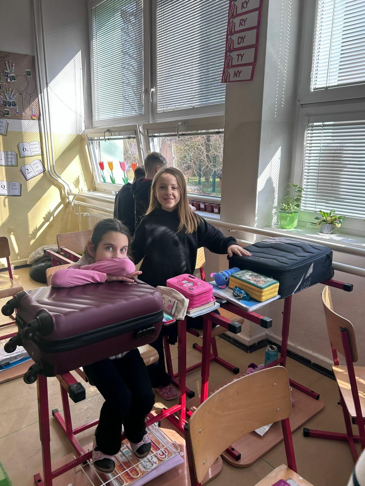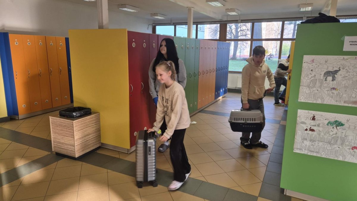 V rámci aprílového dne děti dorazily vybavené naprosto skvěle! Učebnice se vezly v nákupních vozících,sešity odpočívaly v hrncích...a někteří školáci dorazili i s výbavou,která by obstála i na expedici do divočiny...