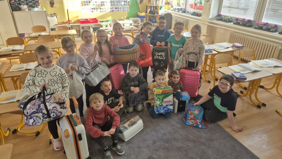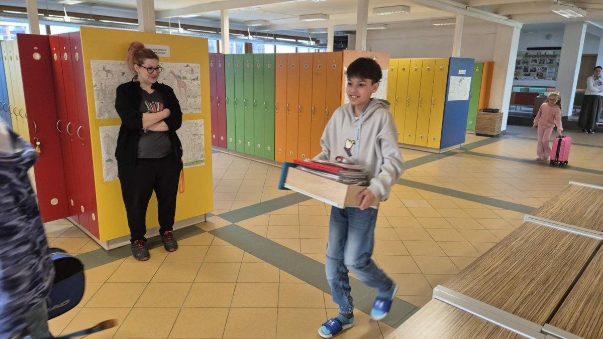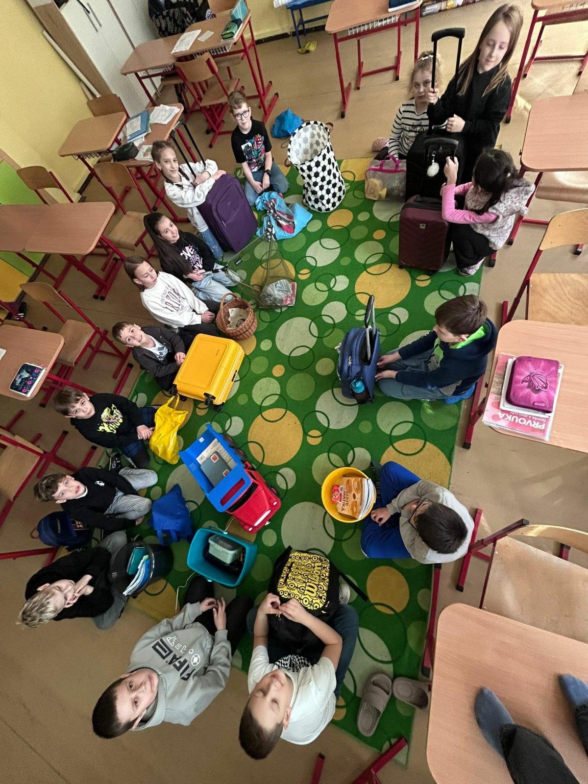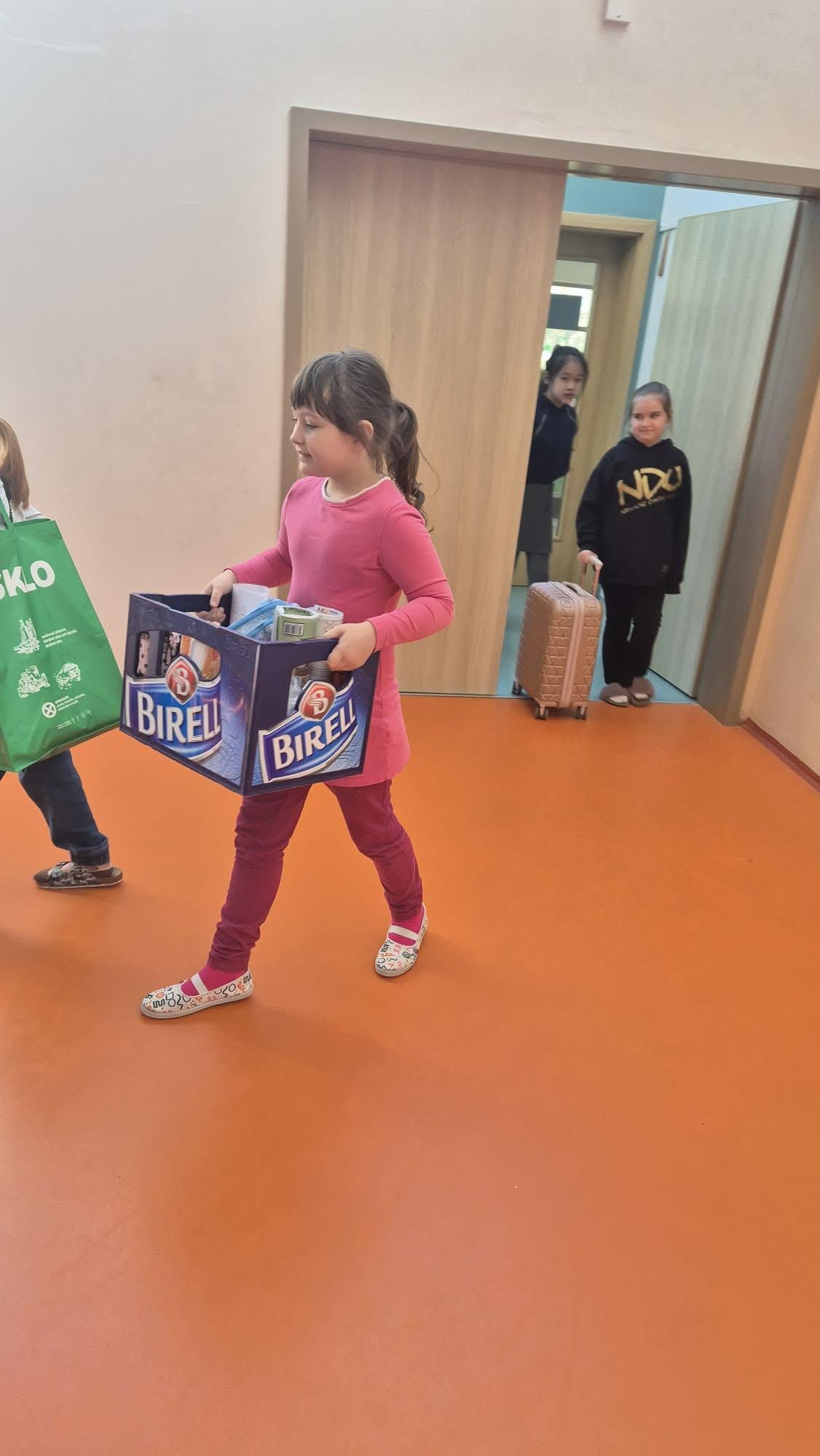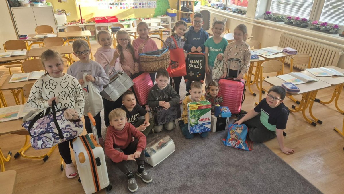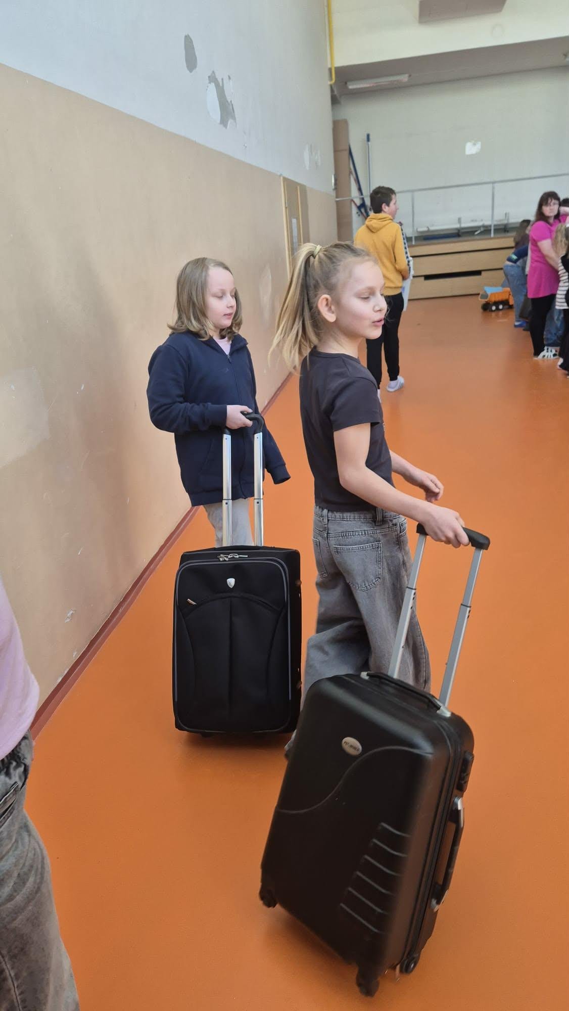 V rámci aprílového dne děti dorazily vybavené naprosto skvěle! Učebnice se vezly v nákupních vozících,sešity odpočívaly v hrncích...a někteří školáci dorazili i s výbavou,která by obstála i na expedici do divočiny...